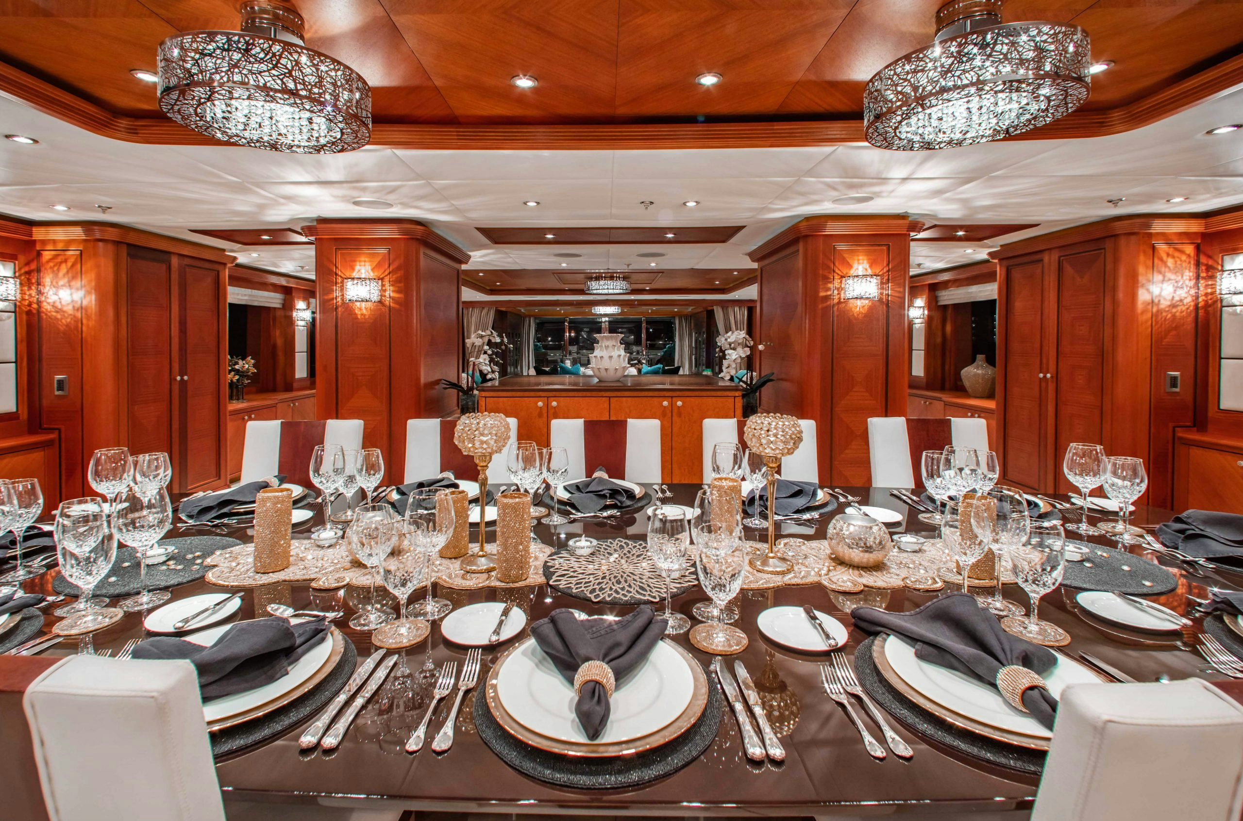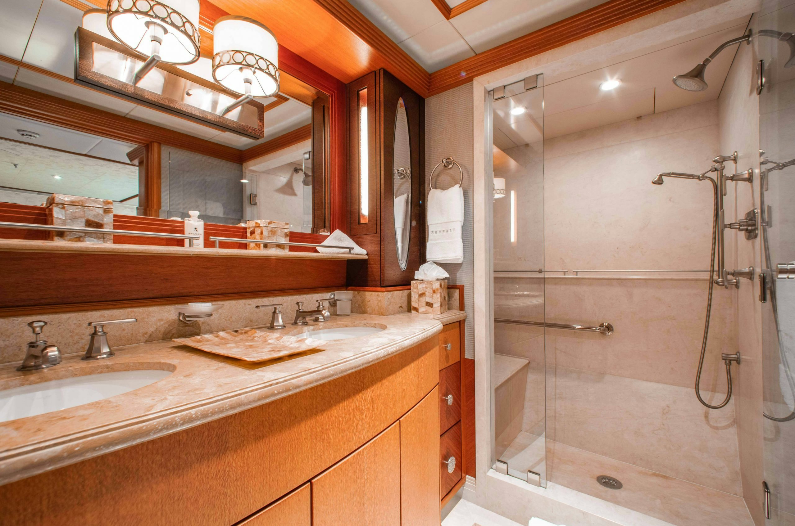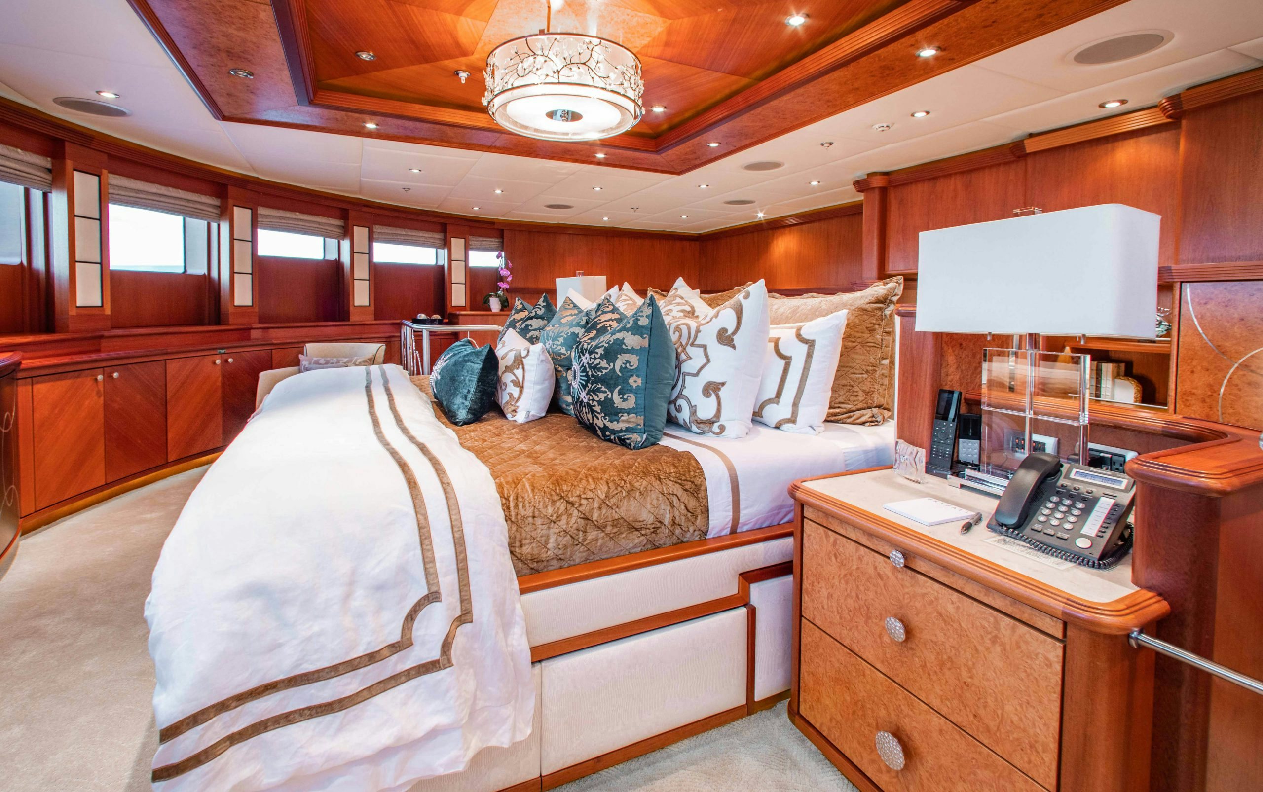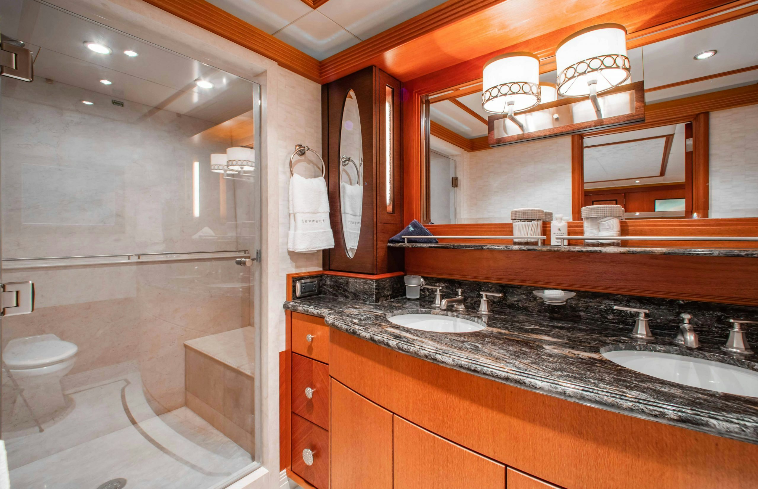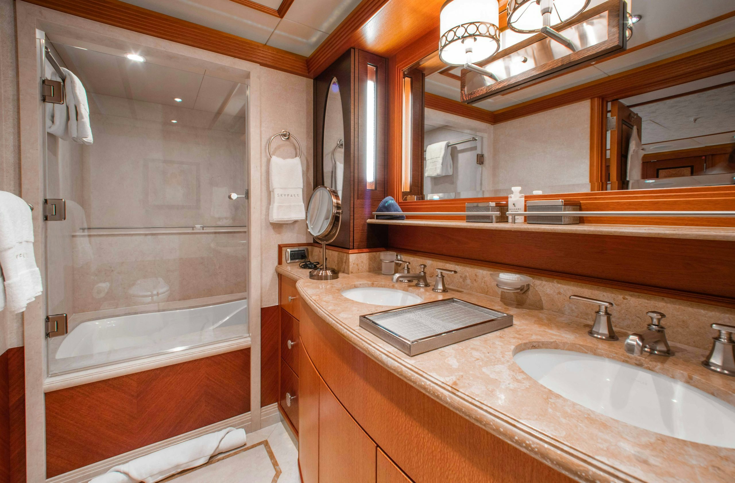 The superyacht features accommodations for 12 guests and is staffed with a five-star crew to ensure everyone aboard has the holiday of a lifetime. SKYFALL has a total of six resplendent staterooms that allow guests to rest up for the next day ahead. SKYFALL’s offers a spectacular split-level master. On the lower level is a lounge, private study and his-and-her en-suite bathrooms with a large shower and Jacuzzi tub. On the upper level is a plush king-size bed where guests will wake up to 270-degree views of the cruising destination. The superyacht’s VIP stateroom is as luxurious as the master. The full-beam stateroom features a king-size bed, sofa with a coffee table, vanity and en-suite bath with double sinks. The charter yacht’s additional staterooms include two king-bed, a wheelchair-friendly queen-bed stateroom and a twin-bed stateroom. An en-suite bath accompanies all staterooms.