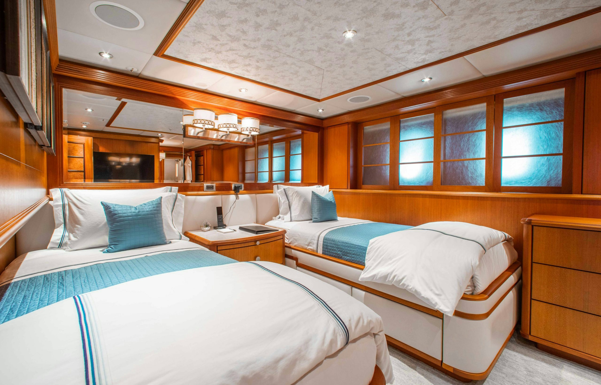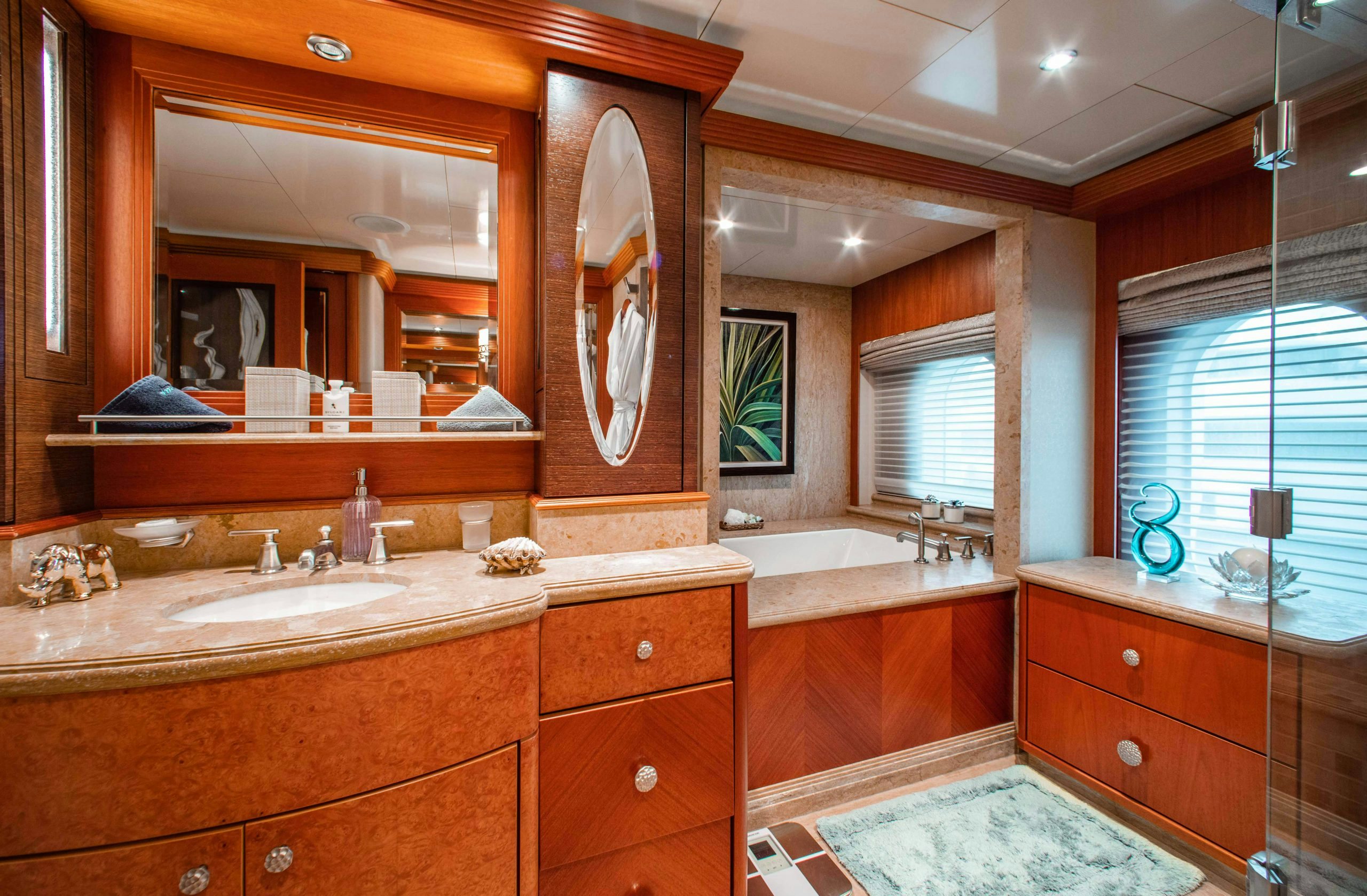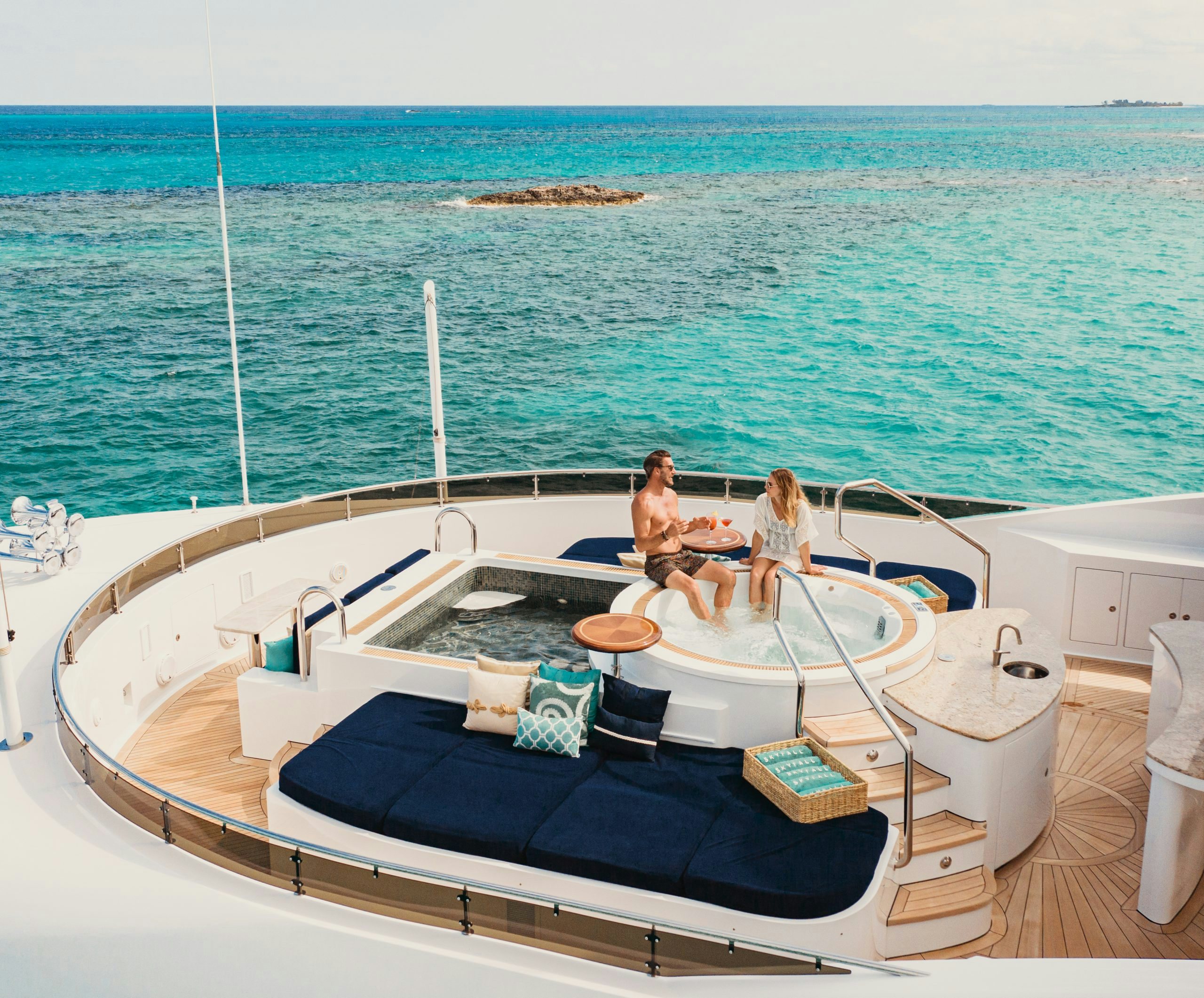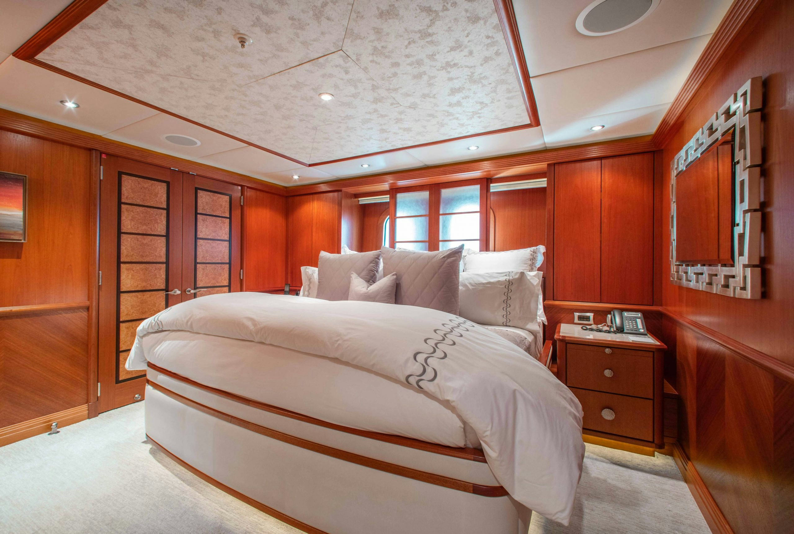 The superyacht features accommodations for 12 guests and is staffed with a five-star crew to ensure everyone aboard has the holiday of a lifetime. SKYFALL has a total of six resplendent staterooms that allow guests to rest up for the next day ahead. SKYFALL’s offers a spectacular split-level master. On the lower level is a lounge, private study and his-and-her en-suite bathrooms with a large shower and Jacuzzi tub. On the upper level is a plush king-size bed where guests will wake up to 270-degree views of the cruising destination. The superyacht’s VIP stateroom is as luxurious as the master. The full-beam stateroom features a king-size bed, sofa with a coffee table, vanity and en-suite bath with double sinks. The charter yacht’s additional staterooms include two king-bed, a wheelchair-friendly queen-bed stateroom and a twin-bed stateroom. An en-suite bath accompanies all staterooms.