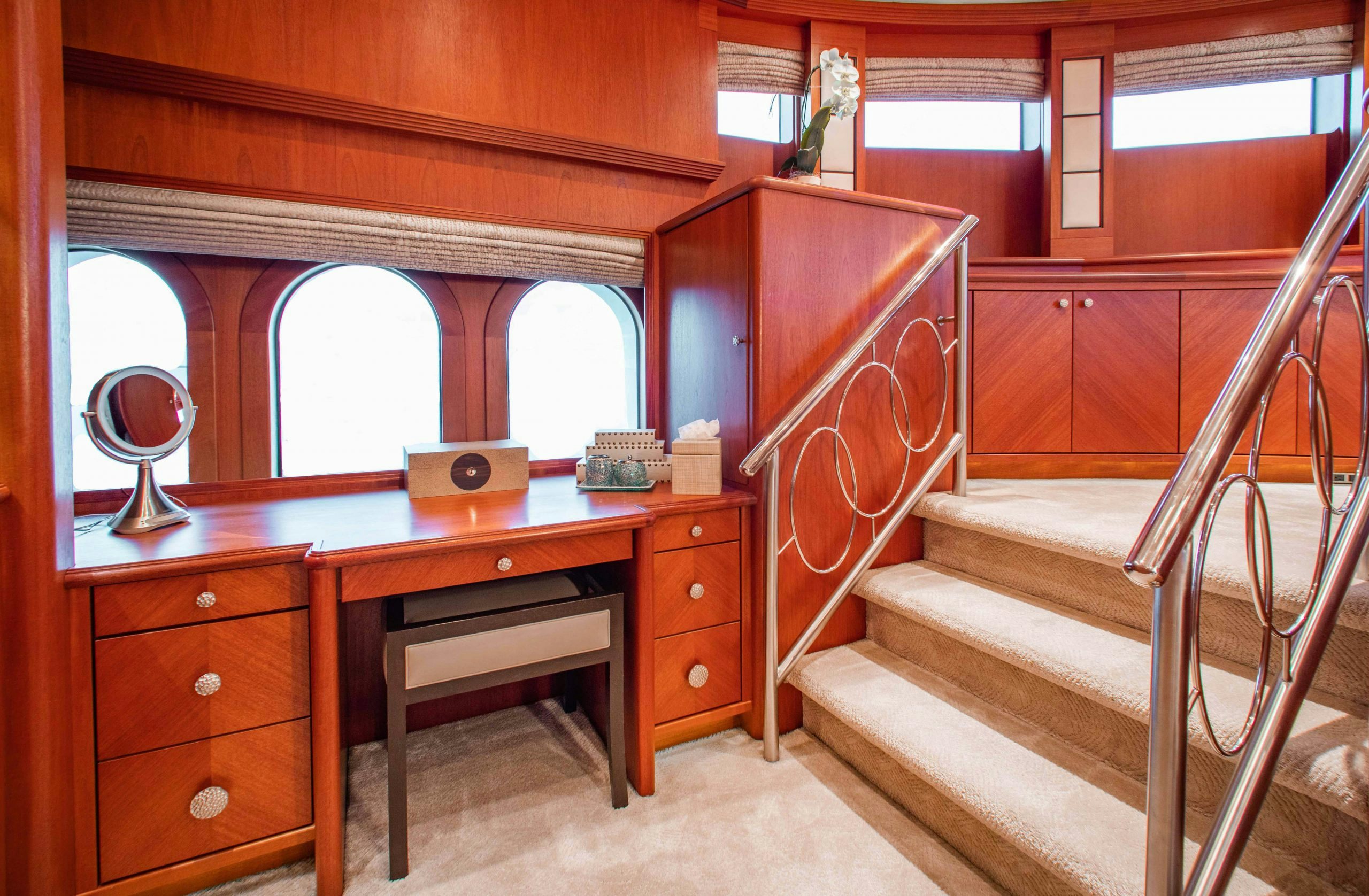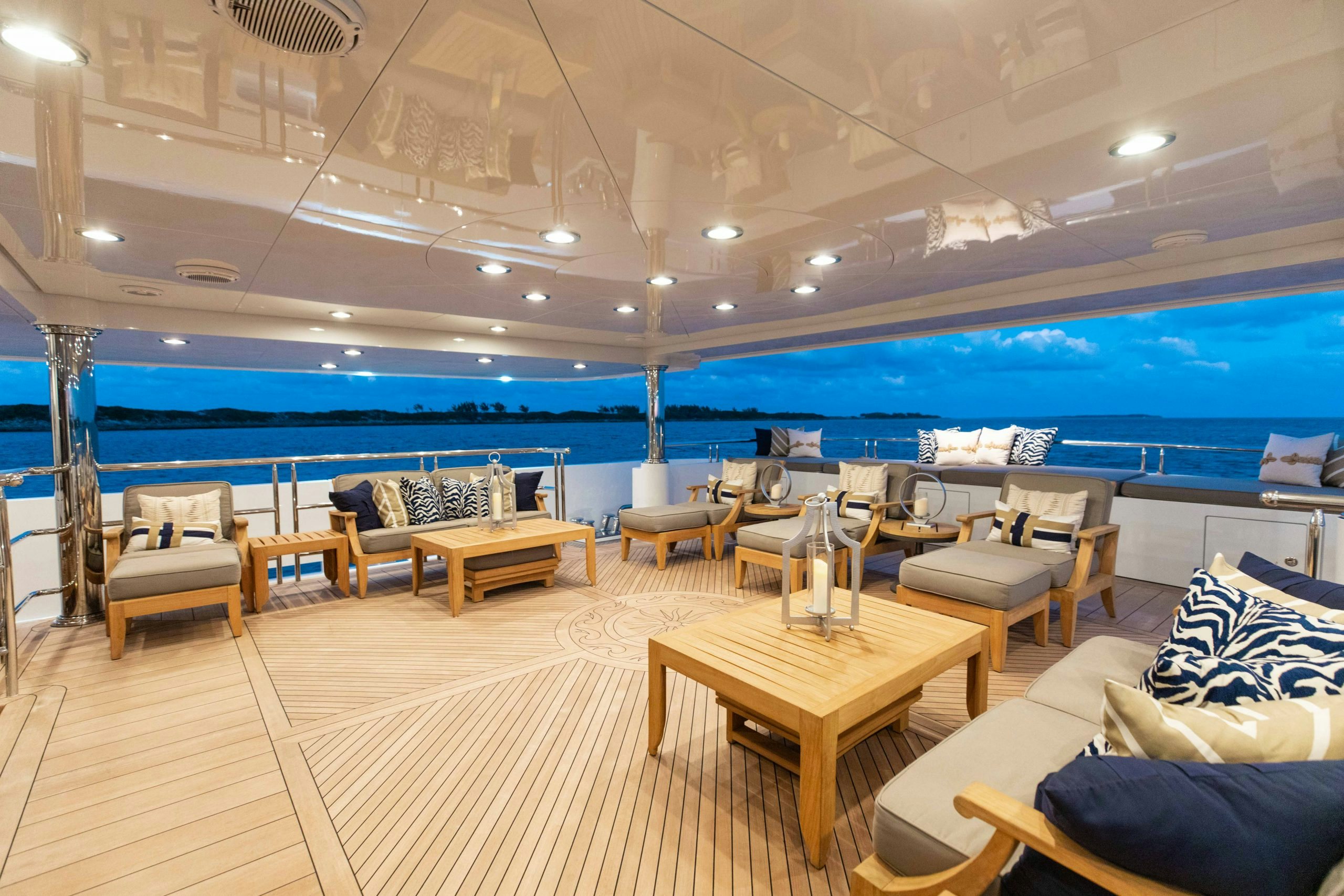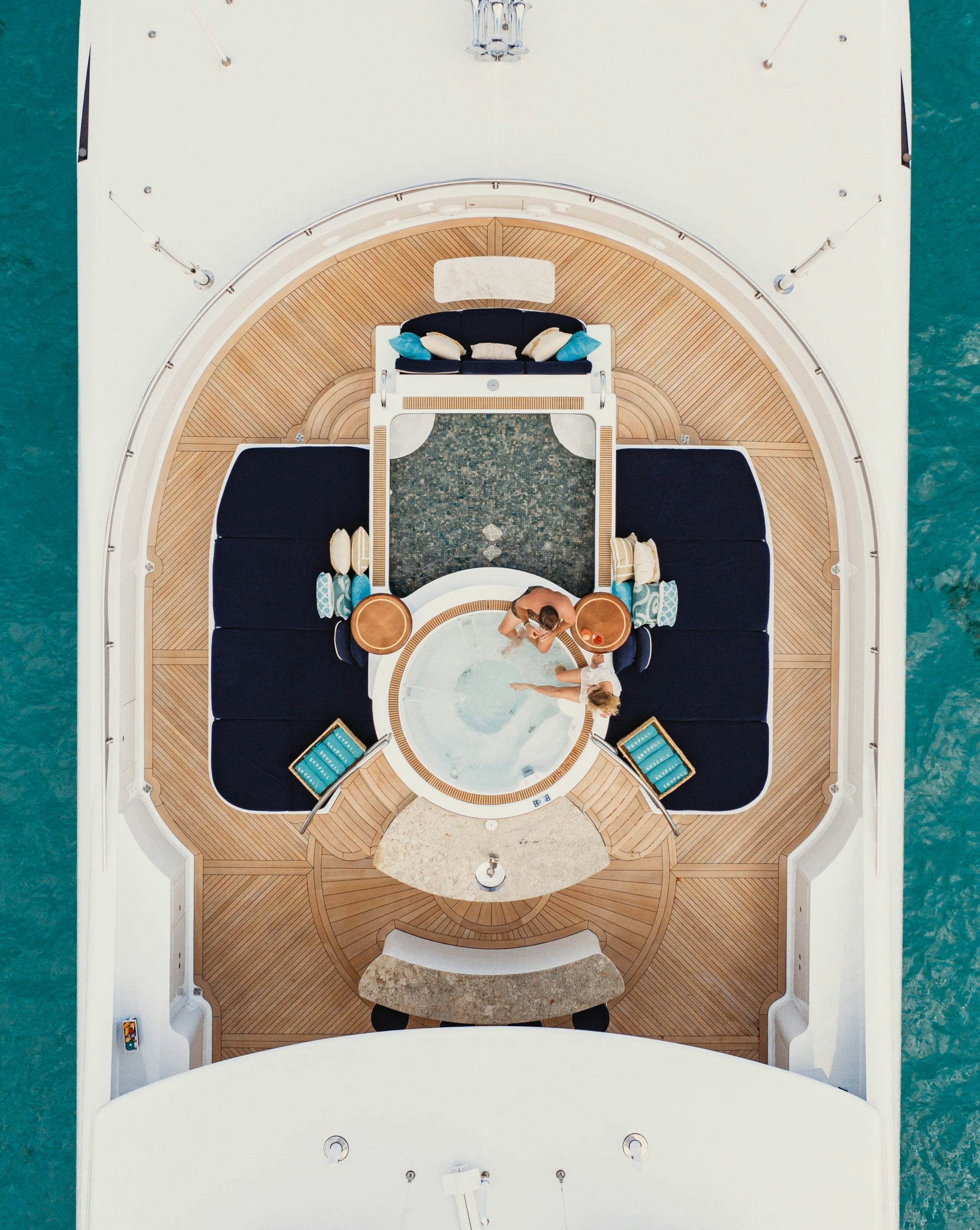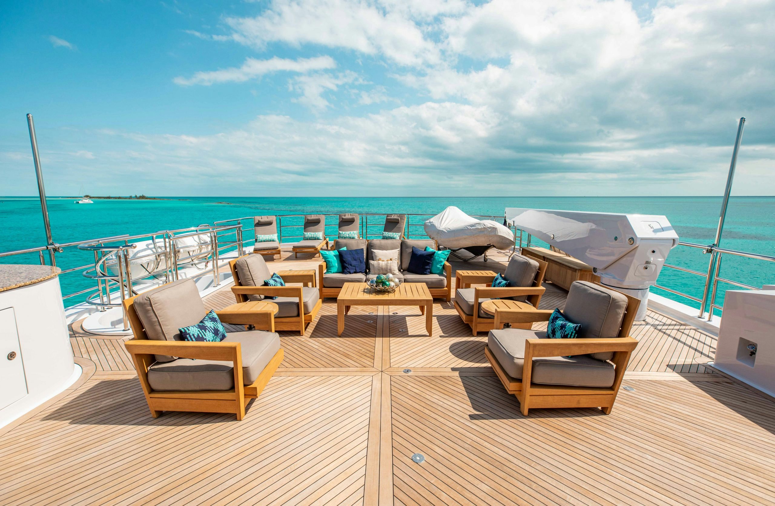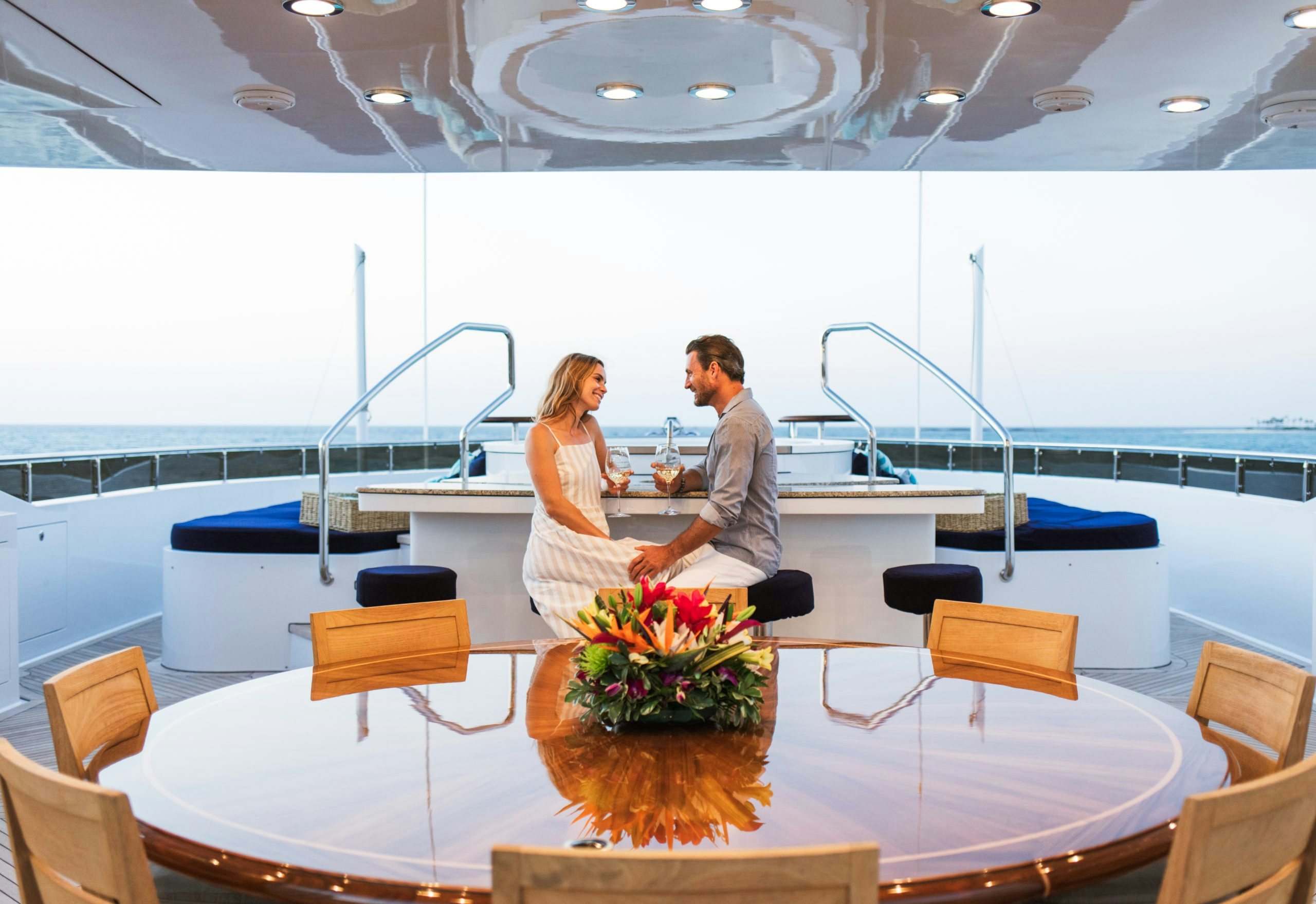 The charter yacht’s contemporary style of the skylounge makes it a favorite space for guests onboard. It is comfortable and offers a 60-inch flat-screen TV, perfect for evening movies or post up at the six-person game table for a rousing round of cards. The skylounge has beautiful panoramic views with large windows. A wheelchair-friendly elevator allows guests to easily access all three decks.