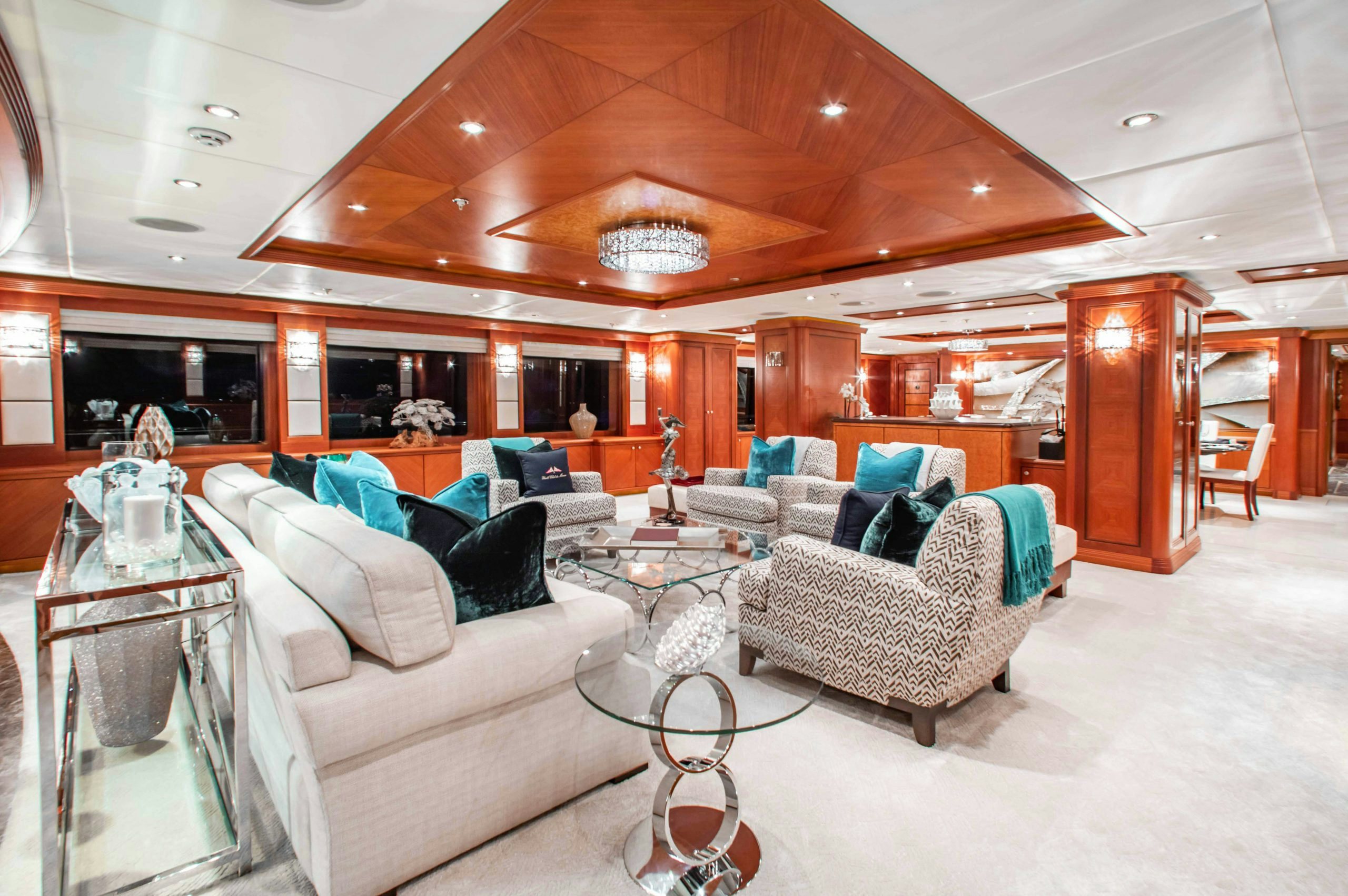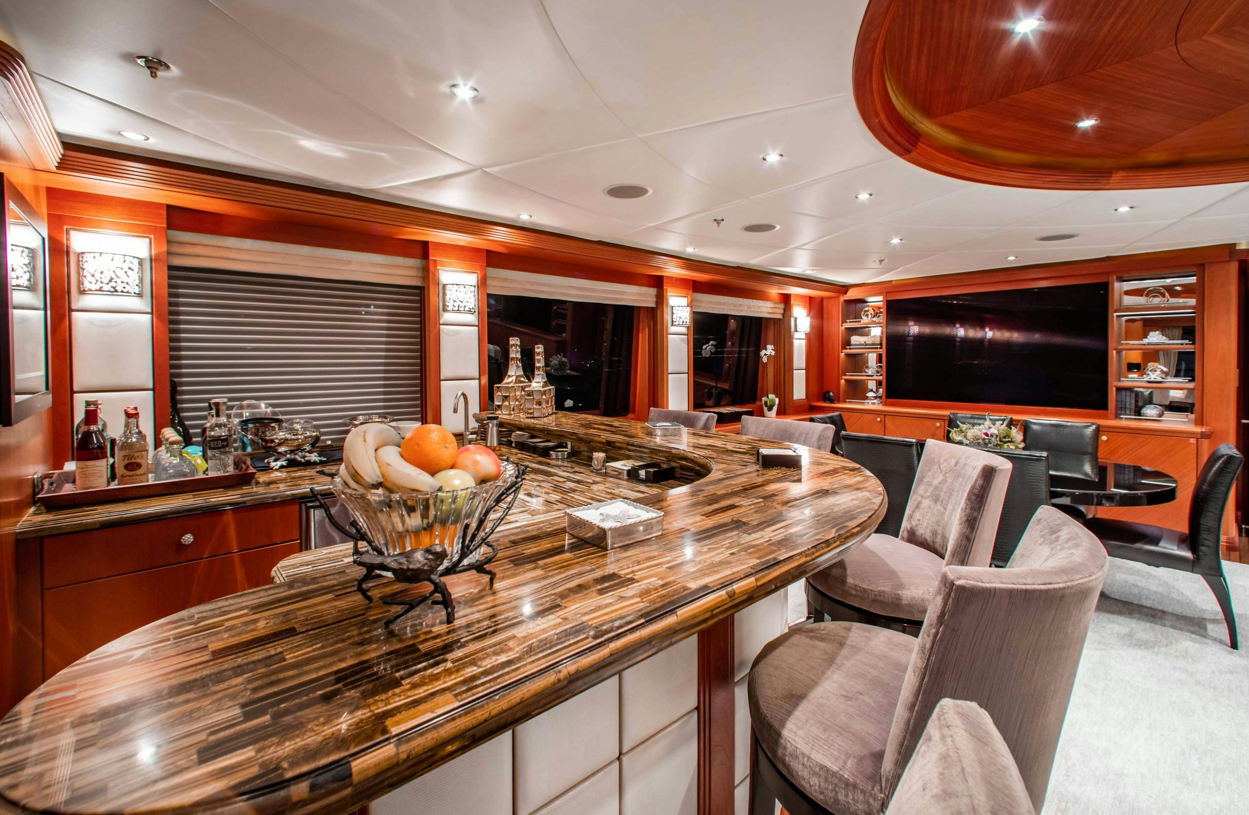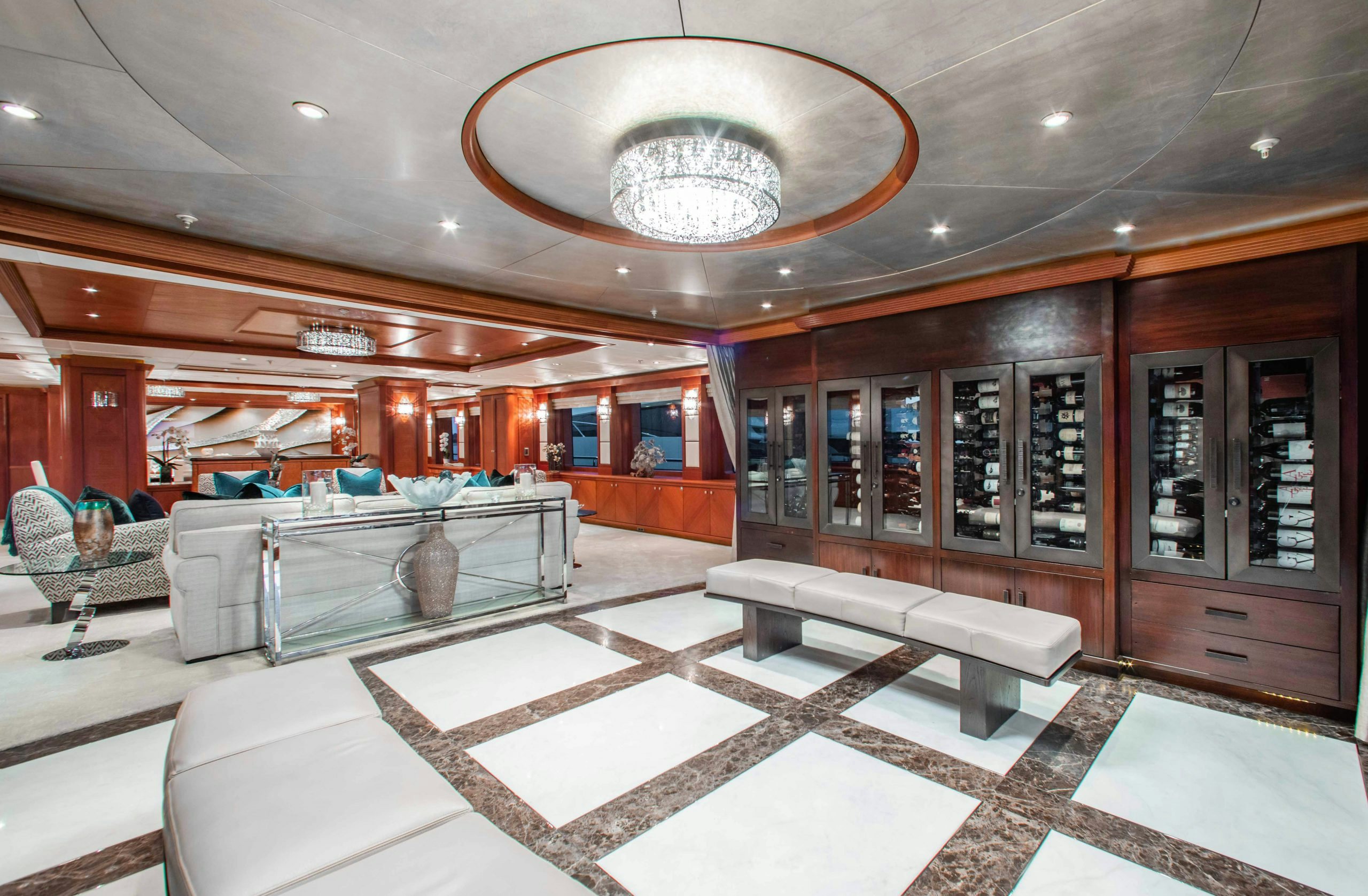 The iconic charter yacht SKYFALL showcases a striking interior with an urban contemporary styling and a dynamic, well-thought-out layout. The space is adorned with blends of Honduran mahogany, European maple burl, Australian Lacewood and Wenge to give a luxurious feel. The charter yacht’s main deck aft is home to the wine cellar and custom humidors. This beautiful space is ripe for entertaining, perhaps with a lovely afternoon wine tasting.