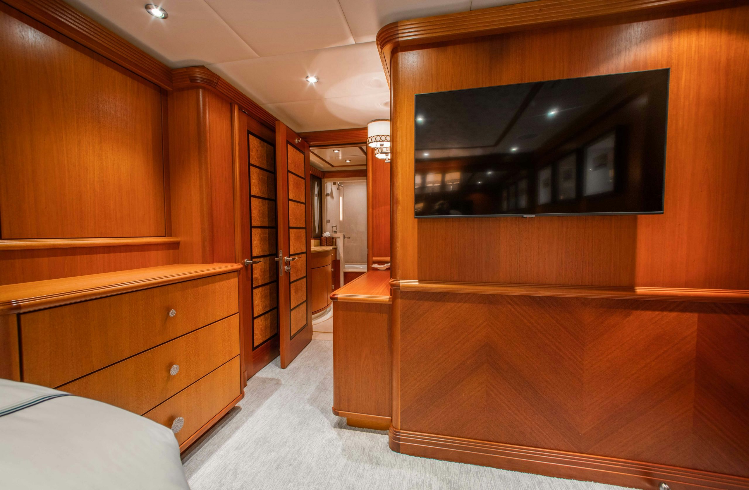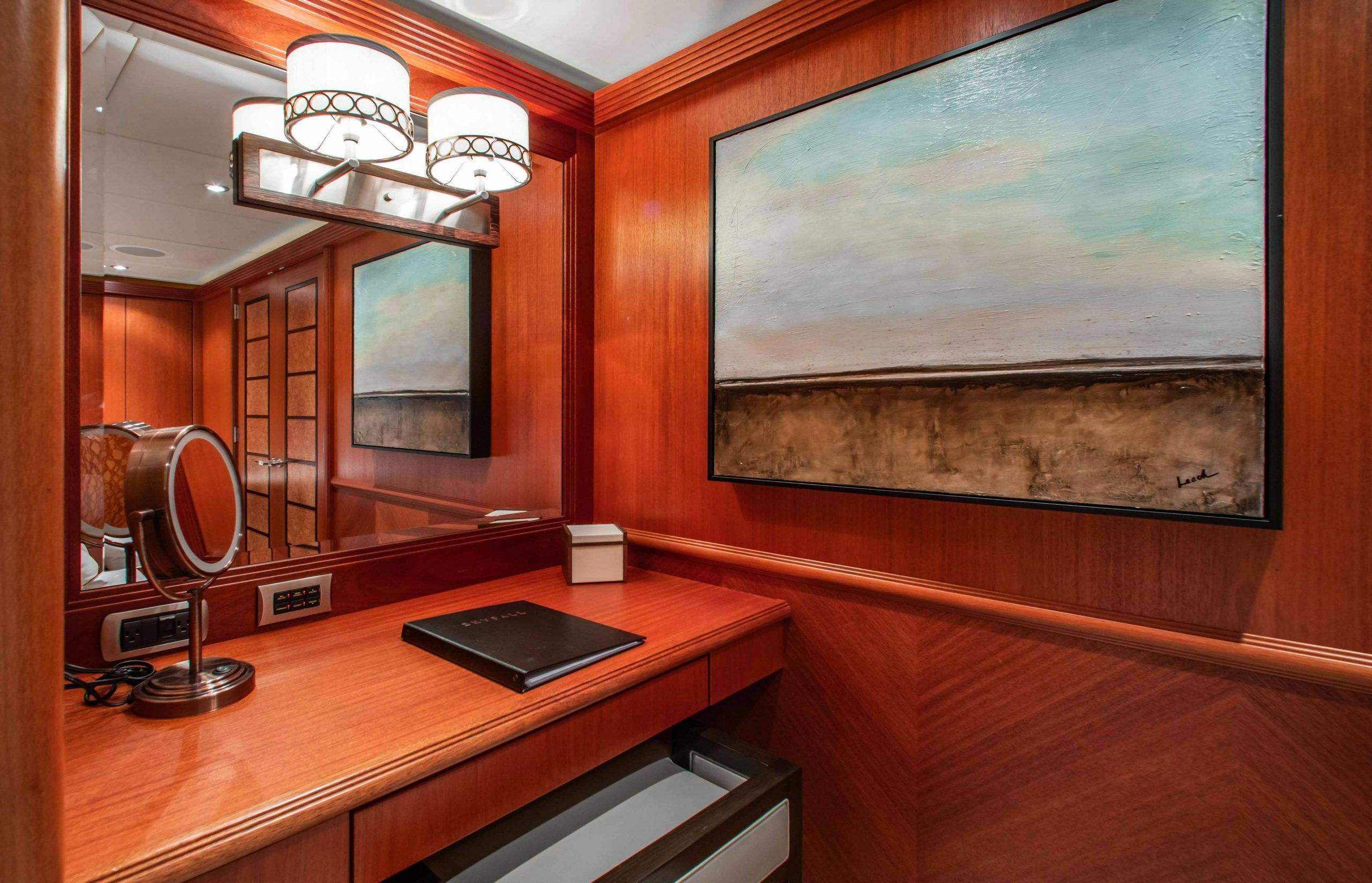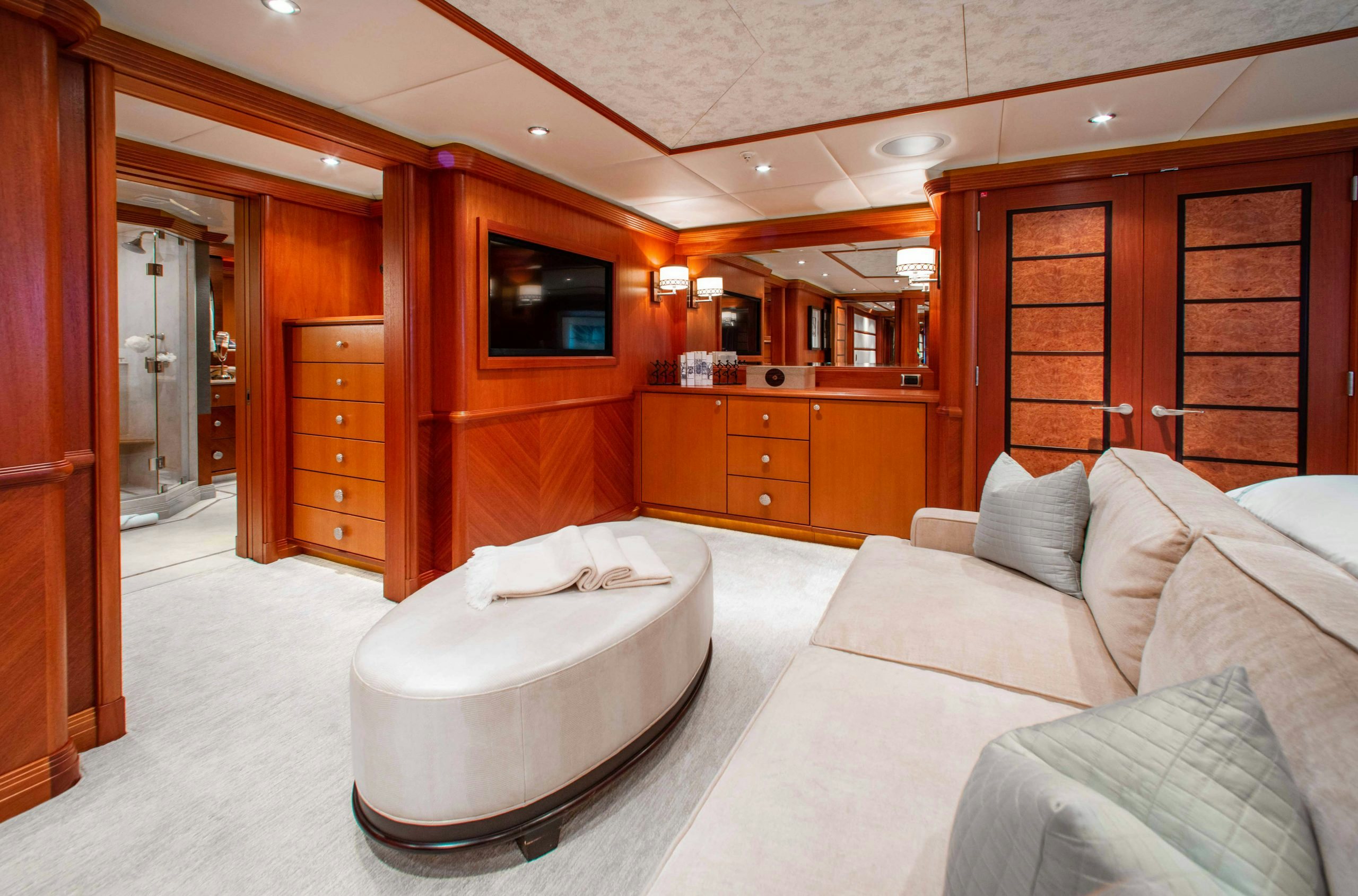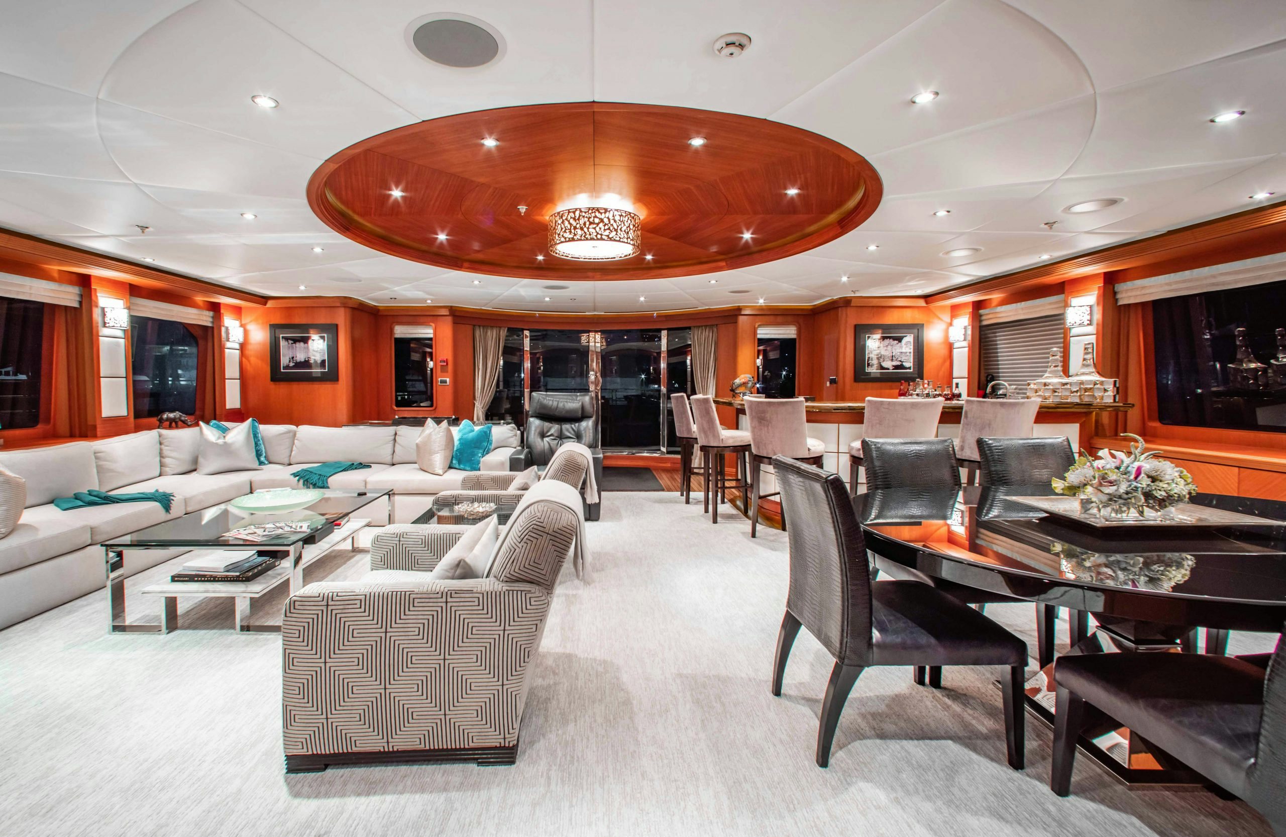 The iconic charter yacht SKYFALL showcases a striking interior with an urban contemporary styling and a dynamic, well-thought-out layout. The space is adorned with blends of Honduran mahogany, European maple burl, Australian Lacewood and Wenge to give a luxurious feel. The charter yacht’s main deck aft is home to the wine cellar and custom humidors. This beautiful space is ripe for entertaining, perhaps with a lovely afternoon wine tasting.