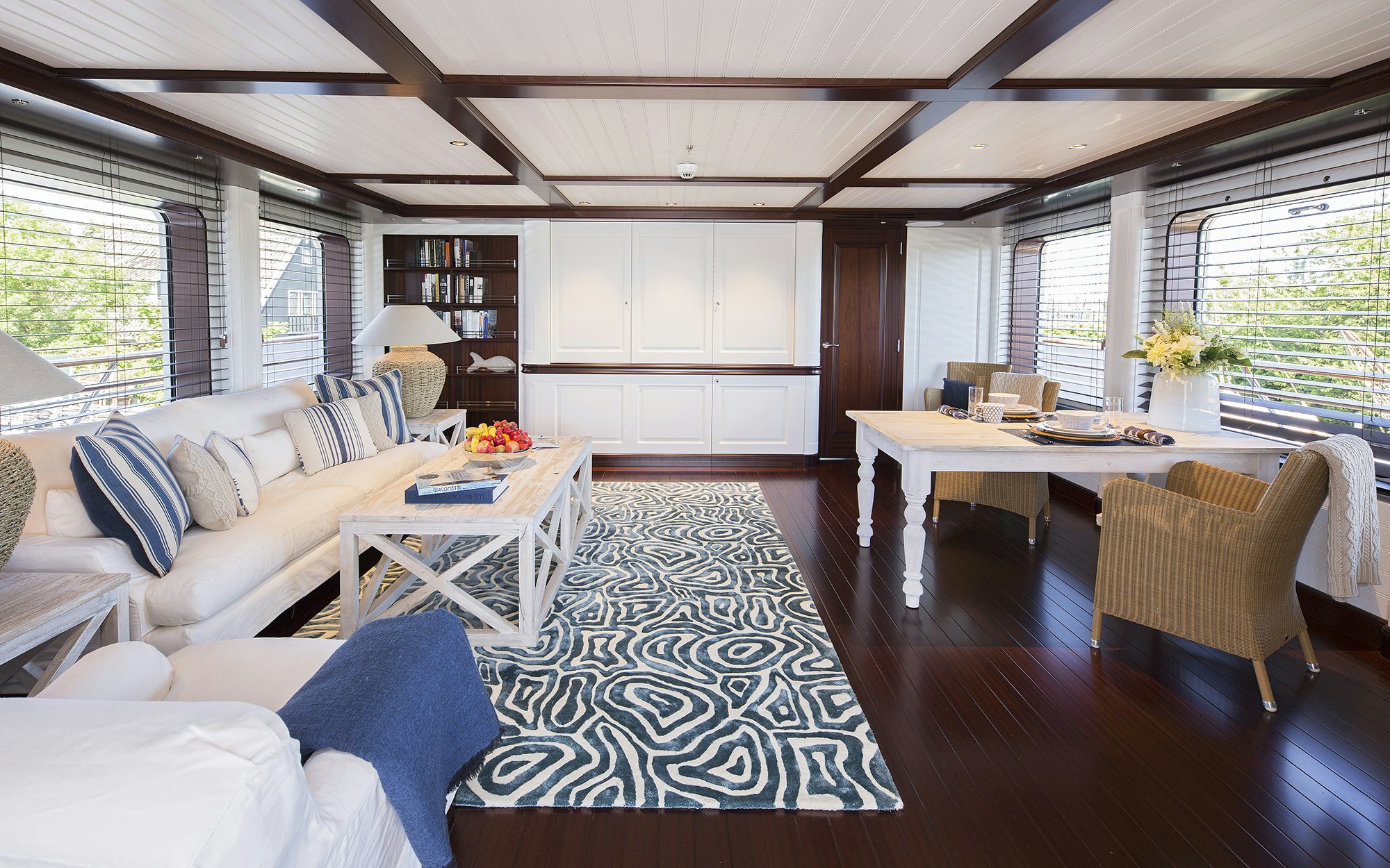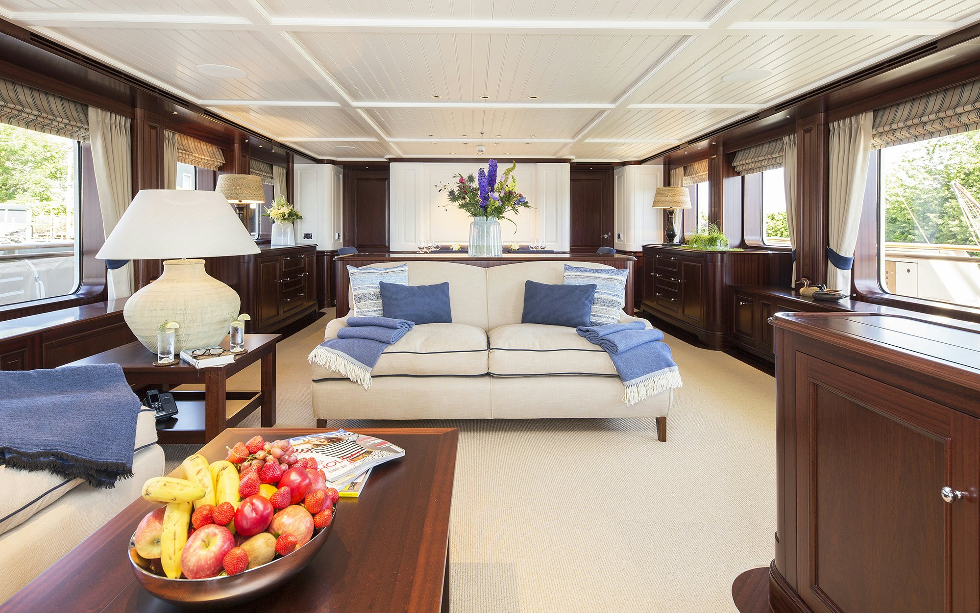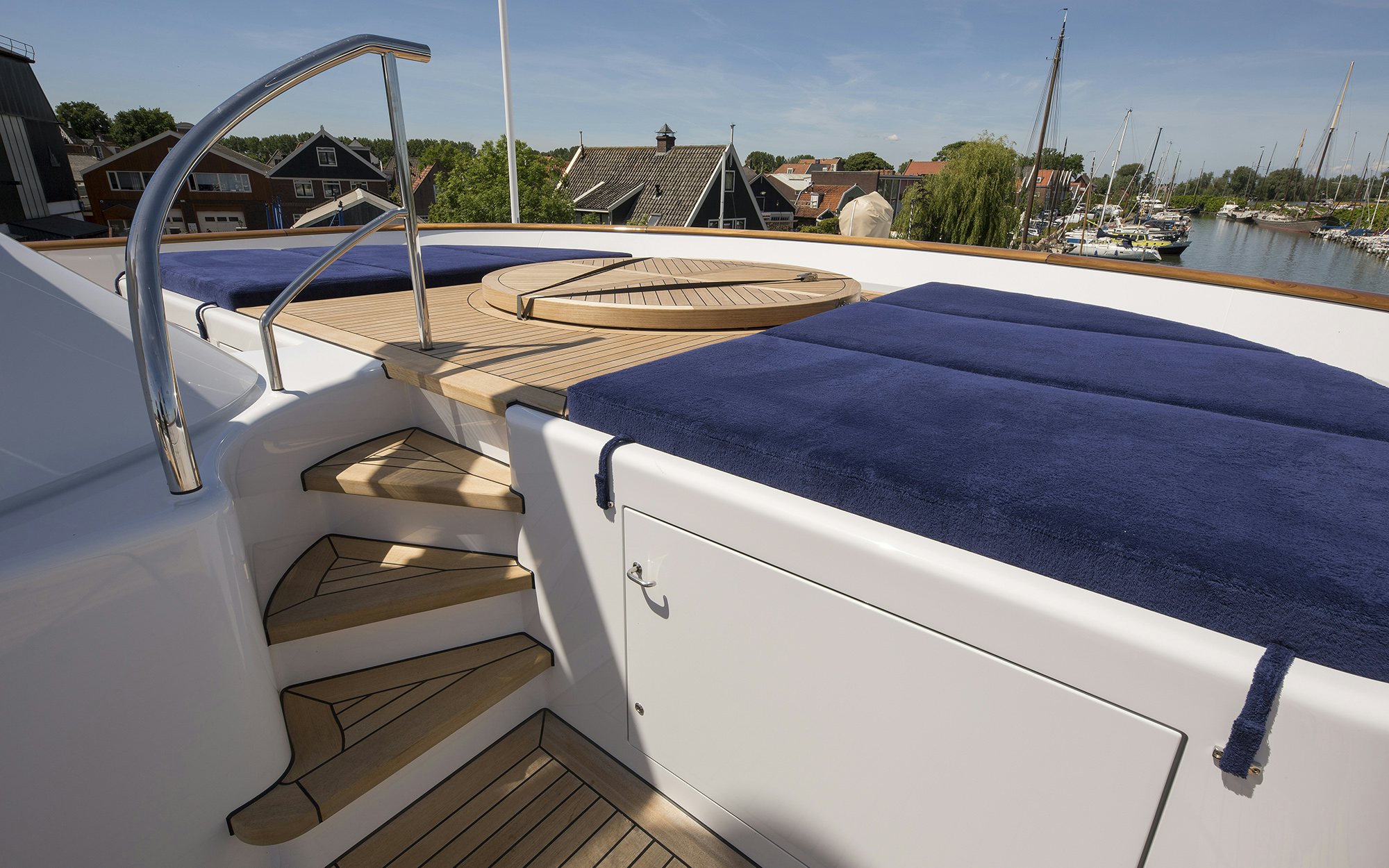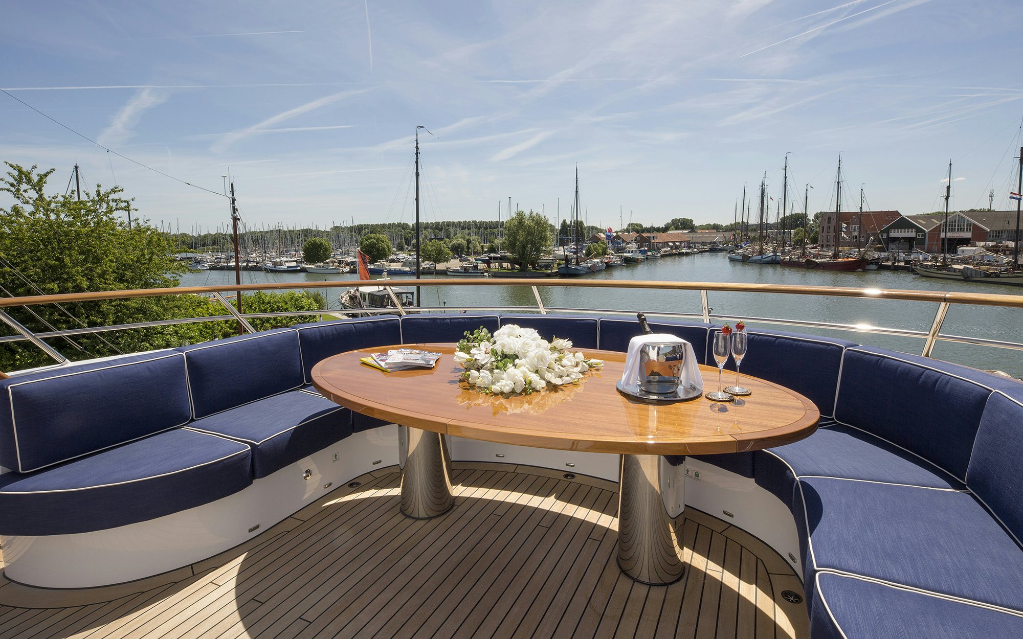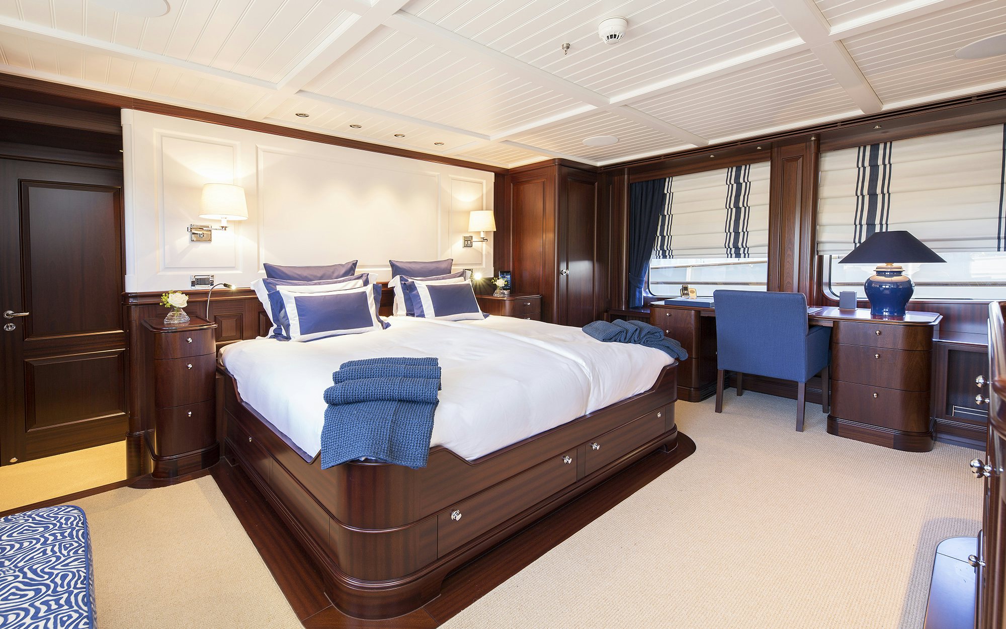 Felix Buytendijk designed luxury motor yacht SOPRANO’s stylish interior. The yacht’s interior showcases an open-plan lounge with two sofas and a dining table with seating for 10, along with a comfortable bridge deck salon. Throughout the motor yacht is a use of dark timber with contrasting white and blue furnishings highlight the beauty of this modern classic.