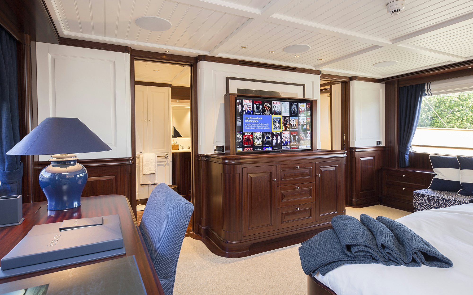 SOPRANO offers four sumptuous staterooms allowing her to accommodate up to nine guests in supreme comfort. The yacht features a full-beam master suite on the main deck that’s fitted with a king-sized bed and an en-suite bathroom with rain shower. The yacht’s VIP stateroom and two twin guest staterooms, one with a Pullman bunk, are situated on the lower deck and have en-suite facilities as well as private safes. The motor yacht has an excellent separation between guests and crew to provide the utmost privacy to guests aboard.