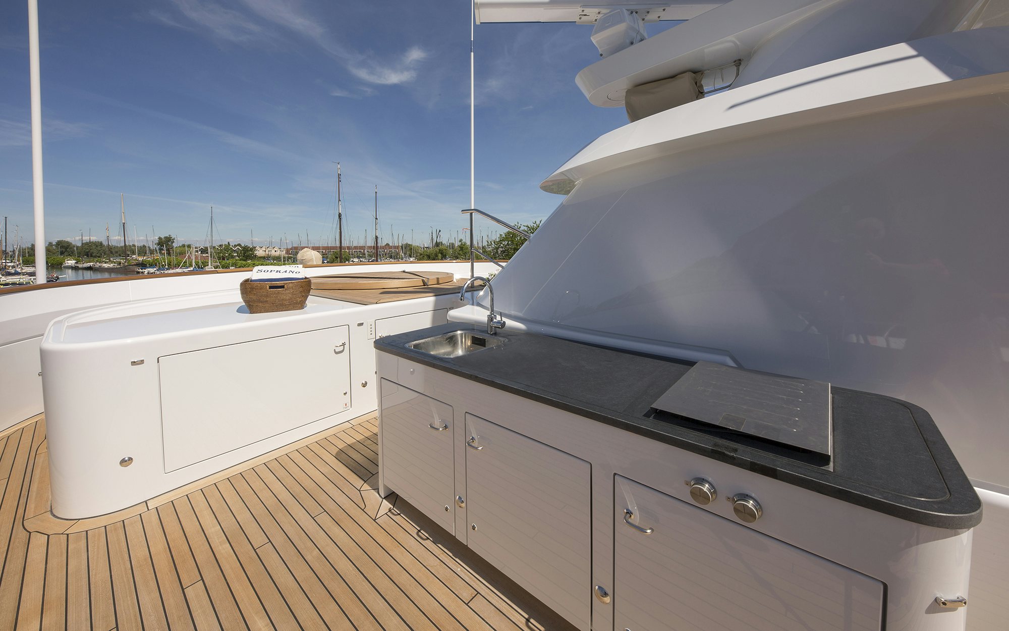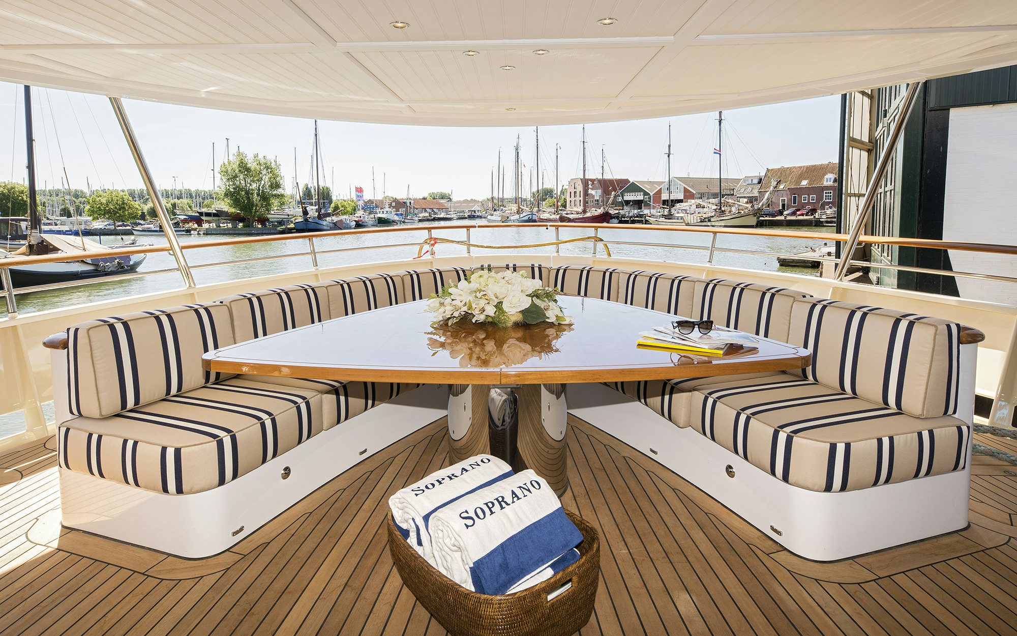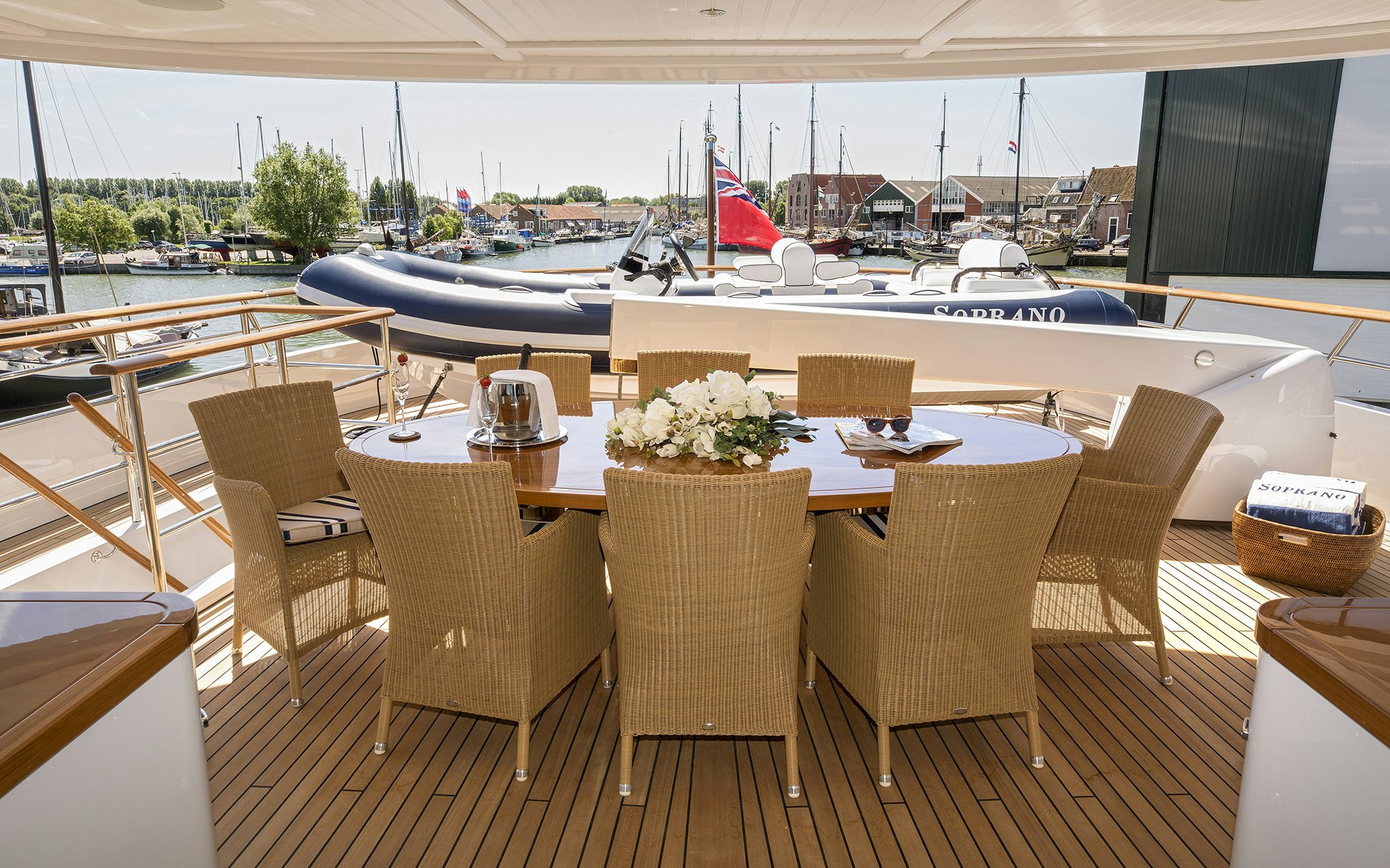 Offering a wealth of open deck space, SOPRANO has many exceptional features for enjoying the alfresco lifestyle. Notable features include a foldout swim platform amidships, which provides easy access to the water, and a large sundeck with a fixed seating/dining area, Jacuzzi, barbecue and bar.
