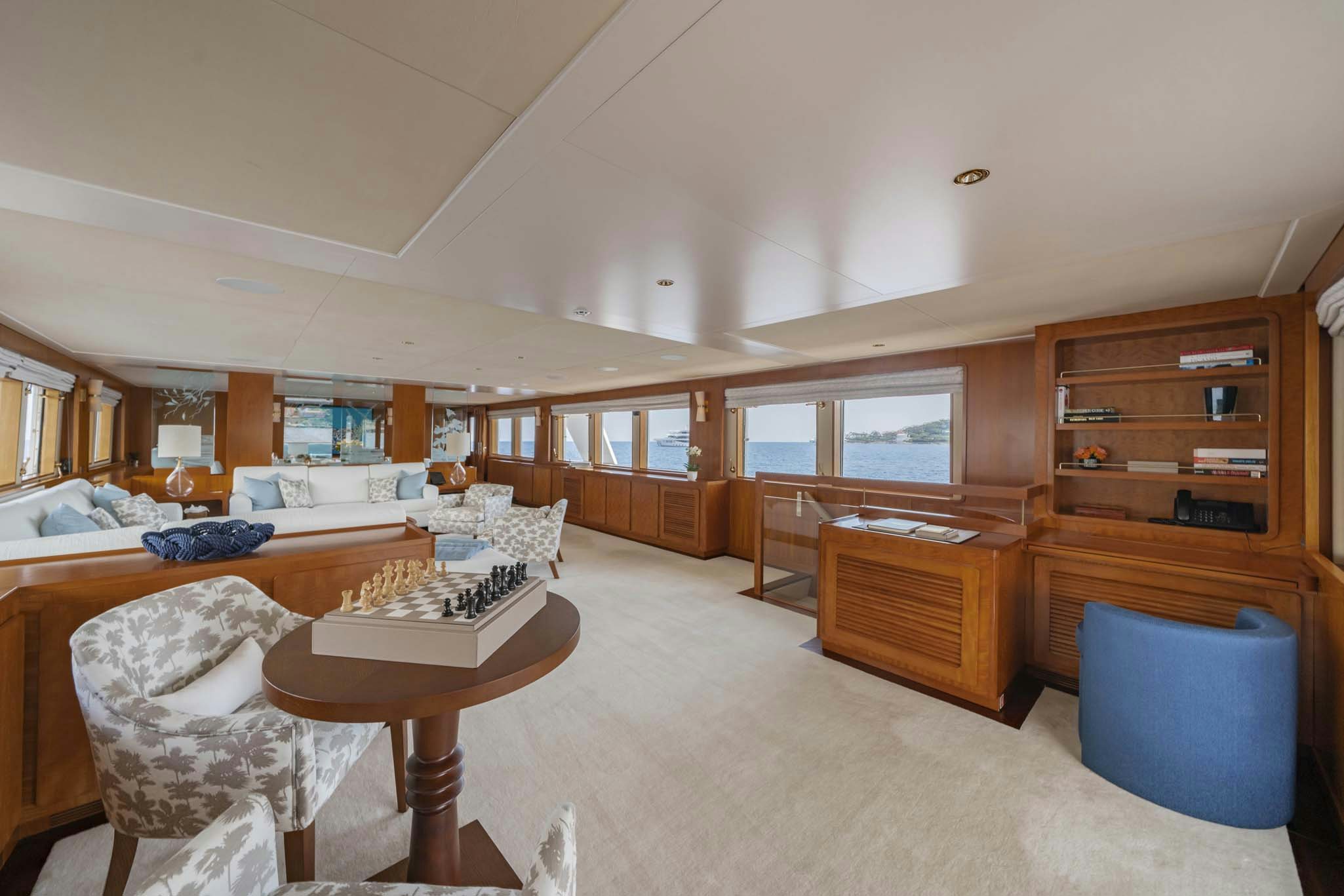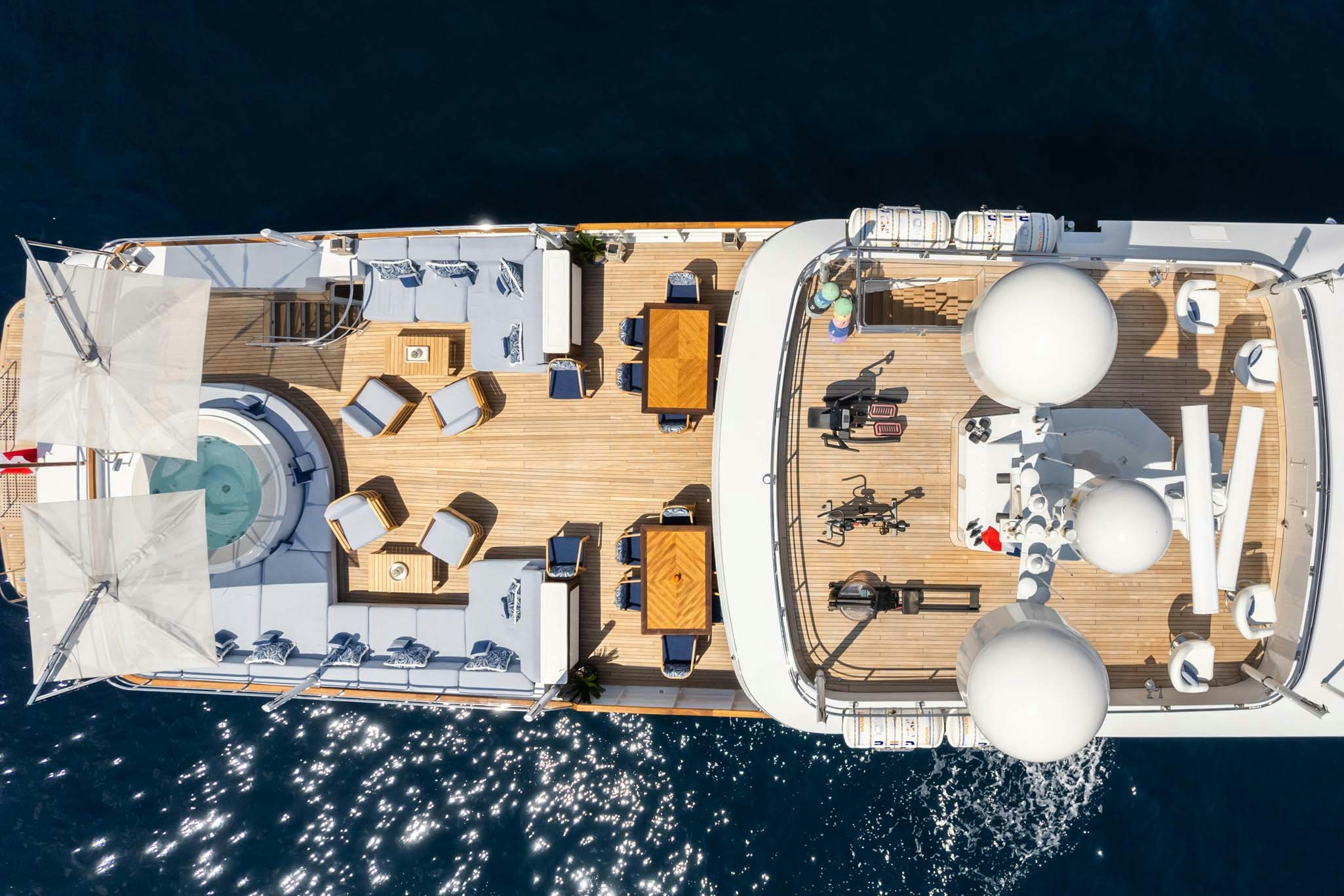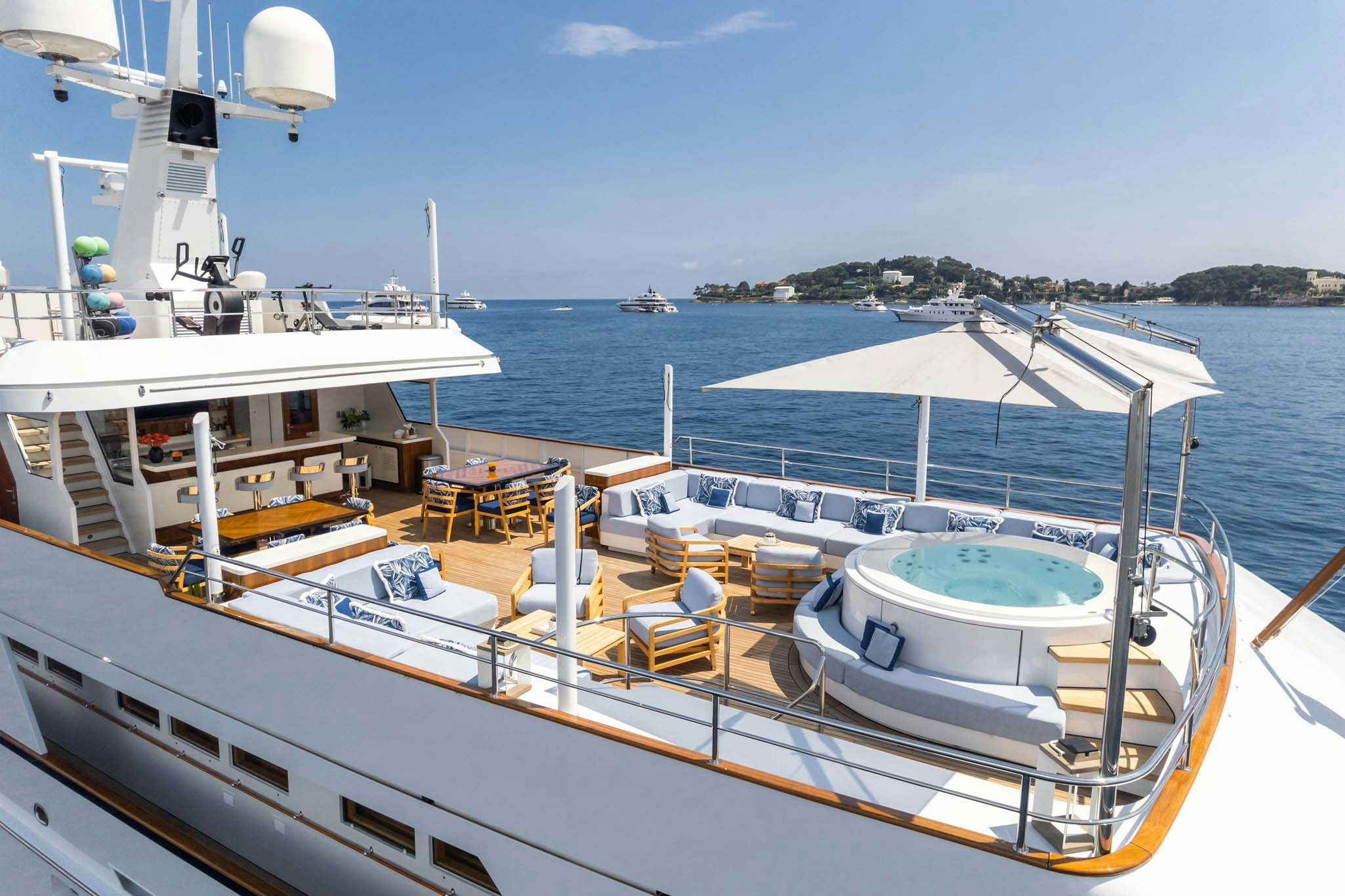 However, the highlight of her two-year refit by Monaco Marine is found on her impressive aft bridge deck. A Jacuzzi can now be found forward surrounded by sun beds and seating. Two large lounge areas with sofas and teak occasional chairs on either side of this huge deck space add to the abundance of places to relax. Two units also on either side, both with large TVs, divide the area from the deck table. This table can be split into two smaller tables for more intimate gatherings or set as one large table for bigger groups. A large bar with seating for four completes the space. Thanks to this refit, she has now entered back into Lloyd’s class — an impressive feat.