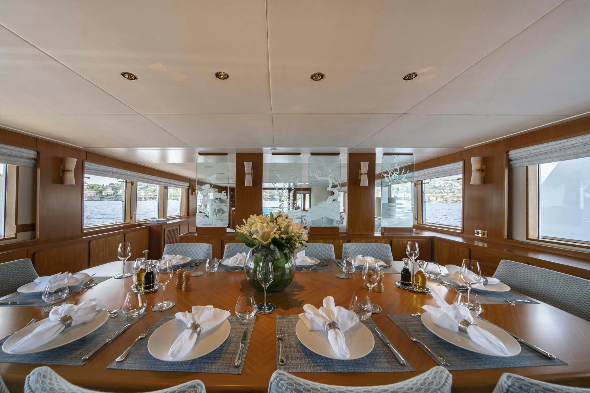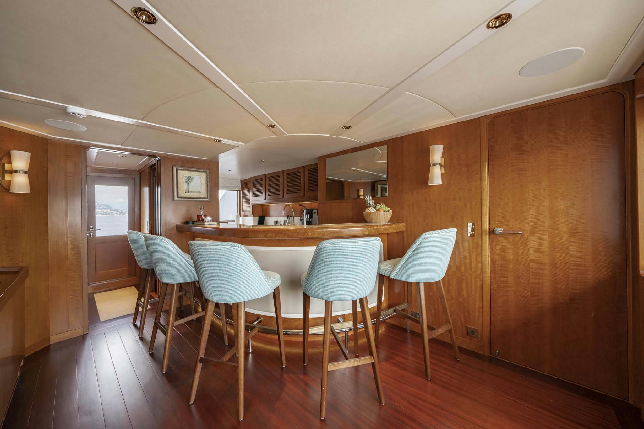 This design works particularly well in her main salon. Located on the main deck and accessible via large sliding doors from the aft deck, the dining space is elegant and well illuminated thanks to large windows and unique glass paneling separating a lounge area with games table and plush seating. Moving midships is a separate bar with seating for five.