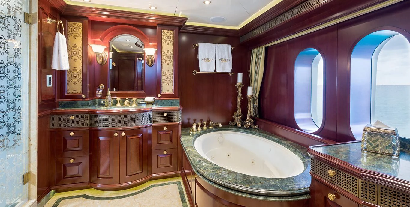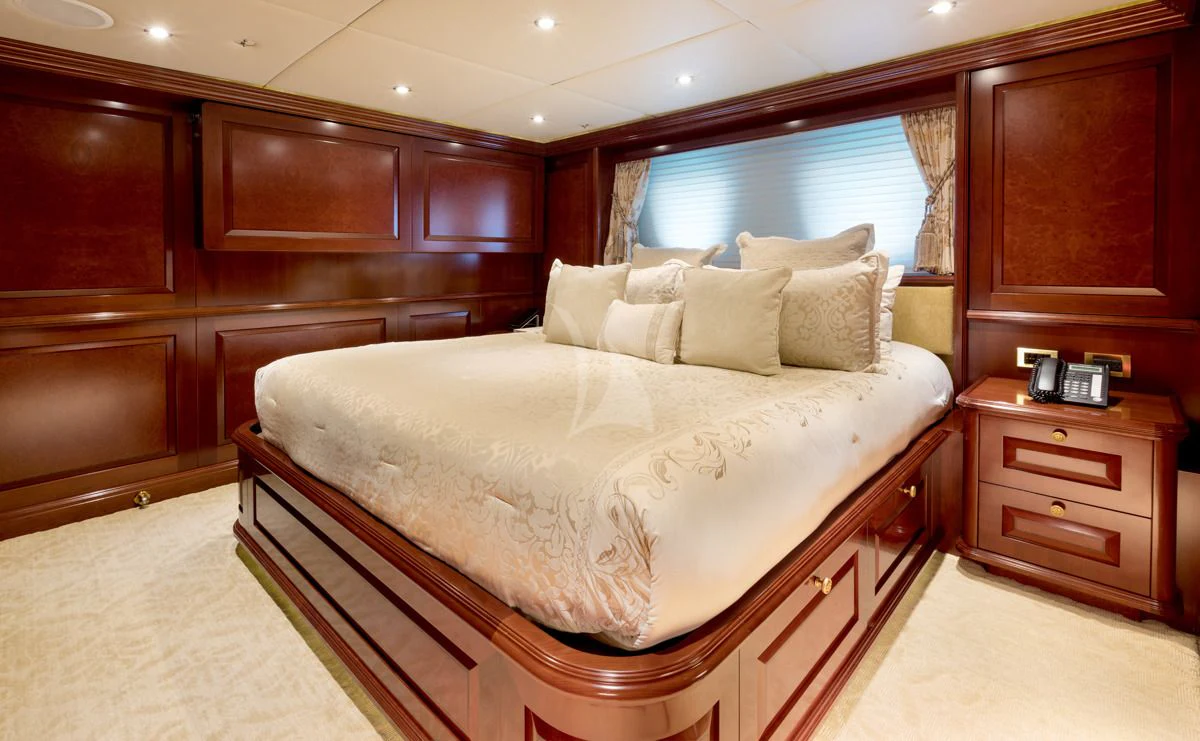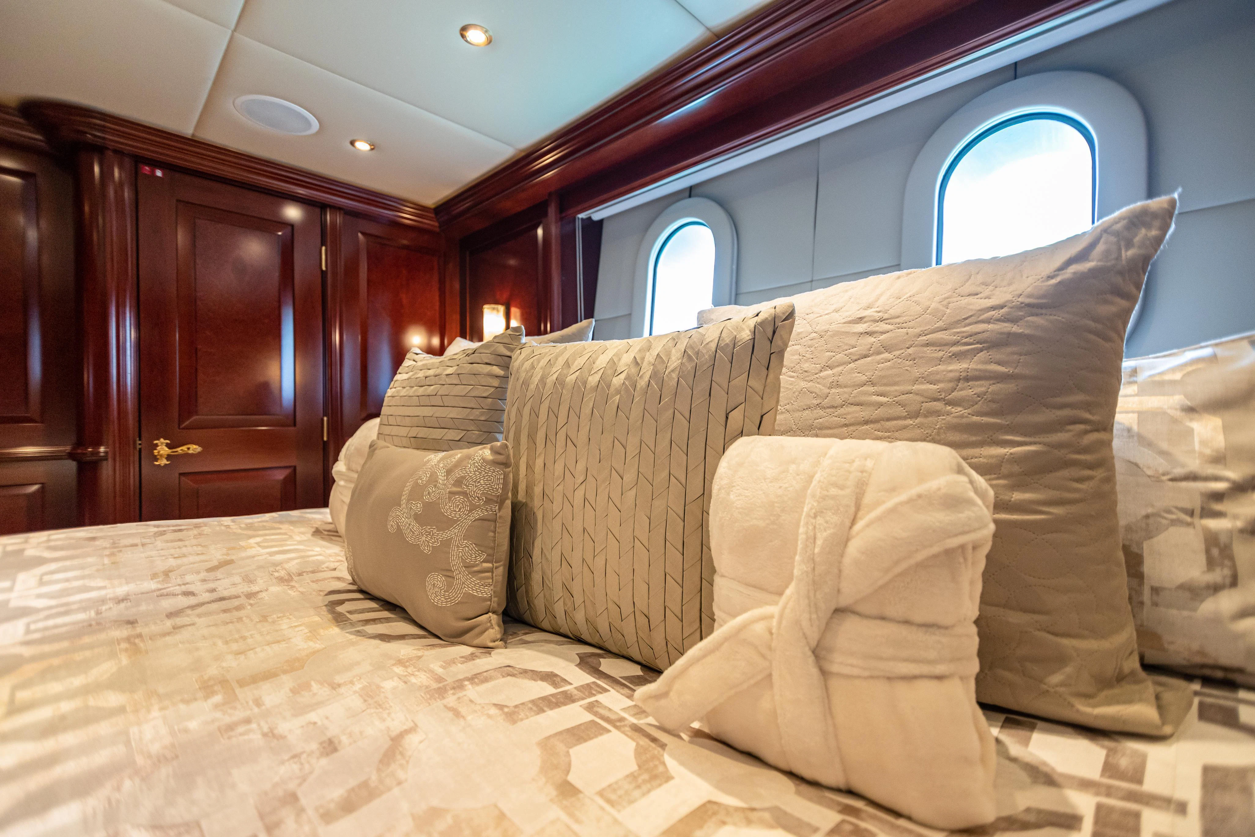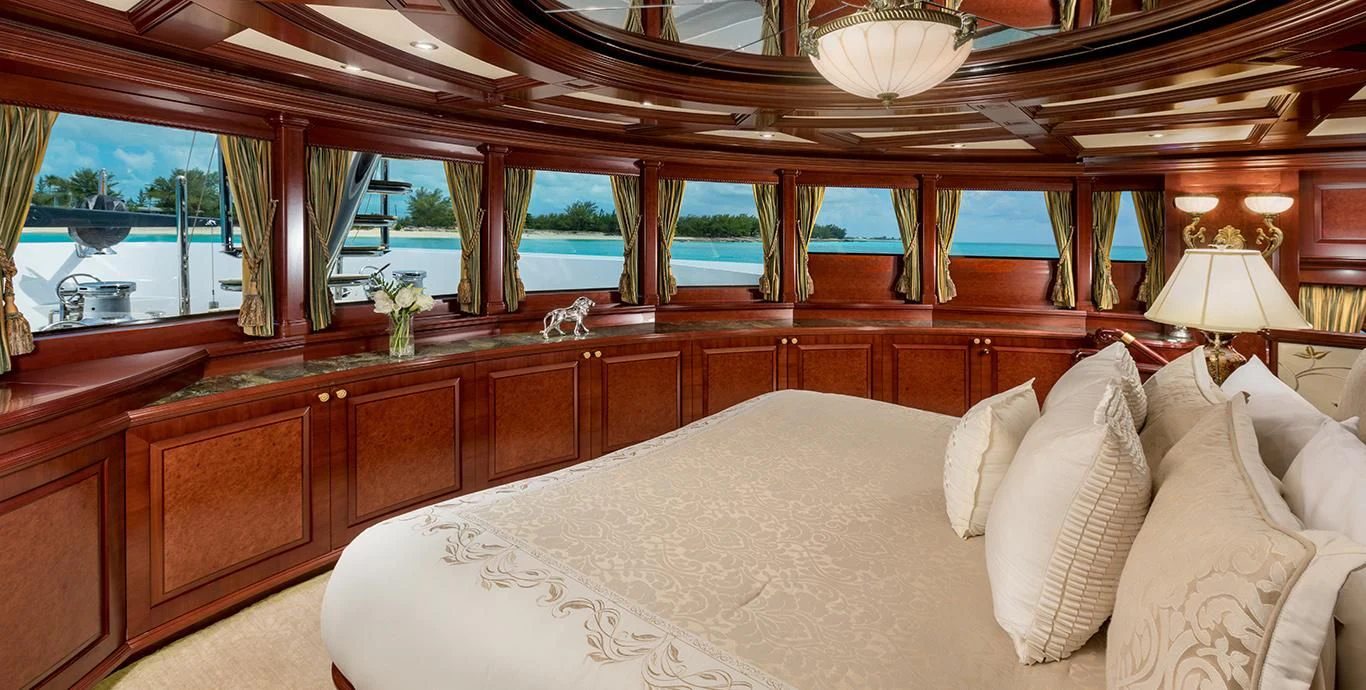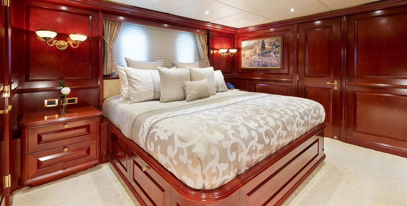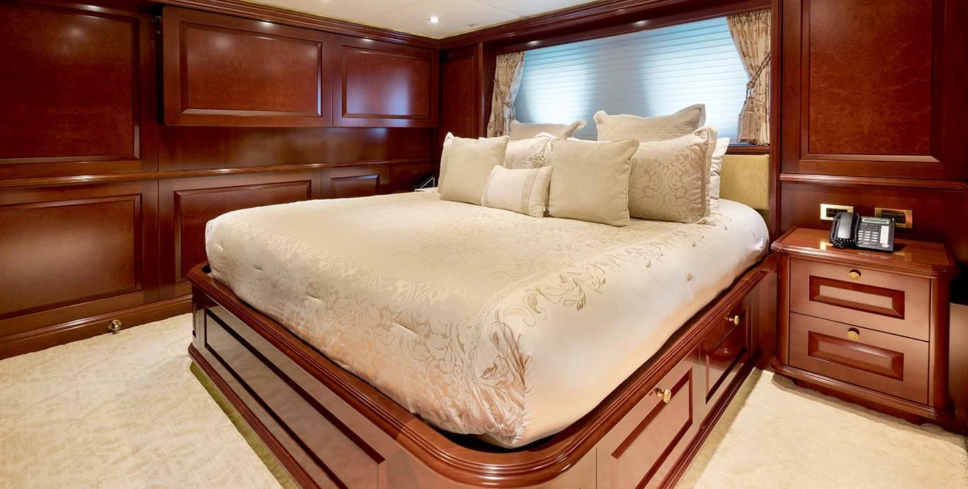 TCB accommodates up to 11 guests to spend restful nights in her five beautifully-appointed staterooms. The full-beam, split-level master suite is ideally suited for privacy. 180-degree views can be seen from the upper level, giving this space a flow of natural light. A unique feature of this stateroom is the intimate lounge on the lower level, perfect for taking a break from the action and unwinding in seclusion. A large his-and-hers en-suite is accessed through the lower level lounge and features a large Jacuzzi tub, vanity and shower. TCB’s additional accommodations include four en-suite staterooms on the lower deck, comprised of two king-size staterooms and two twin staterooms, each with Pullmans accommodating small children. Each stateroom onboard showcases elegant styling as seen throughout the yacht’s interior.
