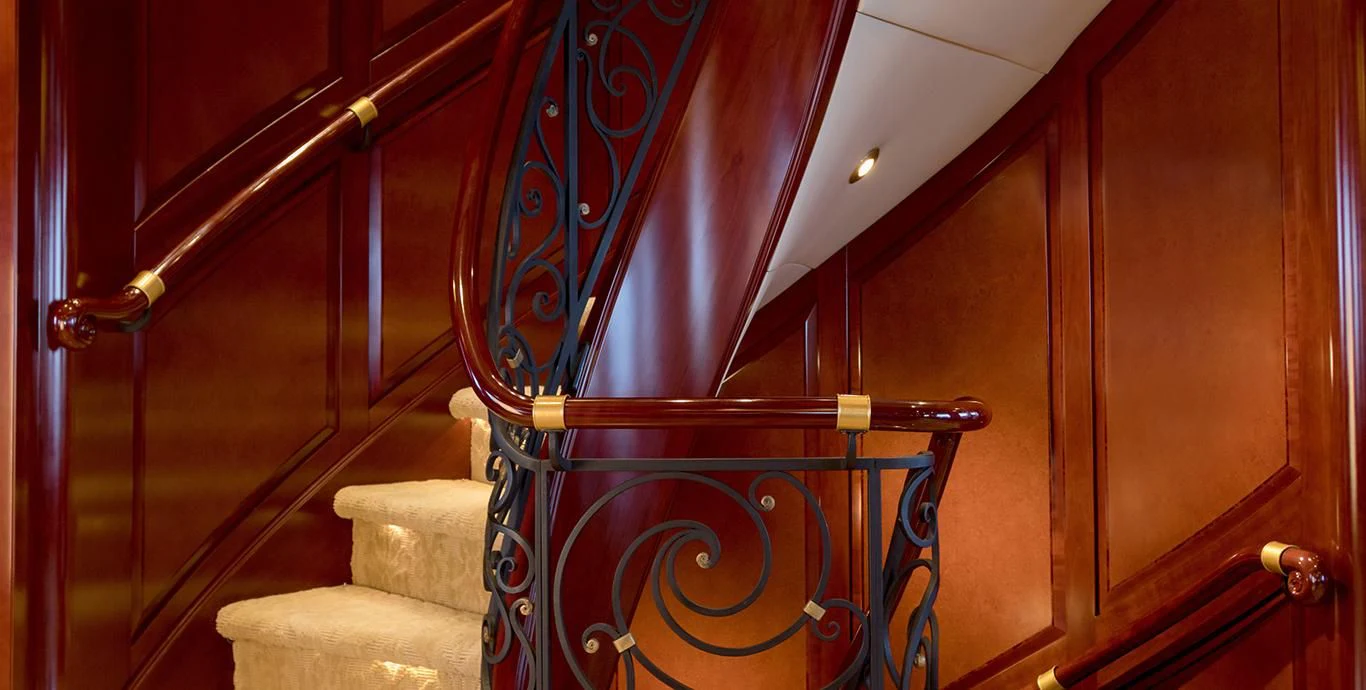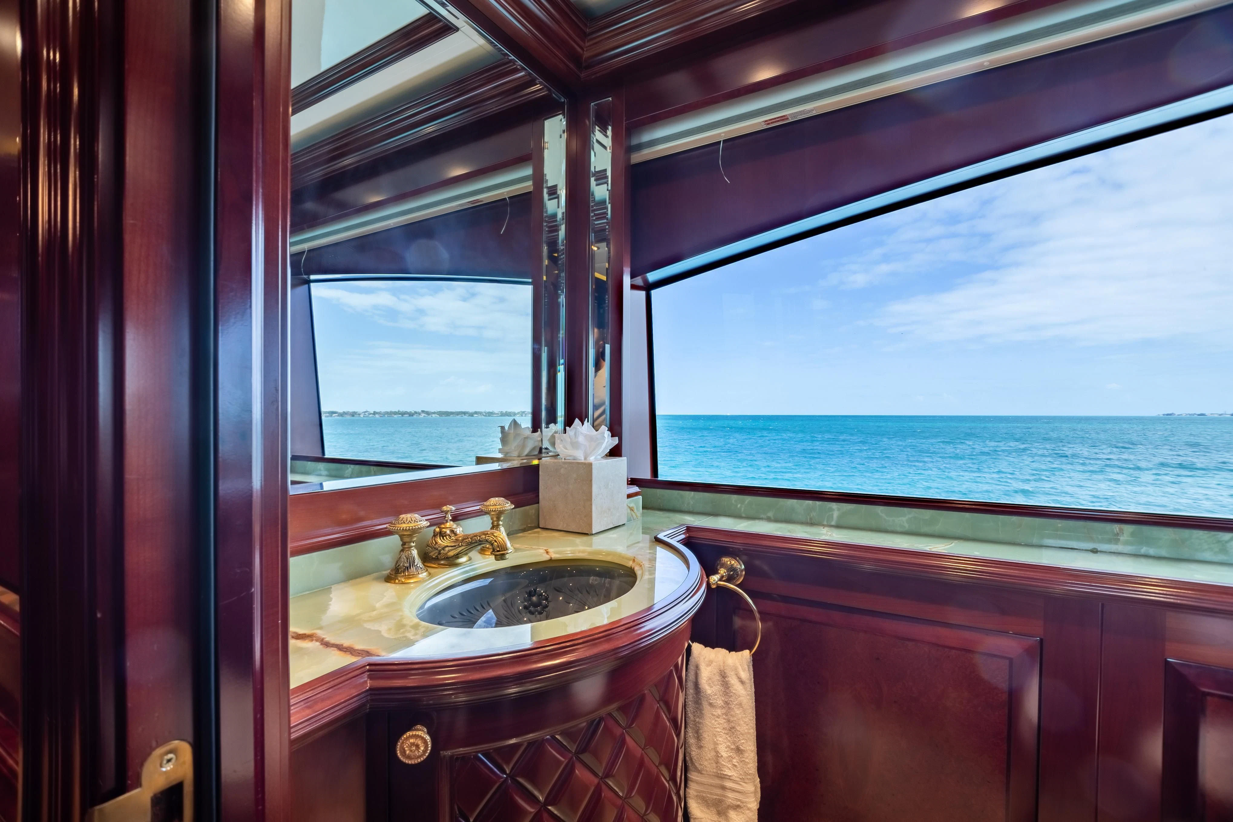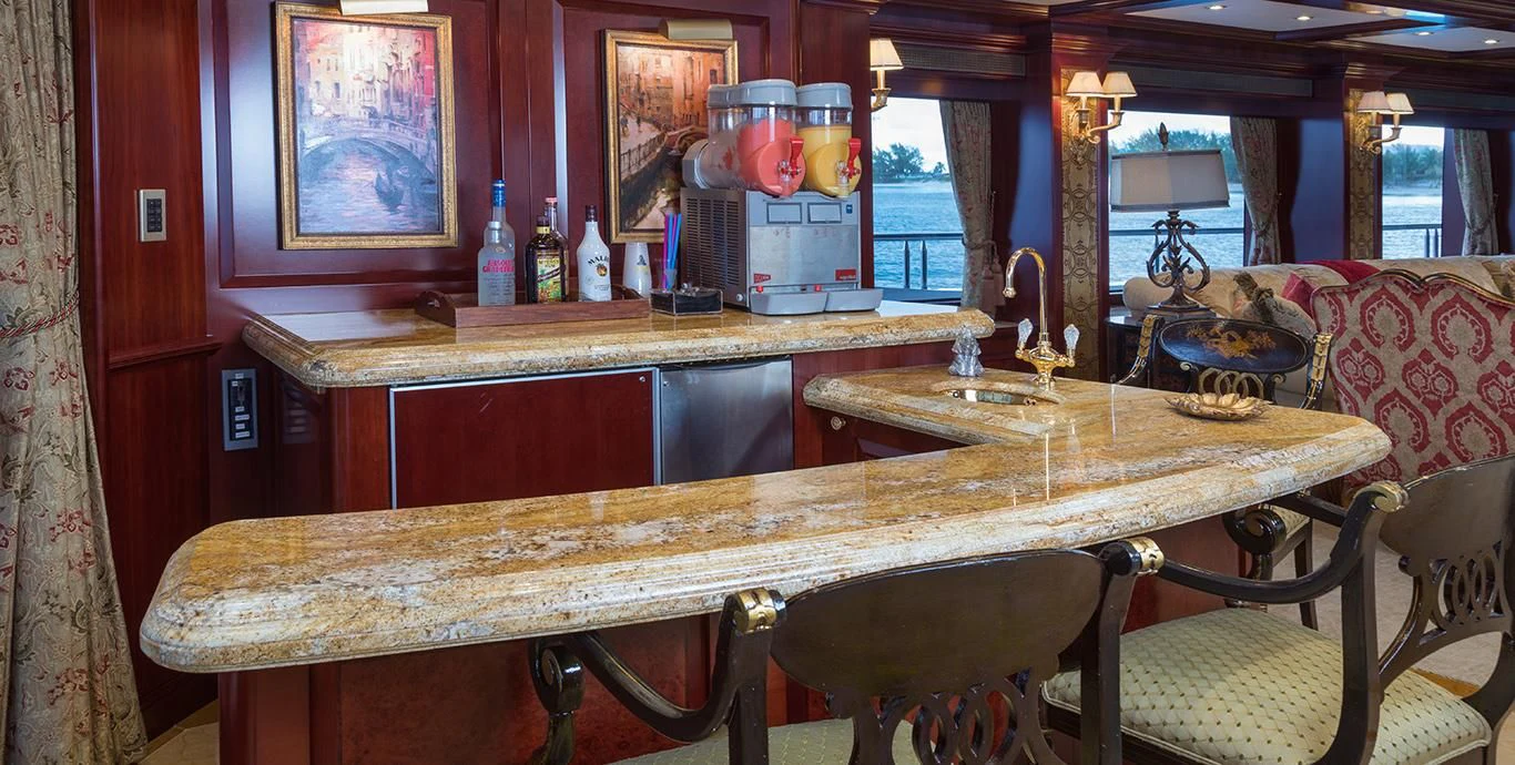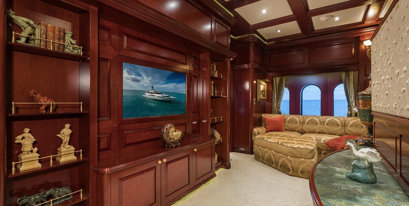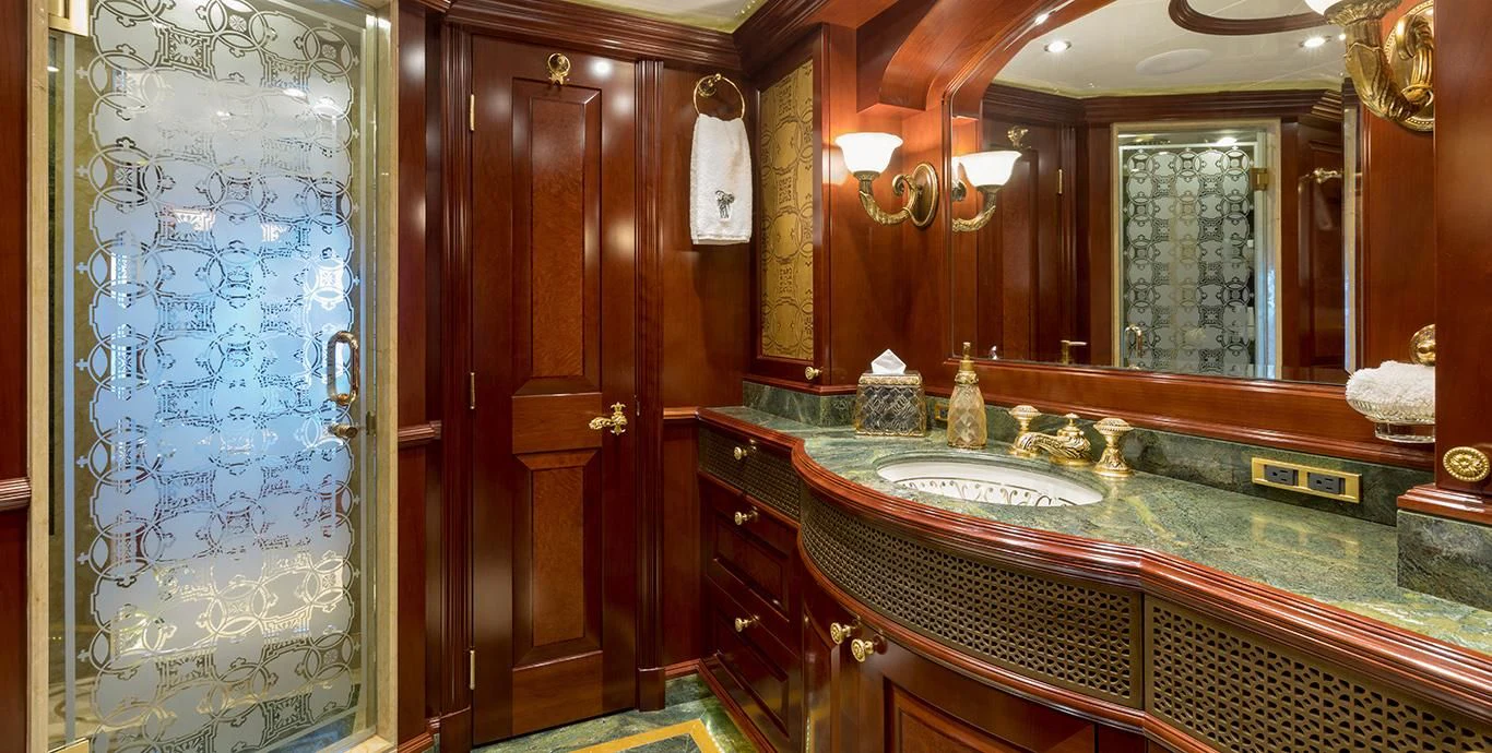 TCB accommodates up to 11 guests to spend restful nights in her five beautifully-appointed staterooms. The full-beam, split-level master suite is ideally suited for privacy. 180-degree views can be seen from the upper level, giving this space a flow of natural light. A unique feature of this stateroom is the intimate lounge on the lower level, perfect for taking a break from the action and unwinding in seclusion. A large his-and-hers en-suite is accessed through the lower level lounge and features a large Jacuzzi tub, vanity and shower. TCB’s additional accommodations include four en-suite staterooms on the lower deck, comprised of two king-size staterooms and two twin staterooms, each with Pullmans accommodating small children. Each stateroom onboard showcases elegant styling as seen throughout the yacht’s interior.