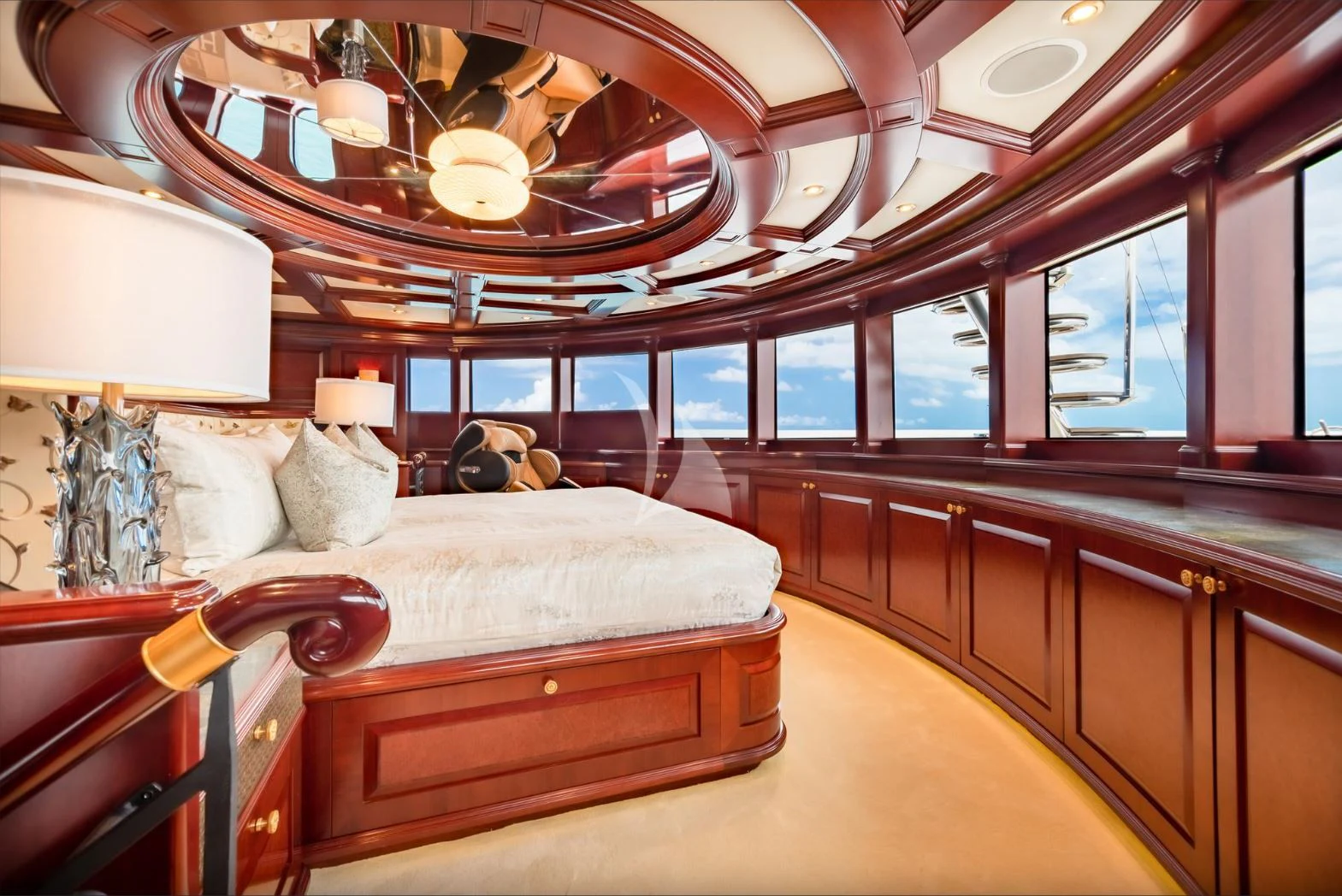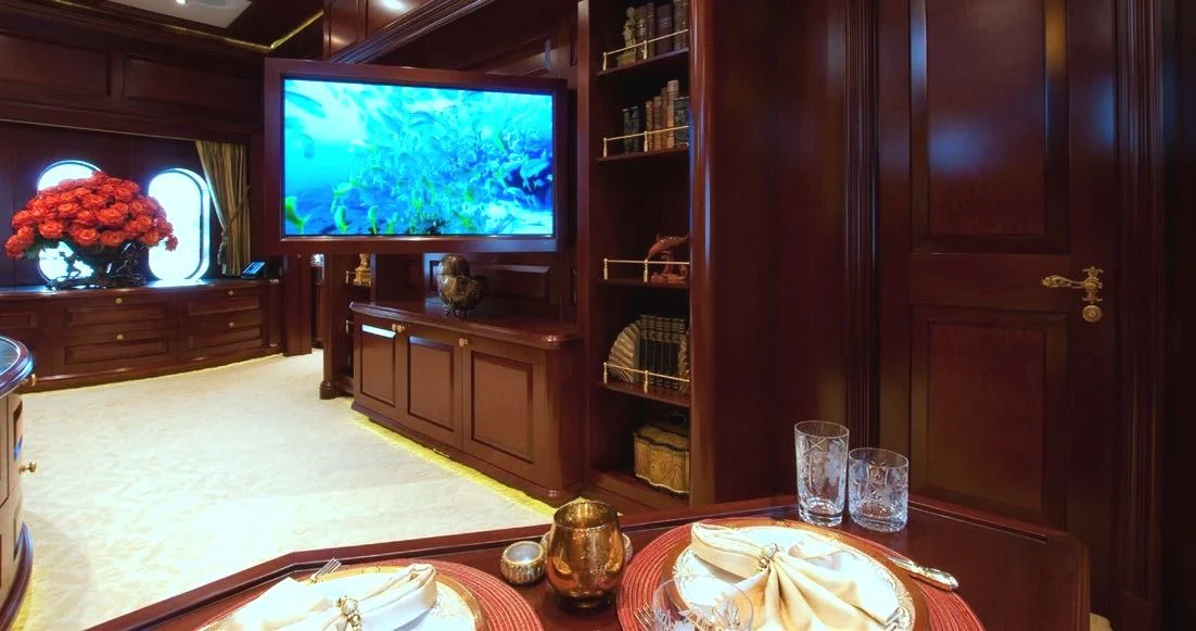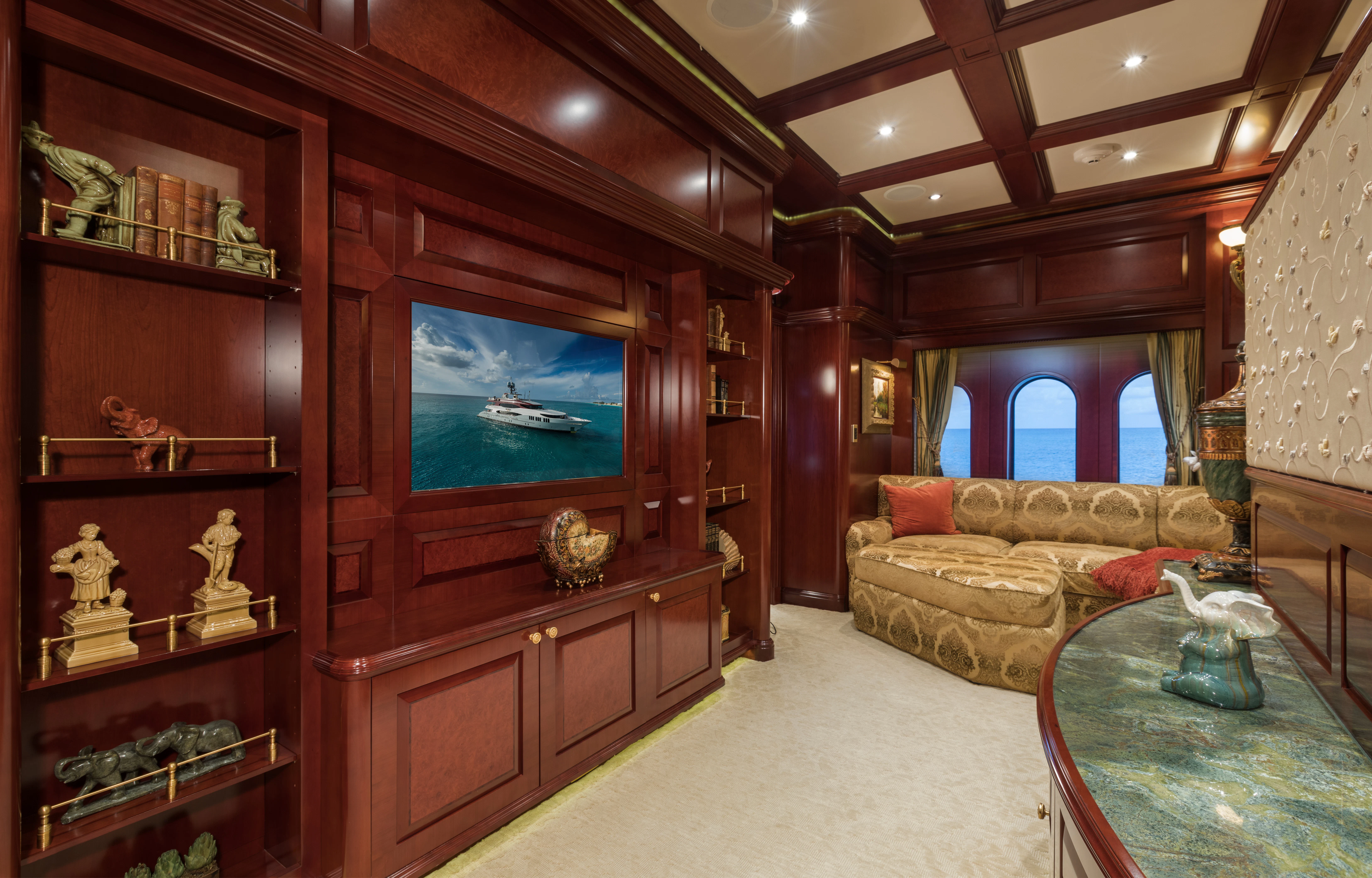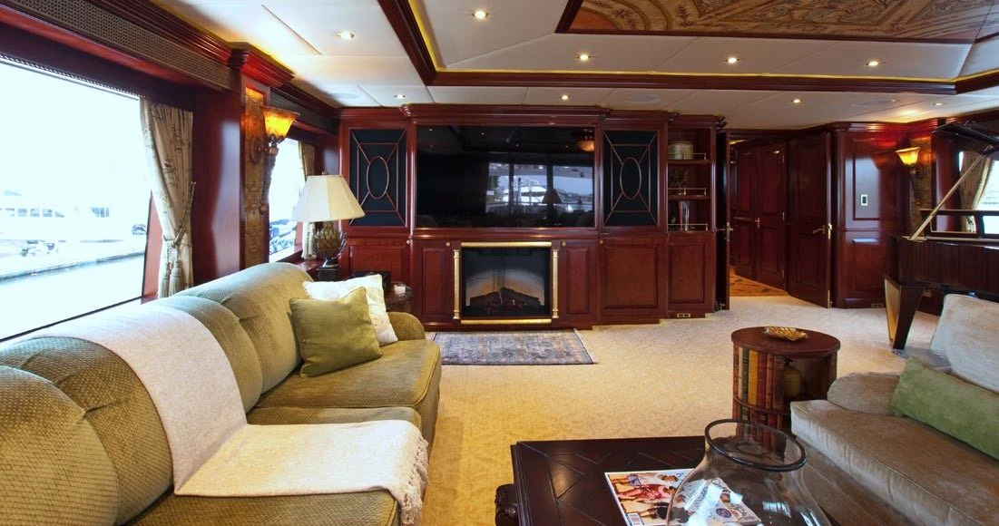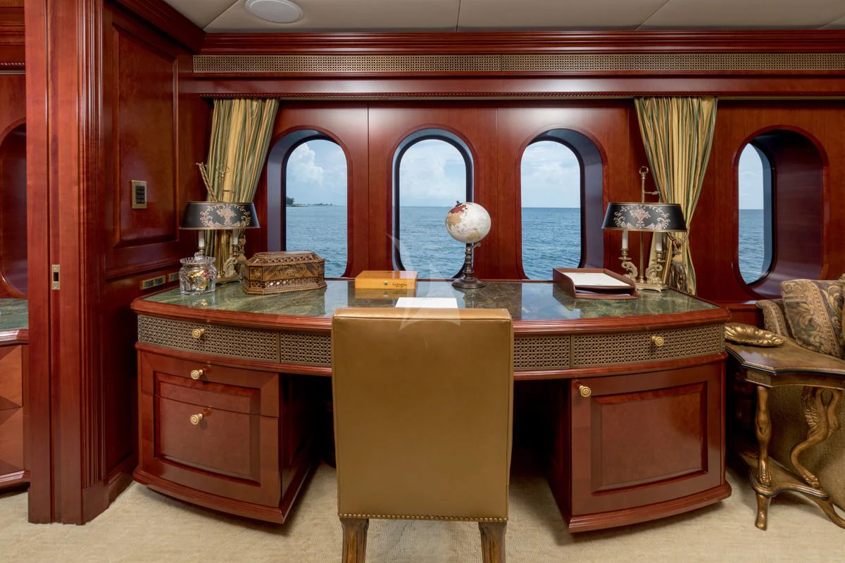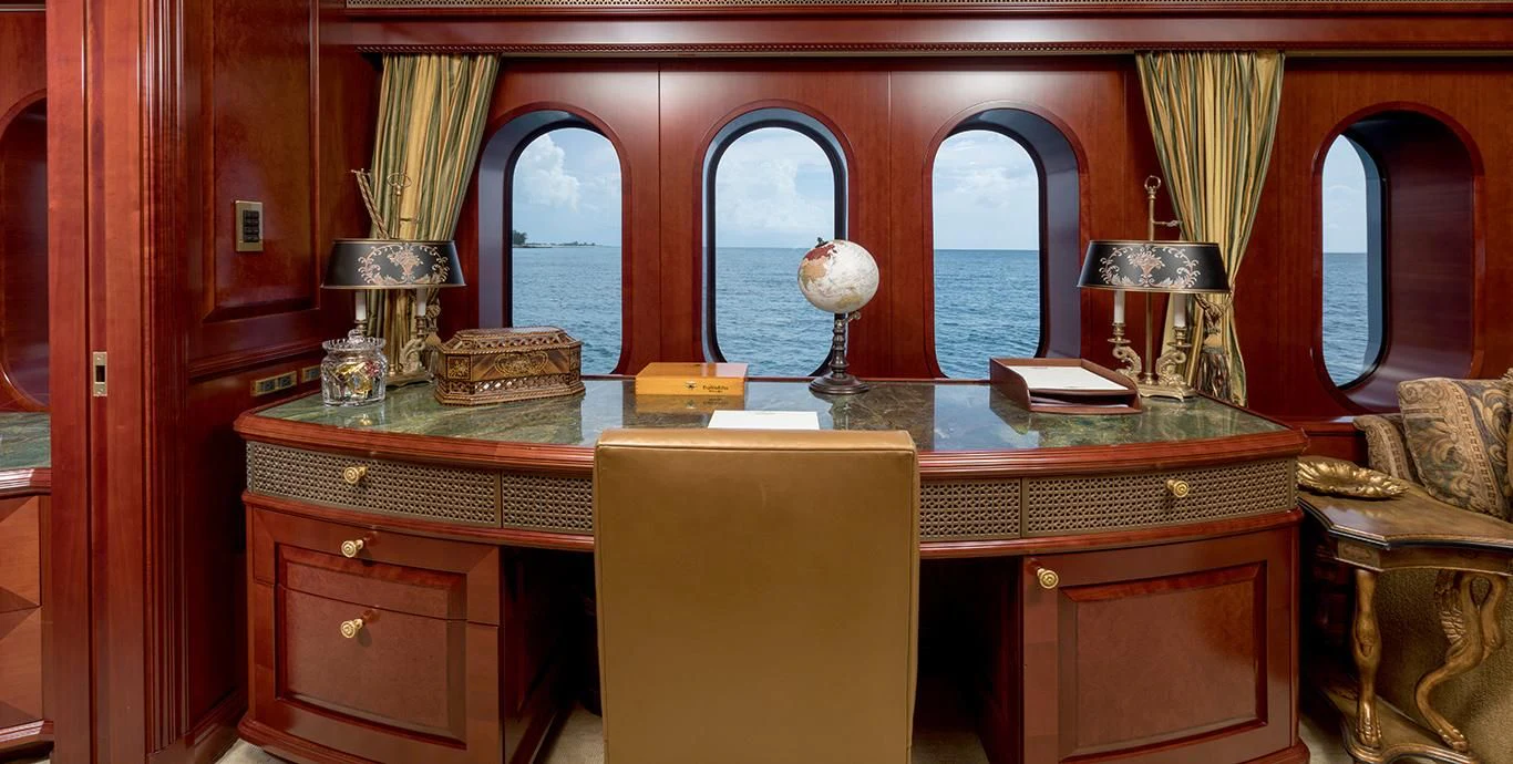 TCB accommodates up to 11 guests to spend restful nights in her five beautifully-appointed staterooms. The full-beam, split-level master suite is ideally suited for privacy. 180-degree views can be seen from the upper level, giving this space a flow of natural light. A unique feature of this stateroom is the intimate lounge on the lower level, perfect for taking a break from the action and unwinding in seclusion. A large his-and-hers en-suite is accessed through the lower level lounge and features a large Jacuzzi tub, vanity and shower. TCB’s additional accommodations include four en-suite staterooms on the lower deck, comprised of two king-size staterooms and two twin staterooms, each with Pullmans accommodating small children. Each stateroom onboard showcases elegant styling as seen throughout the yacht’s interior.