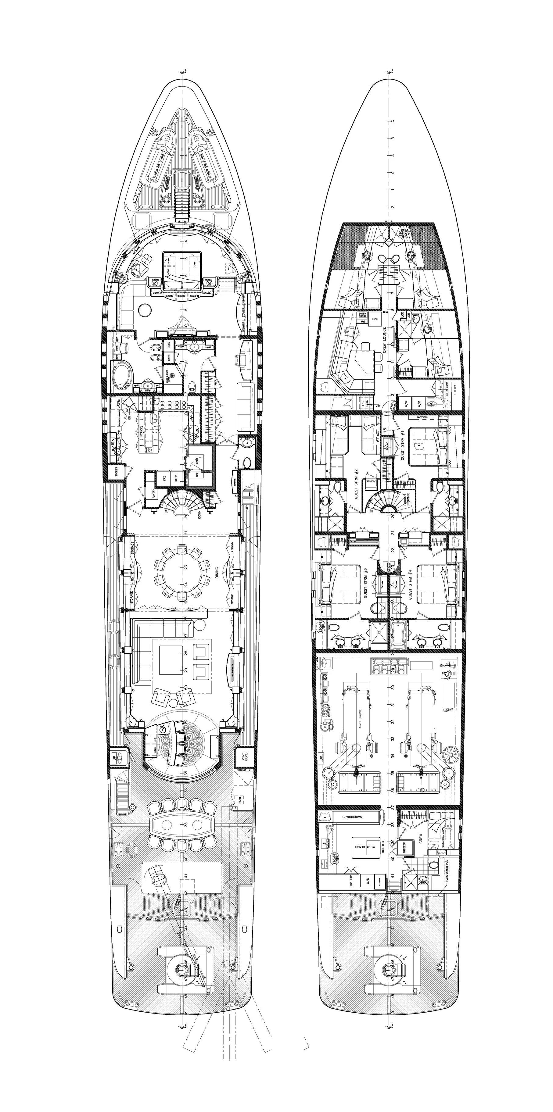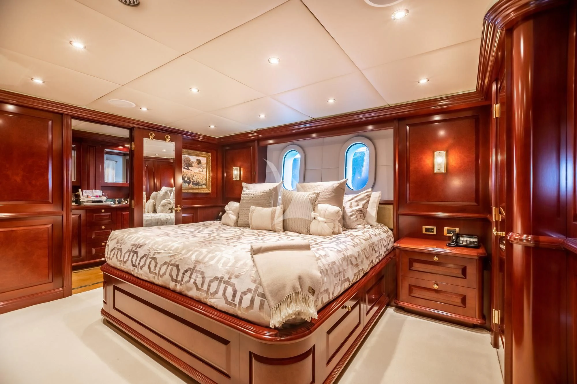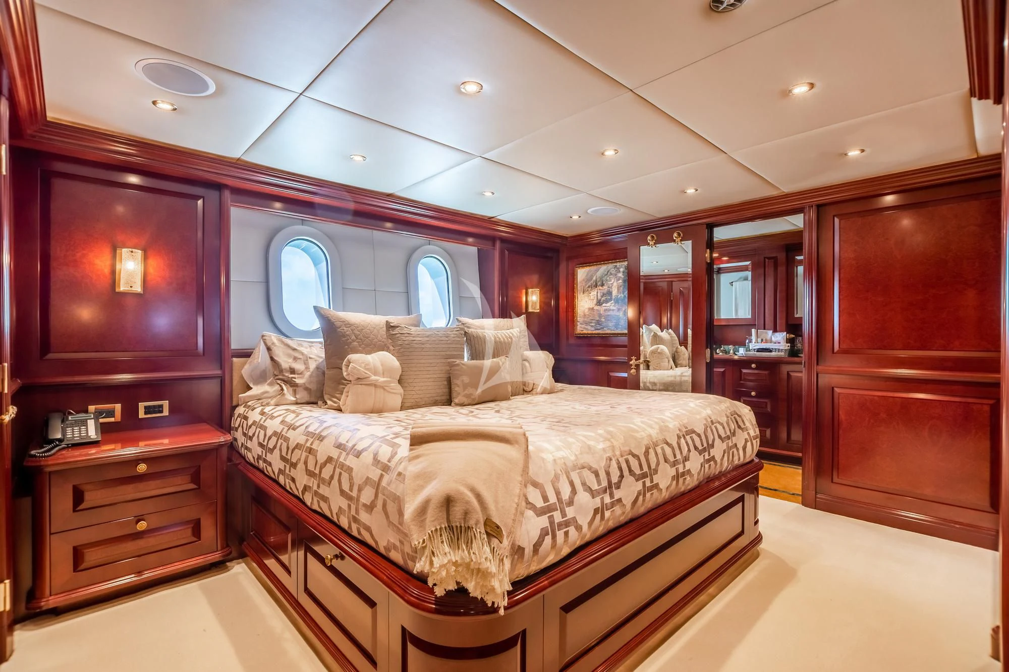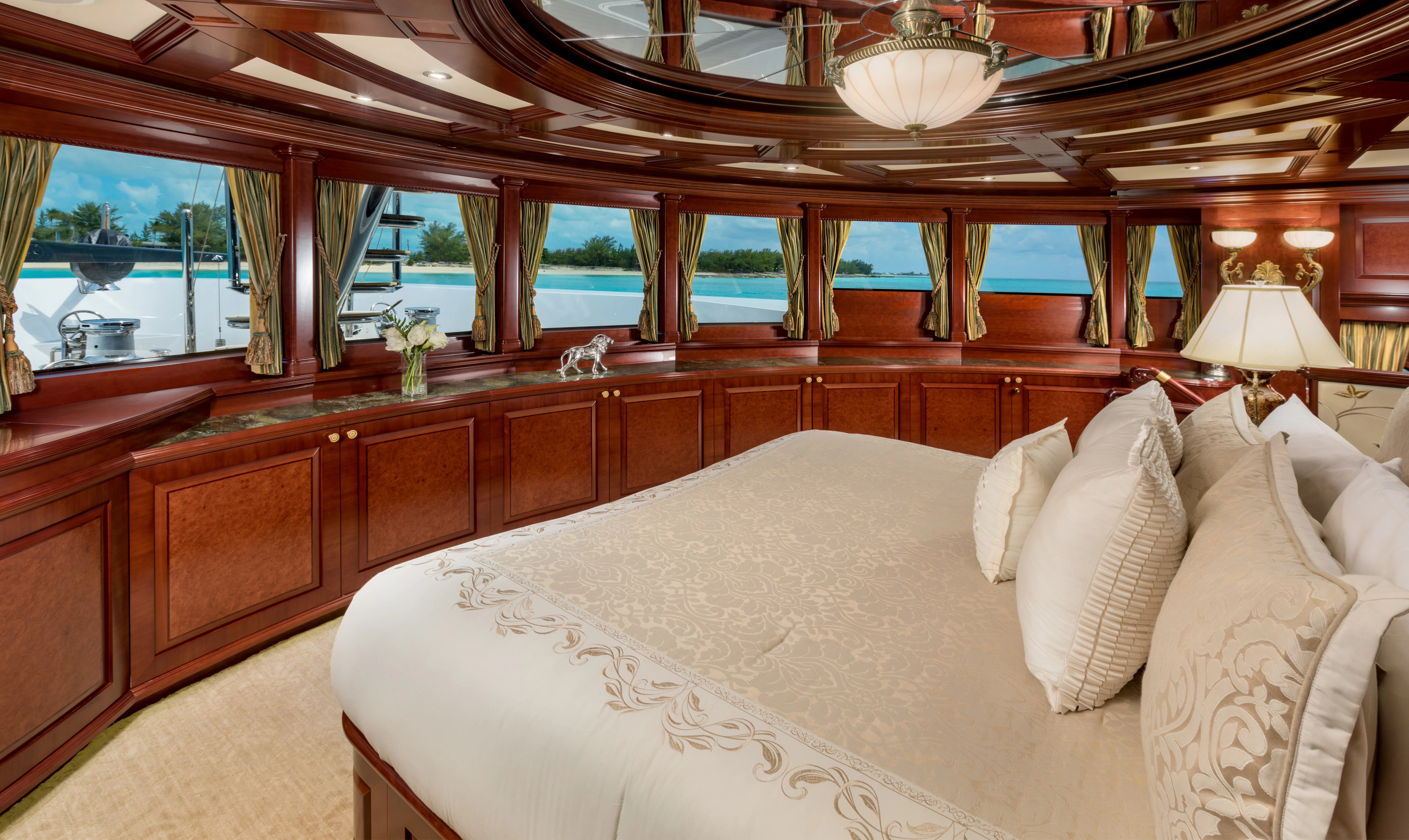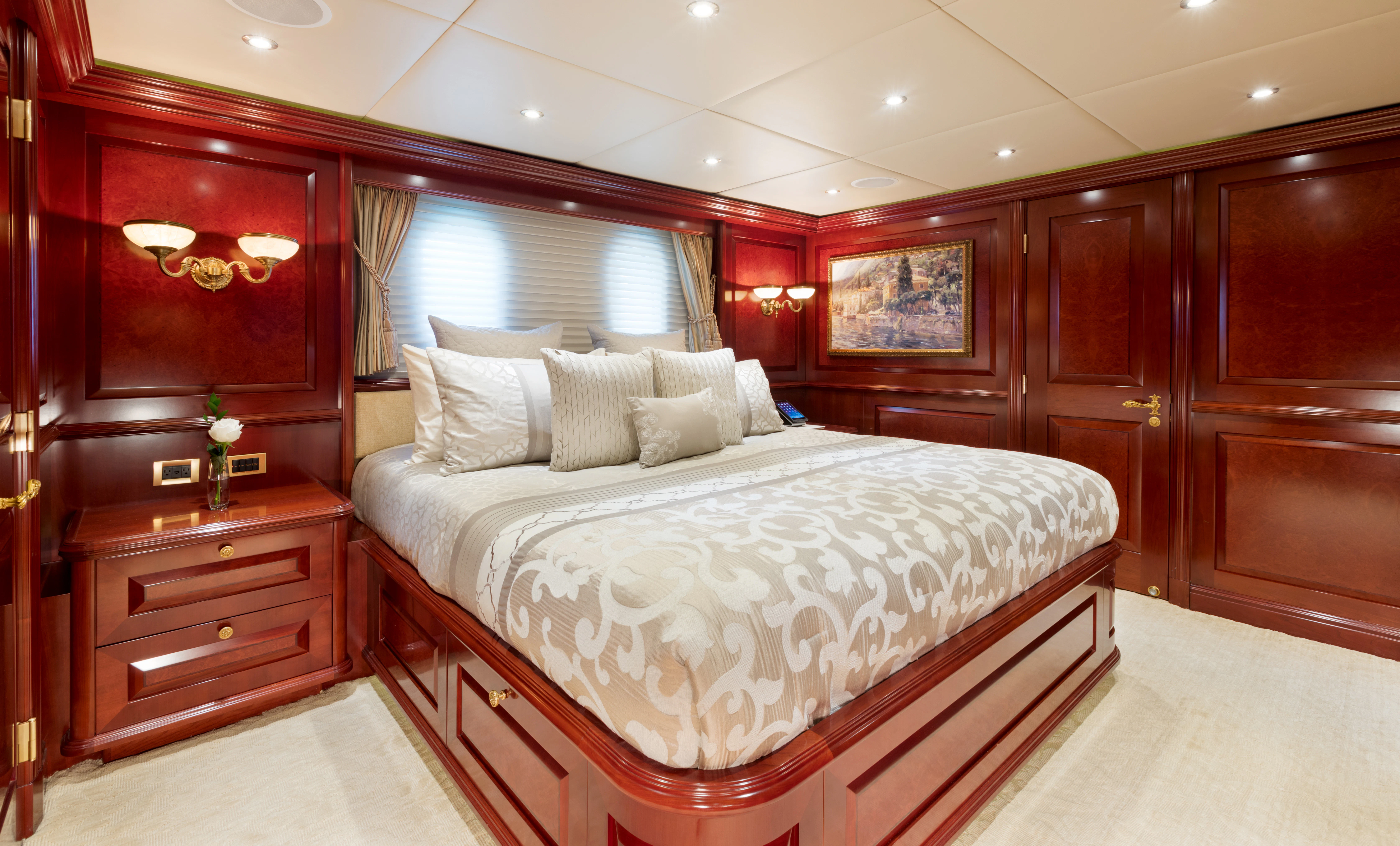 TCB accommodates up to 11 guests to spend restful nights in her five beautifully-appointed staterooms. The full-beam, split-level master suite is ideally suited for privacy. 180-degree views can be seen from the upper level, giving this space a flow of natural light. A unique feature of this stateroom is the intimate lounge on the lower level, perfect for taking a break from the action and unwinding in seclusion. A large his-and-hers en-suite is accessed through the lower level lounge and features a large Jacuzzi tub, vanity and shower. TCB’s additional accommodations include four en-suite staterooms on the lower deck, comprised of two king-size staterooms and two twin staterooms, each with Pullmans accommodating small children. Each stateroom onboard showcases elegant styling as seen throughout the yacht’s interior.