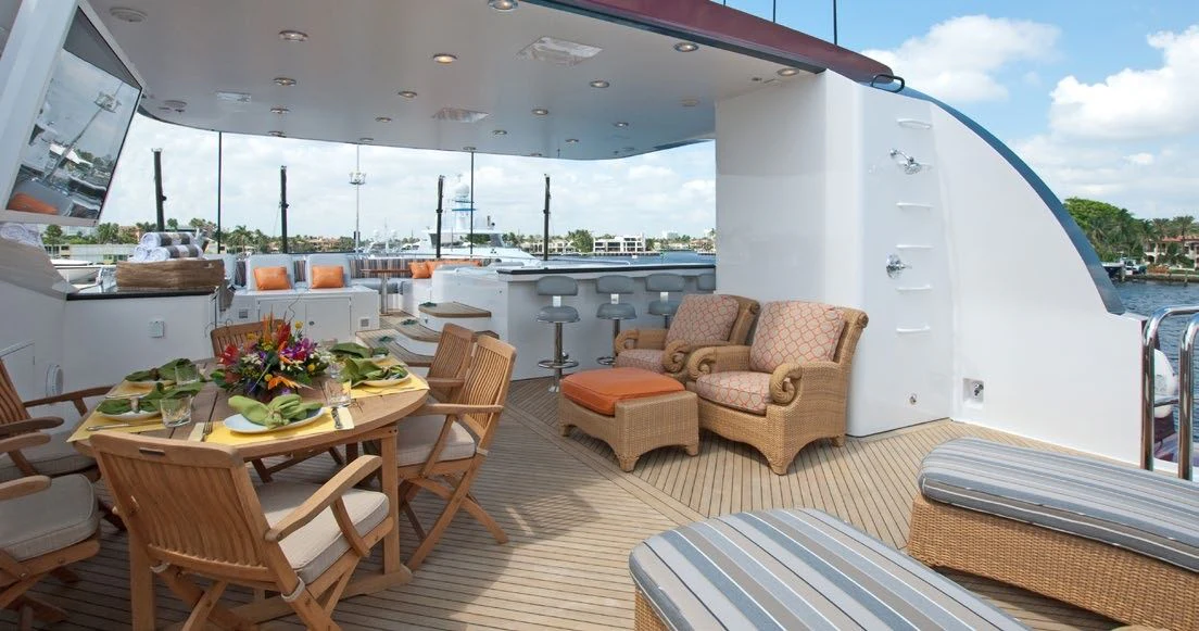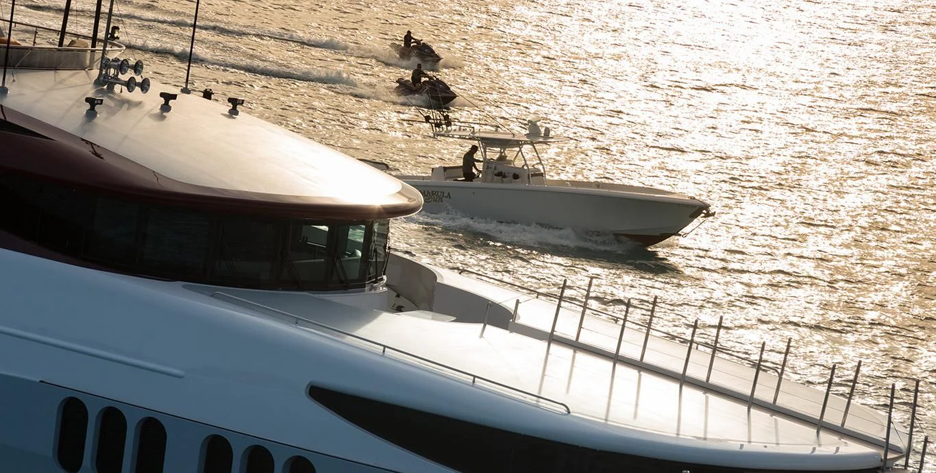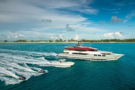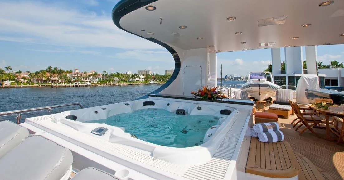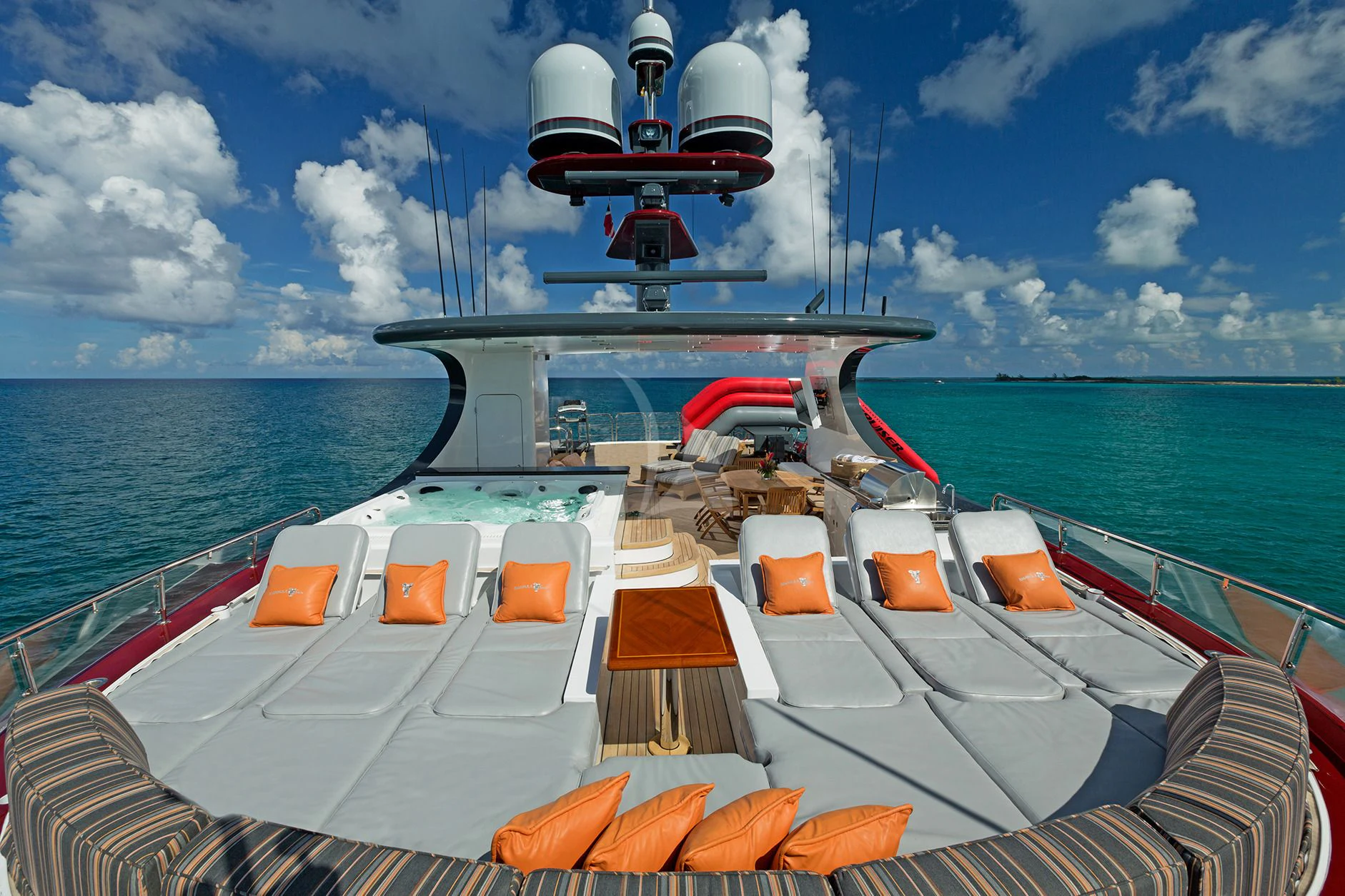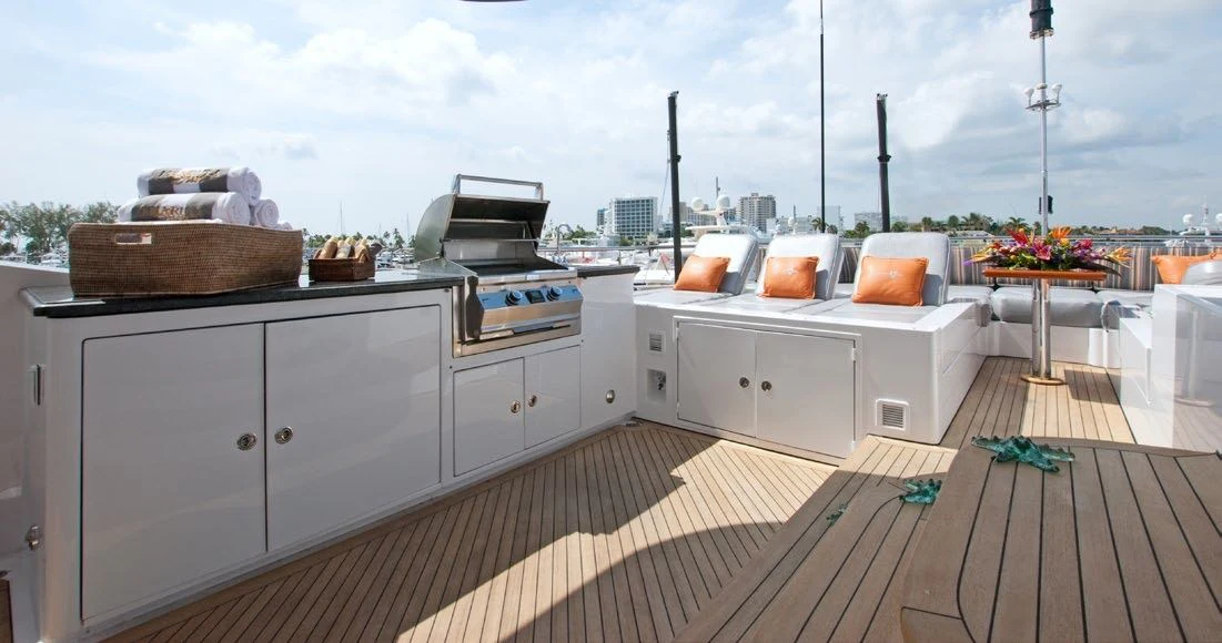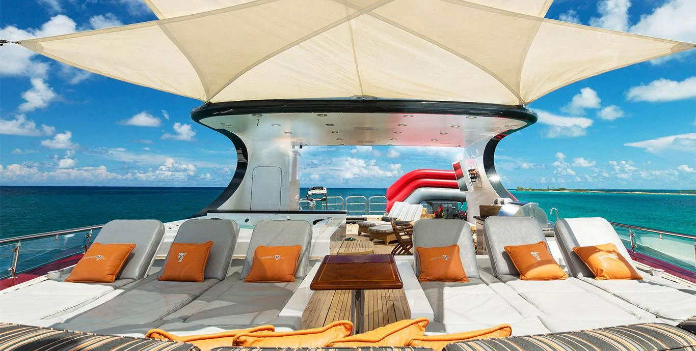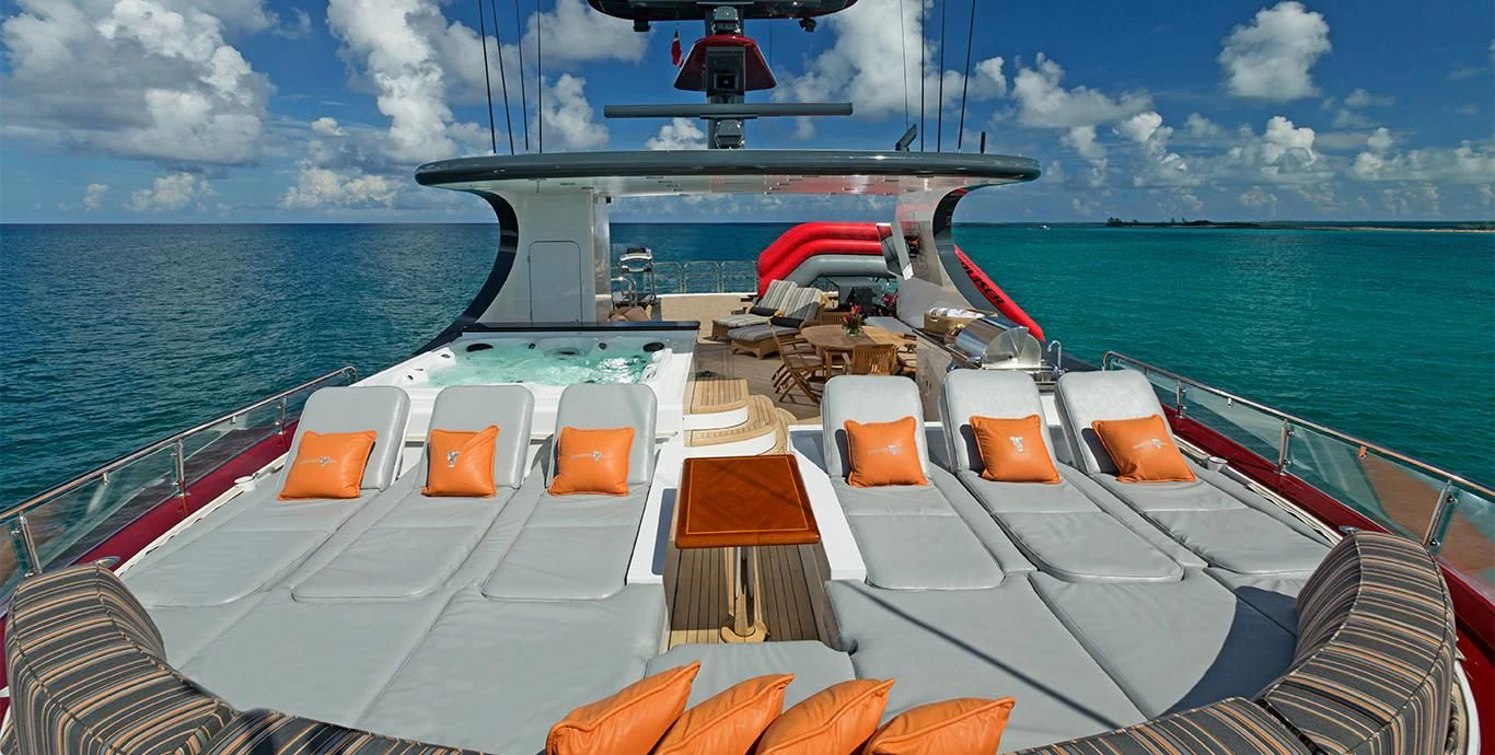 Guests can make their way up to TCB’S vast sundeck for fun in the sun. On this level, an alfresco gym provides guests the ability to keep their workout routine while on board with an arrangement of equipment at their disposal. A large six-person Jacuzzi invites guests to soak in the shade. The charter yacht’s deck space is large enough for guests to move around comfortably. Large built-in double-facing sunpads and sun loungers ensure guests will be in complete comfort while sunbathing, and optional shading is available when desired. TCB’s full complement of water toys will do the trick for those seeking a little exhilaration. TCB’s plethora of water toys are readily available for each guest’s enjoyment. Easy access to water toys is available from TCB’s extended swim platform and docking system making the switch from ski’s to wave runners a breeze. No matter the group, guests of all ages will find that TCB and her experienced, charter-savvy crew exceed expectations.