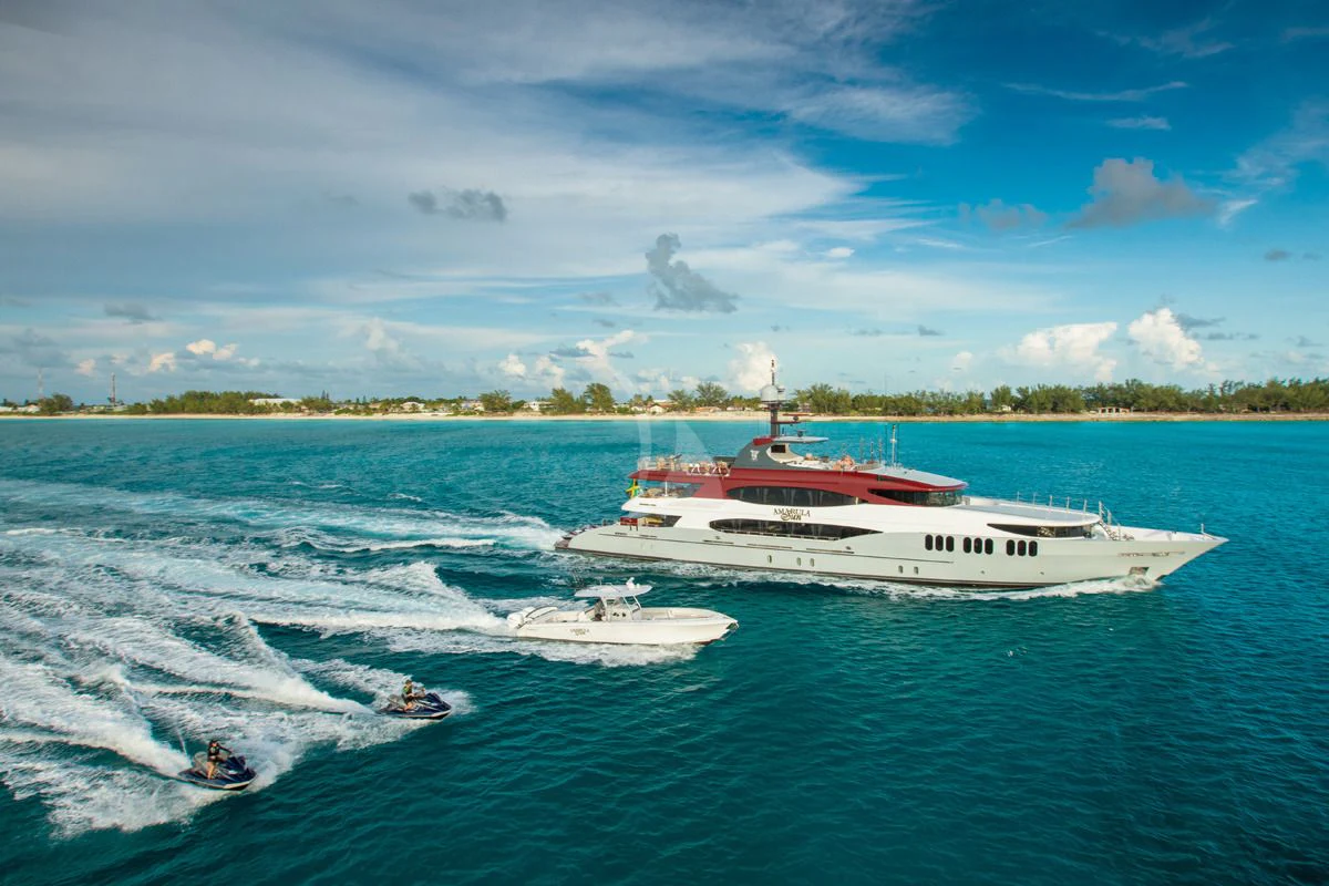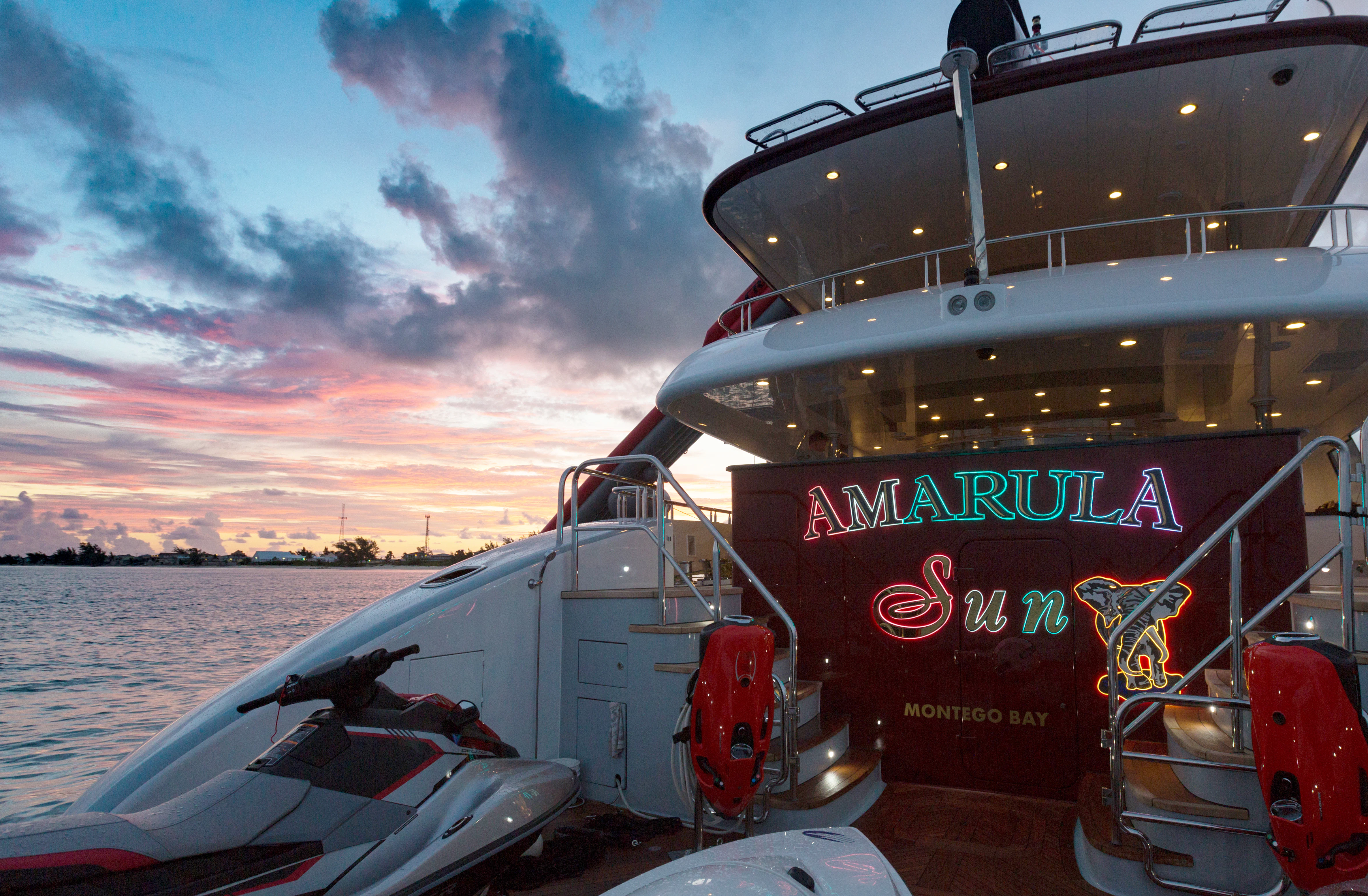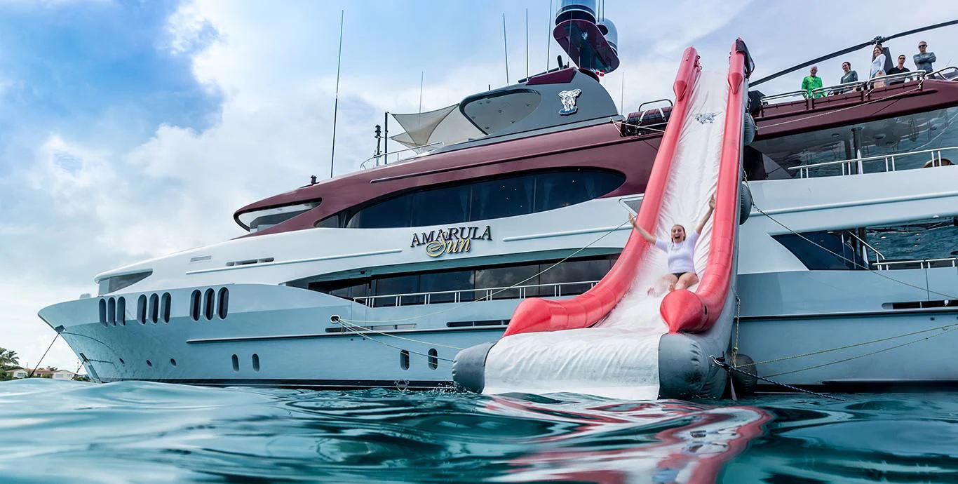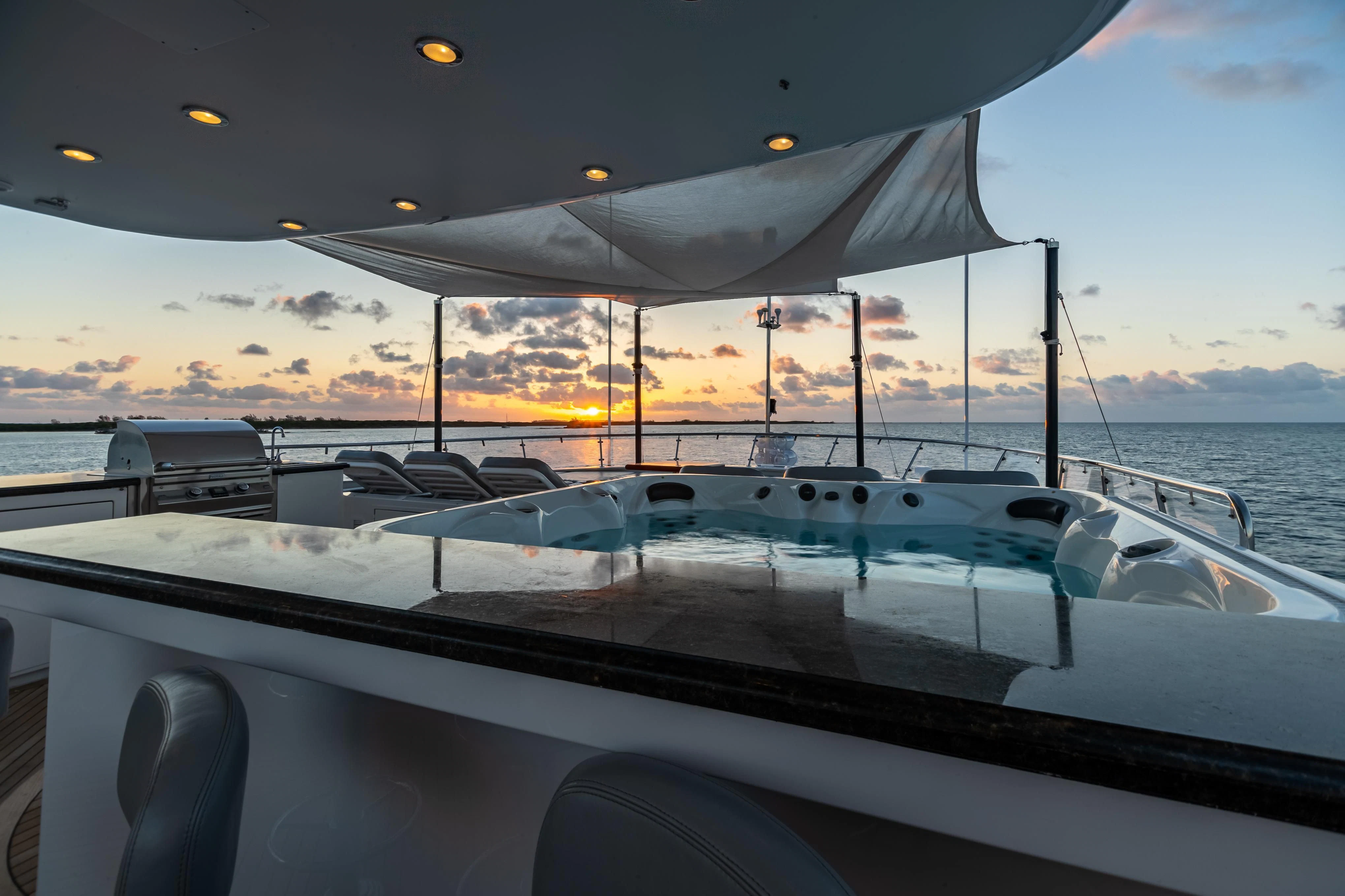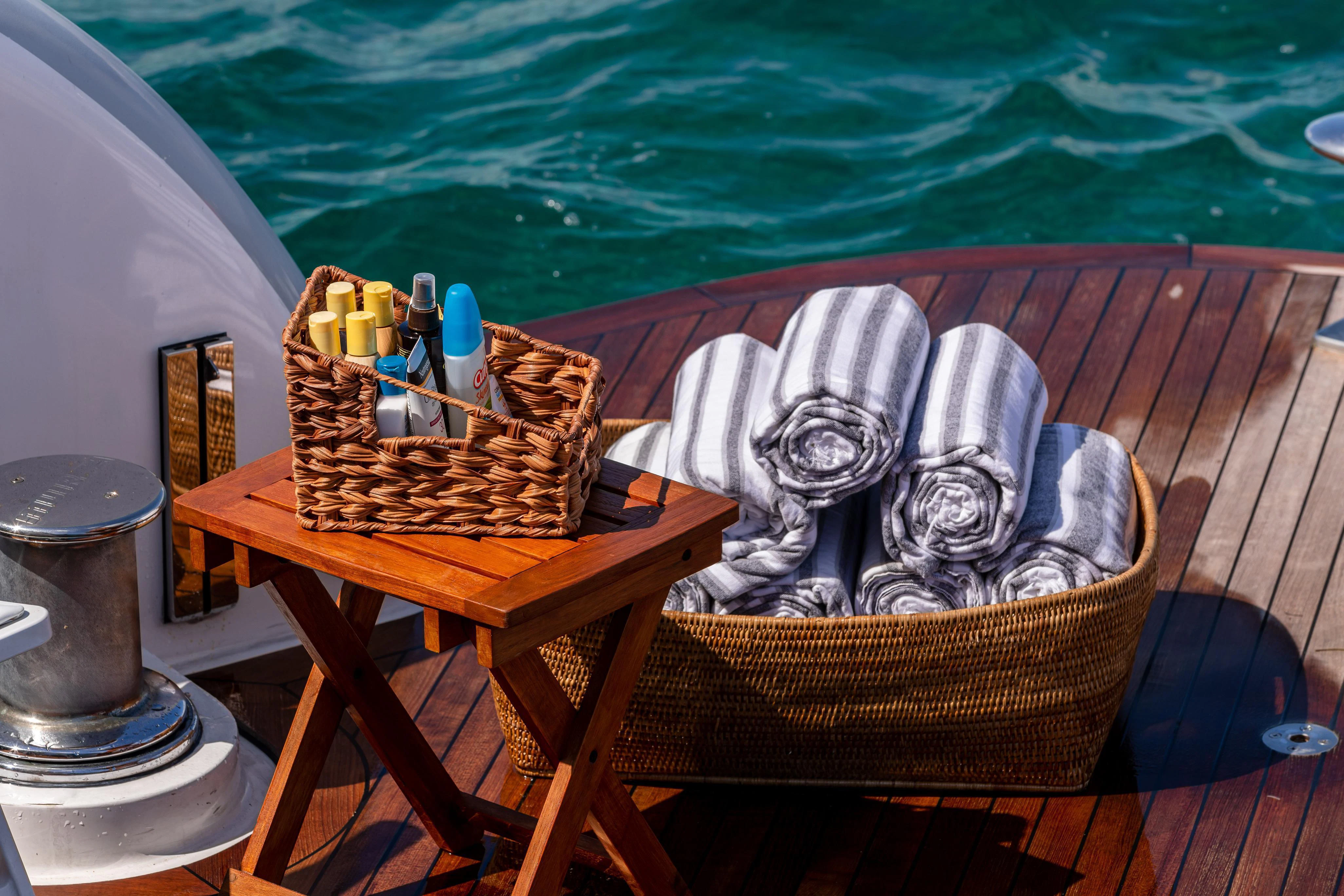 Guests can make their way up to TCB’S vast sundeck for fun in the sun. On this level, an alfresco gym provides guests the ability to keep their workout routine while on board with an arrangement of equipment at their disposal. A large six-person Jacuzzi invites guests to soak in the shade. The charter yacht’s deck space is large enough for guests to move around comfortably. Large built-in double-facing sunpads and sun loungers ensure guests will be in complete comfort while sunbathing, and optional shading is available when desired. TCB’s full complement of water toys will do the trick for those seeking a little exhilaration. TCB’s plethora of water toys are readily available for each guest’s enjoyment. Easy access to water toys is available from TCB’s extended swim platform and docking system making the switch from ski’s to wave runners a breeze. No matter the group, guests of all ages will find that TCB and her experienced, charter-savvy crew exceed expectations.