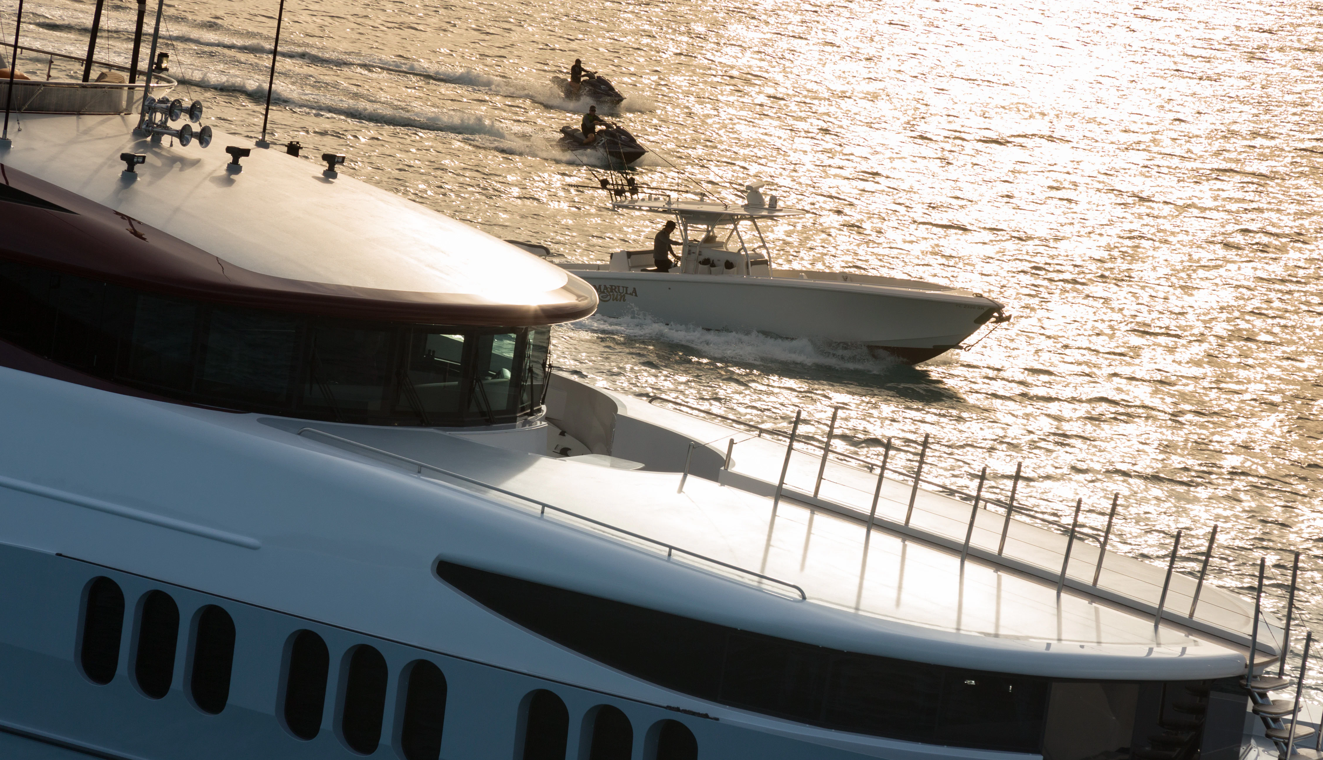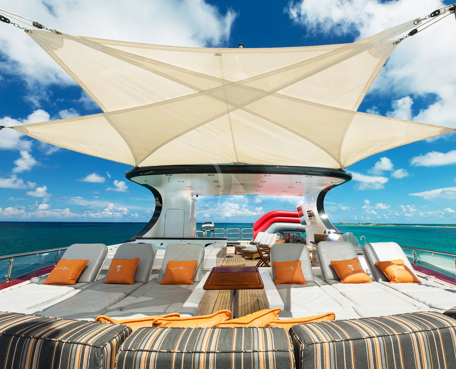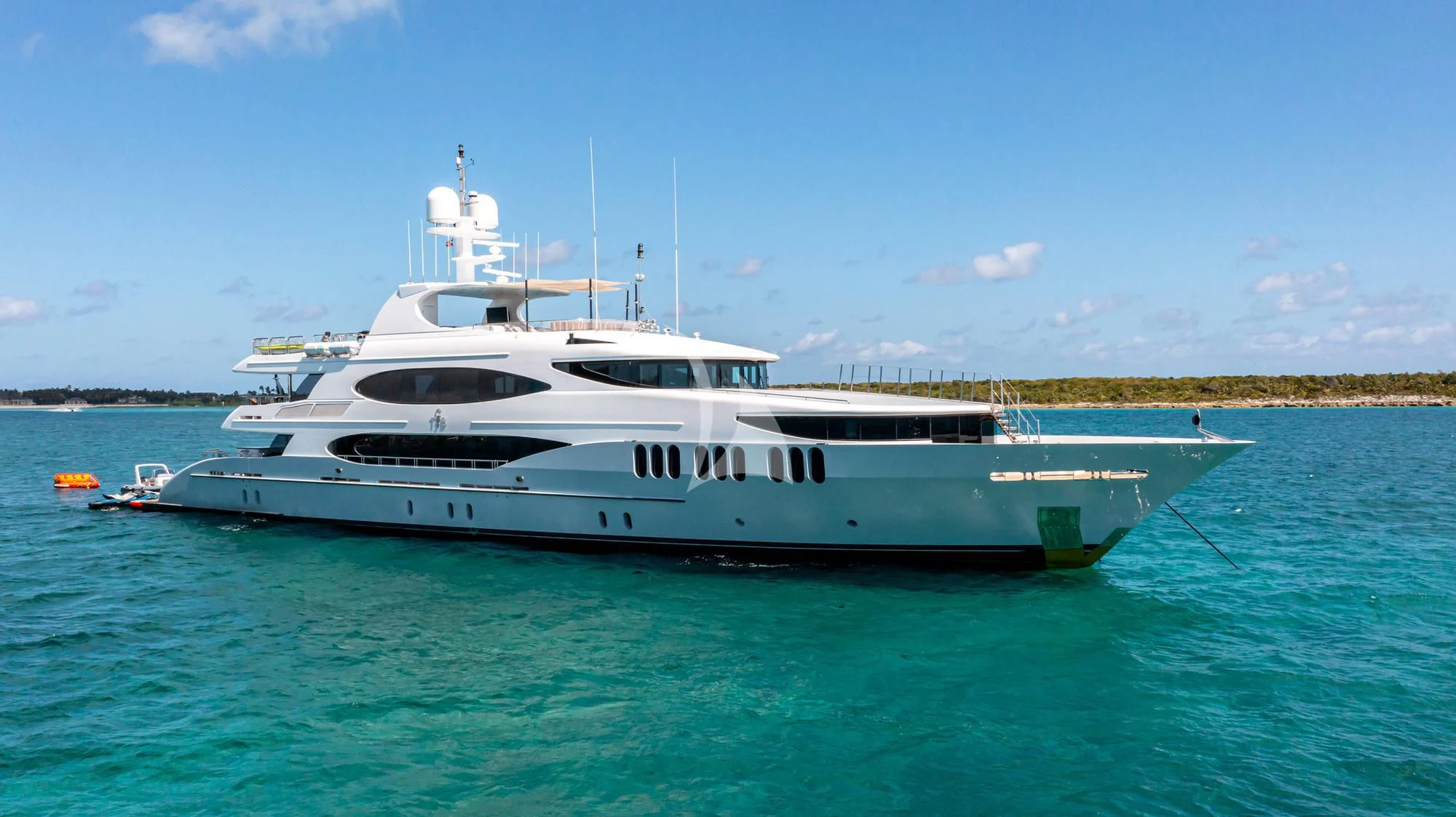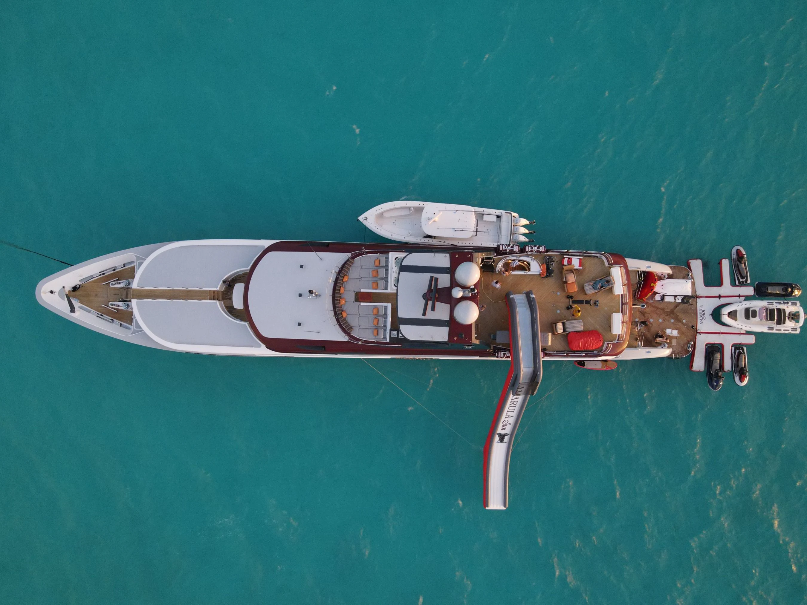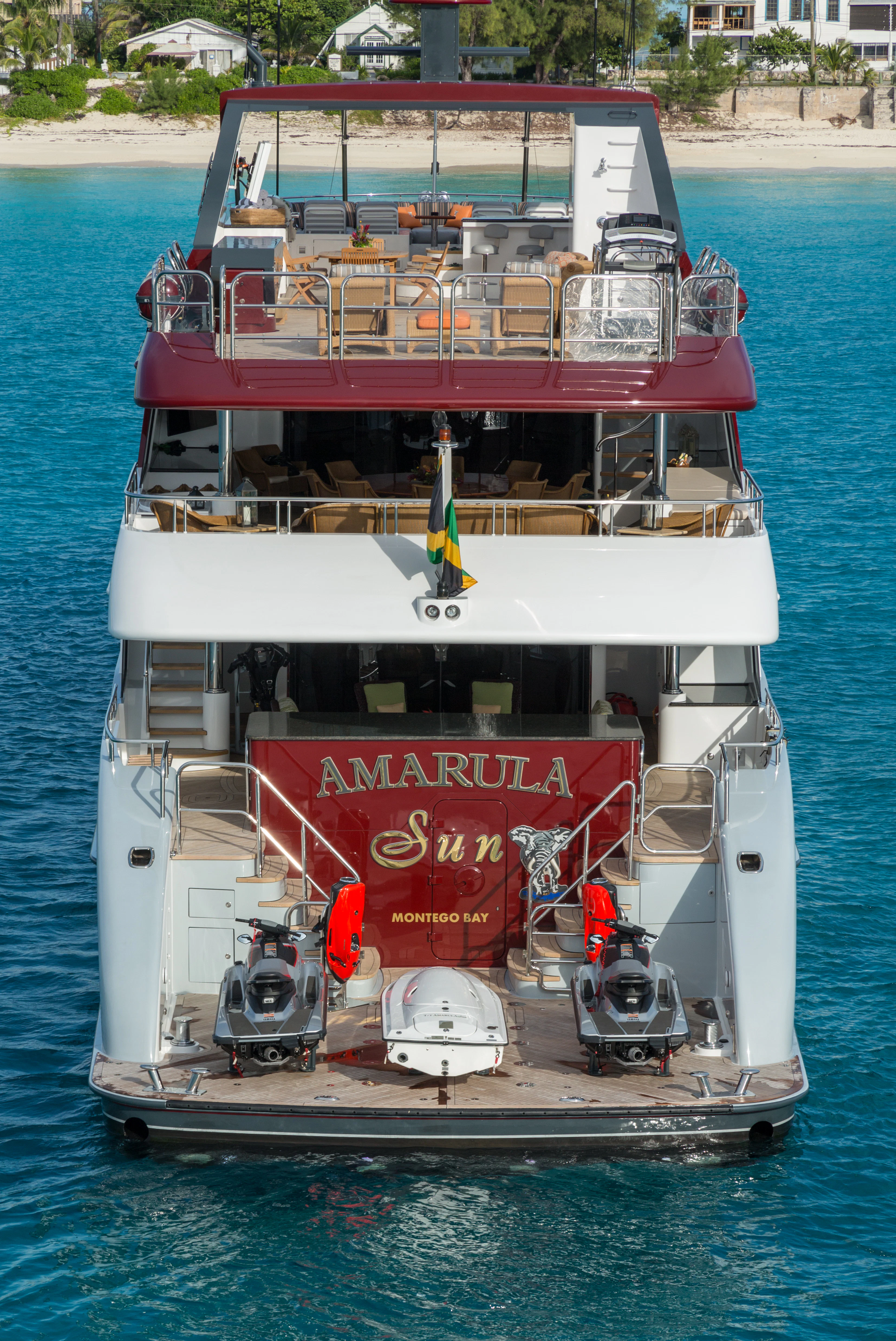 Guests can make their way up to TCB’S vast sundeck for fun in the sun. On this level, an alfresco gym provides guests the ability to keep their workout routine while on board with an arrangement of equipment at their disposal. A large six-person Jacuzzi invites guests to soak in the shade. The charter yacht’s deck space is large enough for guests to move around comfortably. Large built-in double-facing sunpads and sun loungers ensure guests will be in complete comfort while sunbathing, and optional shading is available when desired. TCB’s full complement of water toys will do the trick for those seeking a little exhilaration. TCB’s plethora of water toys are readily available for each guest’s enjoyment. Easy access to water toys is available from TCB’s extended swim platform and docking system making the switch from ski’s to wave runners a breeze. No matter the group, guests of all ages will find that TCB and her experienced, charter-savvy crew exceed expectations.