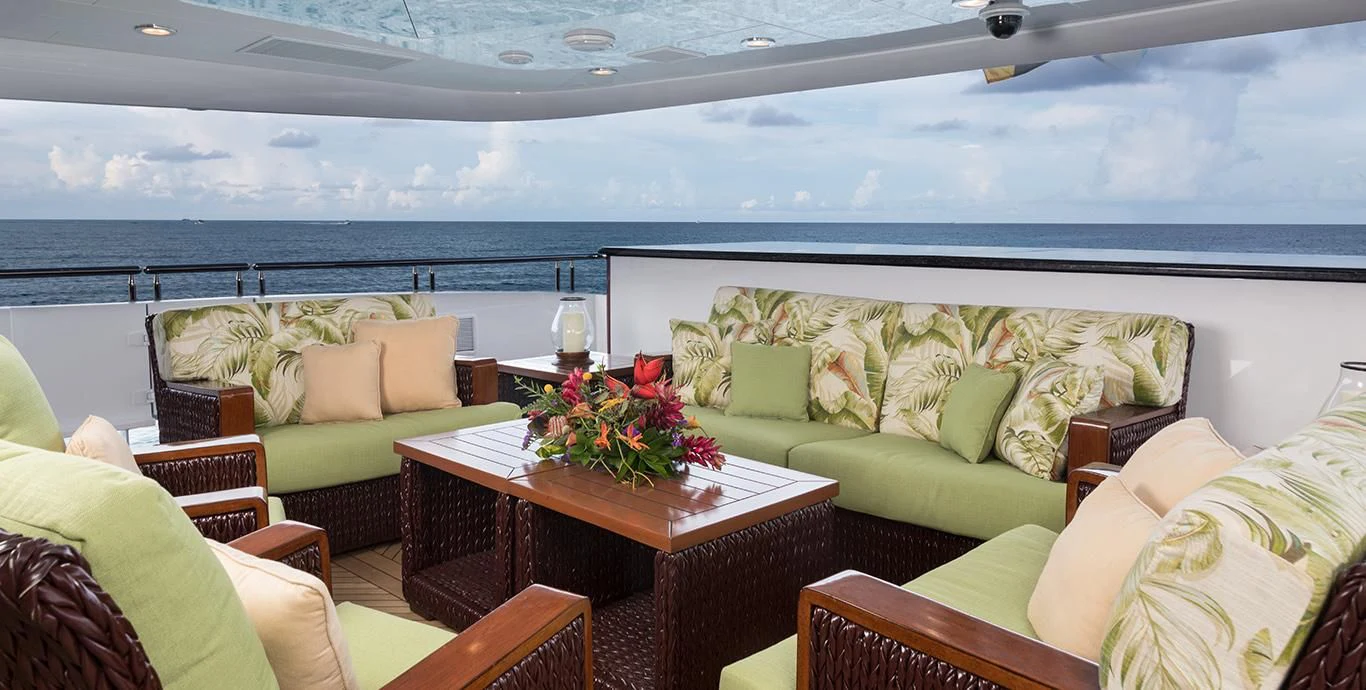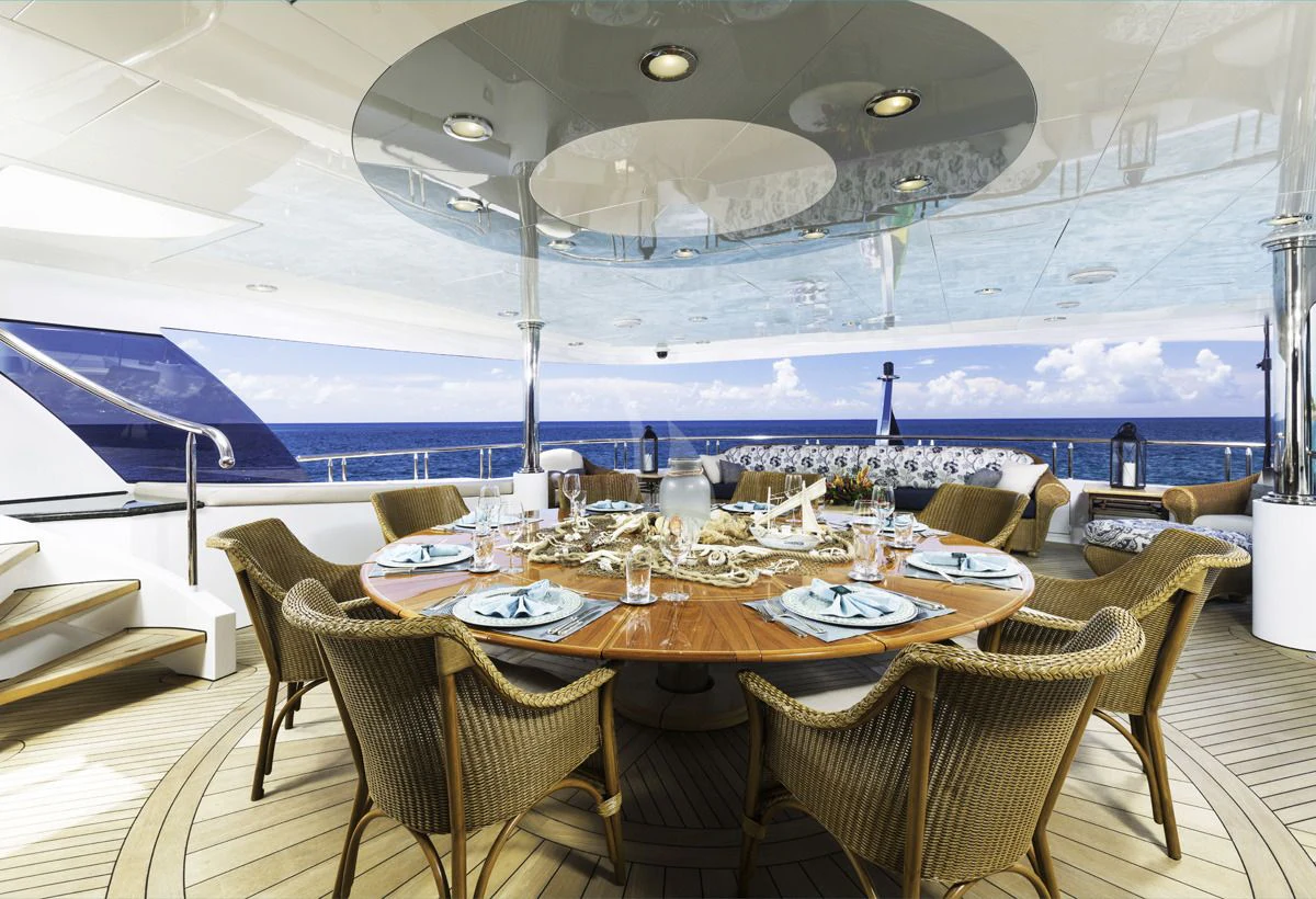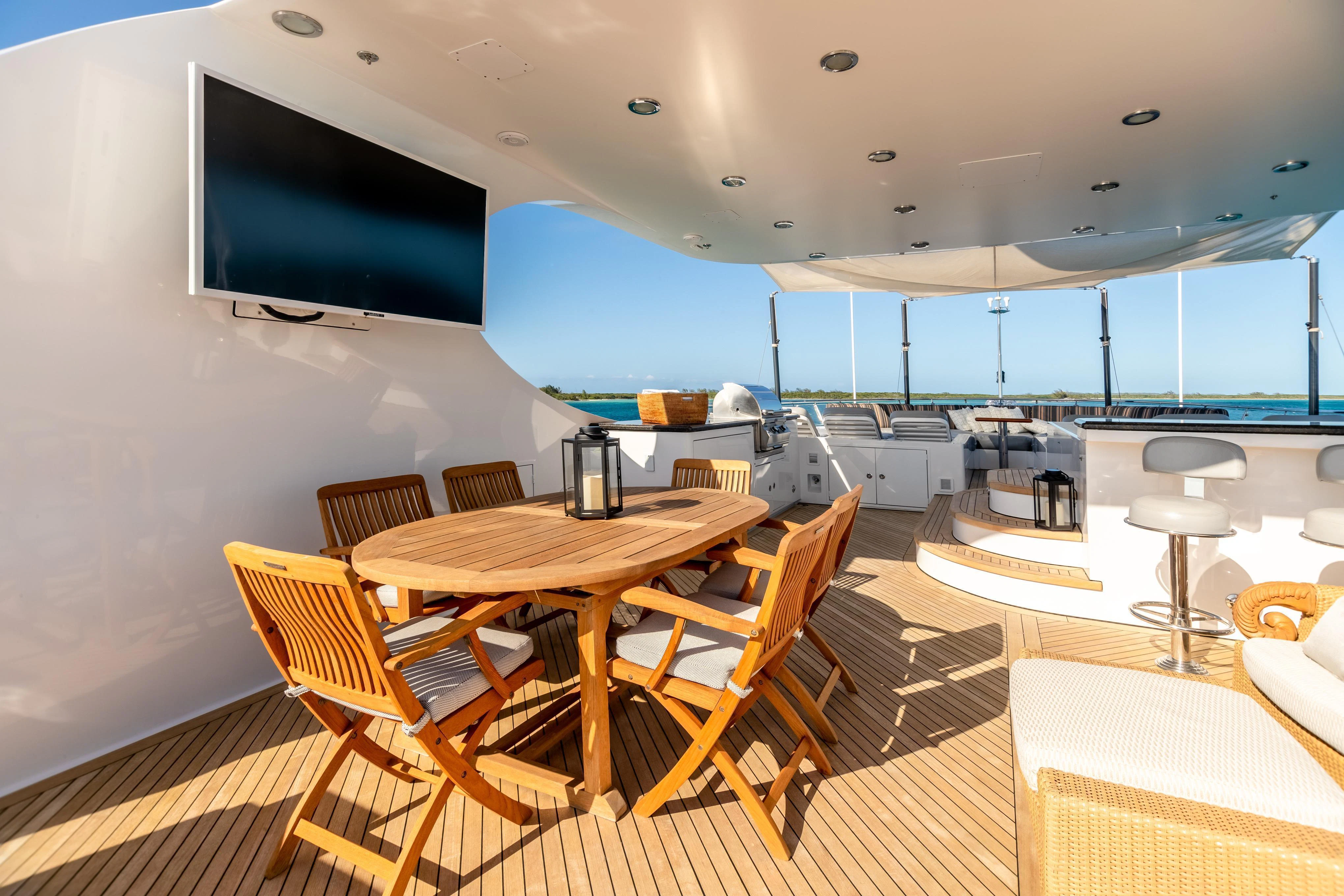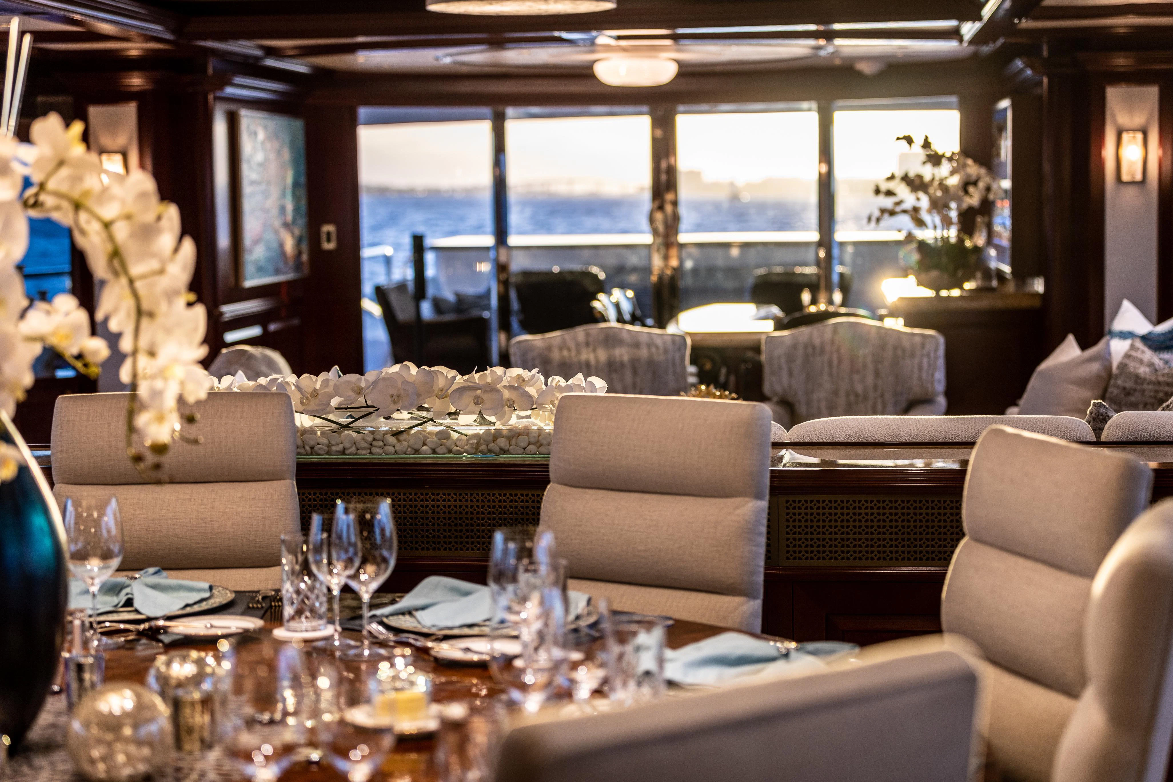 Accessed by a grand central staircase, charter guests will find the stunning skylounge, complete with self-playing baby grand piano, fireplace and full bar surrounded by unbeatable views. The 75-inch TV offers top-of-the-line entertainment with Apple TV, a Kaleidescape movie system with more than 1,800 movies and the latest video gaming systems. The large L-shaped sofa invites guests to sink in and unwind after a long day on the water. Aft of the skylounge is the beautiful alfresco dining table for 11, complete with a breathtaking backdrop of the surrounding scenery.