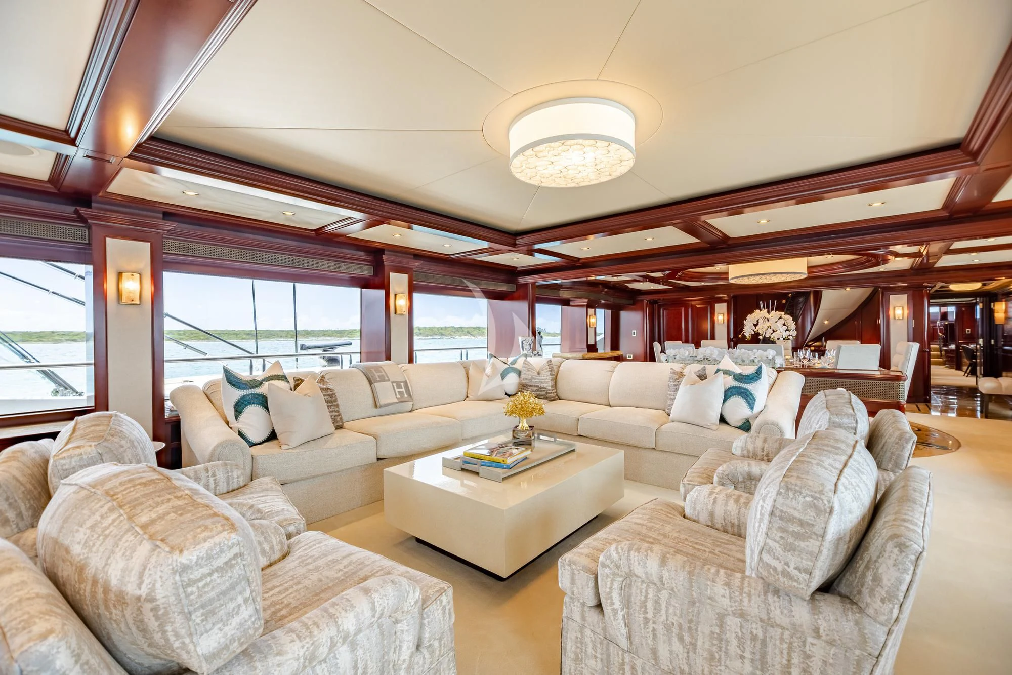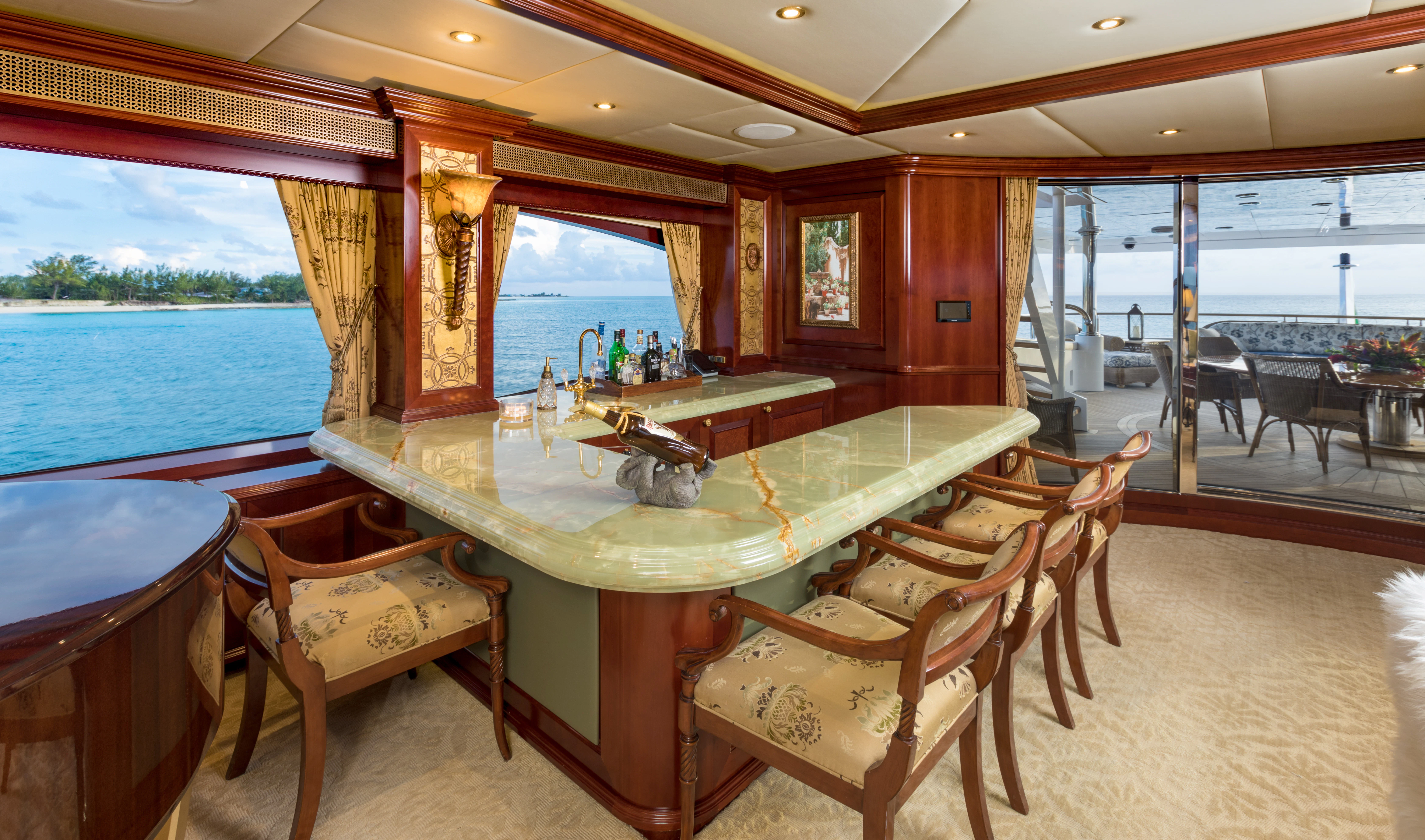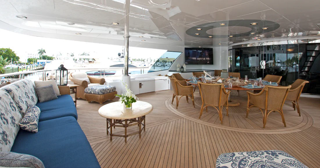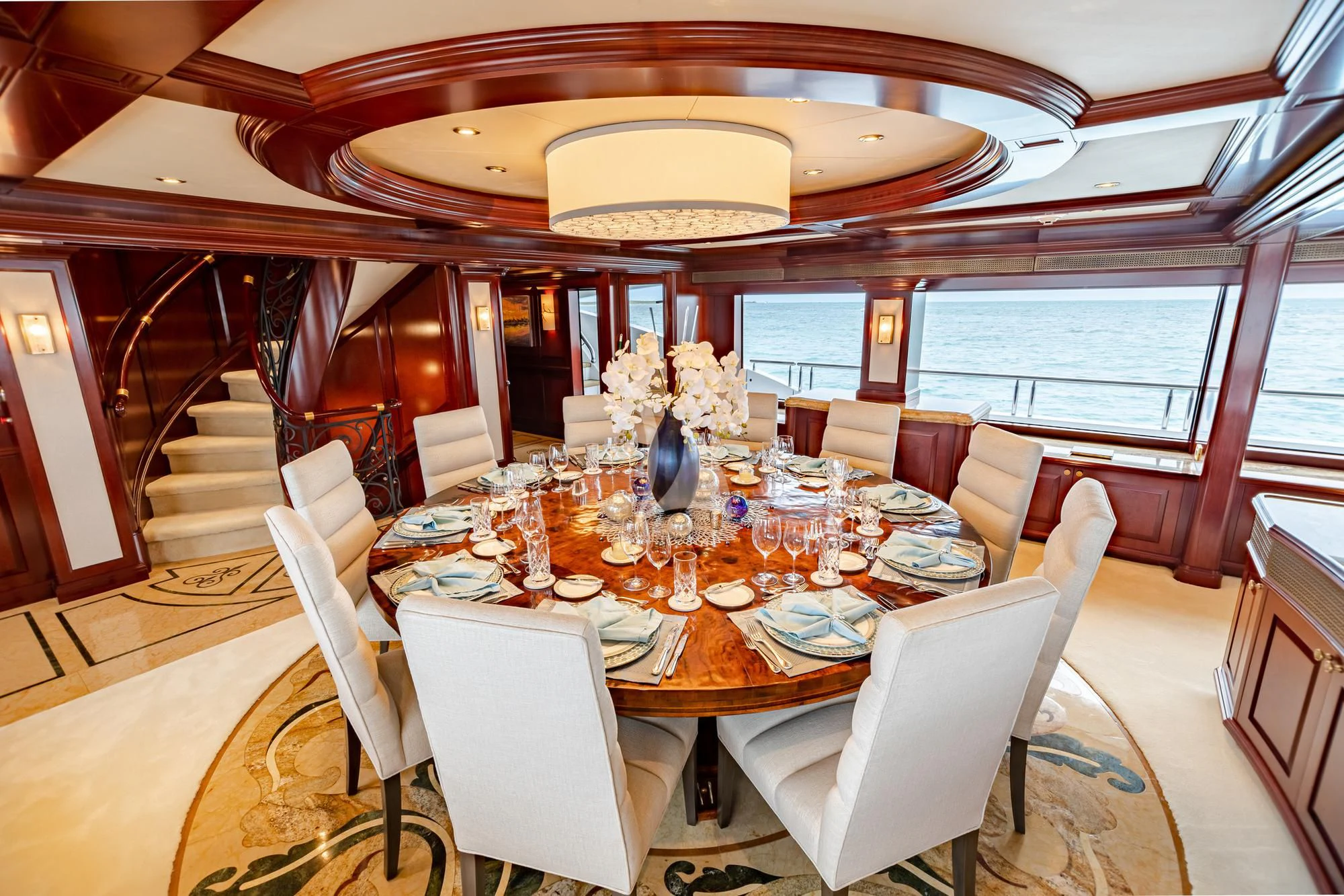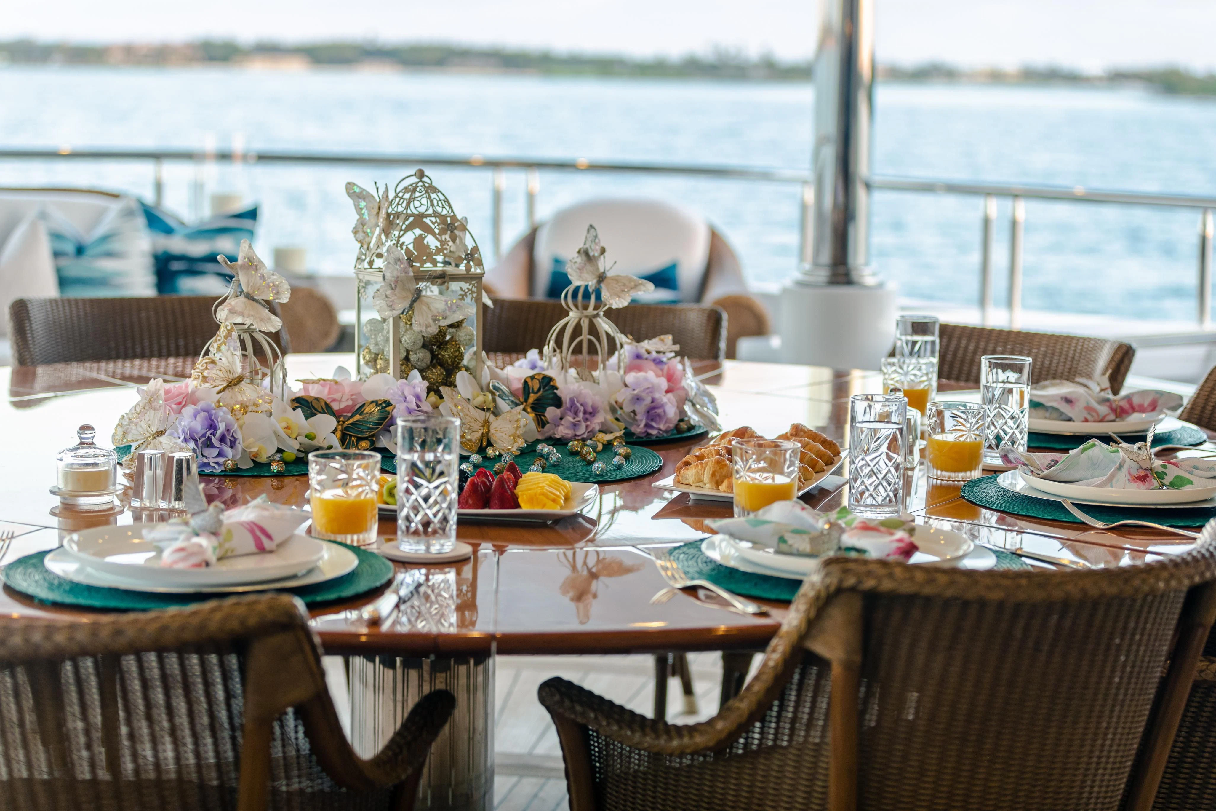 Accessed by a grand central staircase, charter guests will find the stunning skylounge, complete with self-playing baby grand piano, fireplace and full bar surrounded by unbeatable views. The 75-inch TV offers top-of-the-line entertainment with Apple TV, a Kaleidescape movie system with more than 1,800 movies and the latest video gaming systems. The large L-shaped sofa invites guests to sink in and unwind after a long day on the water. Aft of the skylounge is the beautiful alfresco dining table for 11, complete with a breathtaking backdrop of the surrounding scenery.