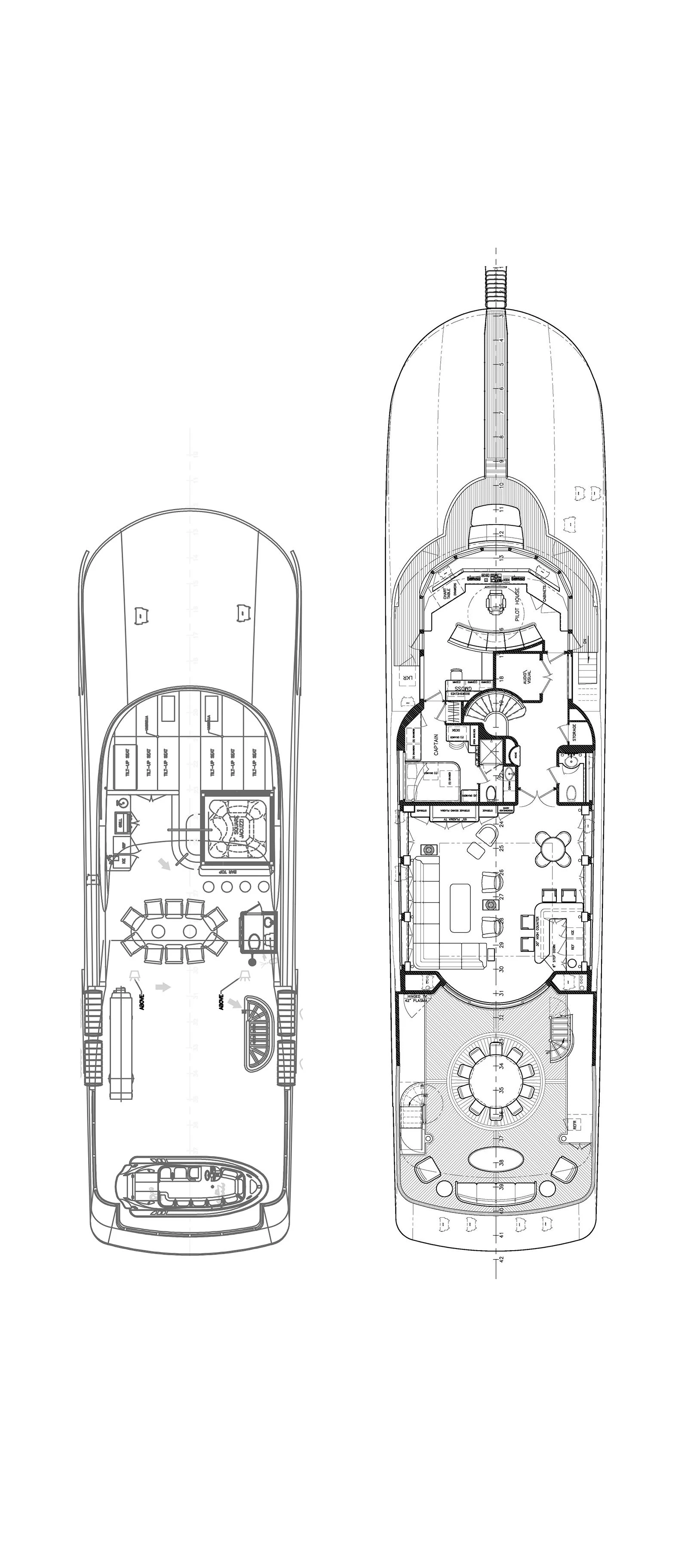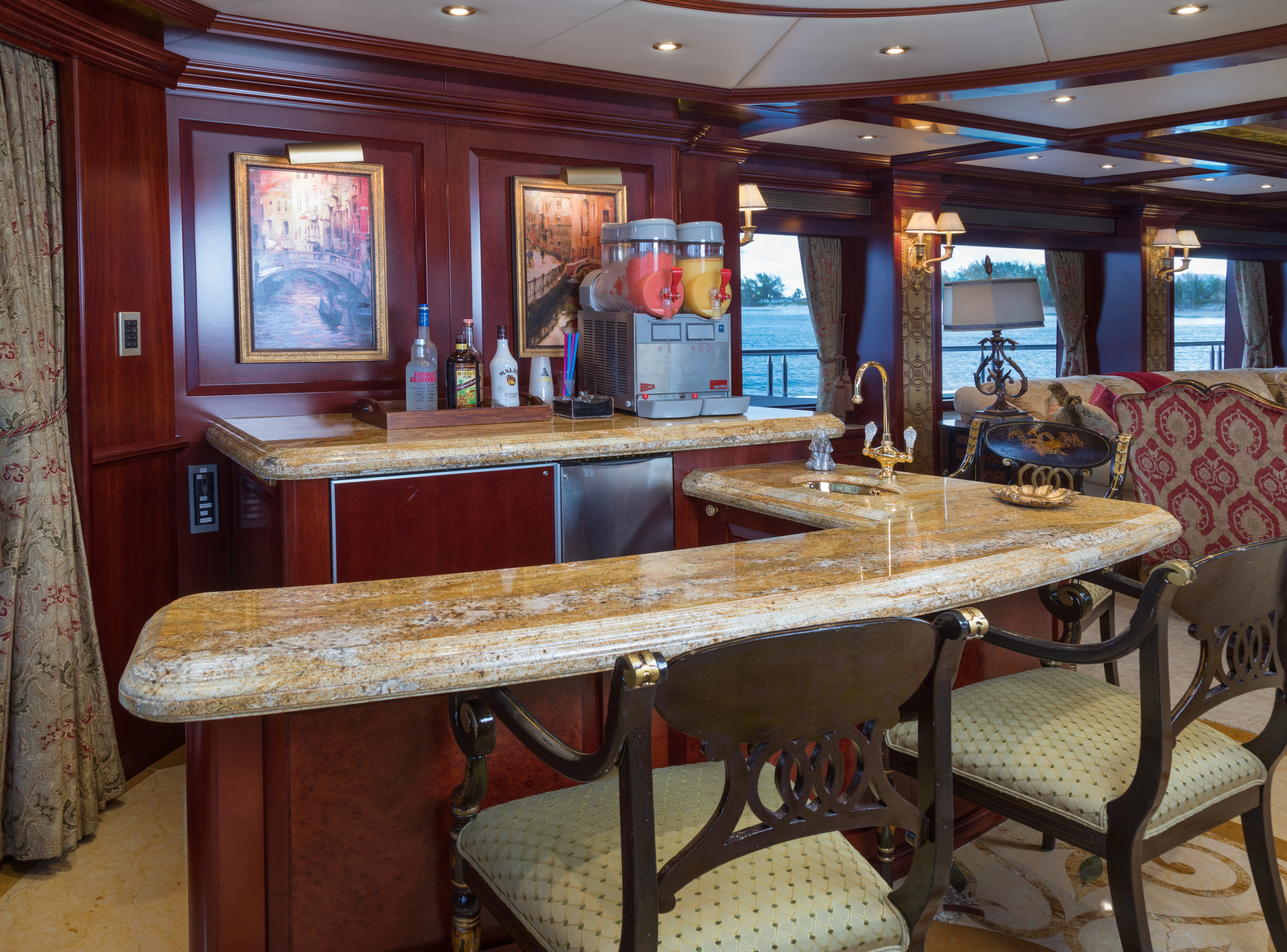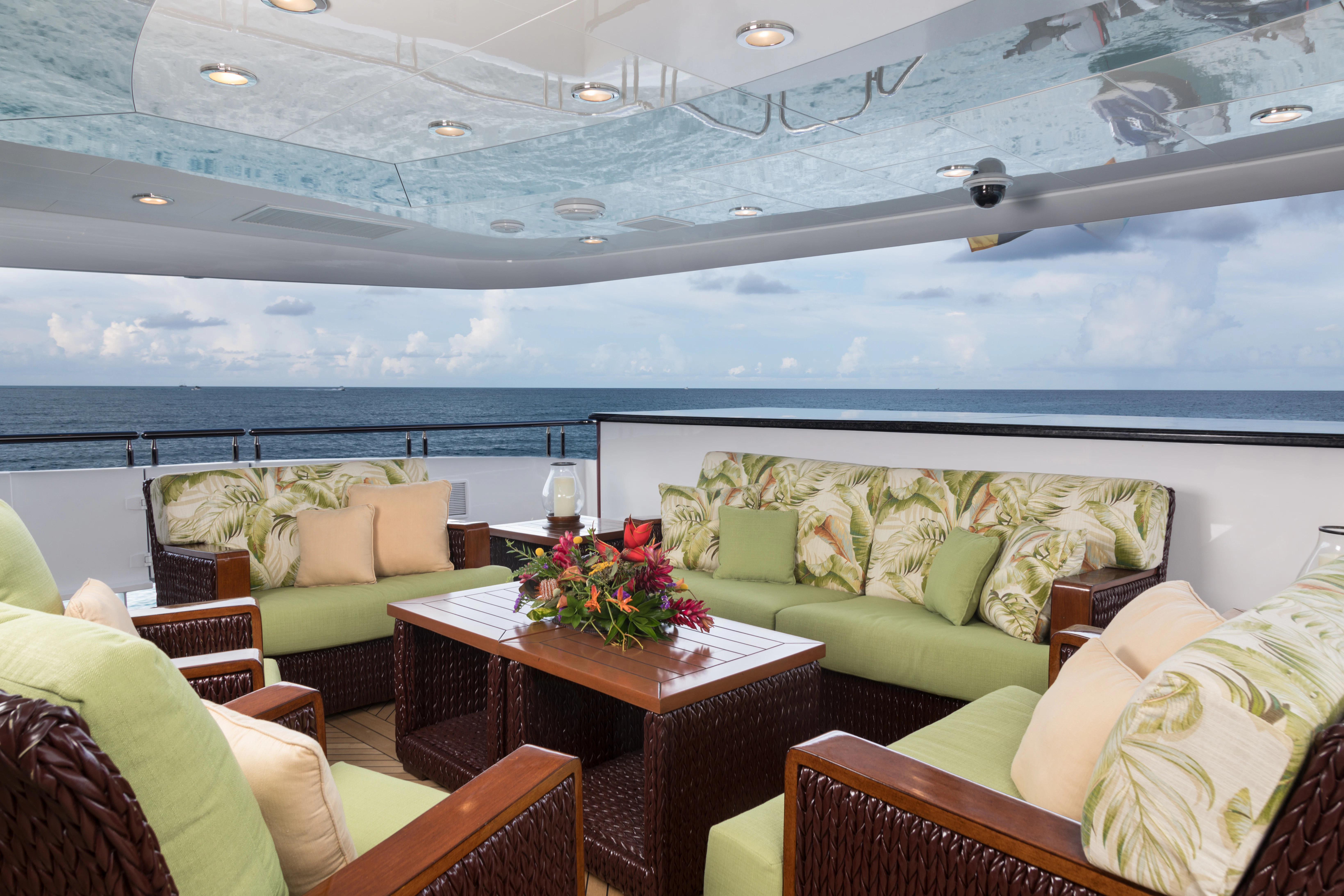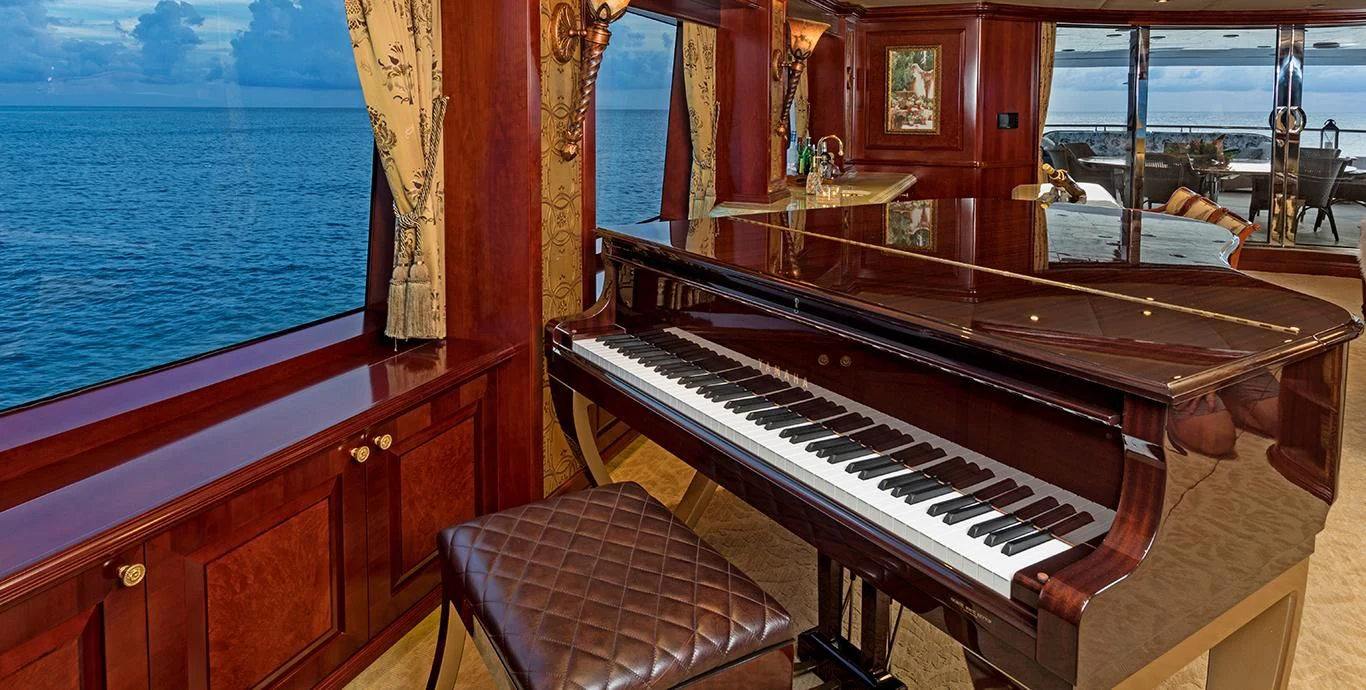 Accessed by a grand central staircase, charter guests will find the stunning skylounge, complete with self-playing baby grand piano, fireplace and full bar surrounded by unbeatable views. The 75-inch TV offers top-of-the-line entertainment with Apple TV, a Kaleidescape movie system with more than 1,800 movies and the latest video gaming systems. The large L-shaped sofa invites guests to sink in and unwind after a long day on the water. Aft of the skylounge is the beautiful alfresco dining table for 11, complete with a breathtaking backdrop of the surrounding scenery.