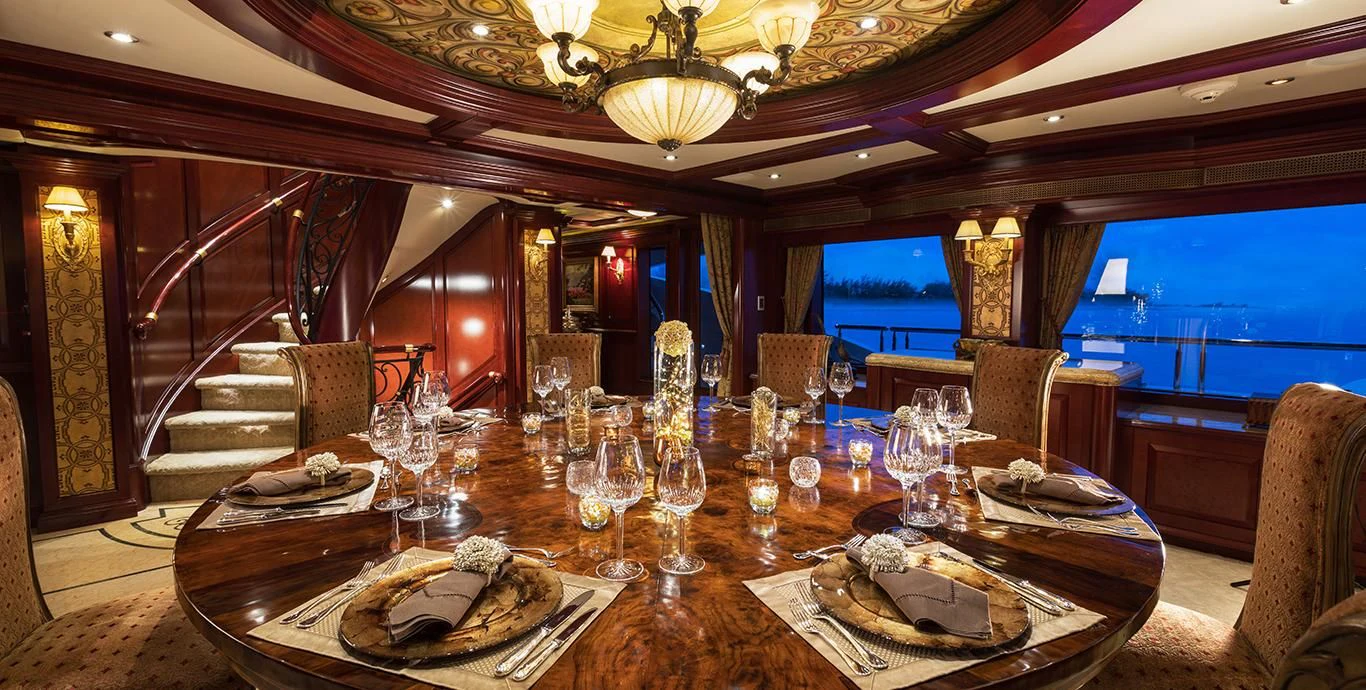 As guests step aboard, they will be greeted by TCB’s cozy aft deck, an ideal spot for settling in, sitting back and watching the embarkation port fade into the distance. In the mornings, the aft deck serves as the perfect locale for alfresco lounging with a morning coffee. Guests will find the stunning open-plan main salon and formal dining area through the sliding doors. Neutral-toned furnishings complement the wood accents that adorn the walls and ceiling. The superyacht’s main salon showcases an effortless blend of natural and ambient lighting, allowing the space to feel light and airy.