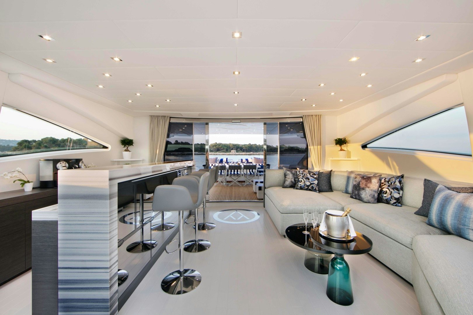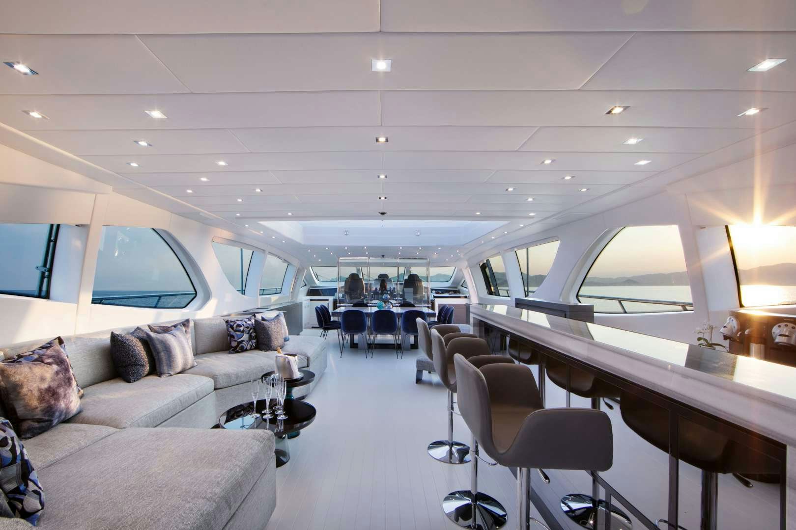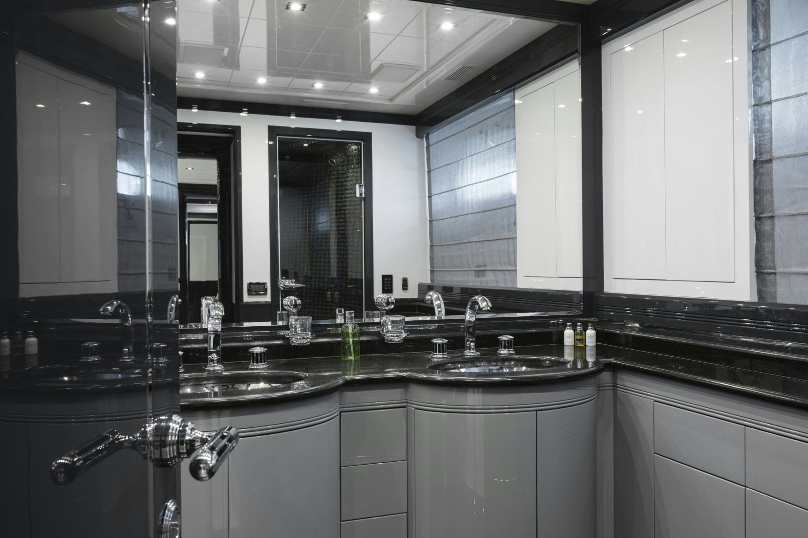 The interior spaces of VENI VIDI VICI are truly stunning. Chic and modern with clean lights and a natural flow, guests will feel at home in this beautifully designed space. A color palette featuring whites and grays creates a Zen-like atmosphere on board. The yacht’s main salon is surrounded by large windows. With the addition of her retractable roof, this space easily becomes one with the outdoors to create a unique lounge area for guests. Sumptous seating offers the ideal place to socialize and a large square dining table is the perfect place to enjoy formal meals. The interior of VENI VIDI VICI is very welcoming and spacious.