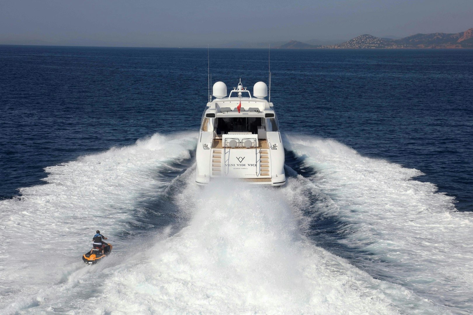 Launched in 2006, the stunning 130-foot (39.6m) VENI VIDI VICI is the perfect performance yacht by Overmarine. This semi-custom Mangusta has sleek and sporty lines, courtesy of the renowned Stefano Righini, and an impressive level of performance that translates to high speeds, ensuring guests can move quickly and safely from one dazzling location to the next. Her beautiful, chic and welcoming interior spaces were designed by the famed Maxine Tissenbaum. VENI VIDI VICI has been well maintained by the same owner since she was launched. She presents in excellent condition thanks to a full refit completed in 2019. This refit included a full paint job and complete interior refresh with new flooring and furnishings. One of her most celebrated upgrades is the light and chic beach club décor.