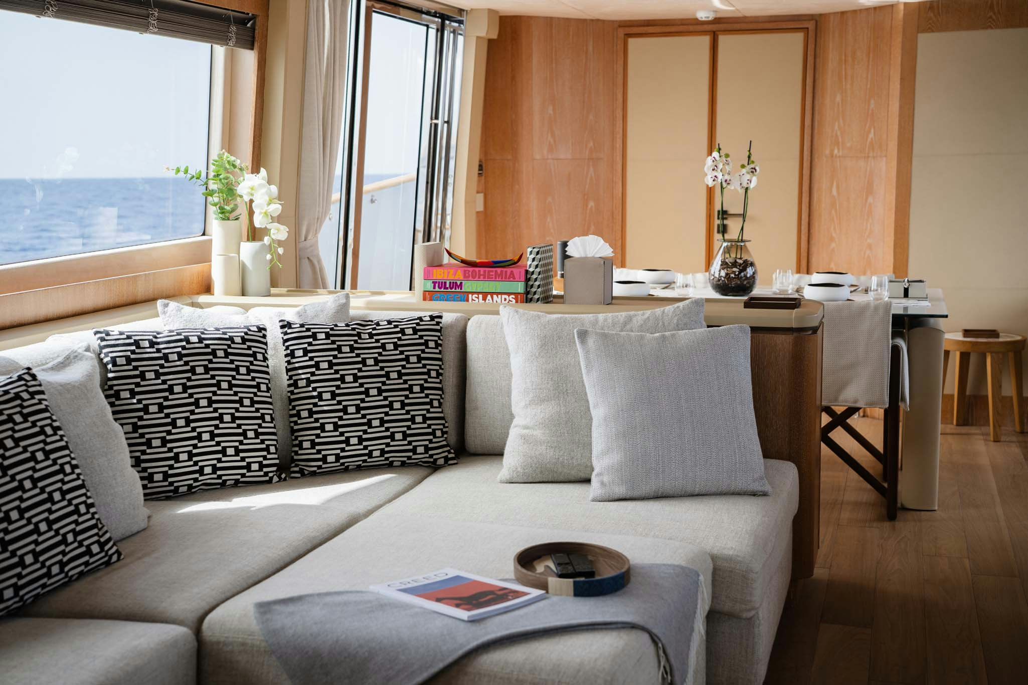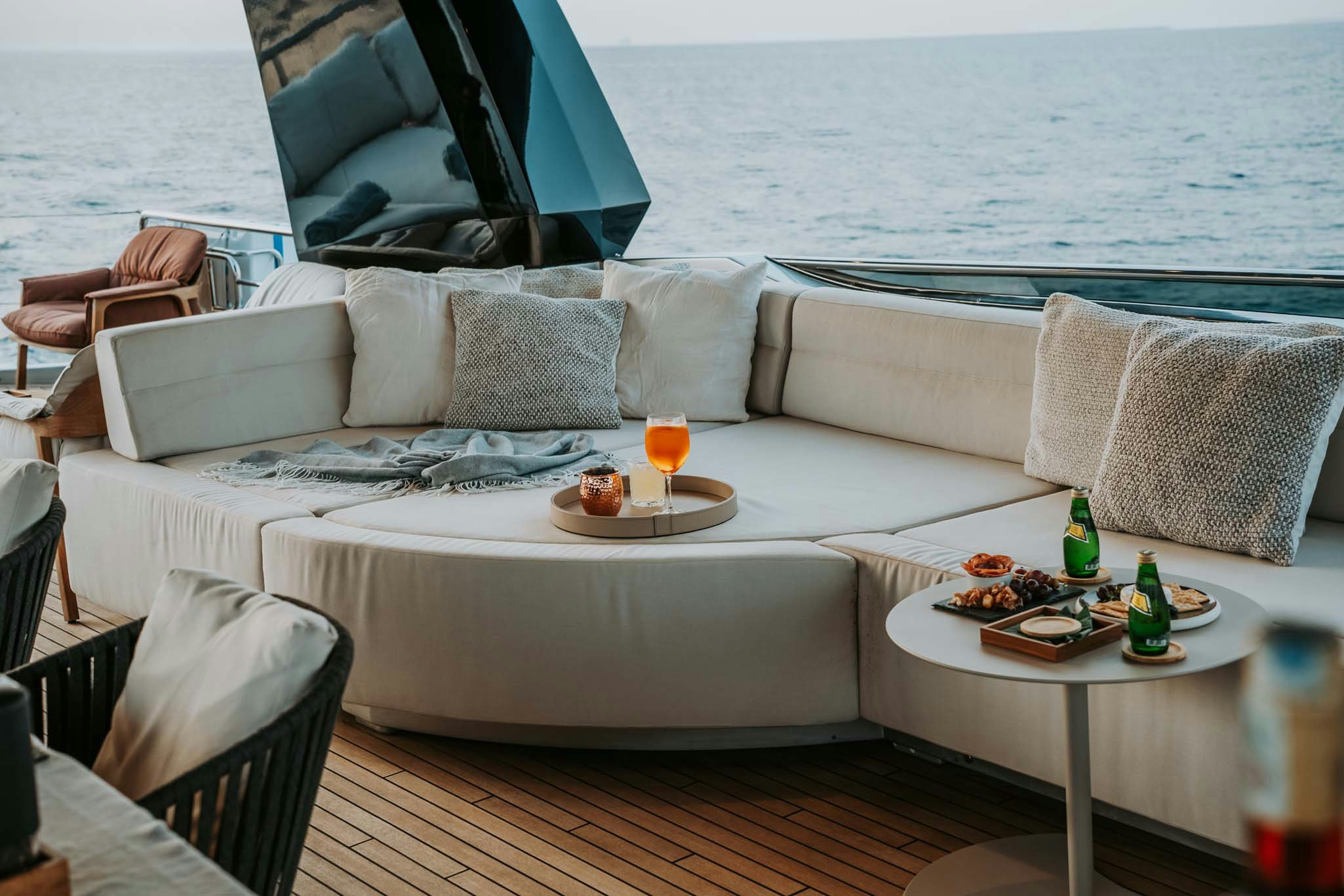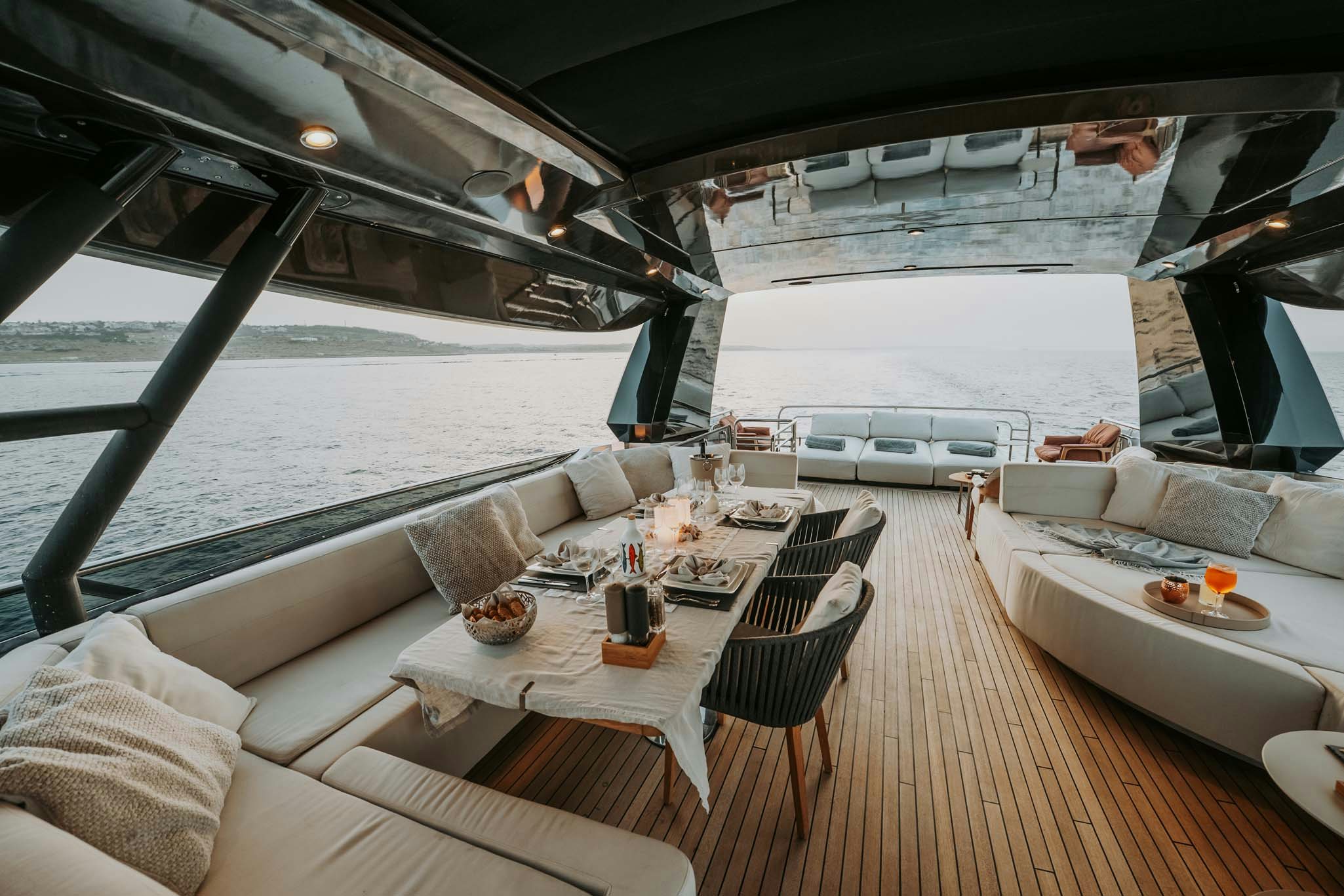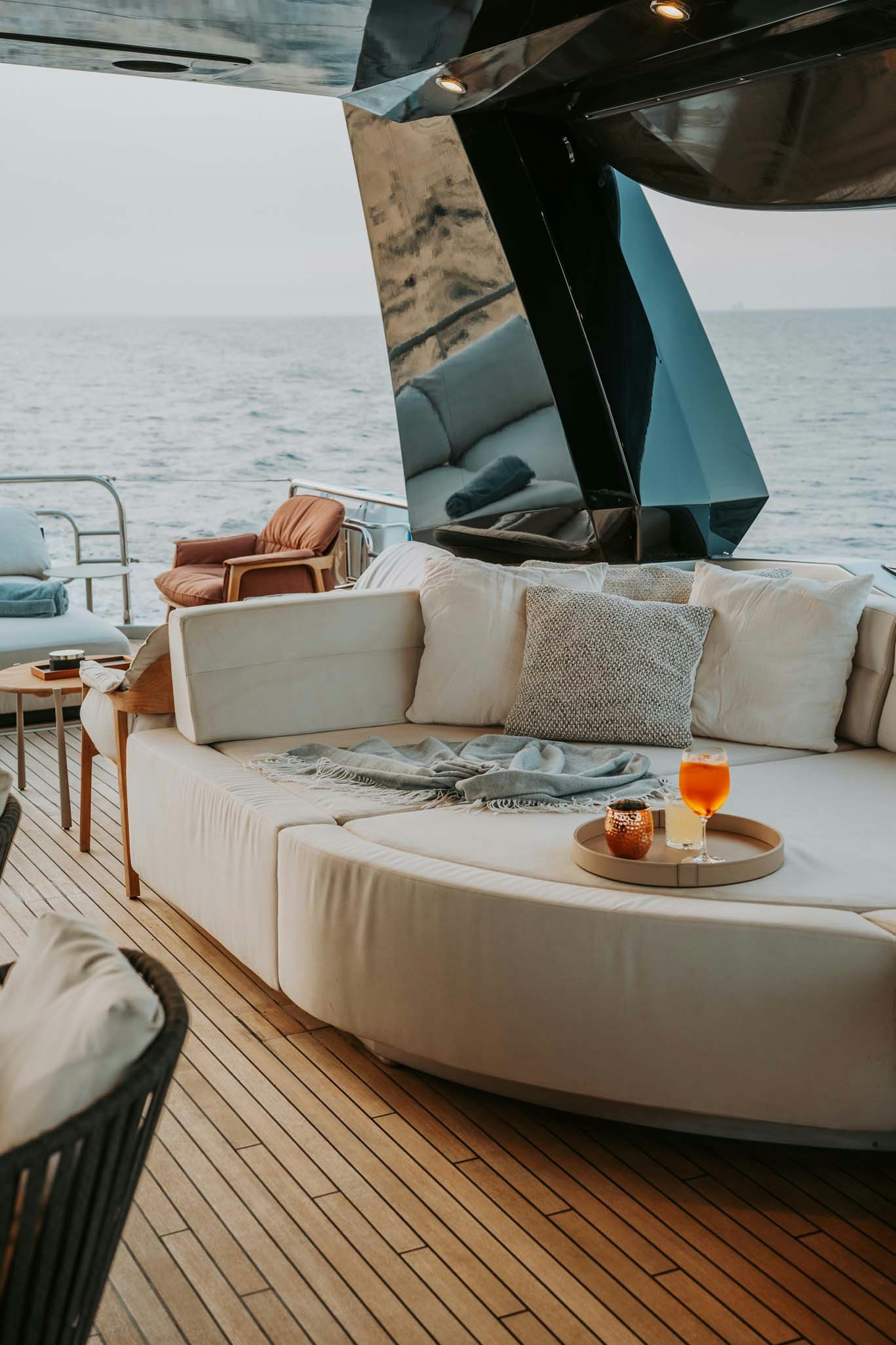 The foredeck of VENUS is designed for socializing in style. A generous alfresco lounge is perfect for group gatherings, and two fold-out side balconies create intimate spaces for morning coffee or sunset cocktails with panoramic views.