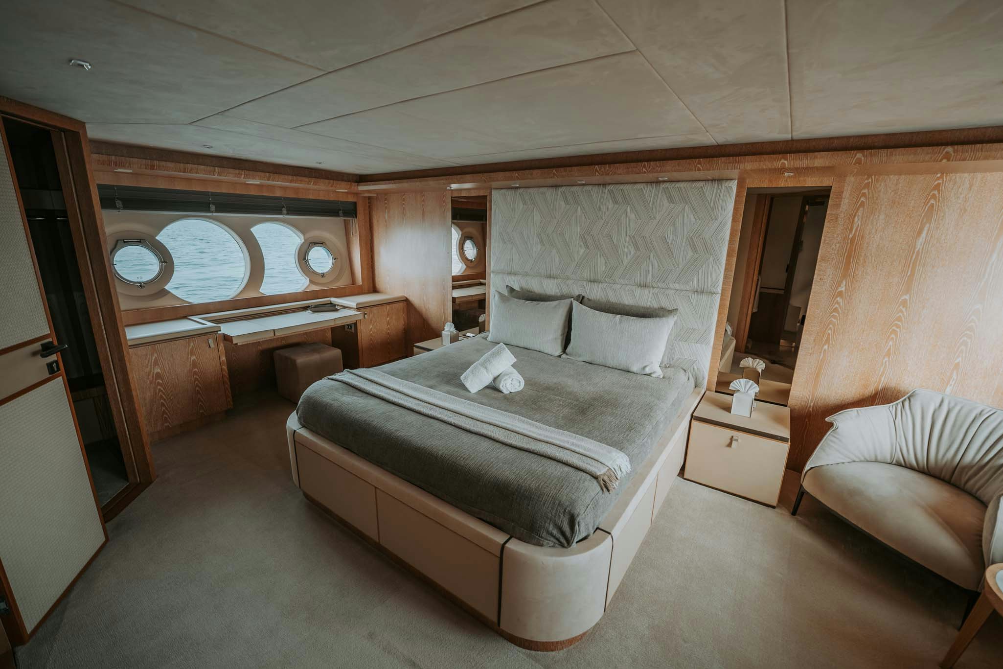Below deck, four beautifully appointed ensuite staterooms accommodate up to eight guests. The layout includes a king master suite, a queen VIP, a double and one convertible double cabin that can transform into a twin, offering flexibility for families or mixed groups.