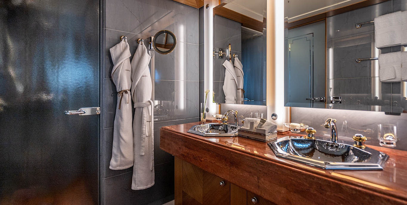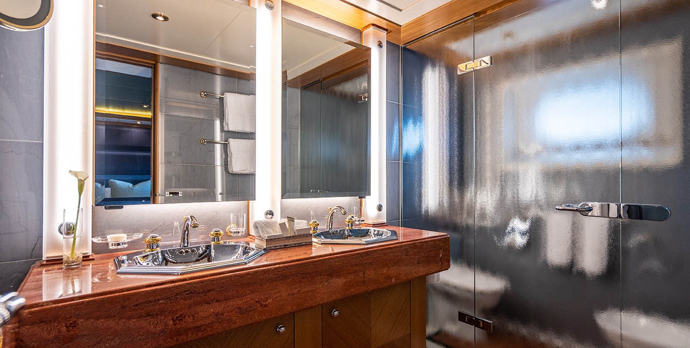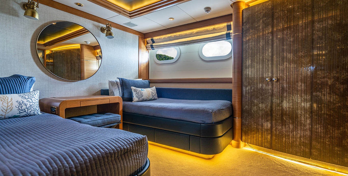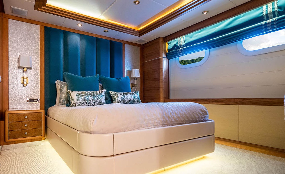 VIBRANCE sleeps up to 12 guests in five spacious rooms including a master suite, a VIP stateroom, a double cabin and two twin cabins with additional Pullman bunks. The master suite boasts a large marble bathroom, his-and-hers walk-in dressing rooms, a study and direct access to a private owner’s deck. All other cabins are located on the lower deck and the convertible nature of the layout is ideal for varying guest numbers. VIBRANCE carries 11 crew on board to ensure the premium service and warm hospitality associated with superyacht charter.