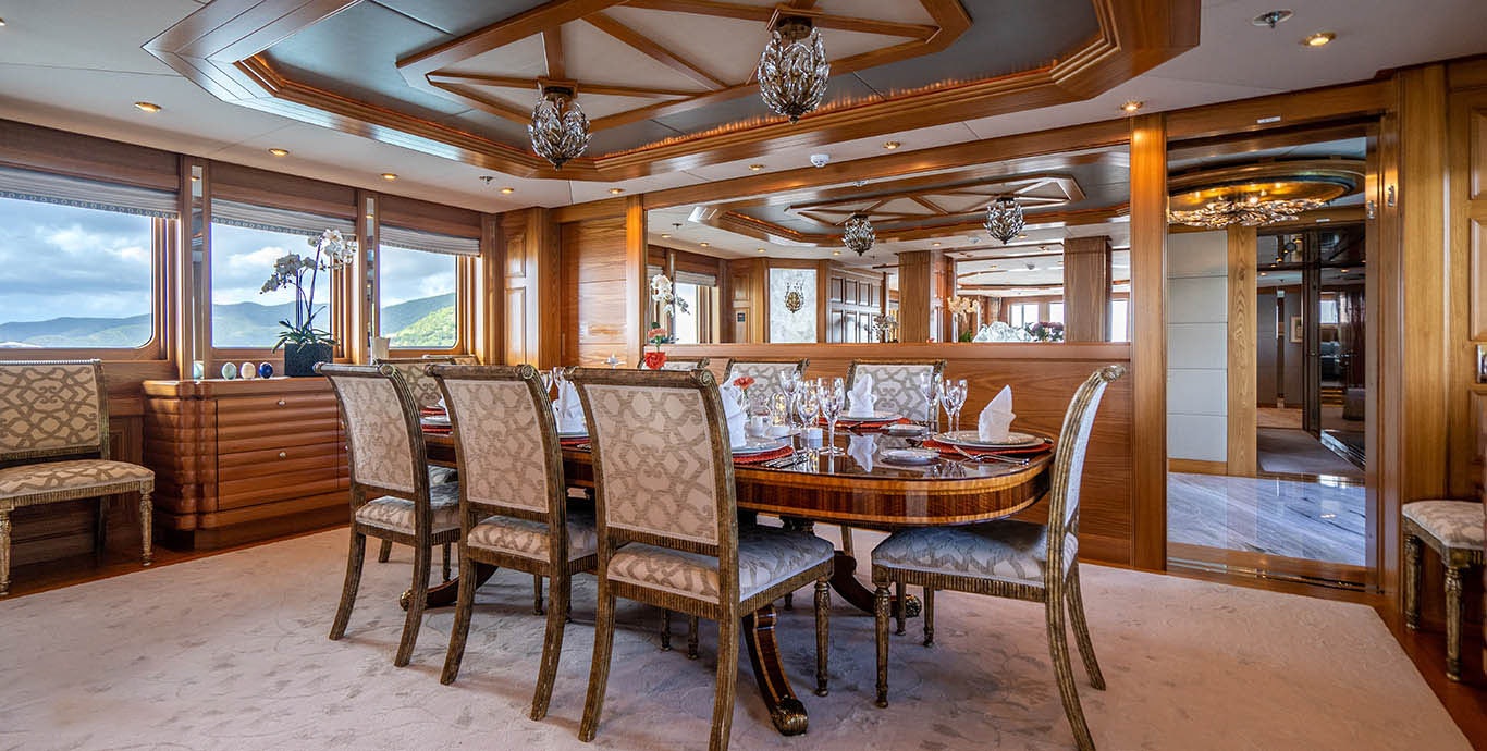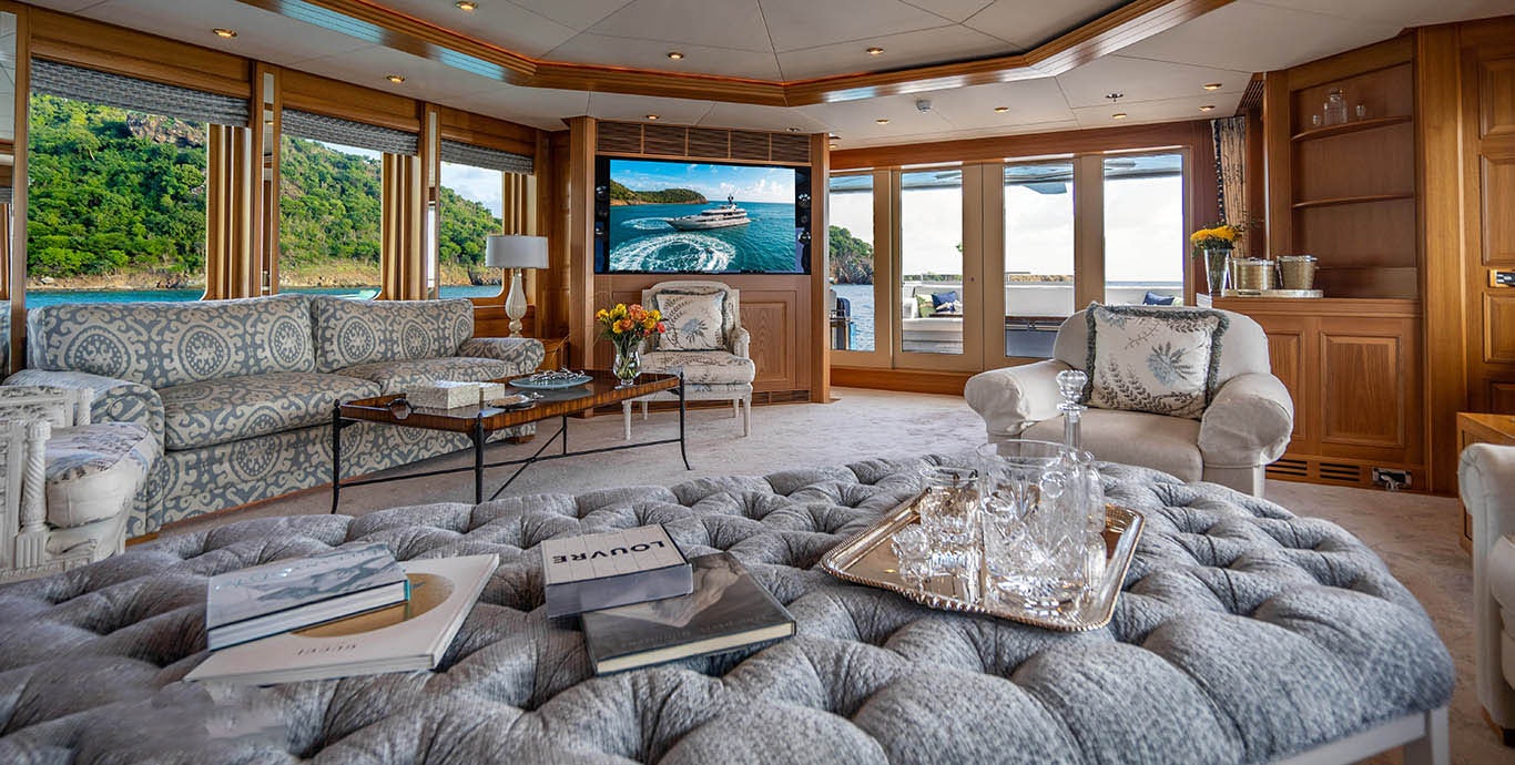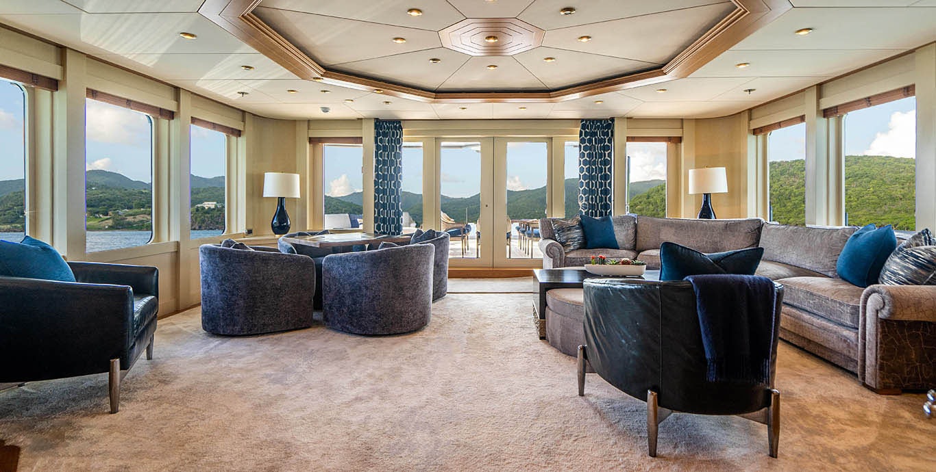 Both exterior and interior are designed by Donald Starkey and the extensive refit works included a repaint of the exterior in striking steel grey tones. Inside, she has very contemporary furnishings and sumptuous seating, creating an elegant and comfortable atmosphere.
