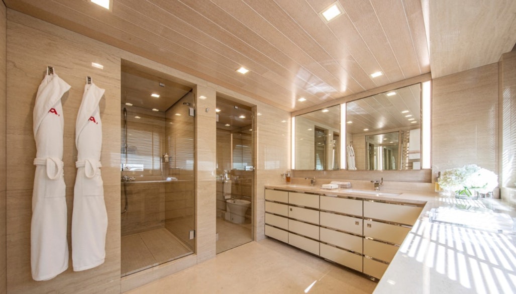Amenities aboard A2 are plentiful and designed with discerning travelers' preferences in mind. At-anchor stabilizers ensure smooth sailing even when stationary, perfect for those who wish to soak up serene surroundings without any disturbance from sea motion. Despite her elegant demeanor, A2 doesn't shy away from power – she boasts twin MTU engines capable of propelling her up to a maximum speed of 15 knots.
