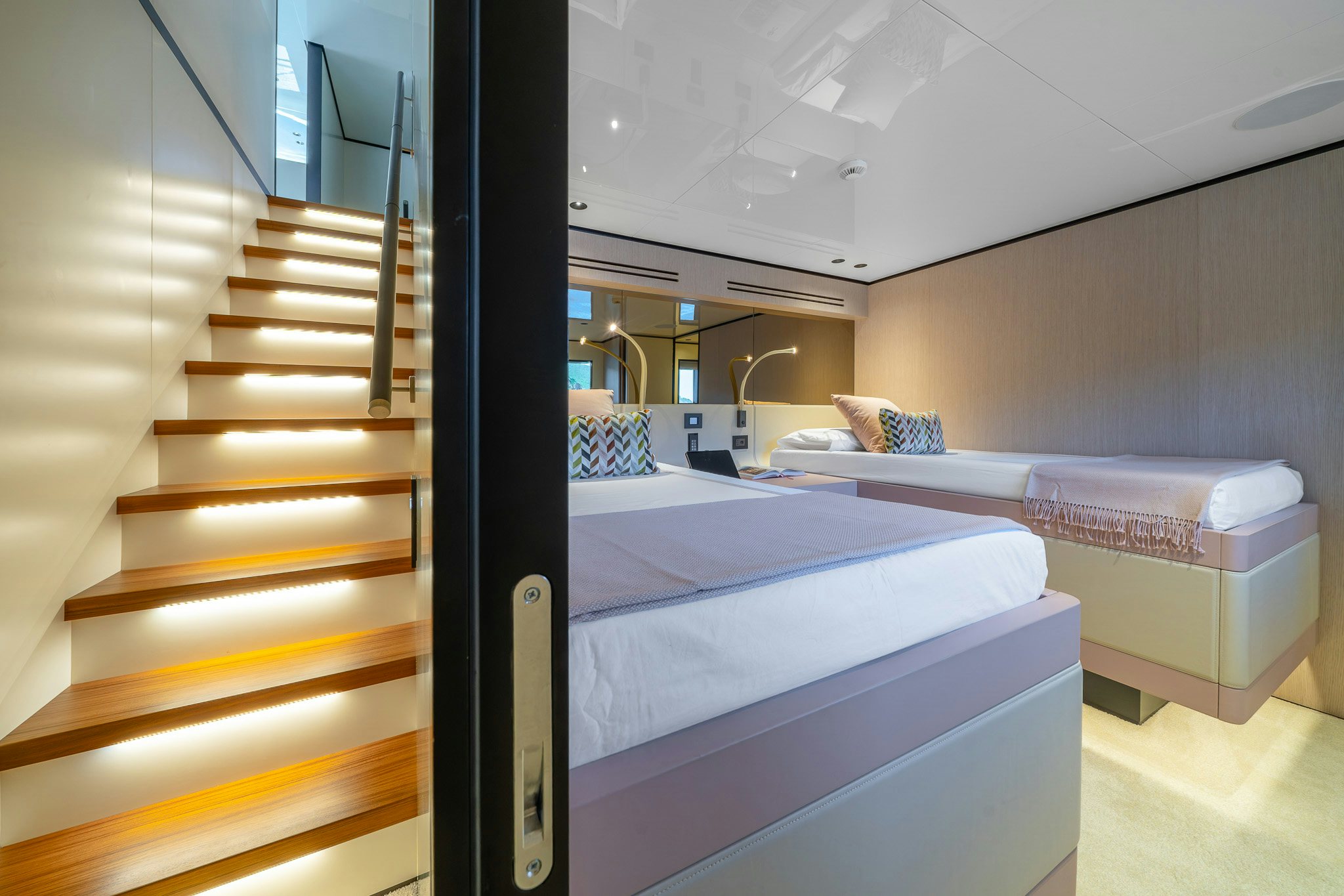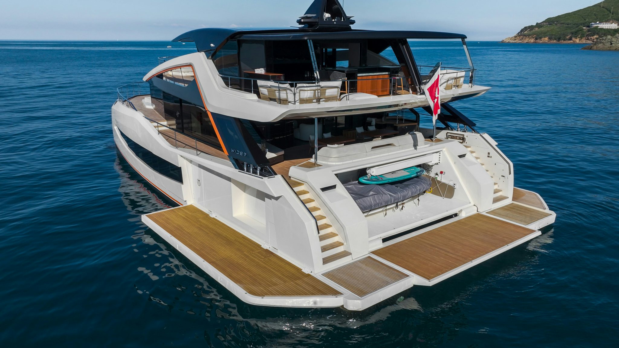 Her interior is striking, featuring a bold color palette and dark flooring with asymmetric patterns that echo her exterior design. The main salon is spacious and modern, with edgy touches that showcase Wider's commitment to innovative aesthetics. Upstairs, the upper salon offers a more intimate spot to relax, whether you’re enjoying a nightcap or catching up on a favorite show. And don’t miss the expansive bridge deck aft, with its massive bar and plenty of seating—perfect for entertaining.