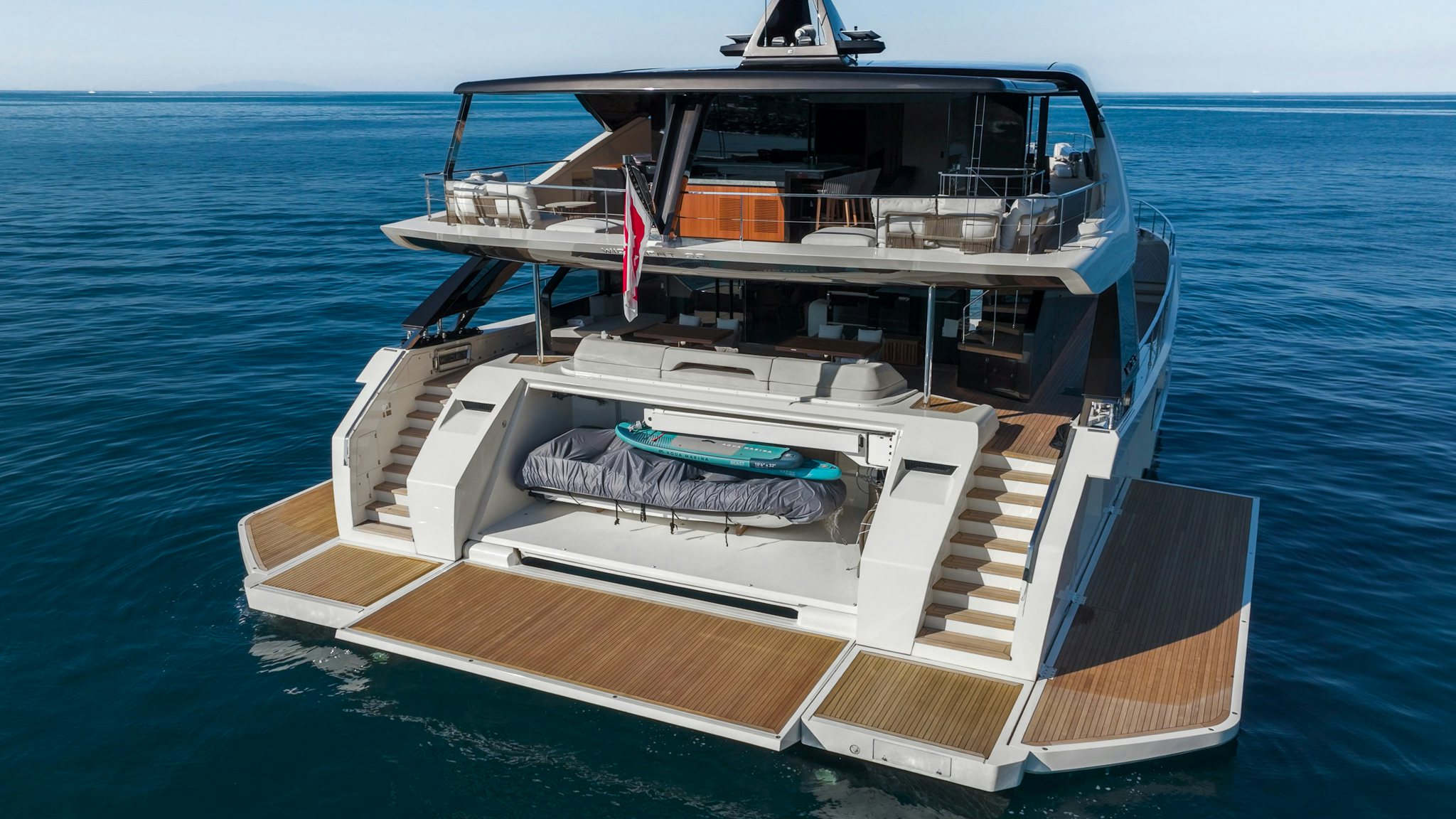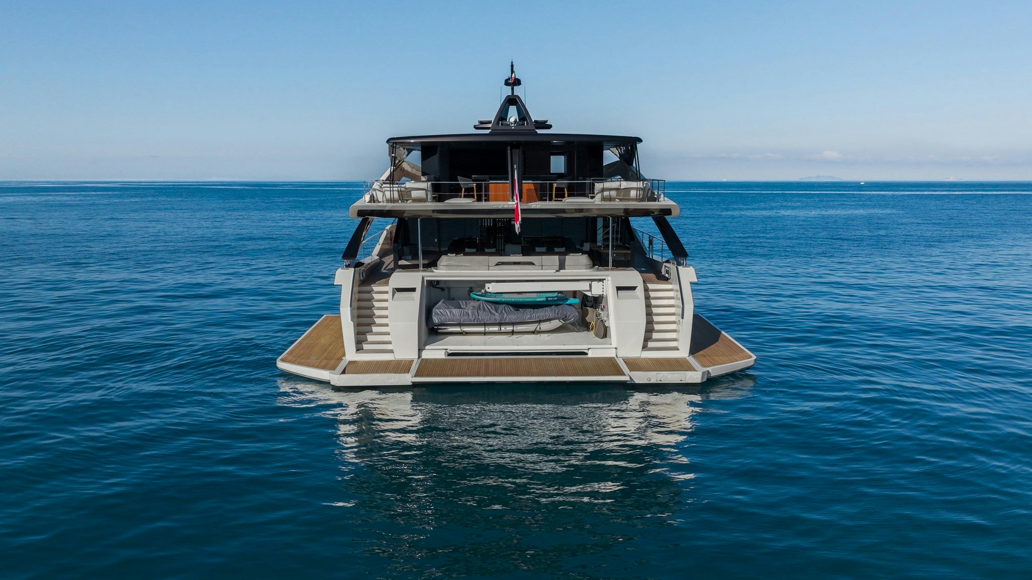 ACALI continues to impress on her exterior decks. The foredeck sunpad is an ideal spot for soaking up the sun, while the 67-square-meter beach club is a water lover’s paradise. With fold-down bulwarks and space for water toys—including a 4.5-meter tender and a Jet Ski—this is where you’ll want to spend most of your time. The transom hatch even transforms the tender garage into an extended swim platform, providing endless options for fun on the water.