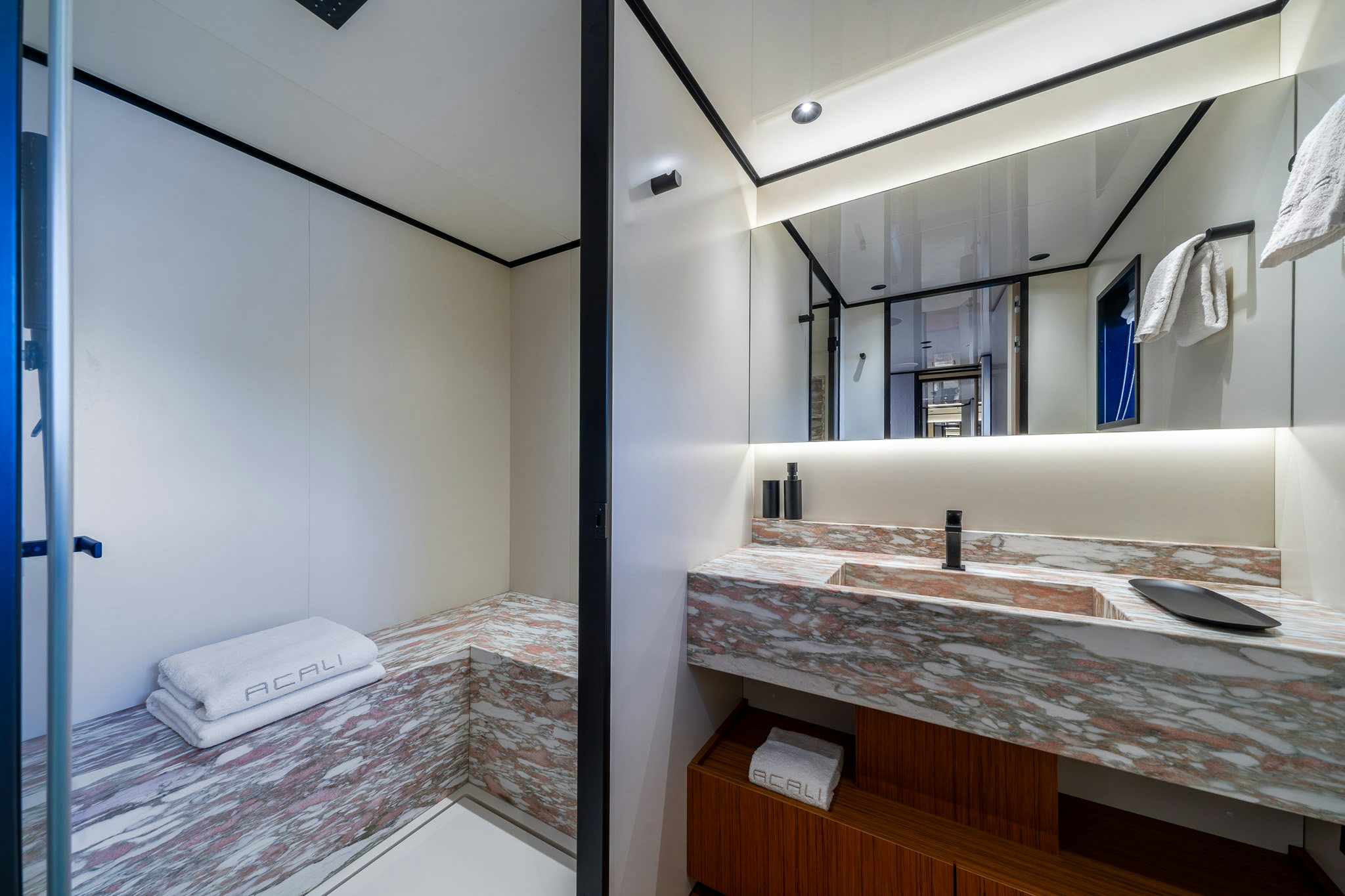 One of ACALI's standout features is her exceptional interior volume, thanks to her impressive 12-meter beam. The forward section of the main deck is devoted to the owner, offering a massive private retreat with a foredeck lounge that spans nearly half the deck. The cabin itself is an oasis, complete with a central bed for easy movement, a spacious en-suite with beautiful views and elegant touches like leather accents. Step outside to your terrace and take in the uninterrupted views in seclusion—this is what yachting was made for.