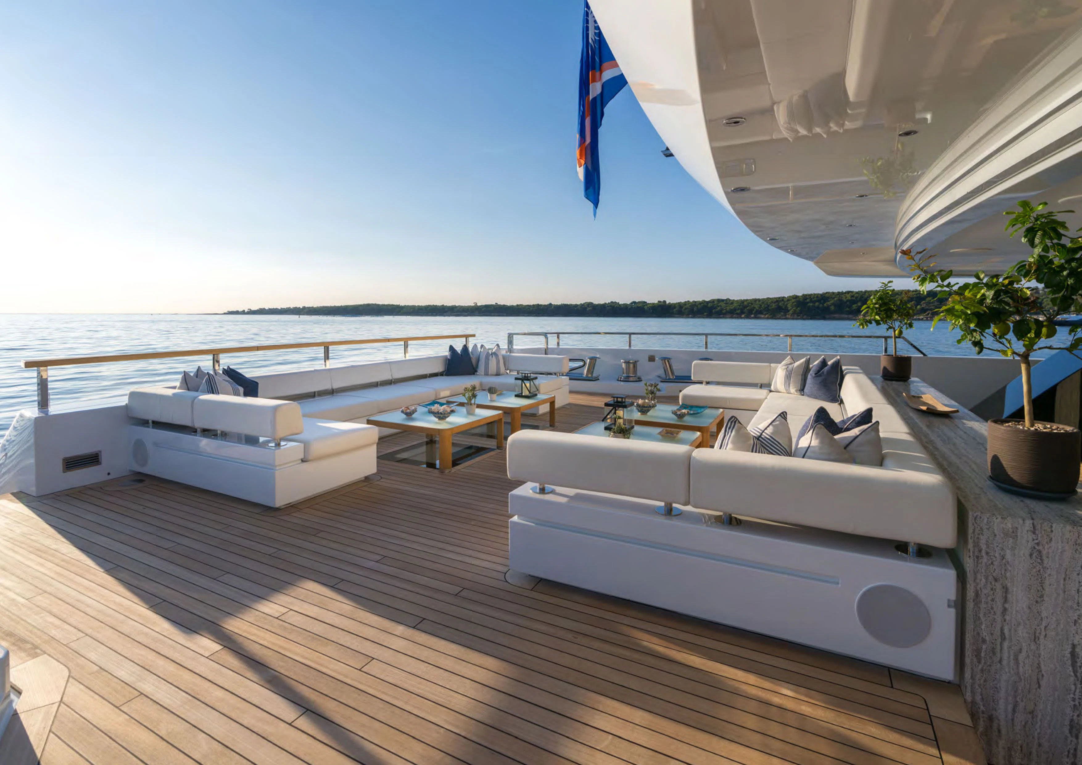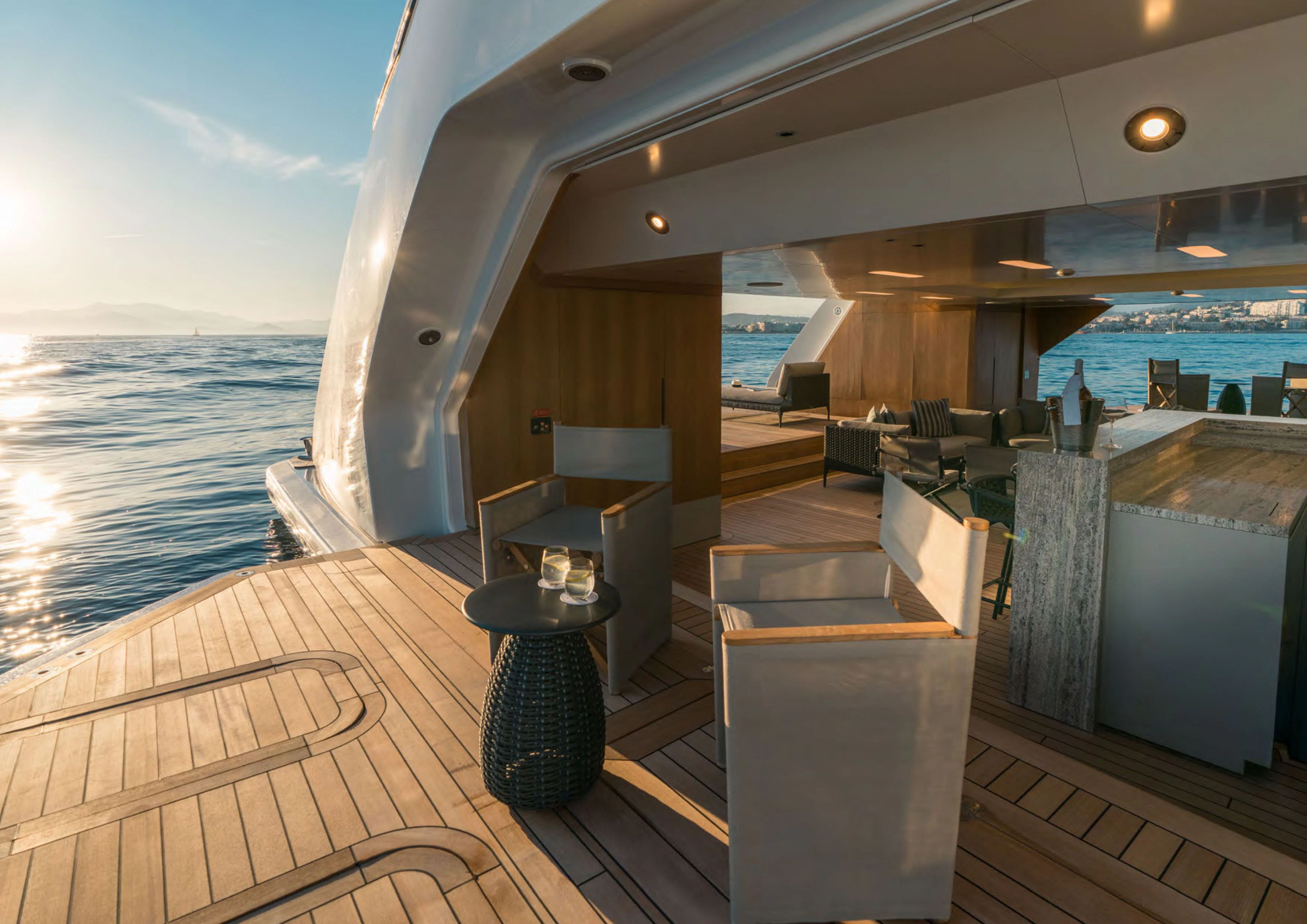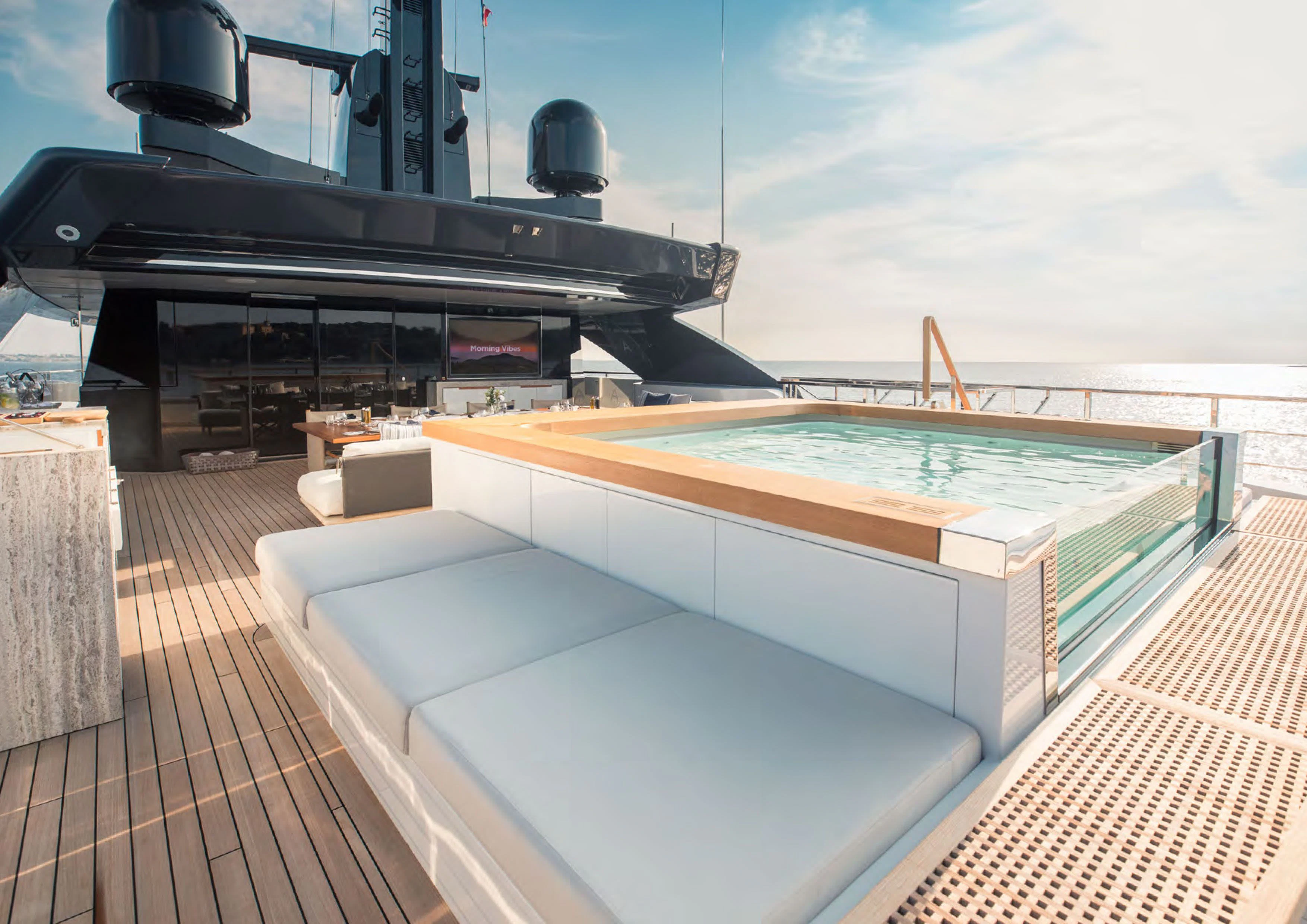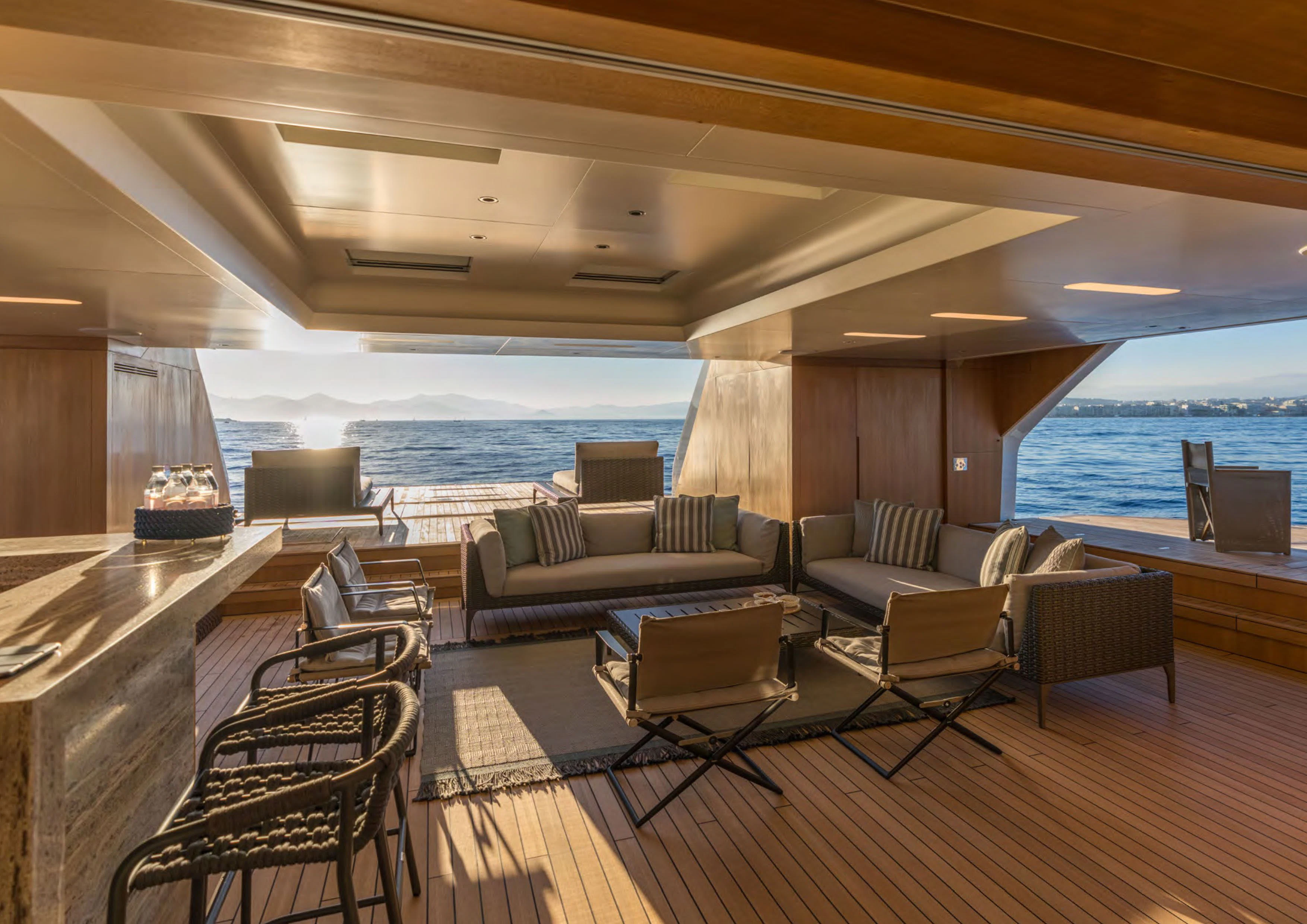 ALCHEMIST's outdoor spaces are nothing short of spectacular. Imagine basking under the sun on her spacious sundecks equipped with plush loungers or dining alfresco under starlit skies in her dedicated dining areas – every corner has been designed keeping in mind utmost luxury and comfort for her guests. Her draft measures just shy of ten feet allowing access to shallow waters while maintaining stability at sea.