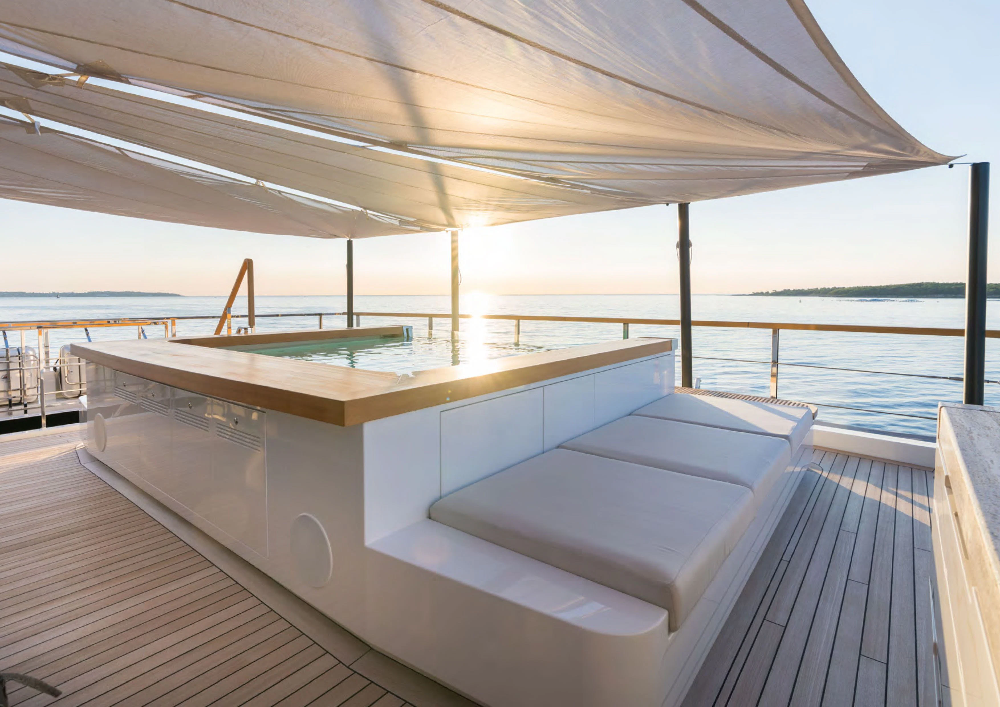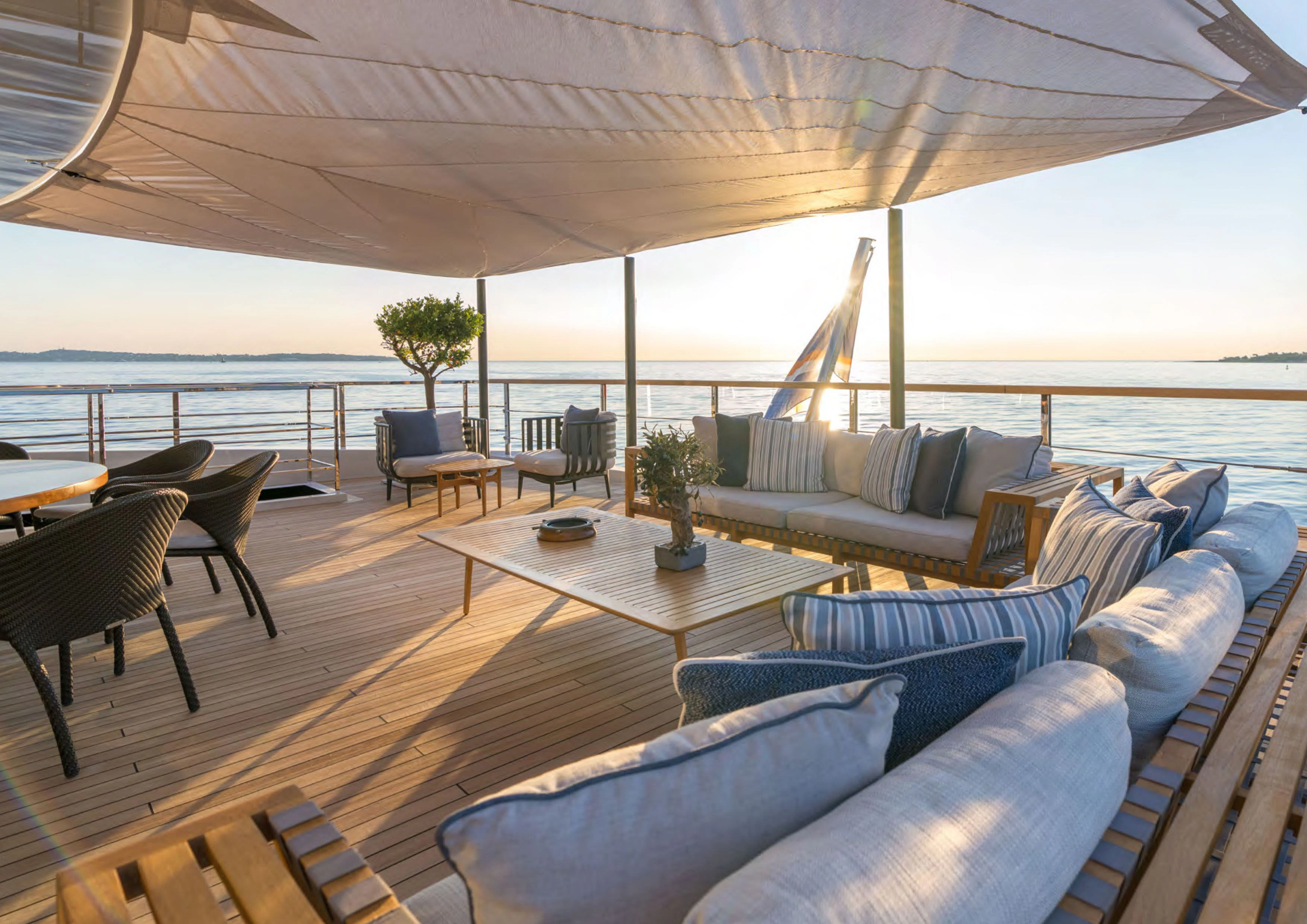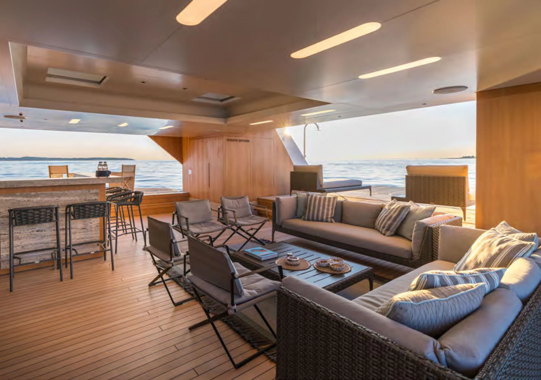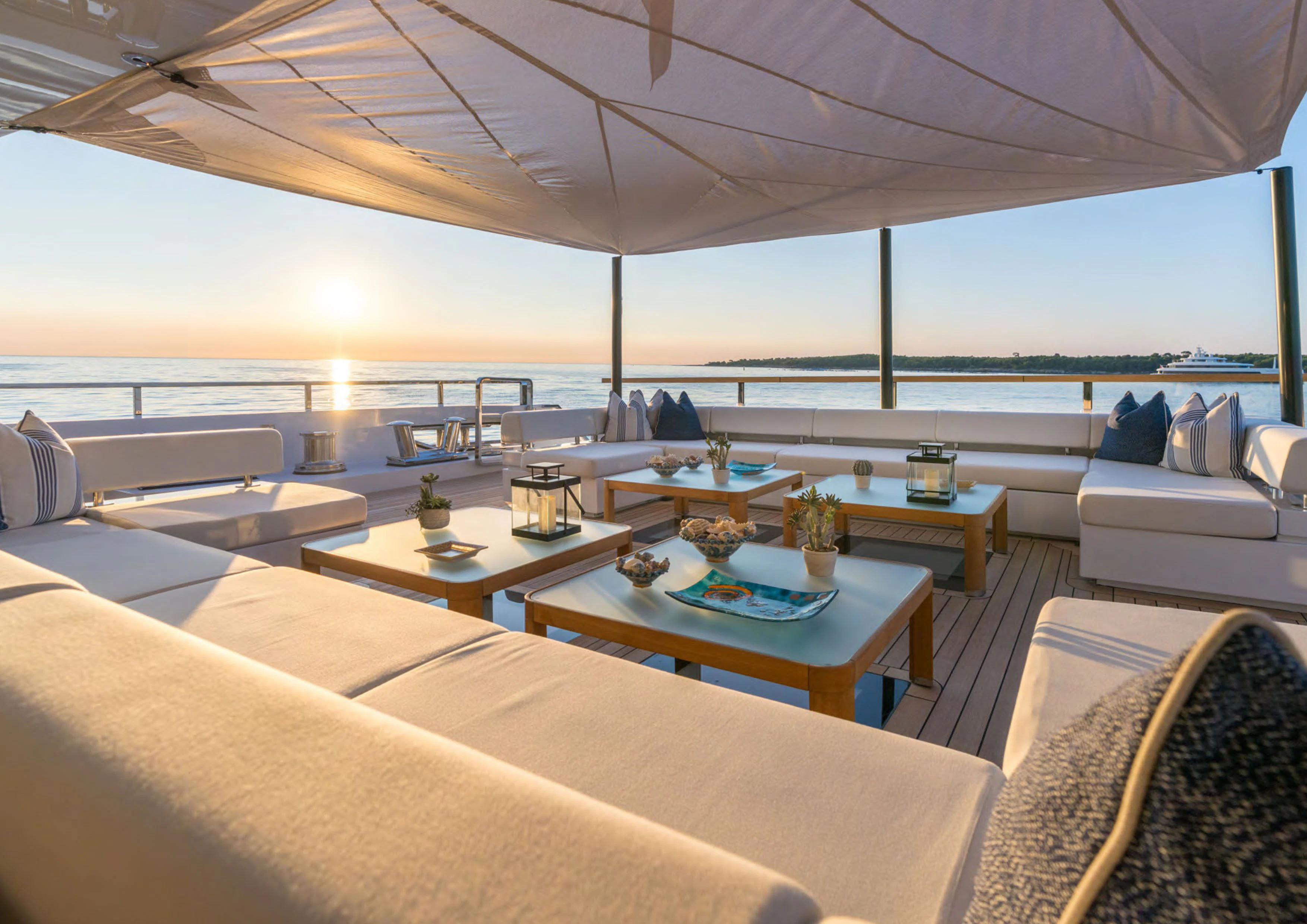 ALCHEMIST's outdoor spaces are nothing short of spectacular. Imagine basking under the sun on her spacious sundecks equipped with plush loungers or dining alfresco under starlit skies in her dedicated dining areas – every corner has been designed keeping in mind utmost luxury and comfort for her guests. Her draft measures just shy of ten feet allowing access to shallow waters while maintaining stability at sea.