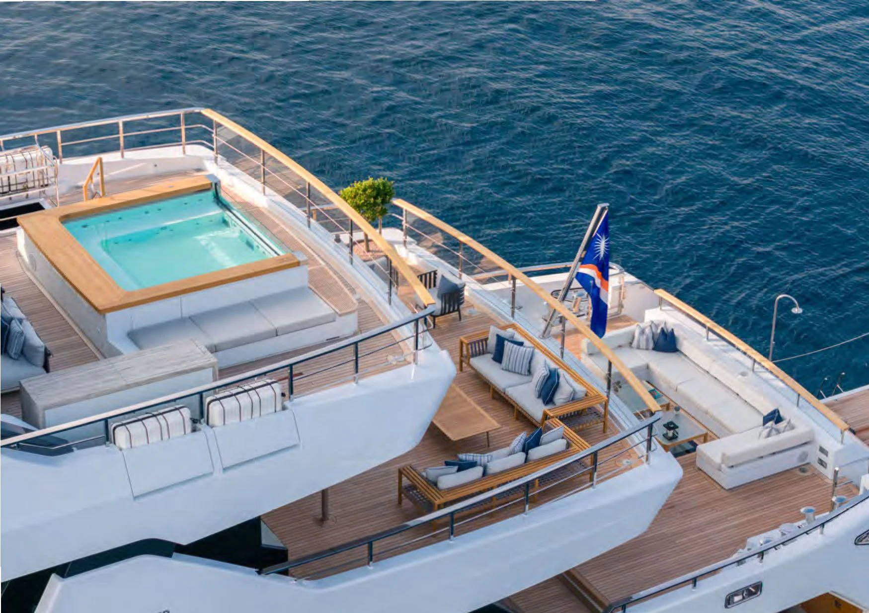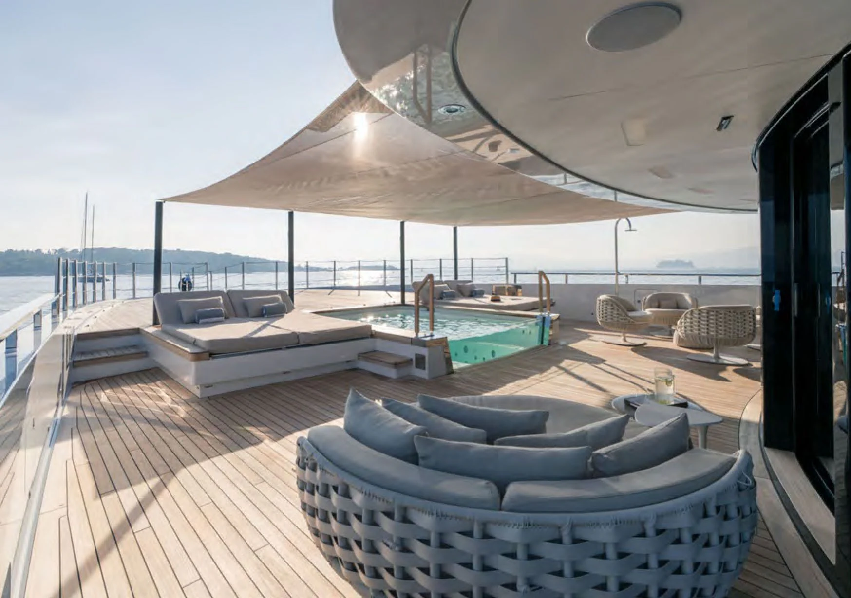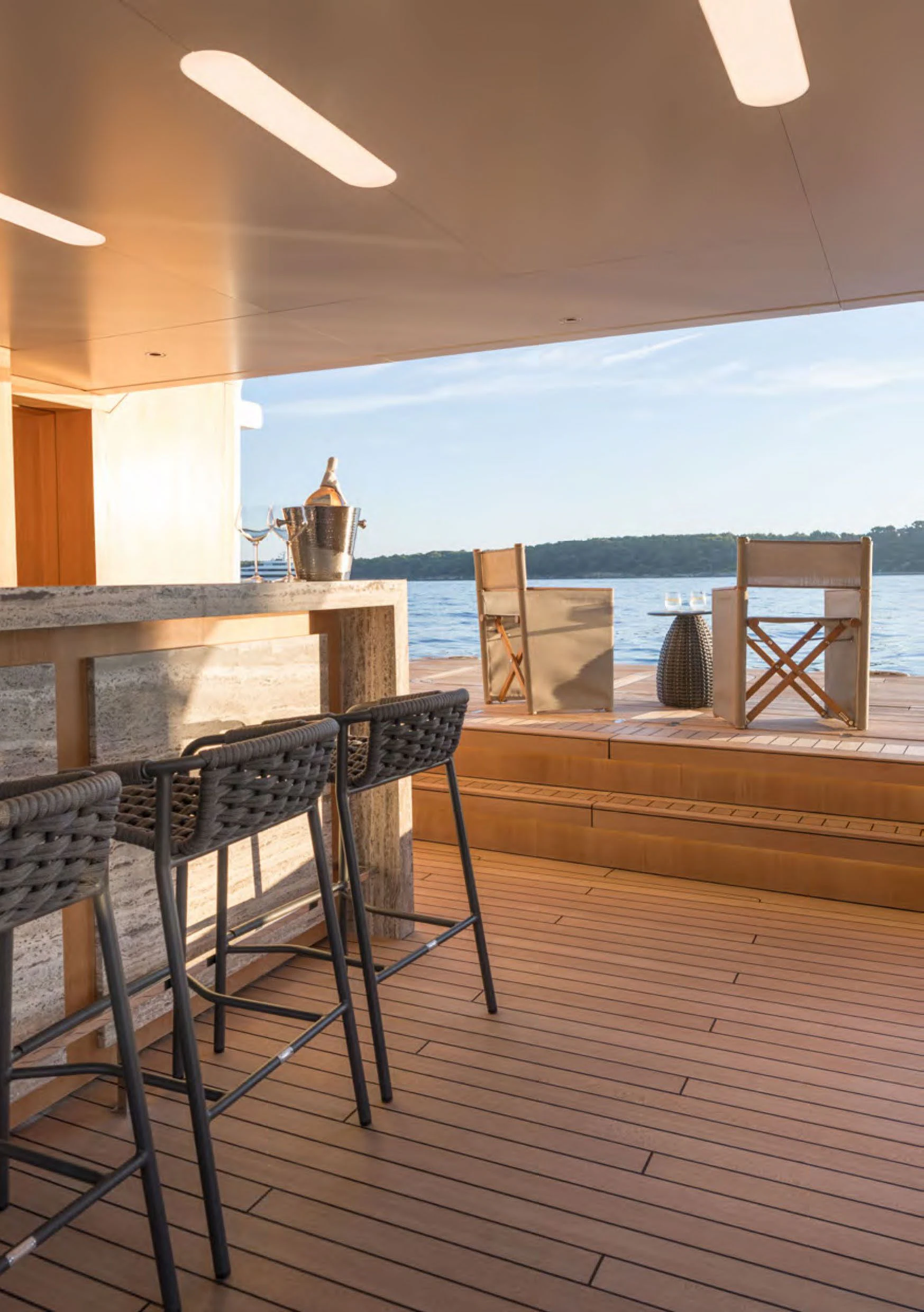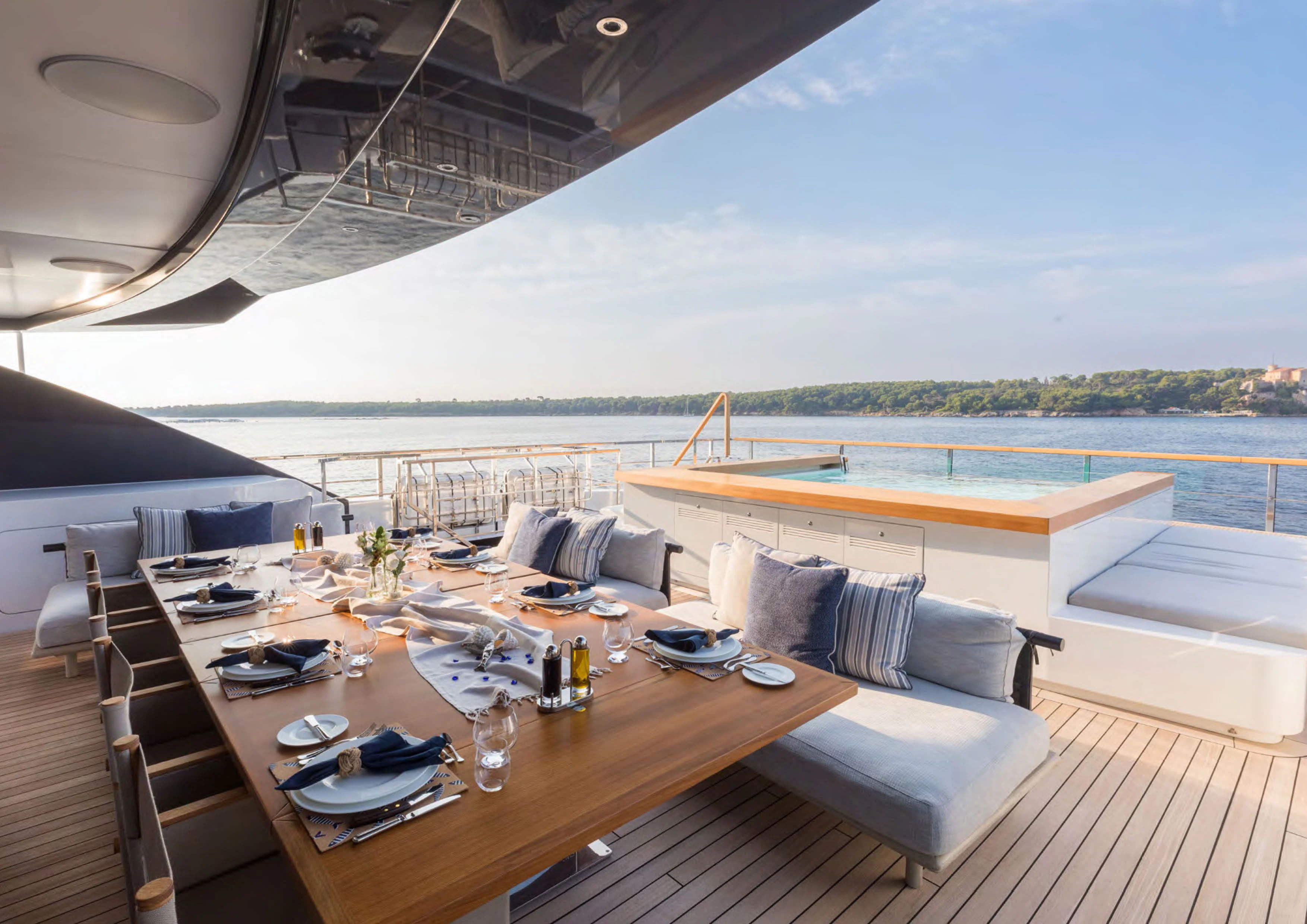 ALCHEMIST's outdoor spaces are nothing short of spectacular. Imagine basking under the sun on her spacious sundecks equipped with plush loungers or dining alfresco under starlit skies in her dedicated dining areas – every corner has been designed keeping in mind utmost luxury and comfort for her guests. Her draft measures just shy of ten feet allowing access to shallow waters while maintaining stability at sea.