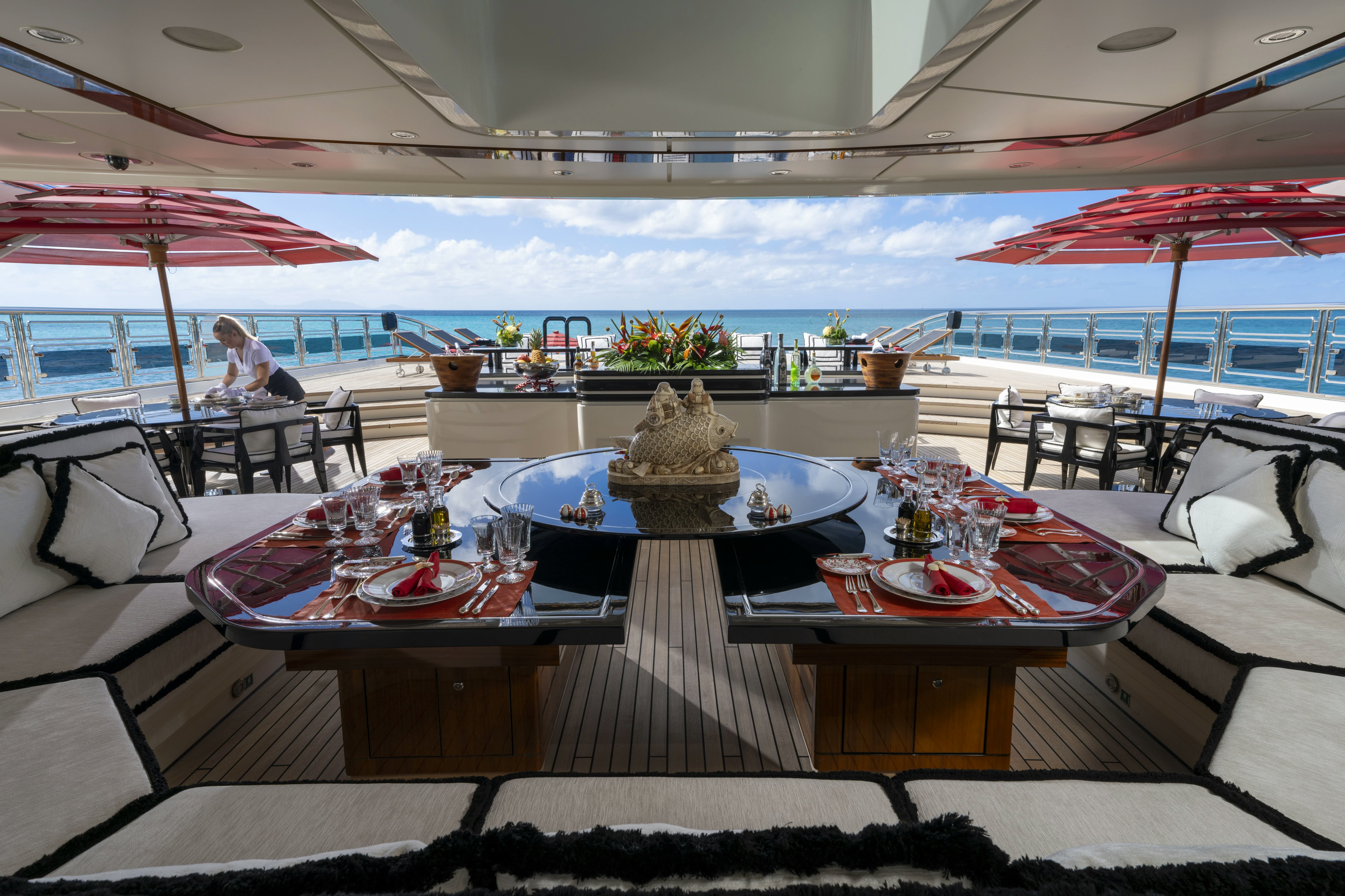 The aft deck is one of ALFA NERO’s most distinctive features. She was the first yacht to feature an infinity pool with a glass waterfall side. When the pool is drained, its floor can be raised to sit flush with the deck, creating a large open-air entertainment space. The area is complemented by a full wet bar, generous banquette seating and plenty of space for alfresco dining or hosting large events.