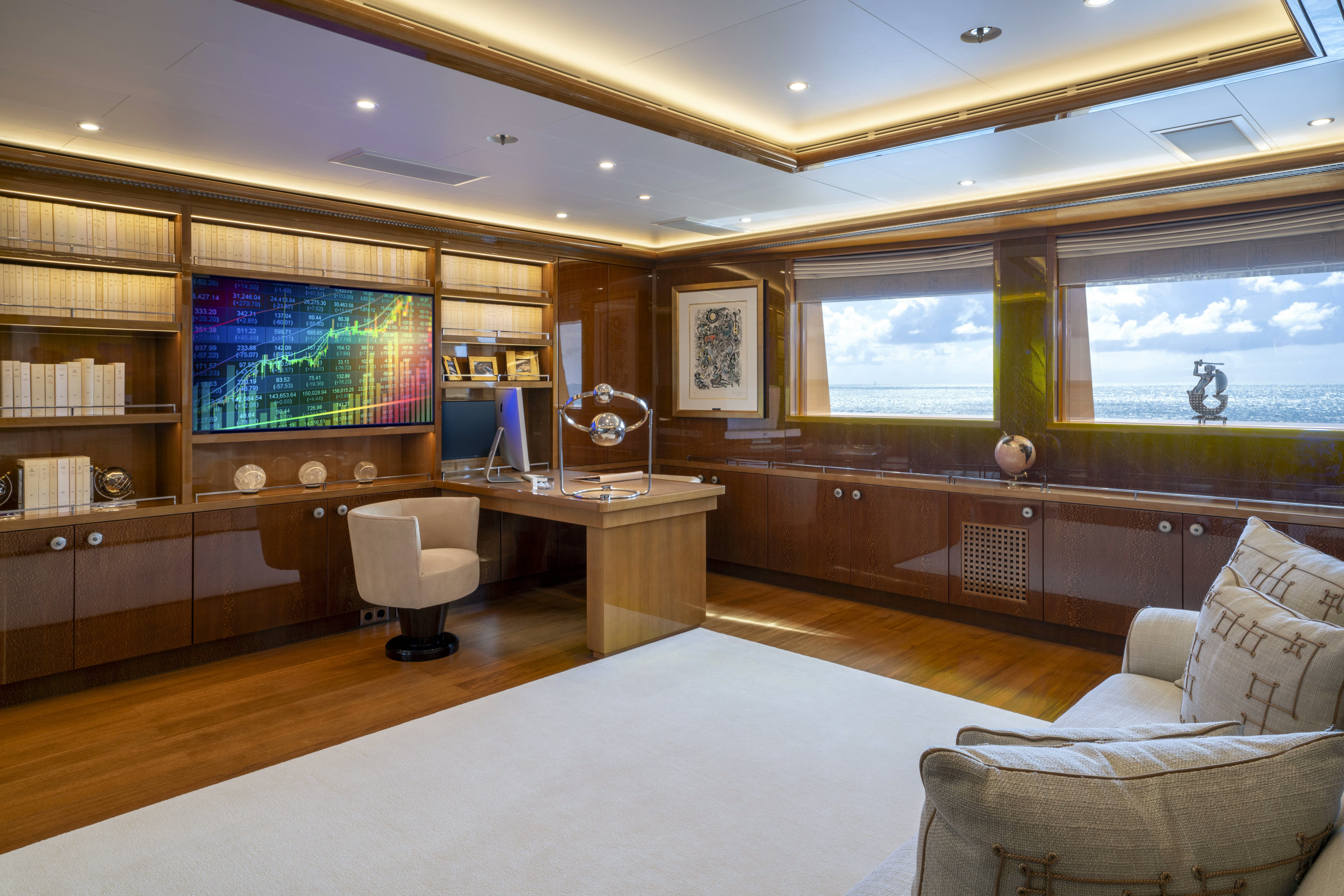 Inside, Alberto Pinto’s interior combines Art Deco influences with modern pop art references. Monochrome bases are accented with bursts of color, tactile finishes and works by artists such as Lichtenstein and Murakami. Wenge wood, lacquered panels, fine leathers and precious metals run throughout. The main salon features a Pleyel grand piano in black lacquer, oversized seating and retractable glass doors opening directly to the aft deck.