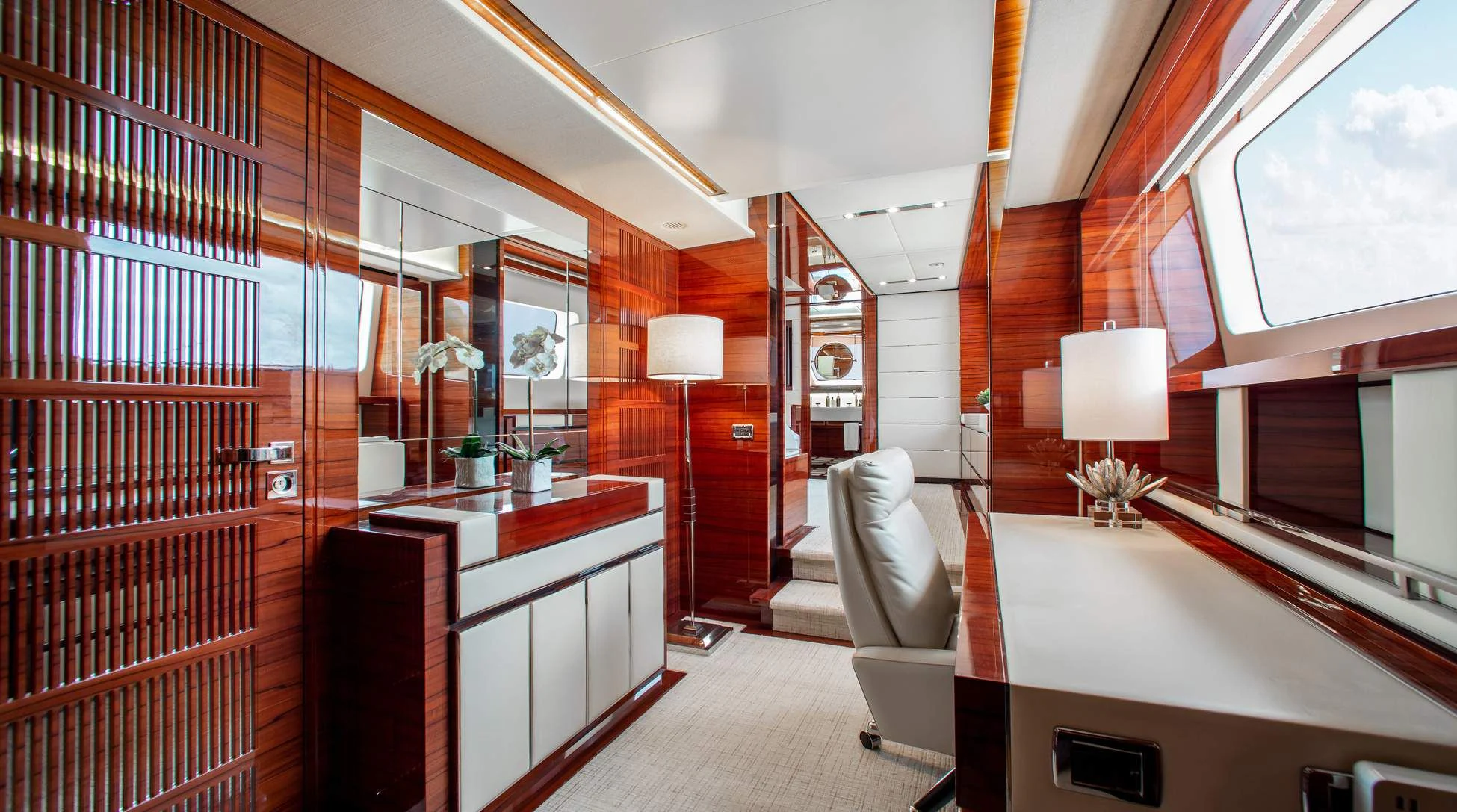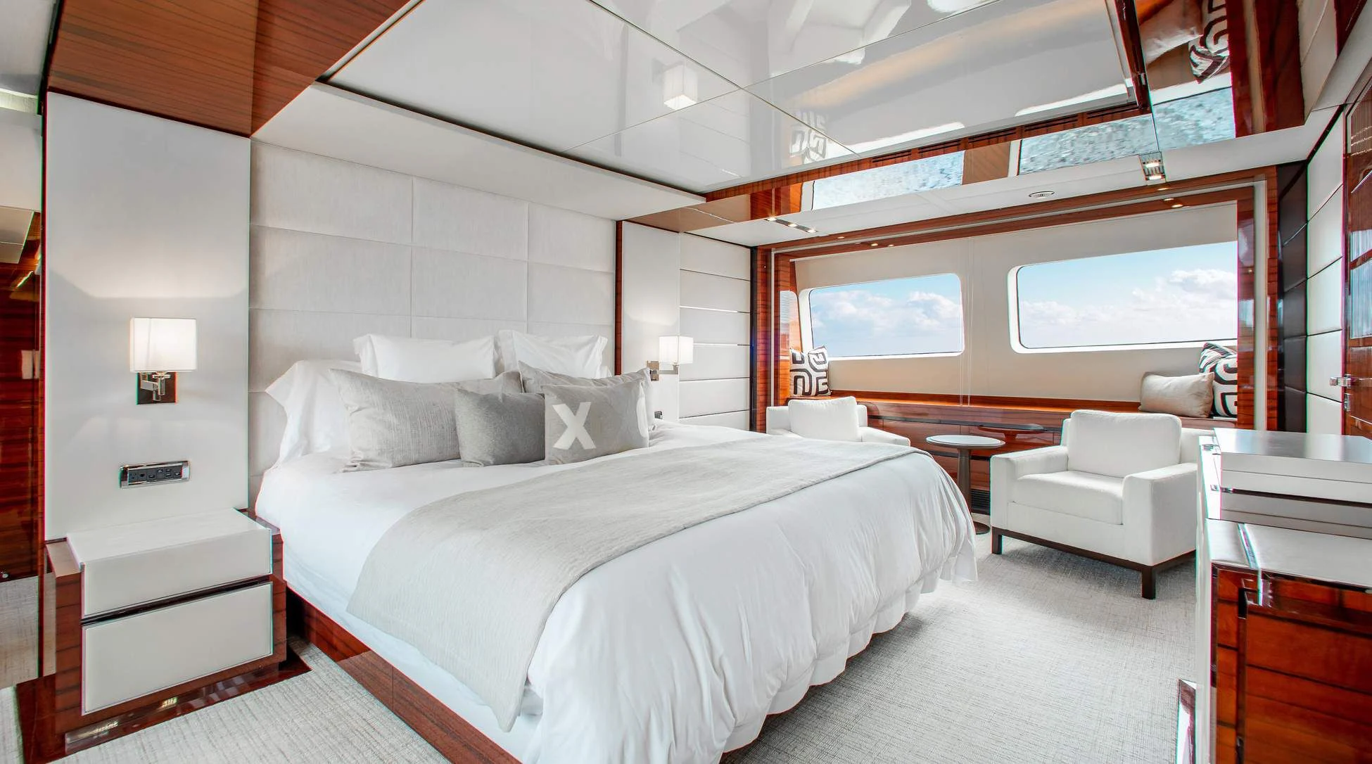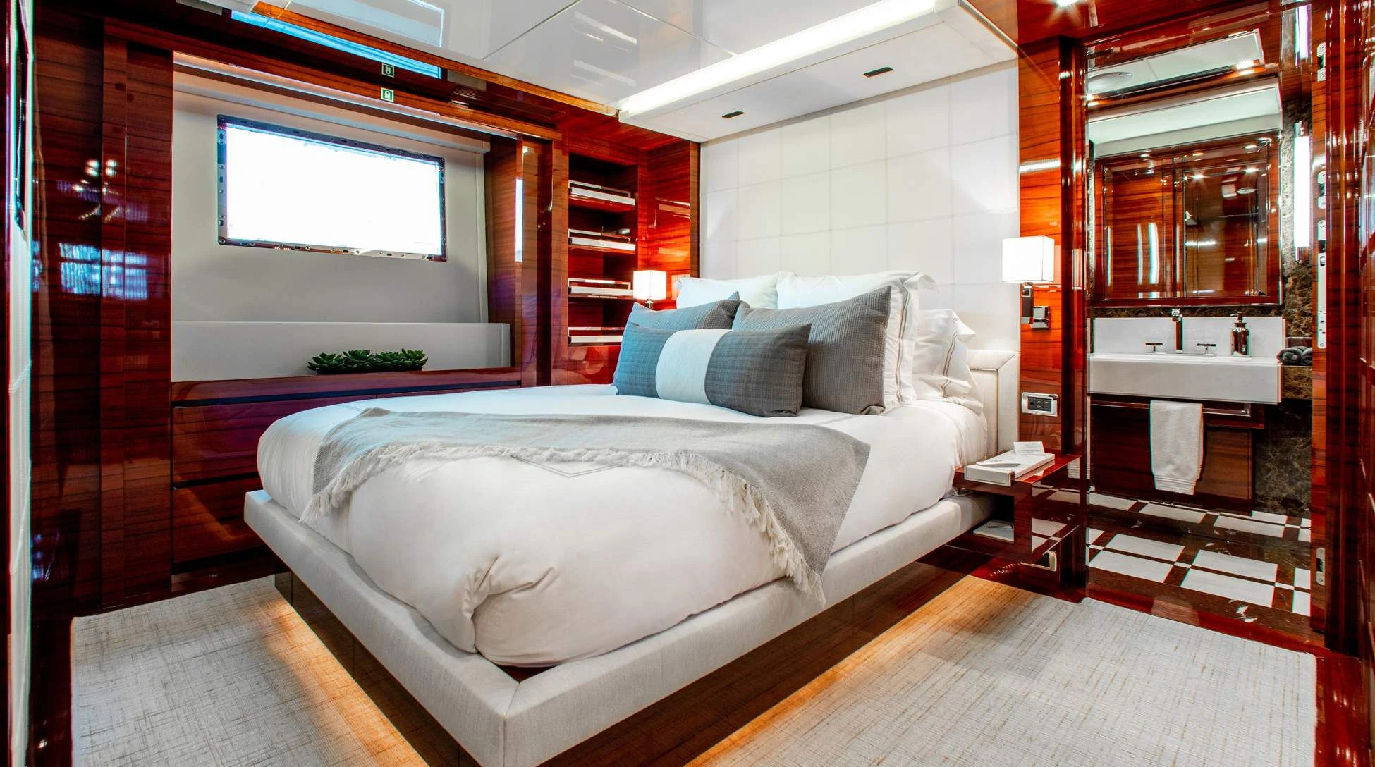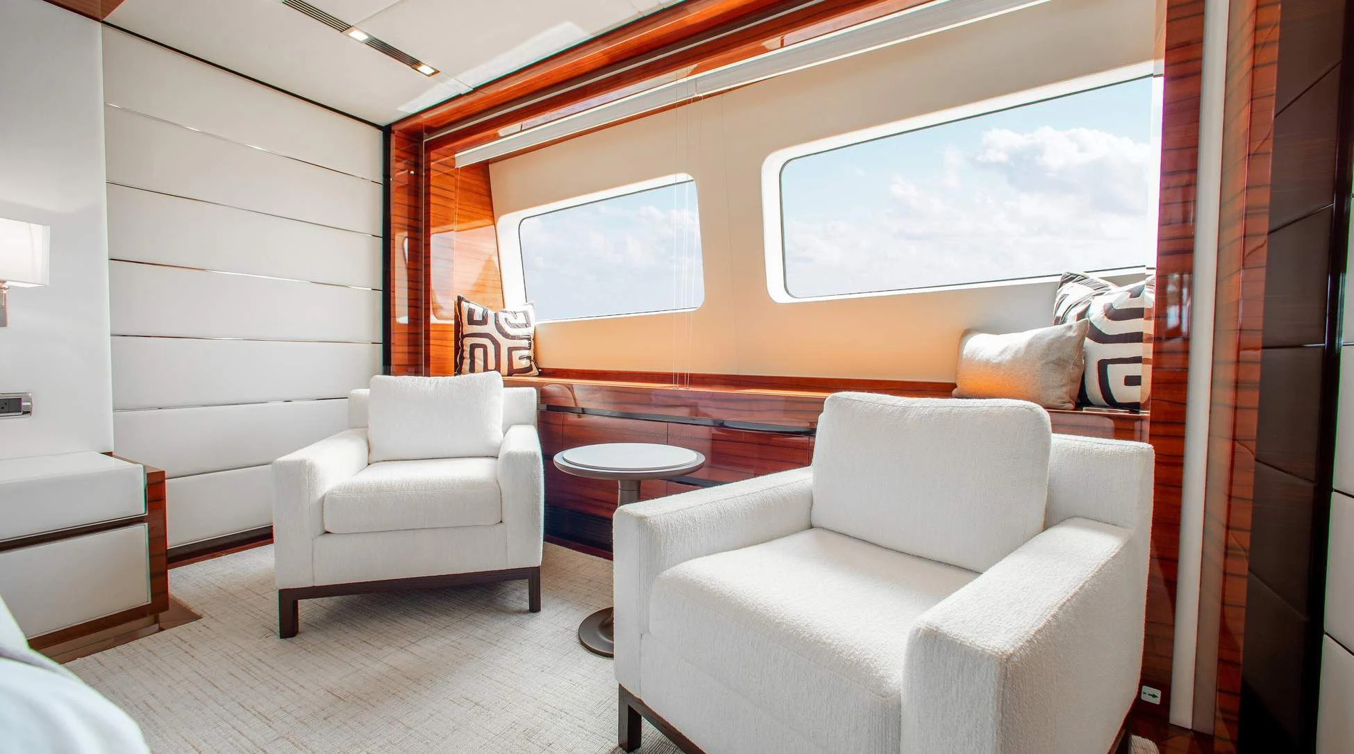 Step aboard ALLORA to discover her remarkable interiors that can comfortably accommodate up to twelve guests across five luxurious cabins. A crew of seven ensures impeccable service for all guests onboard. The interior design reflects contemporary style with subtle undertones of classic elegance – a signature trait associated with Benetti creations.