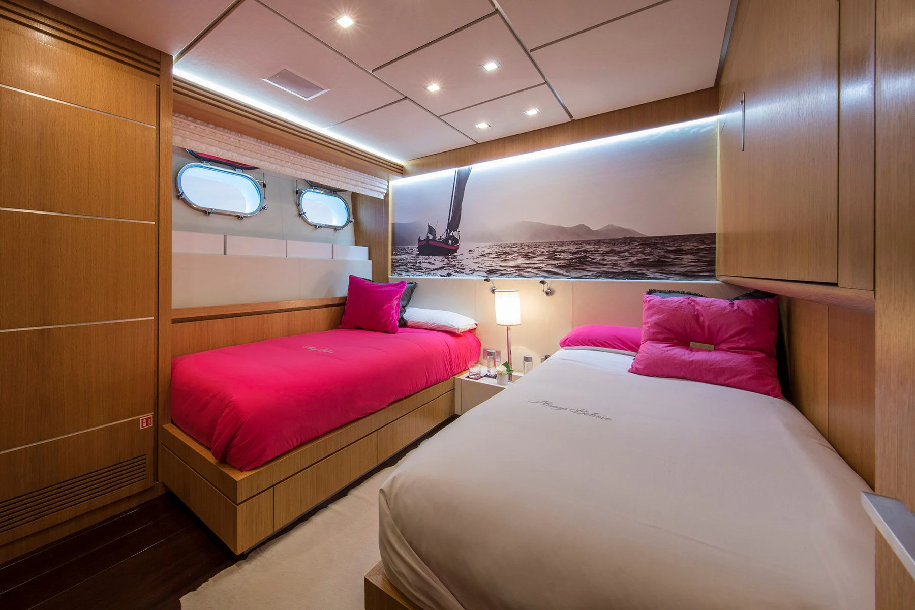 ALWAYS BELIEVE comes complete with state-of-the-art amenities such as Wi-Fi connectivity ensuring guests stay connected even while at sea. Among its machinery are two powerful MTU engines each boasting power outputs of 3650 hp / 2722 kW ensuring smooth sailing regardless of weather conditions.