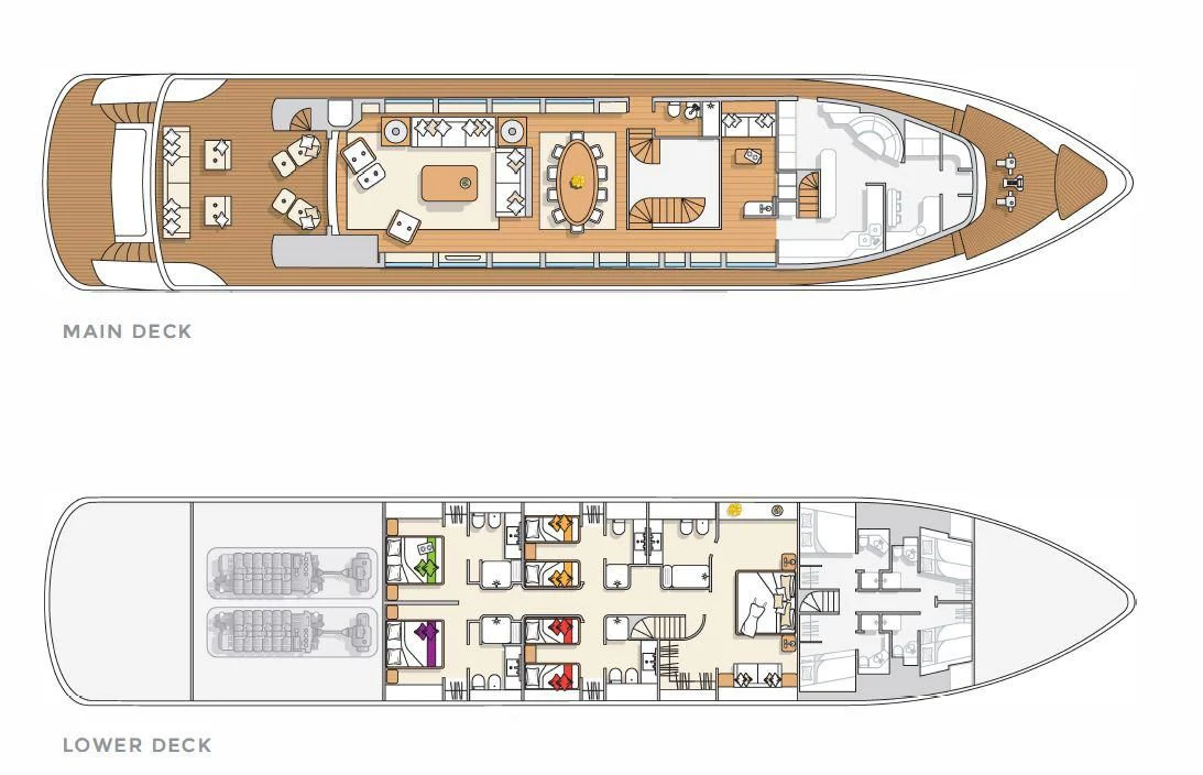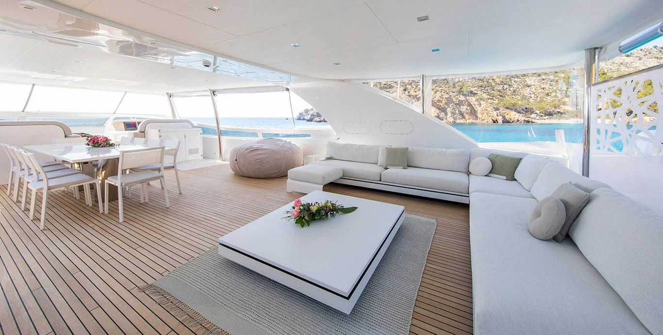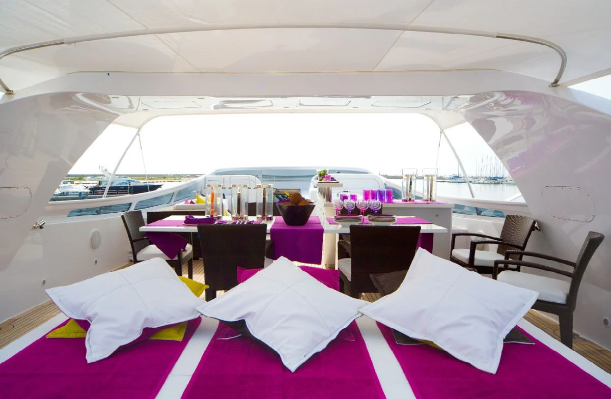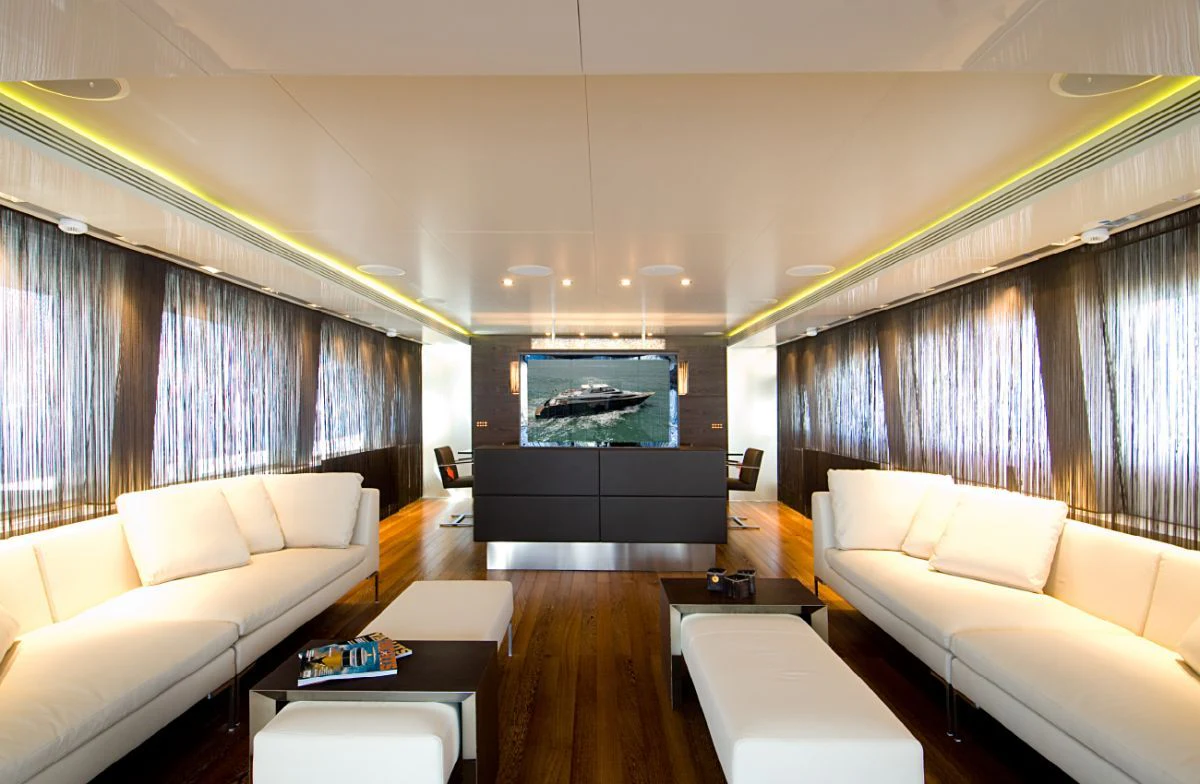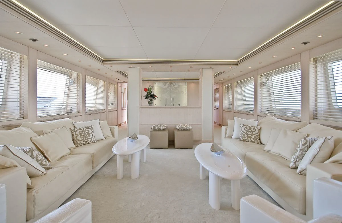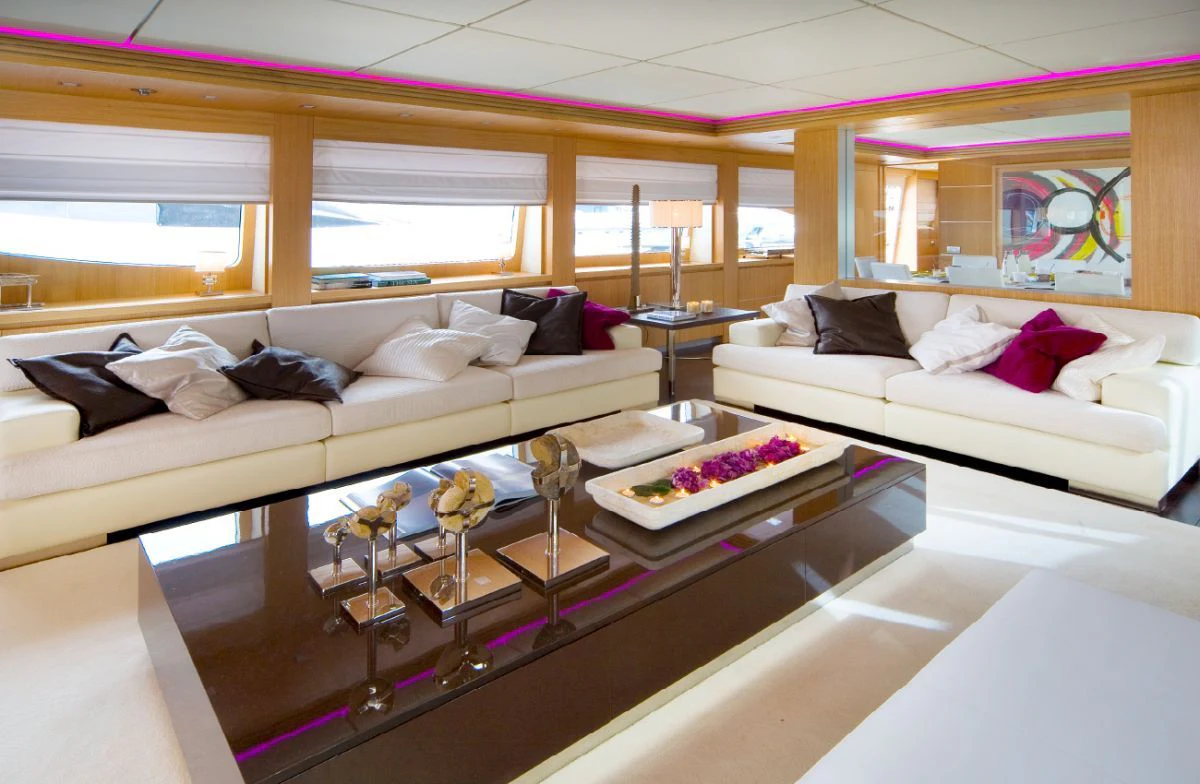 The main salon is spacious yet intimate, offering plush seating arrangements perfect for socializing or unwinding in front of your favorite movie. The dining area exudes elegance where guests can enjoy gourmet meals prepared by our talented onboard chef. For fitness enthusiasts, there's also a well-equipped gym available onboard.