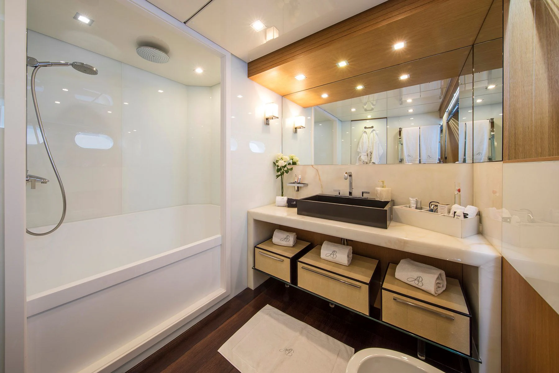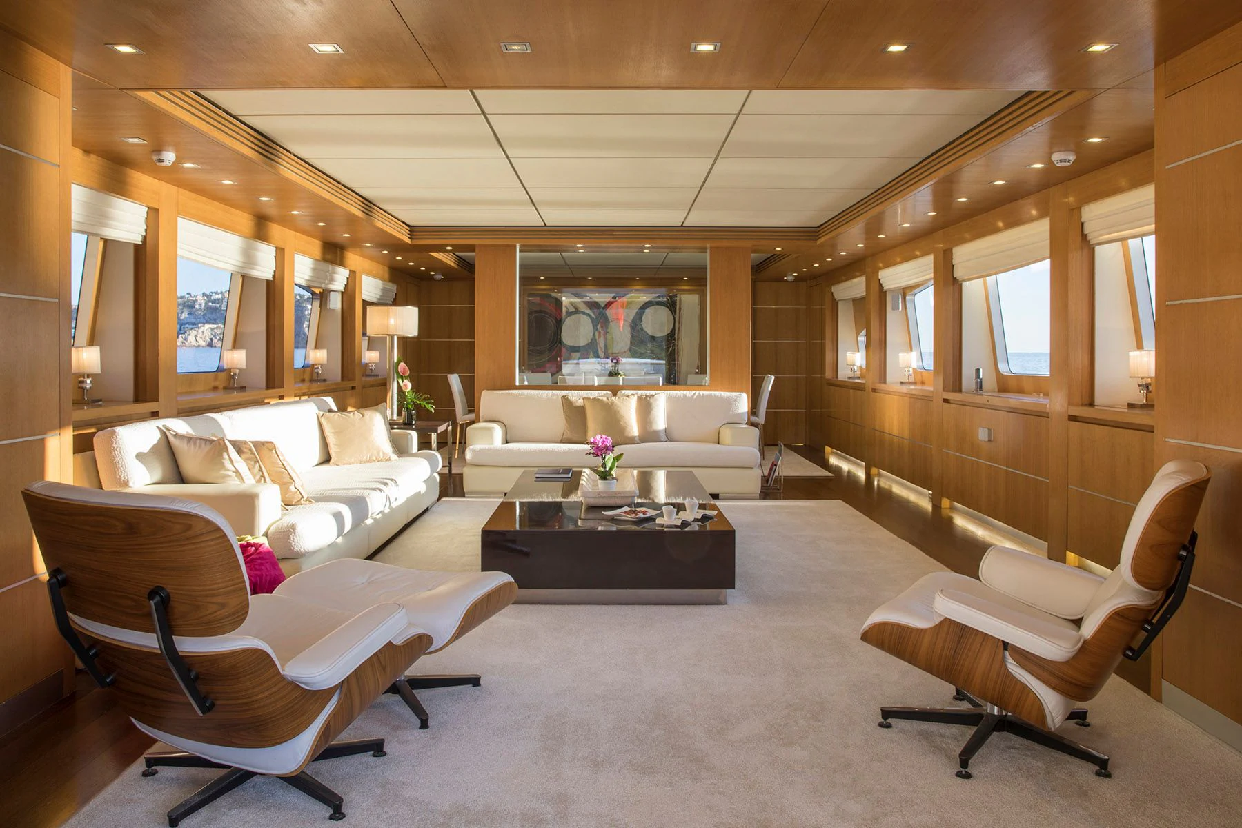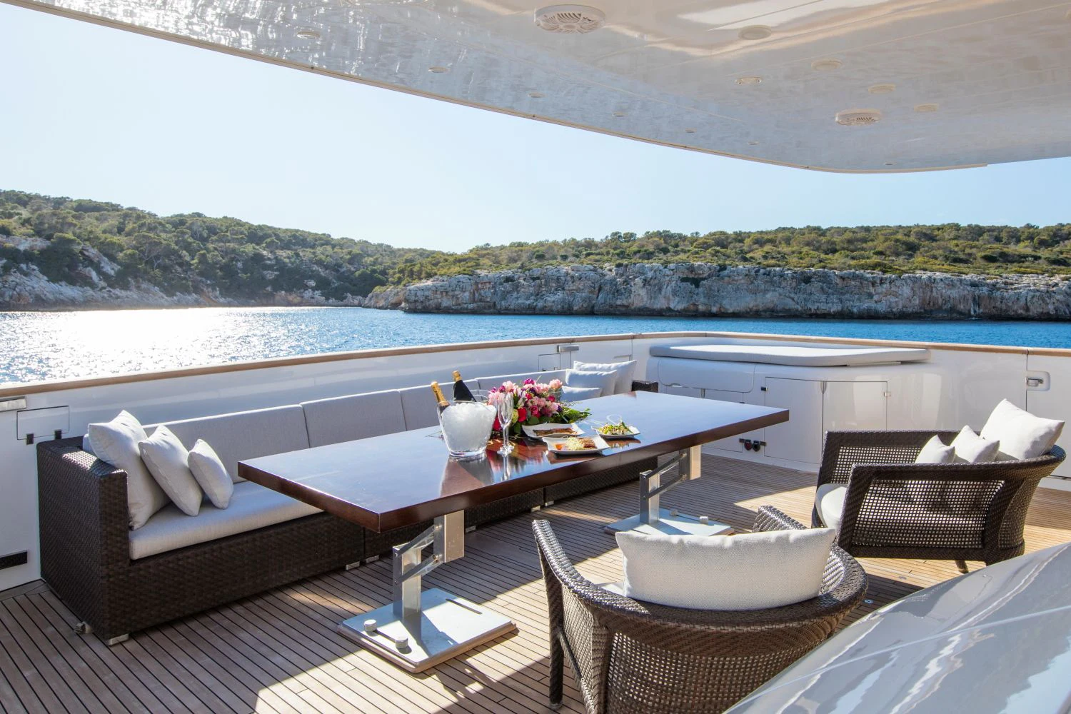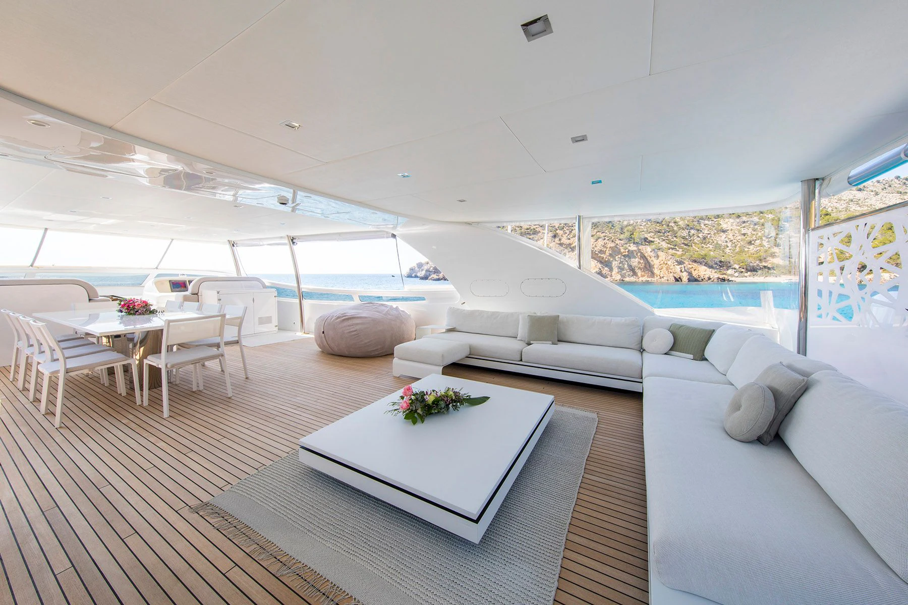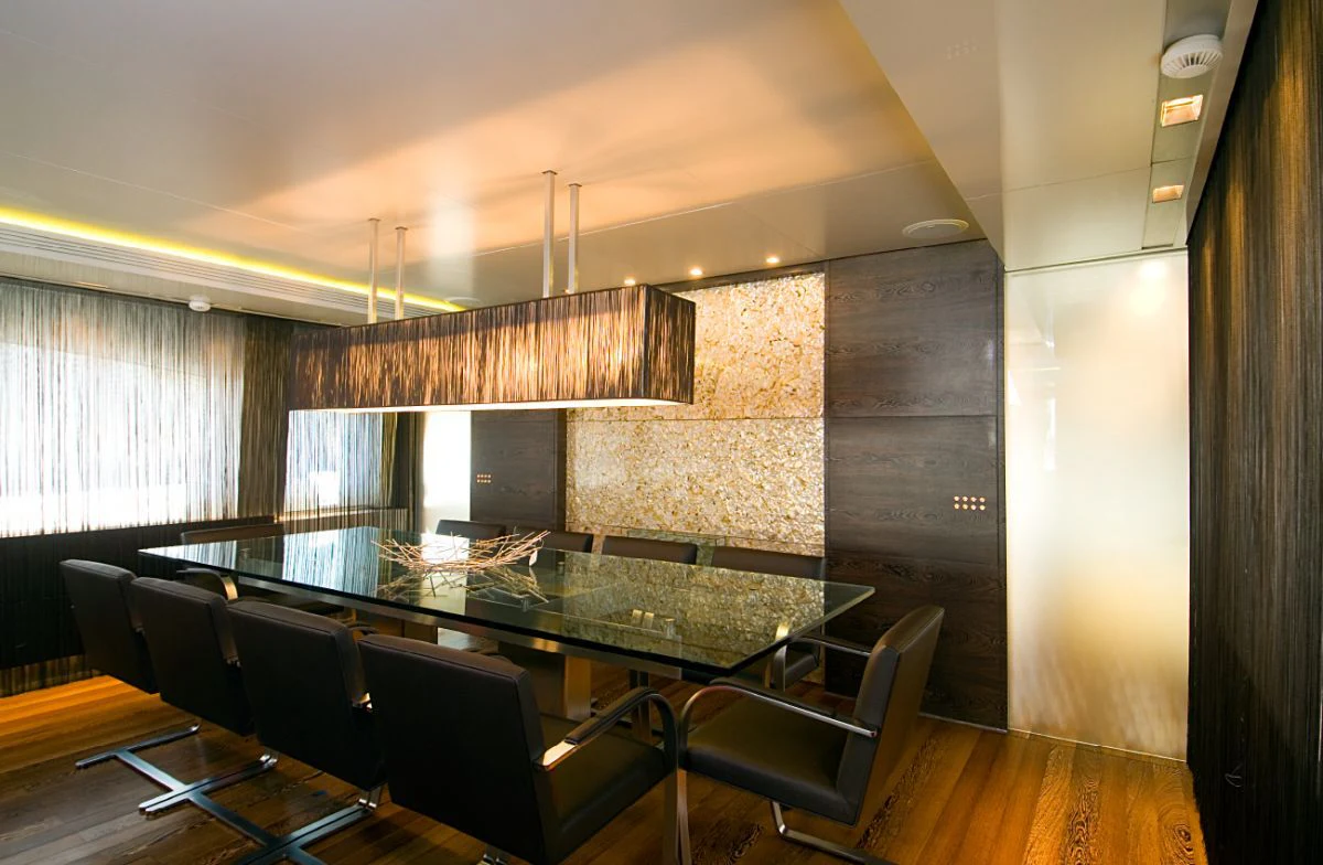 The main salon is spacious yet intimate, offering plush seating arrangements perfect for socializing or unwinding in front of your favorite movie. The dining area exudes elegance where guests can enjoy gourmet meals prepared by our talented onboard chef. For fitness enthusiasts, there's also a well-equipped gym available onboard.
