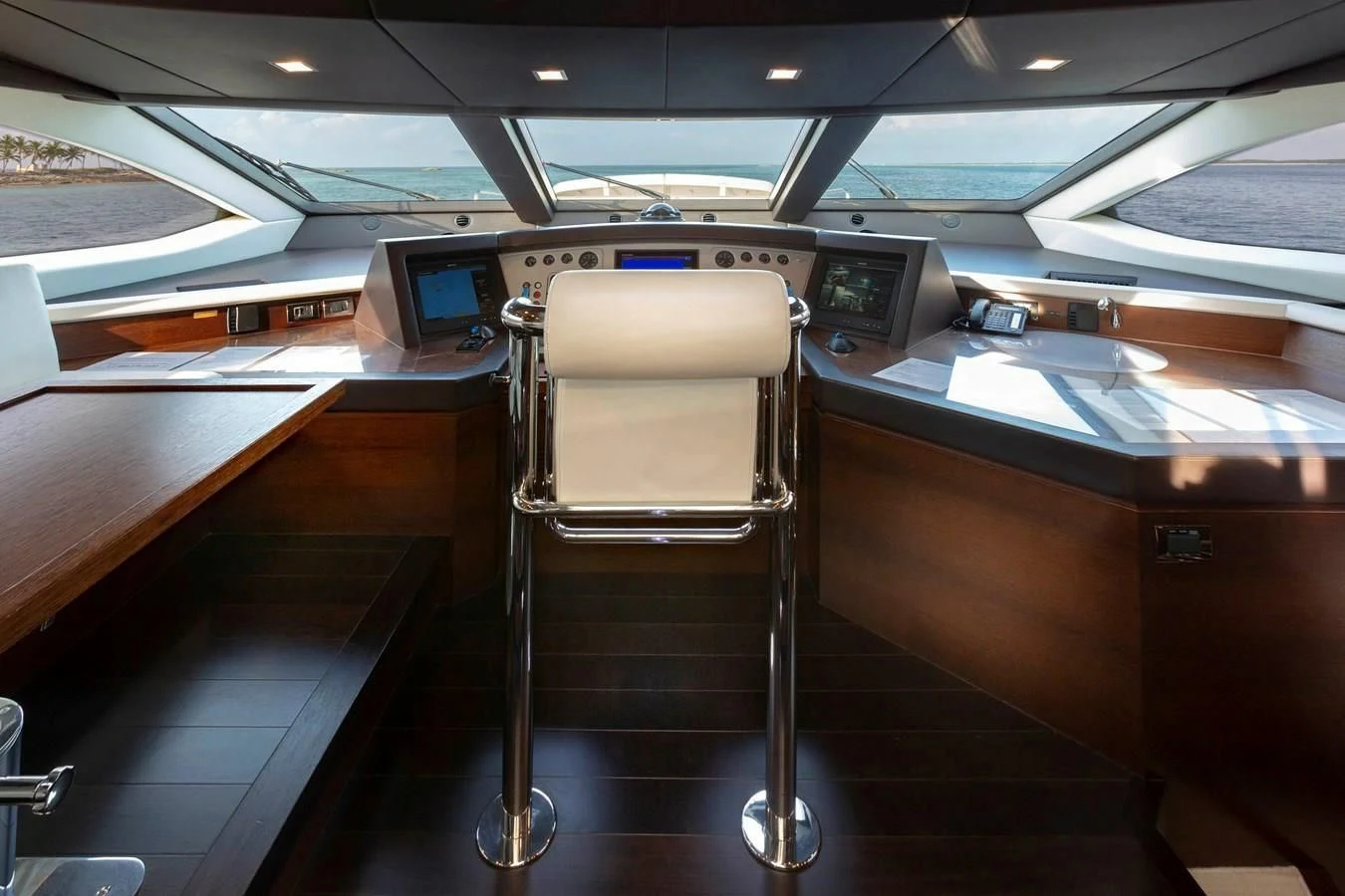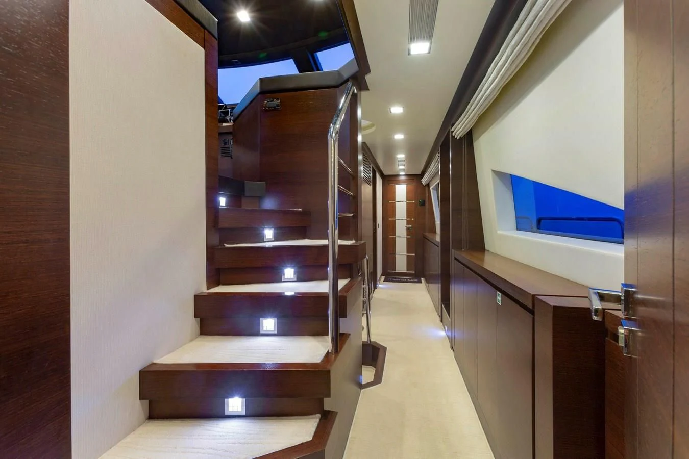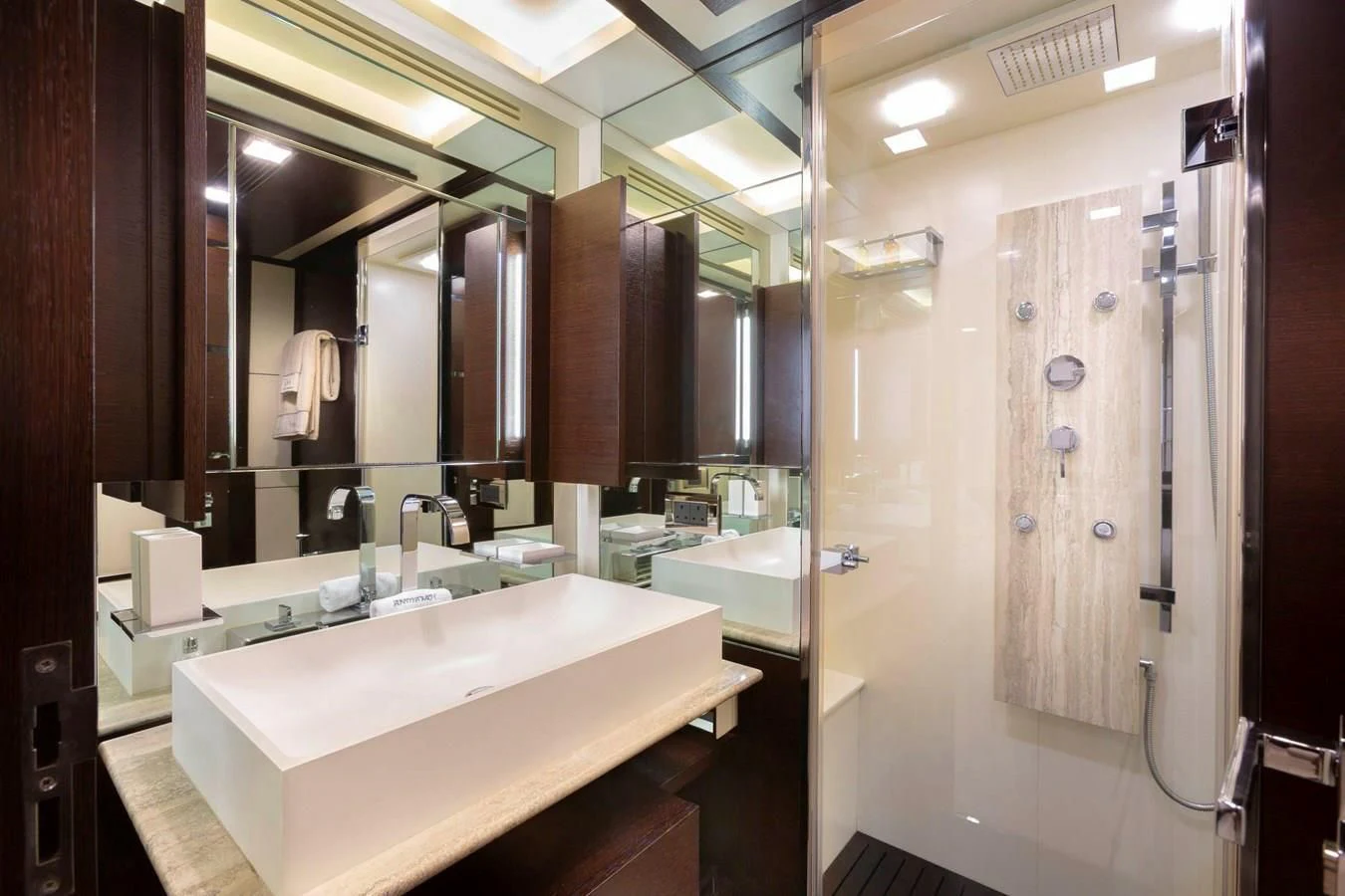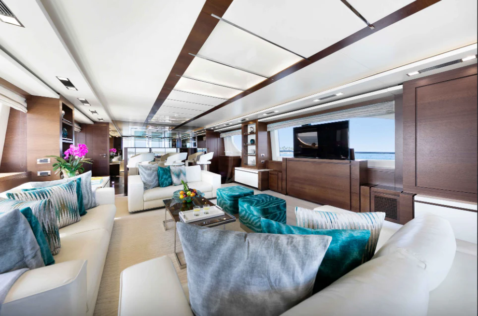 The interior style is equally captivating as it mirrors sophistication through every inch. Boasting five luxurious cabins that can comfortably accommodate ten guests along with five dedicated crew members; each room exudes comfort and opulence. Natural light floods into these living spaces creating an atmosphere that's both welcoming and serene – perfect after an exhilarating day out at sea. The master stateroom stands as an oasis within itself; spacious yet cozy with plush bedding that invites restful slumber.