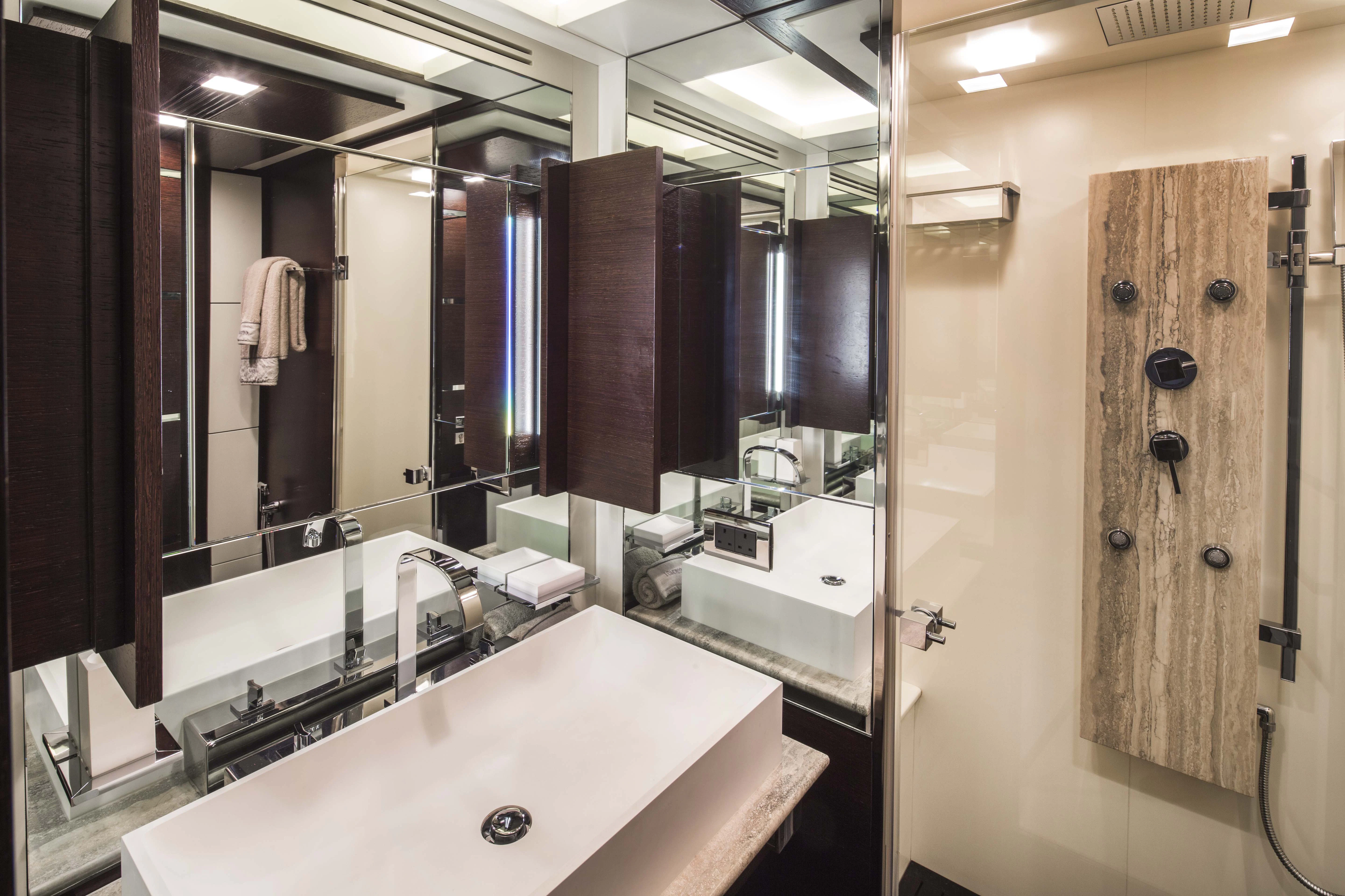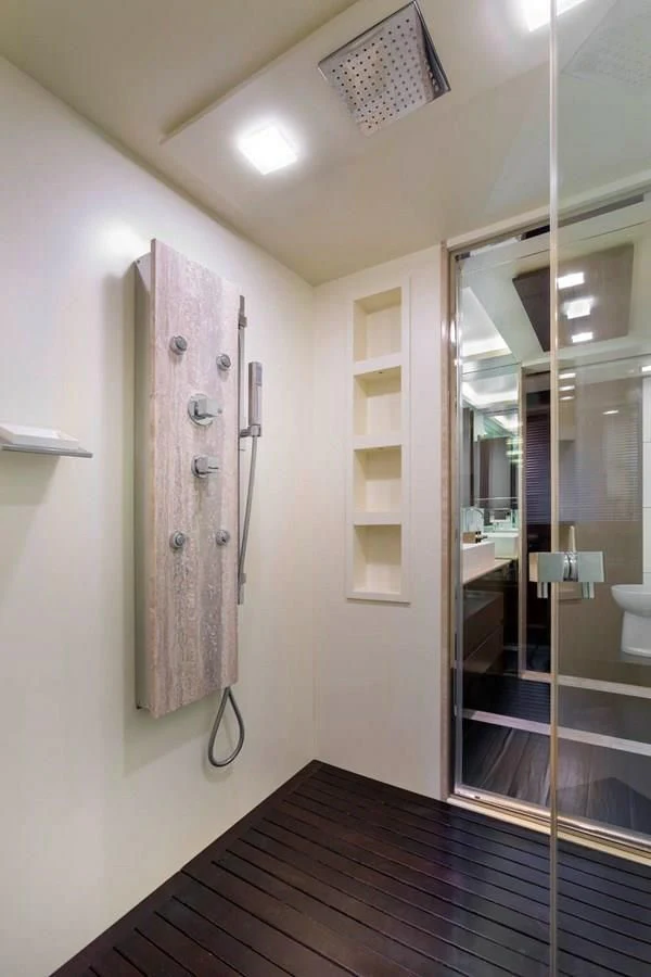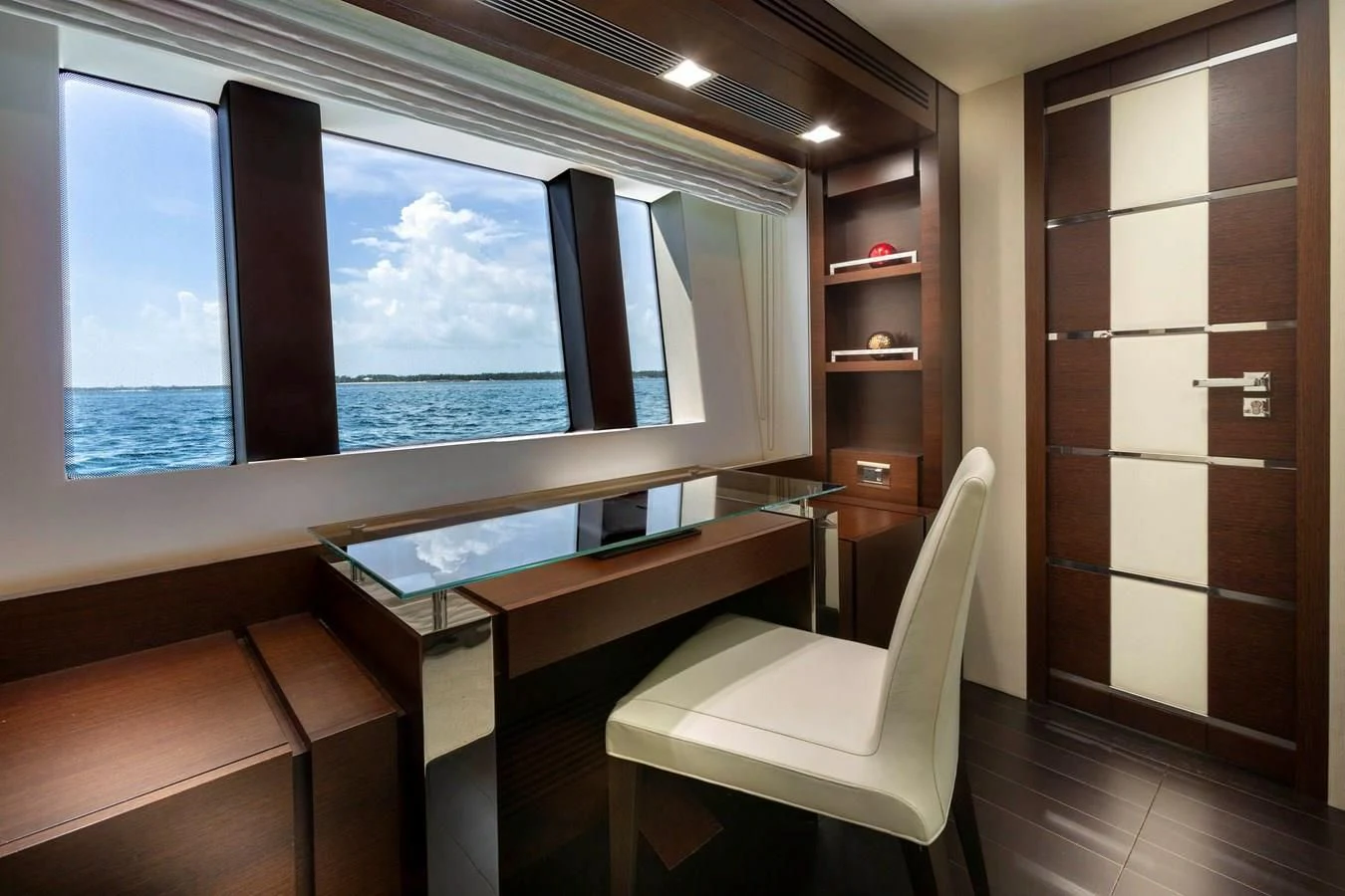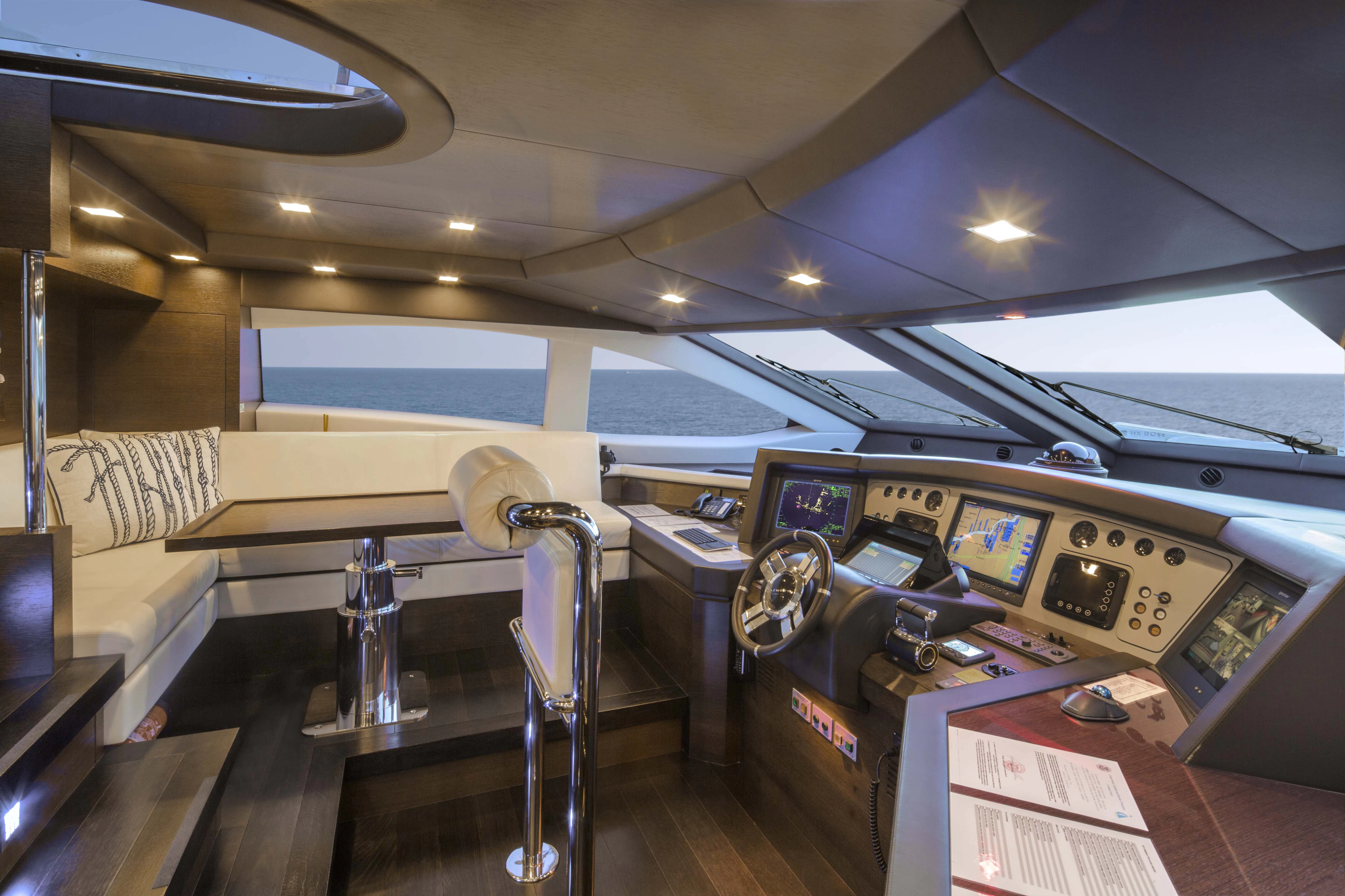 The interior style is equally captivating as it mirrors sophistication through every inch. Boasting five luxurious cabins that can comfortably accommodate ten guests along with five dedicated crew members; each room exudes comfort and opulence. Natural light floods into these living spaces creating an atmosphere that's both welcoming and serene – perfect after an exhilarating day out at sea. The master stateroom stands as an oasis within itself; spacious yet cozy with plush bedding that invites restful slumber.