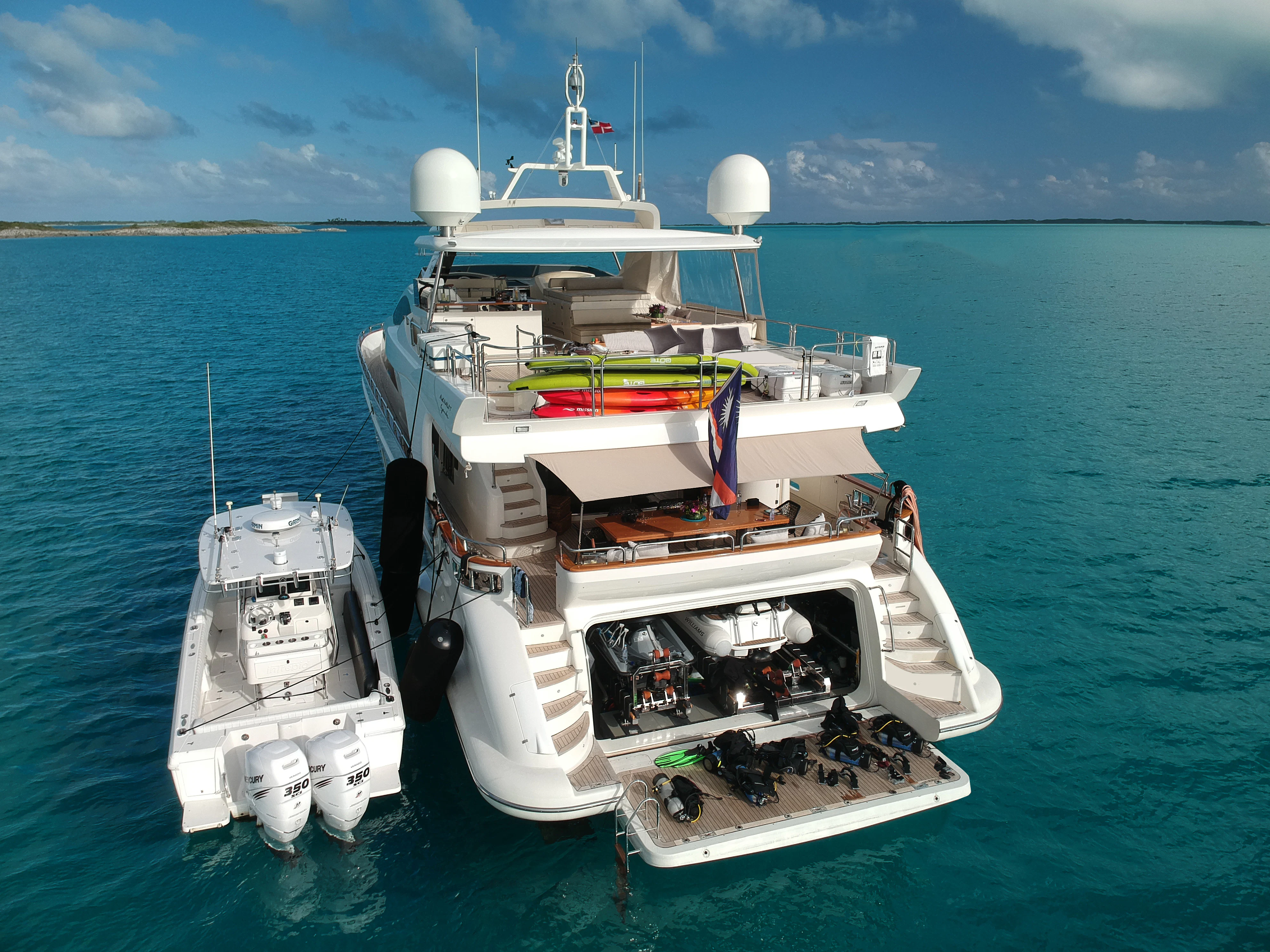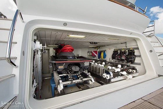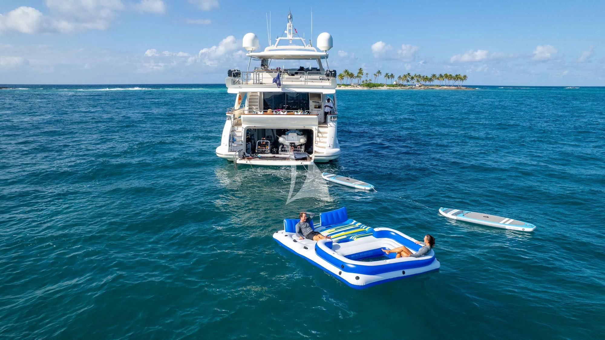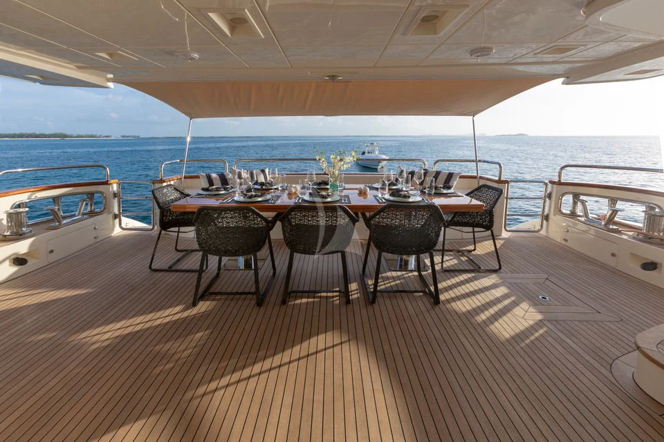 INSIEME's exterior spaces are truly exceptional. The flybridge offers panoramic views of the surrounding seascape while providing ample space for relaxation or socializing. Whether you desire to soak up rays on sun-drenched loungers or enjoy alfresco dining under starlit skies, this yacht caters to every whim. Notable features include a passarelle for easy boarding, tender garage for seamless exploration off-ship, beach club for intimate connections with sea life below surface level, personal watercrafts for adrenaline-charged adventures, at-anchor stabilizers ensuring tranquility even when anchored amidst waves.