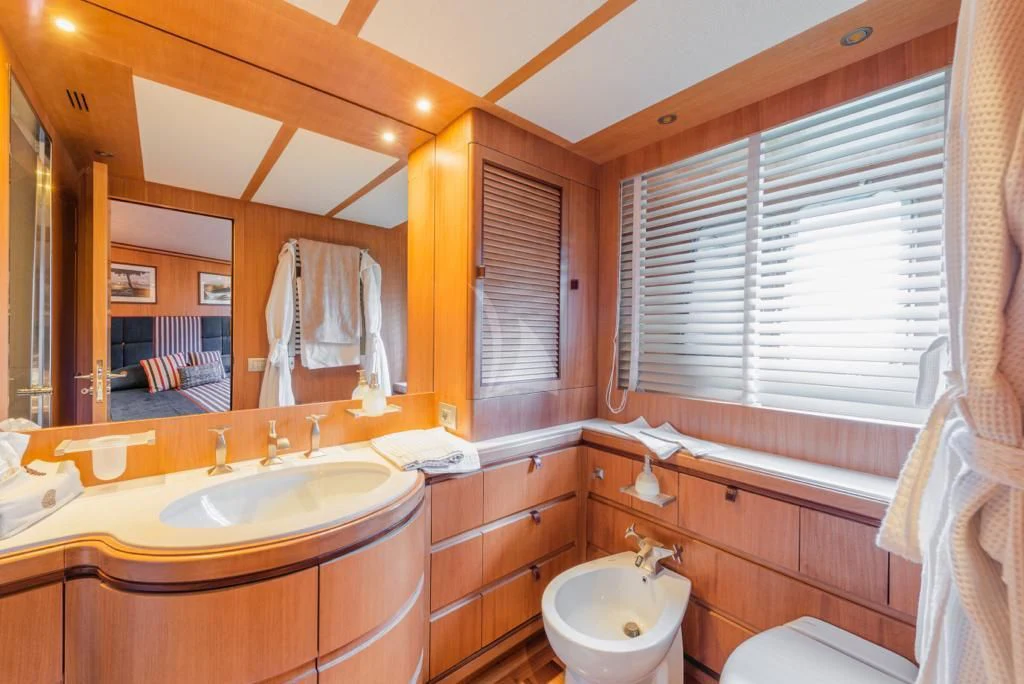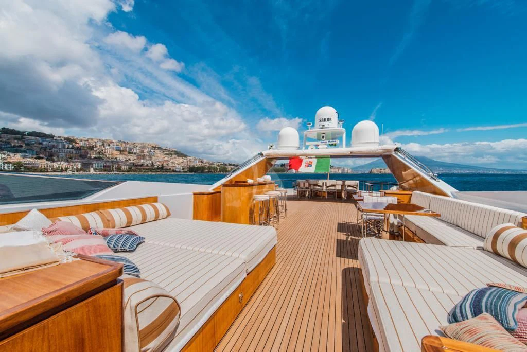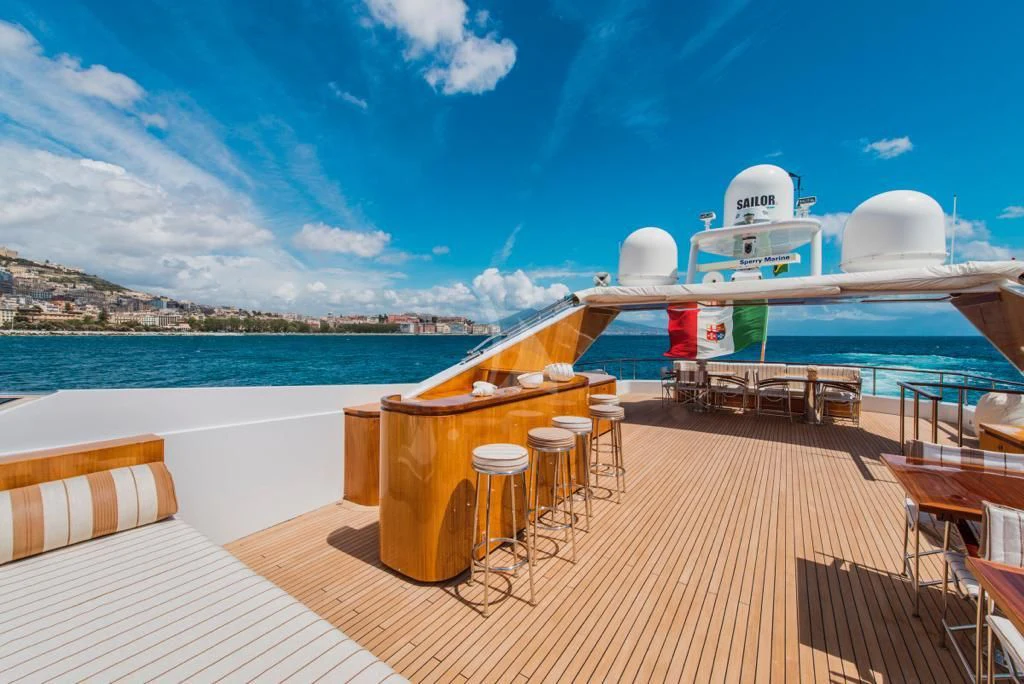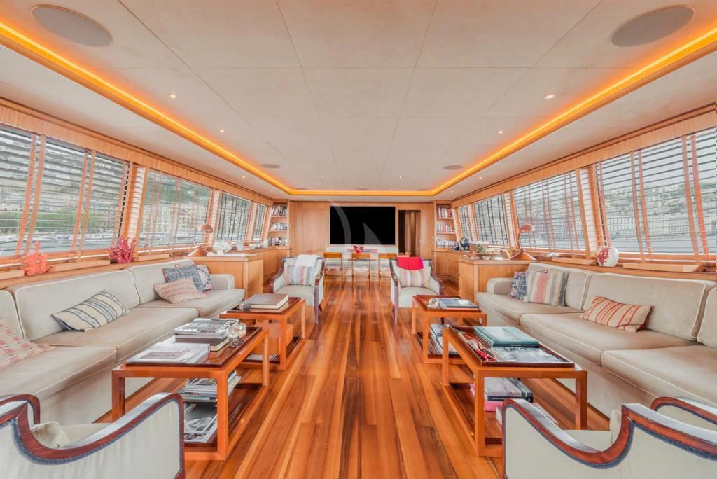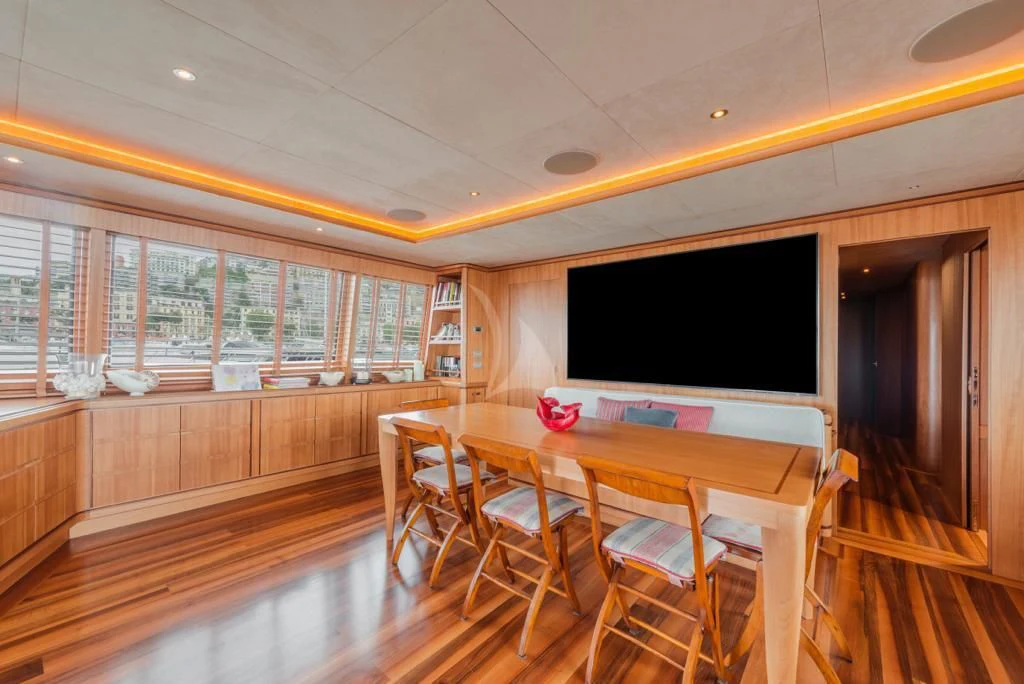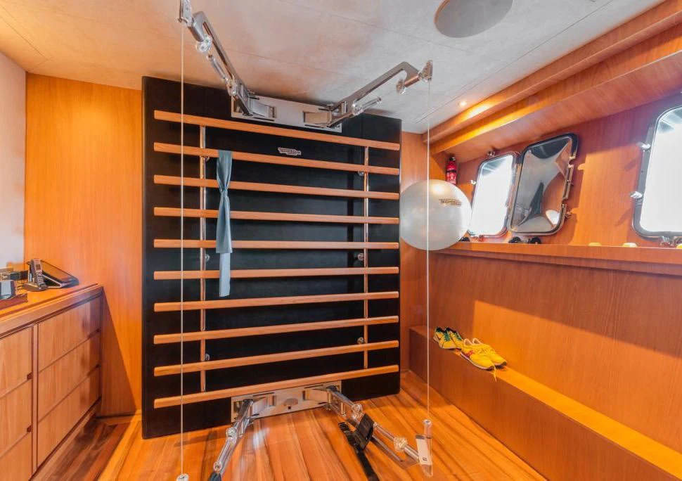 The main salon is an epitome of refined elegance with its tasteful décor and sophisticated ambience; it serves as a perfect backdrop for social gatherings or quiet relaxation alike. A fully-equipped gym caters to fitness enthusiasts who don't want their workout routines interrupted even when at sea. With Wi-Fi connectivity throughout the yacht, staying connected is never an issue regardless of where you choose to unwind.
