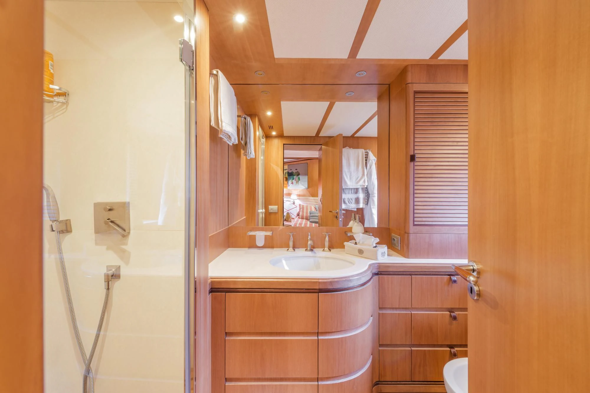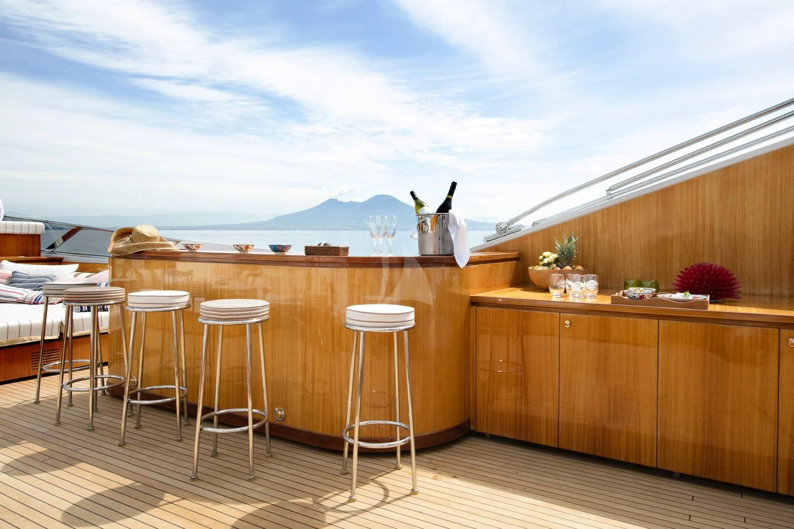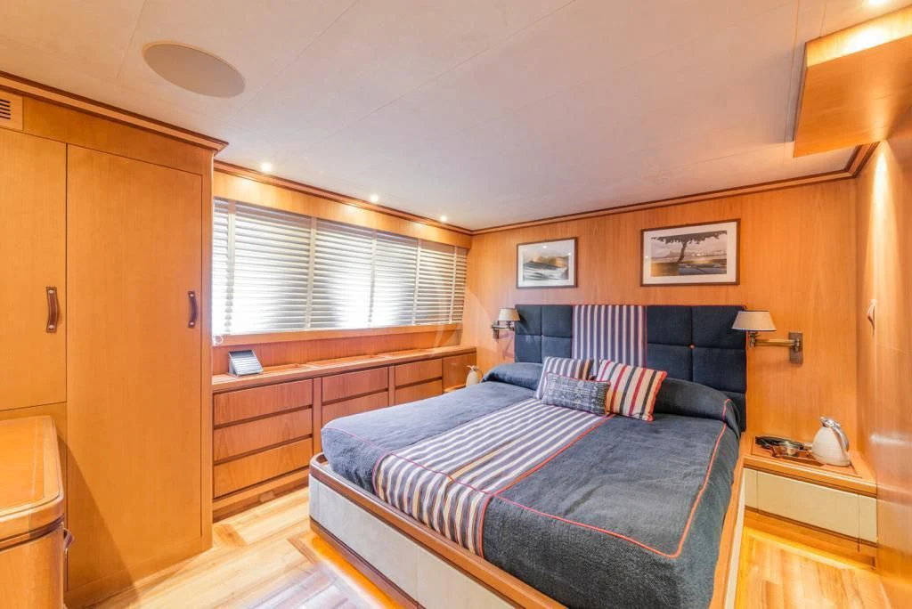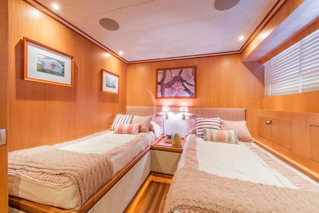 Internally, ANGRA TOO is nothing short of exquisite. It accommodates up to ten guests across six well-appointed cabins that radiate opulence and tranquility. Each cabin showcases meticulous craftsmanship coupled with state-of-the-art amenities for unparalleled comfort during your stay onboard. The master stateroom stands out as a luxurious retreat featuring plush furnishings, ample space, and soothing color palettes that echo serenity.