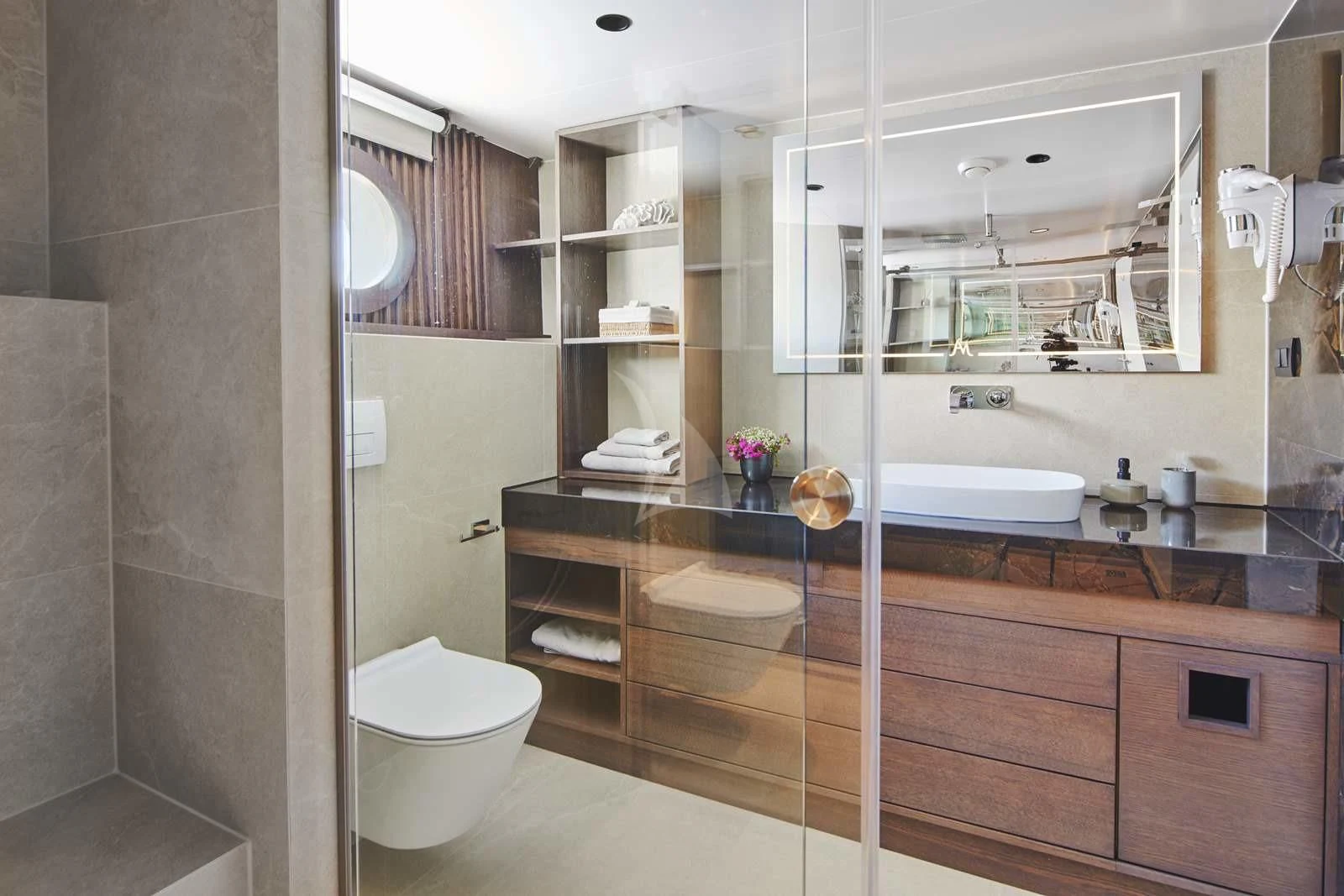 Moving inside this floating palace reveals six beautifully appointed cabins that can comfortably accommodate up to twelve guests along with space for nine crew members ensuring impeccable service round-the-clock. Each cabin exhibits its own unique charm featuring elegant décor elements that blend seamlessly with the overall interior style and color palette chosen by the talented interior designer.