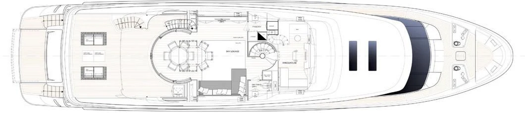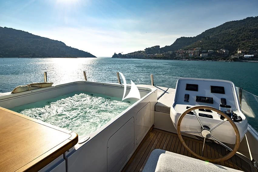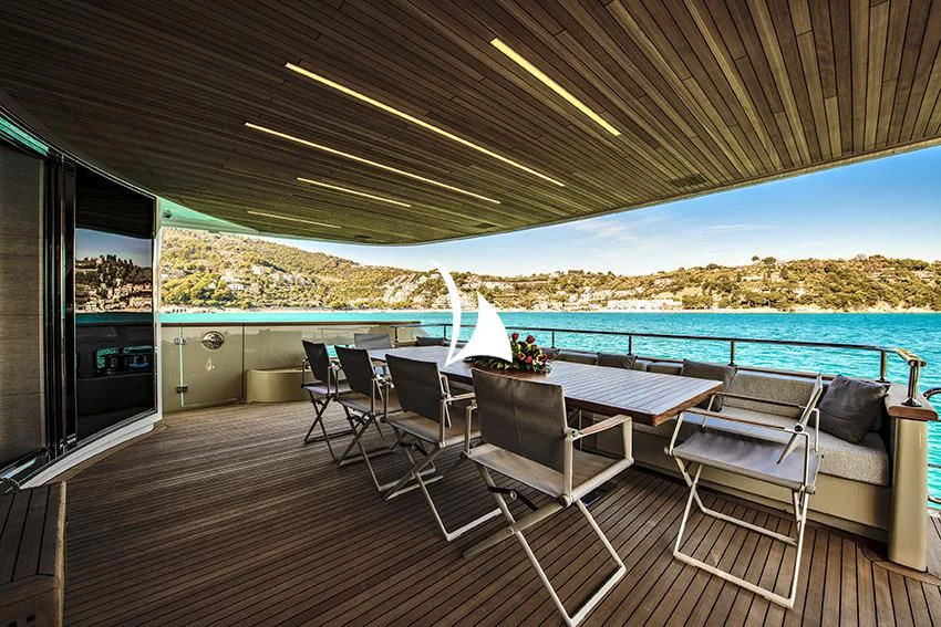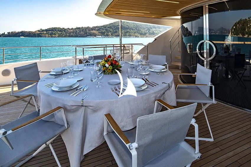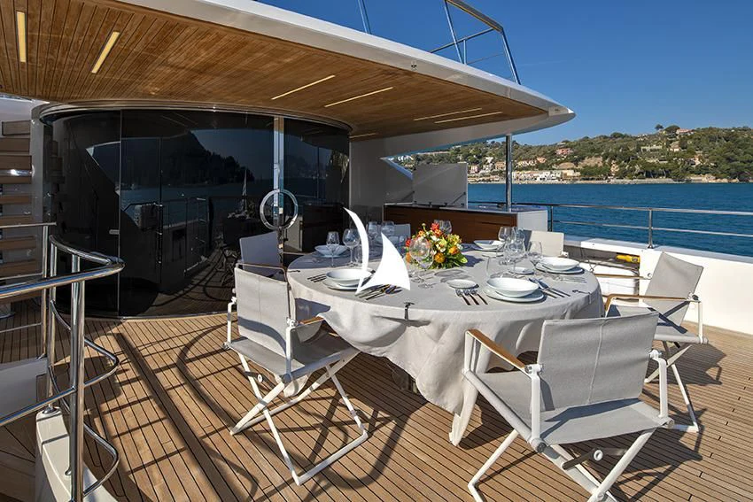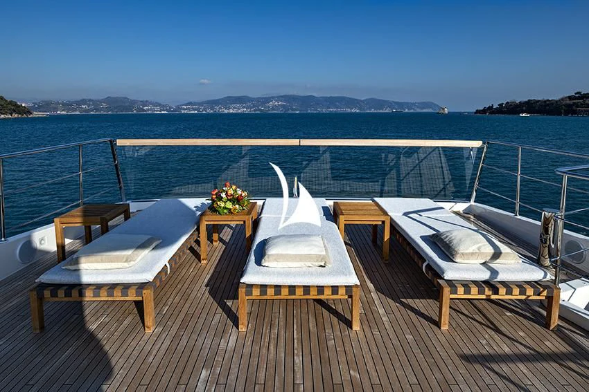 ANYTHING GOES V's exterior design is a testament to timeless beauty and sophistication. The expansive sundeck invites guests to bask in the sun or unwind in the bubbling Jacuzzi while taking in panoramic ocean views. Alfresco dining areas provide idyllic settings for sunset dinners or casual brunches under blue skies, offering gastronomic delights complemented by breathtaking vistas. Lounging areas are thoughtfully designed for ultimate relaxation - perfect spots for sipping cocktails at dusk or simply enjoying tranquil moments at sea.