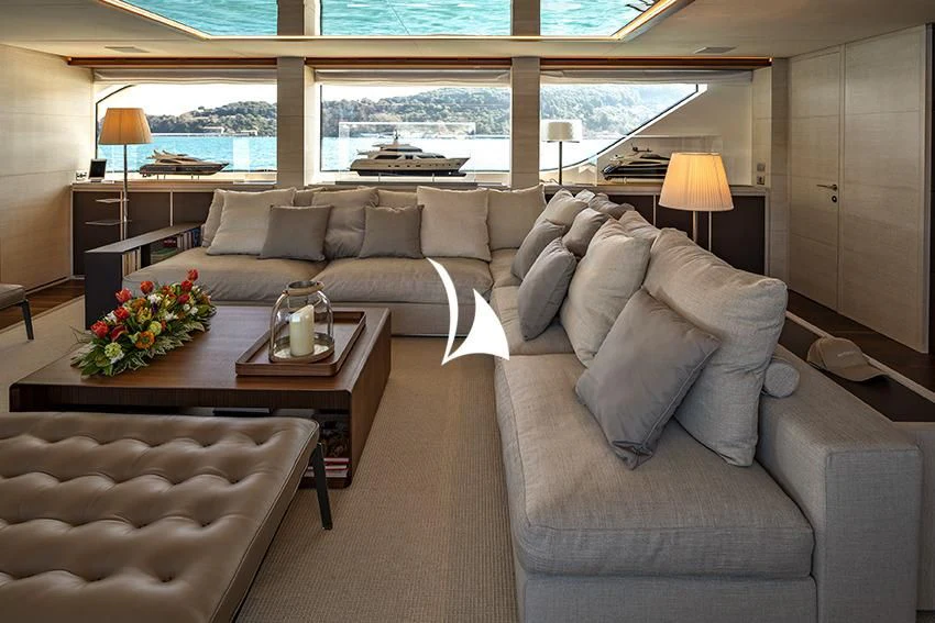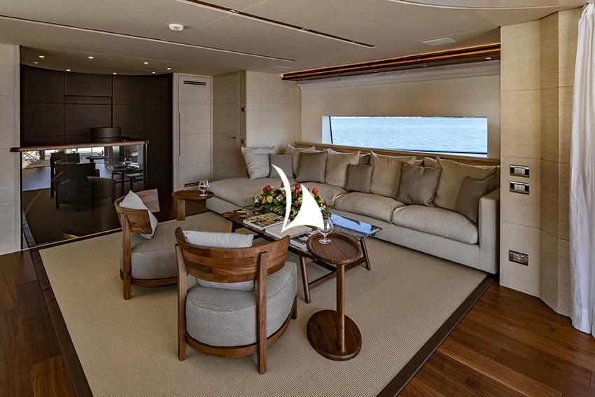 The main salon serves as the social heart of ANYTHING GOES V – an inviting space where guests can mingle over drinks or engage in lively conversations. Sumptuous seating arrangements surround elegant coffee tables, creating intimate areas for relaxation or entertainment. Adjacent lies the formal dining area where exquisite meals are served against a backdrop of refined elegance.
