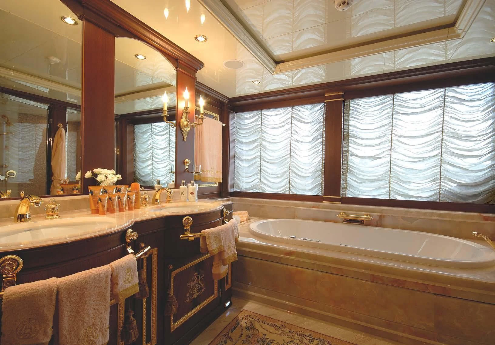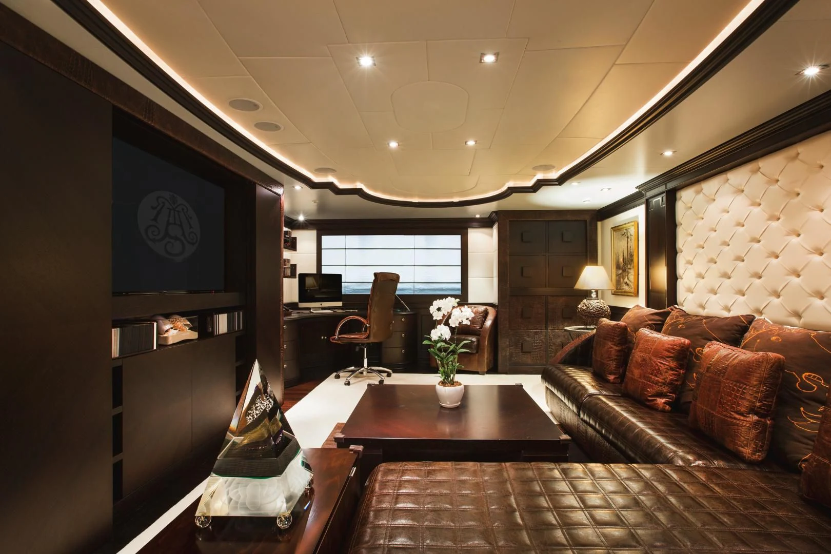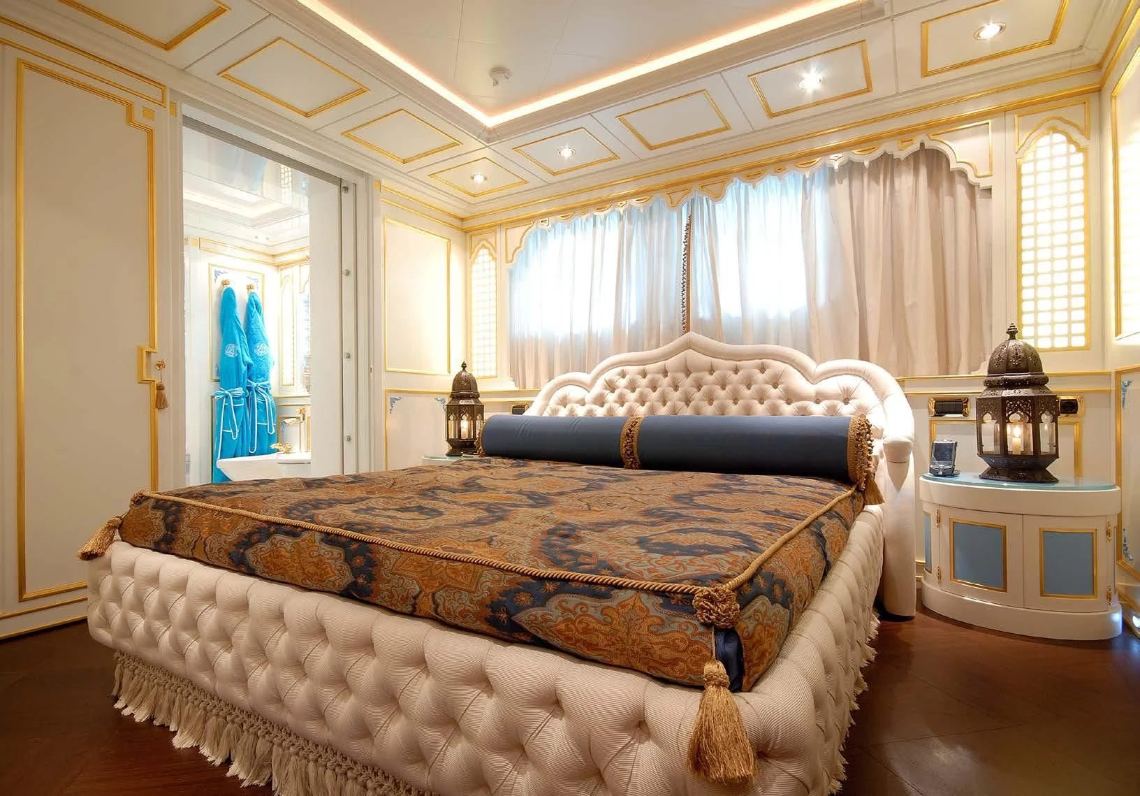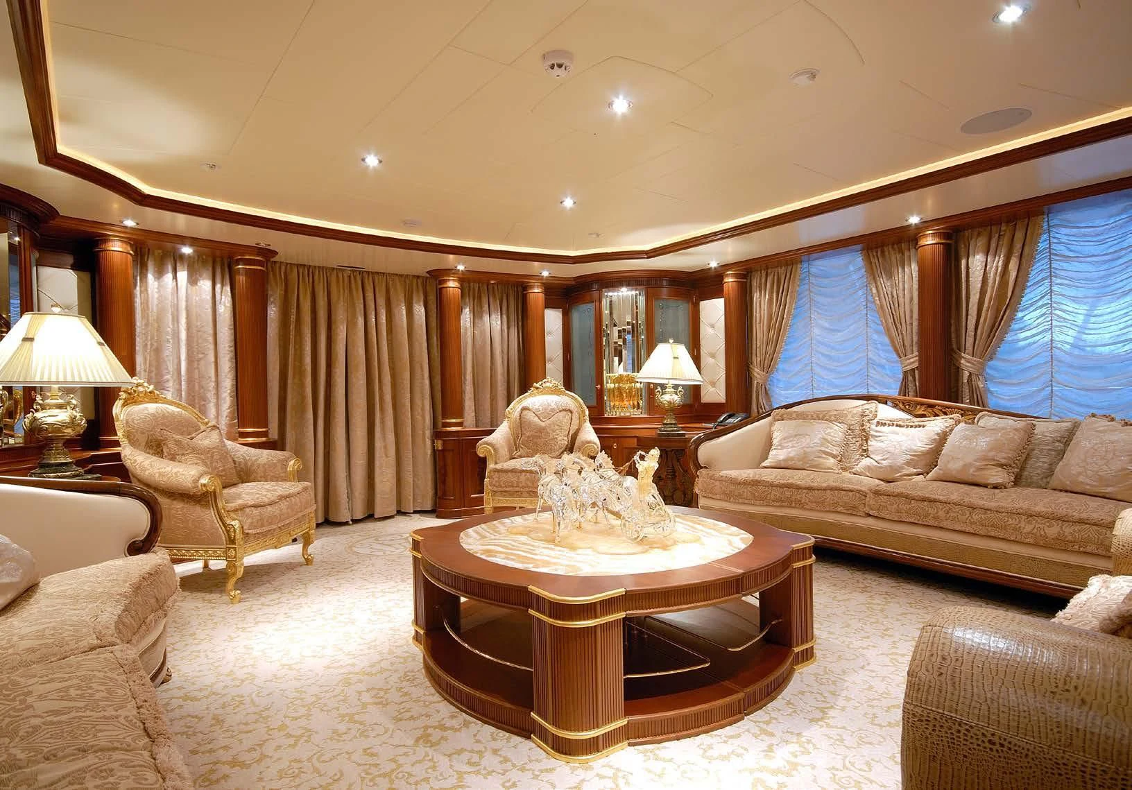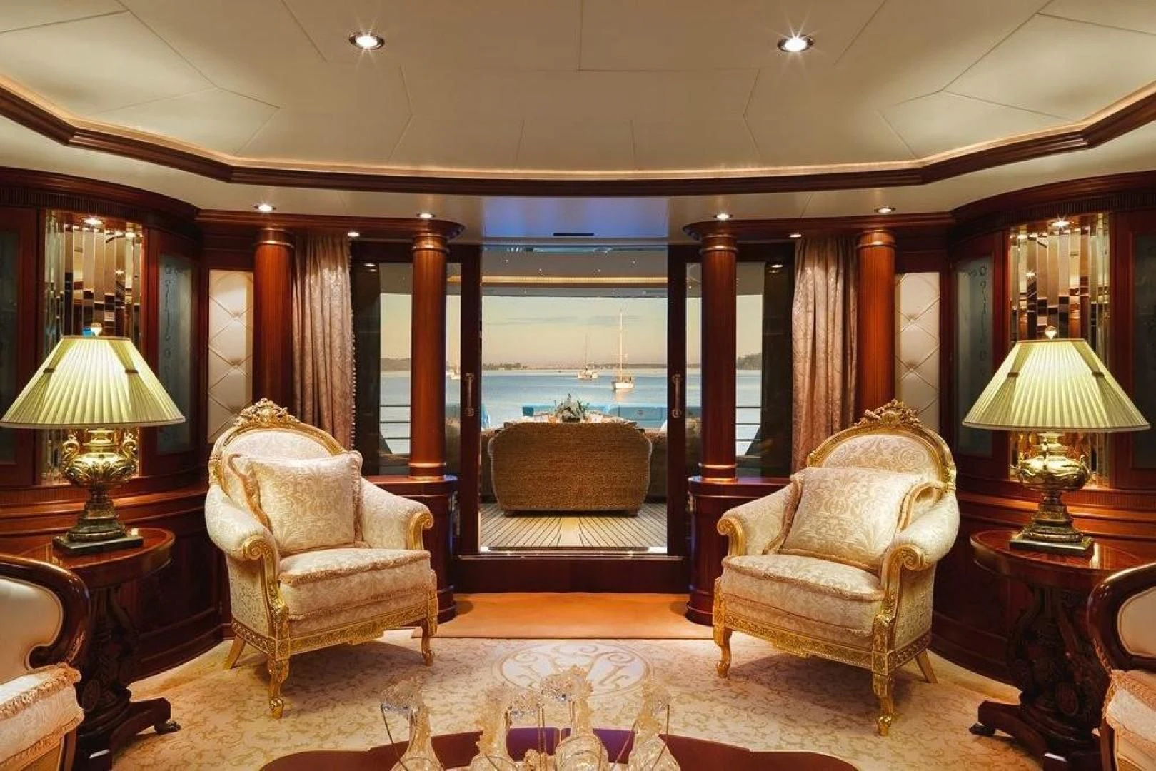 Step inside AQUAMARINA and you're immediately welcomed into a world of unparalleled luxury designed to cater to every whim and fancy. The interior design exudes elegance with its tasteful color palette, unique design elements, and high-end finishes that echo throughout her six spacious cabins accommodating up to twelve guests along with nine crew members ensuring personalized service at all times. The master stateroom stands out with its opulent decor, plush bedding, and stunning en-suite bathroom creating a private haven for relaxation.