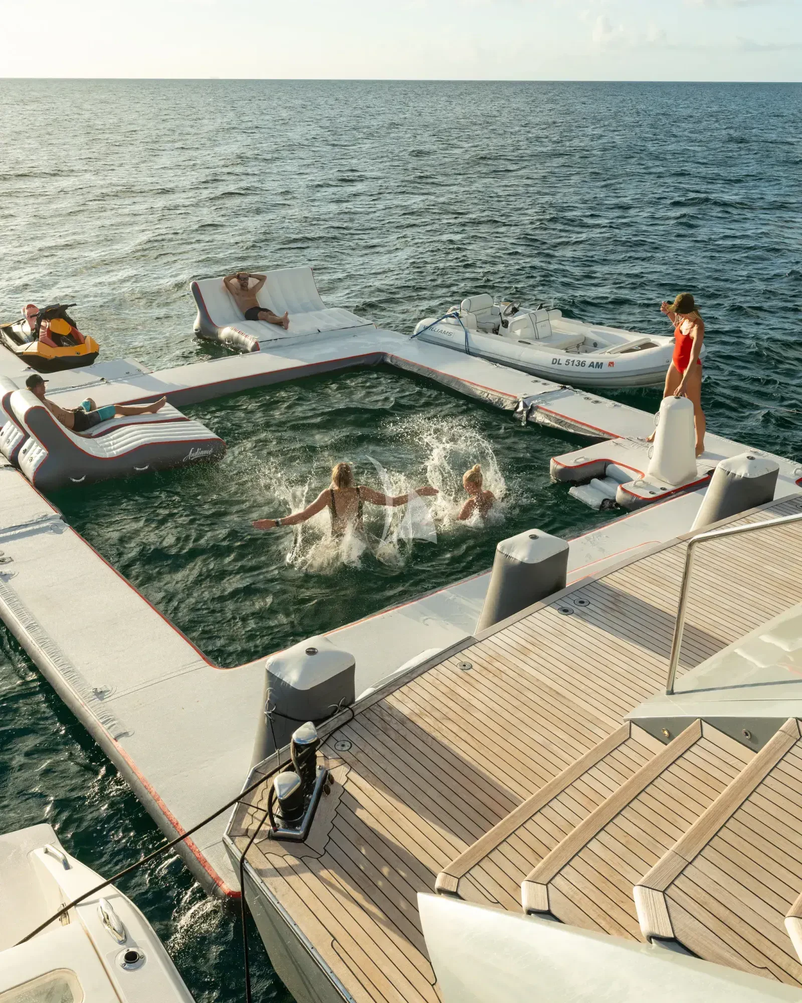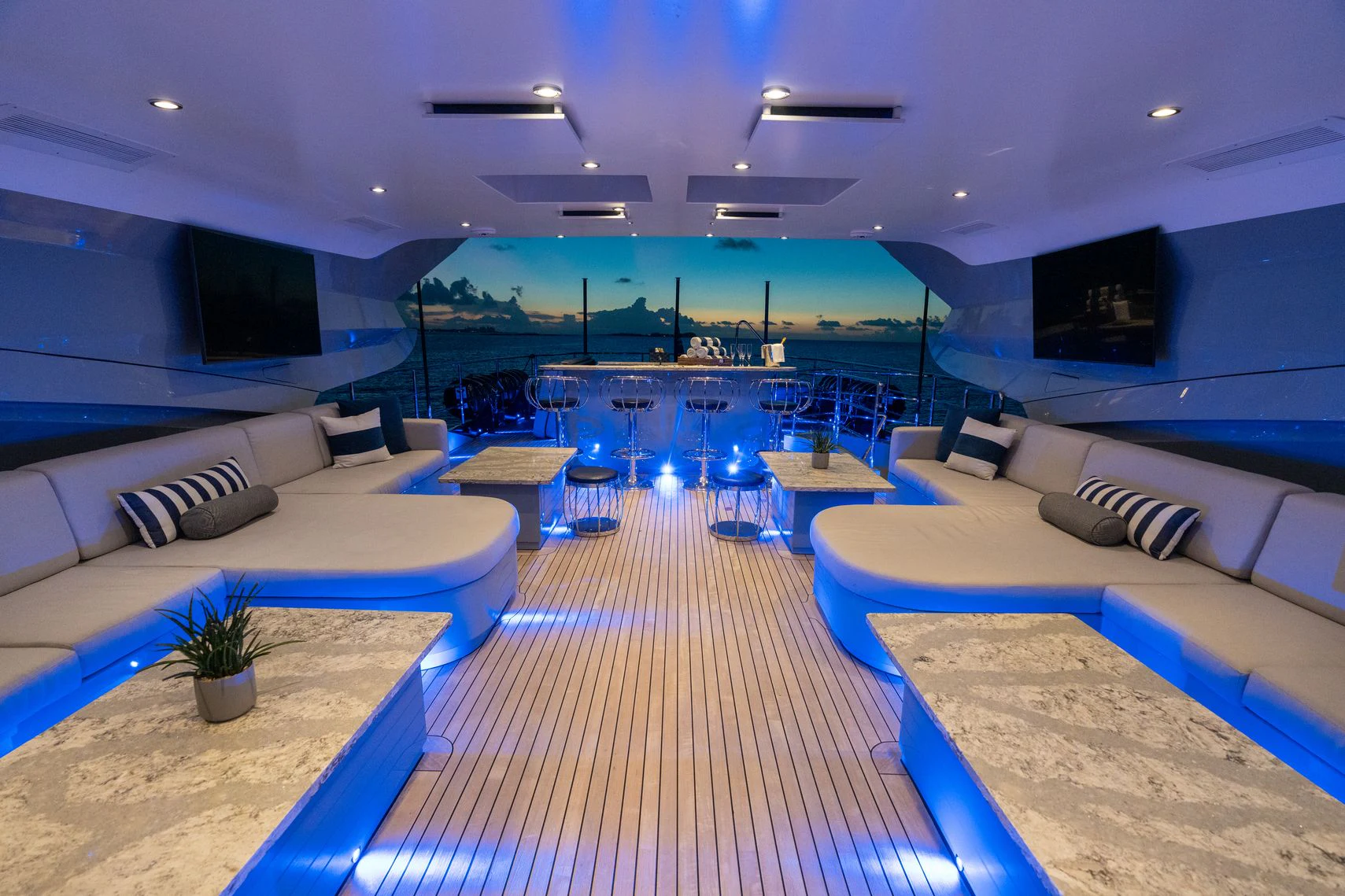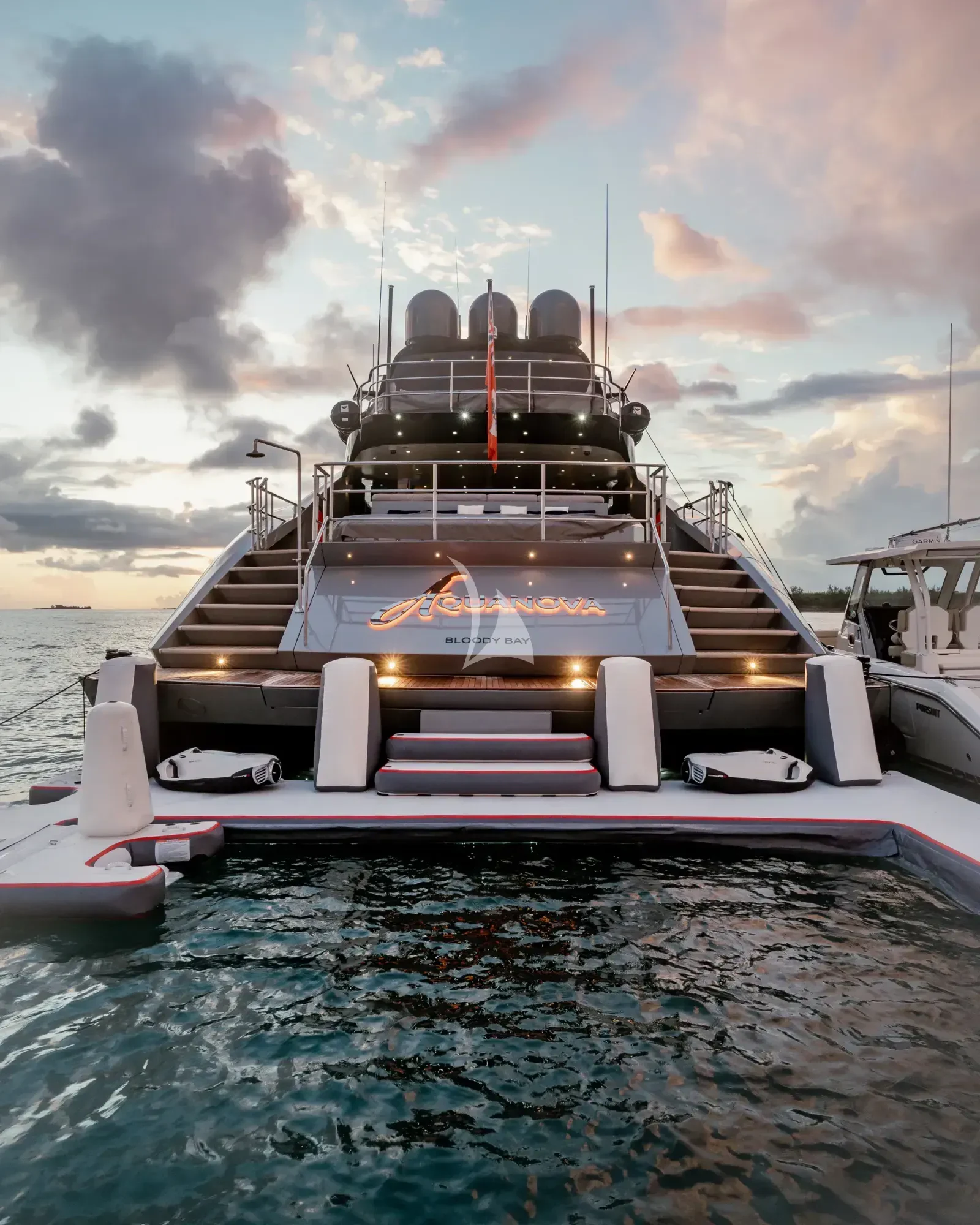 AQUANOVA's exterior design is as breathtaking as its performance capabilities. Its majestic length extends over an LOA of approximately 45.72 meters (or about 150 feet), while its beam spans around eight meters (or nearly thirty-one feet). These dimensions create vast outdoor spaces for relaxation and entertainment, including sumptuous sundecks perfect for basking in the sun and alfresco dining areas ideal for indulging in gourmet meals under the stars. The yacht also features an expansive beach club where guests can unwind close to the sea.